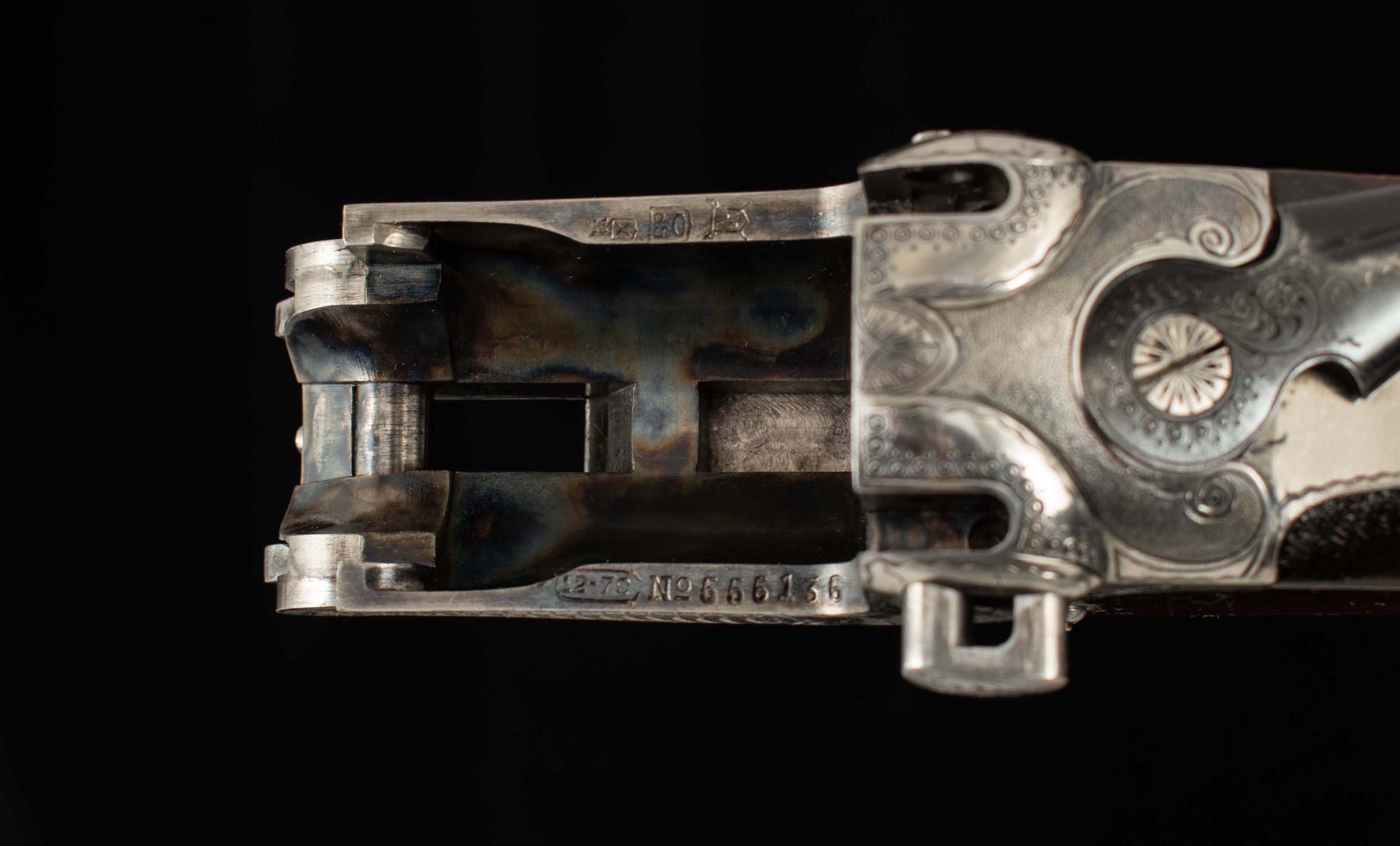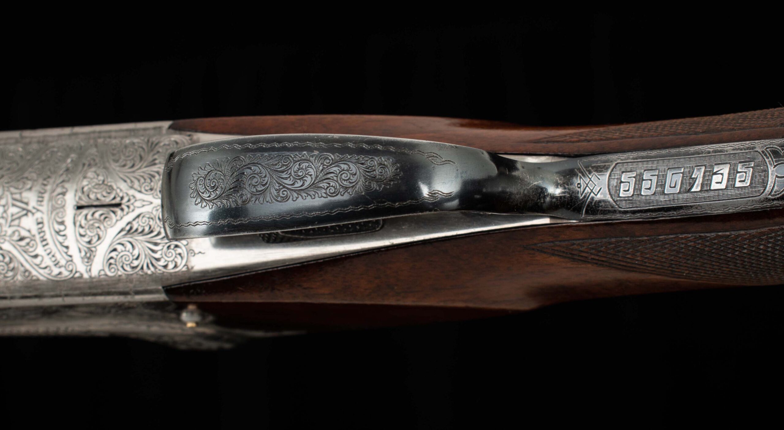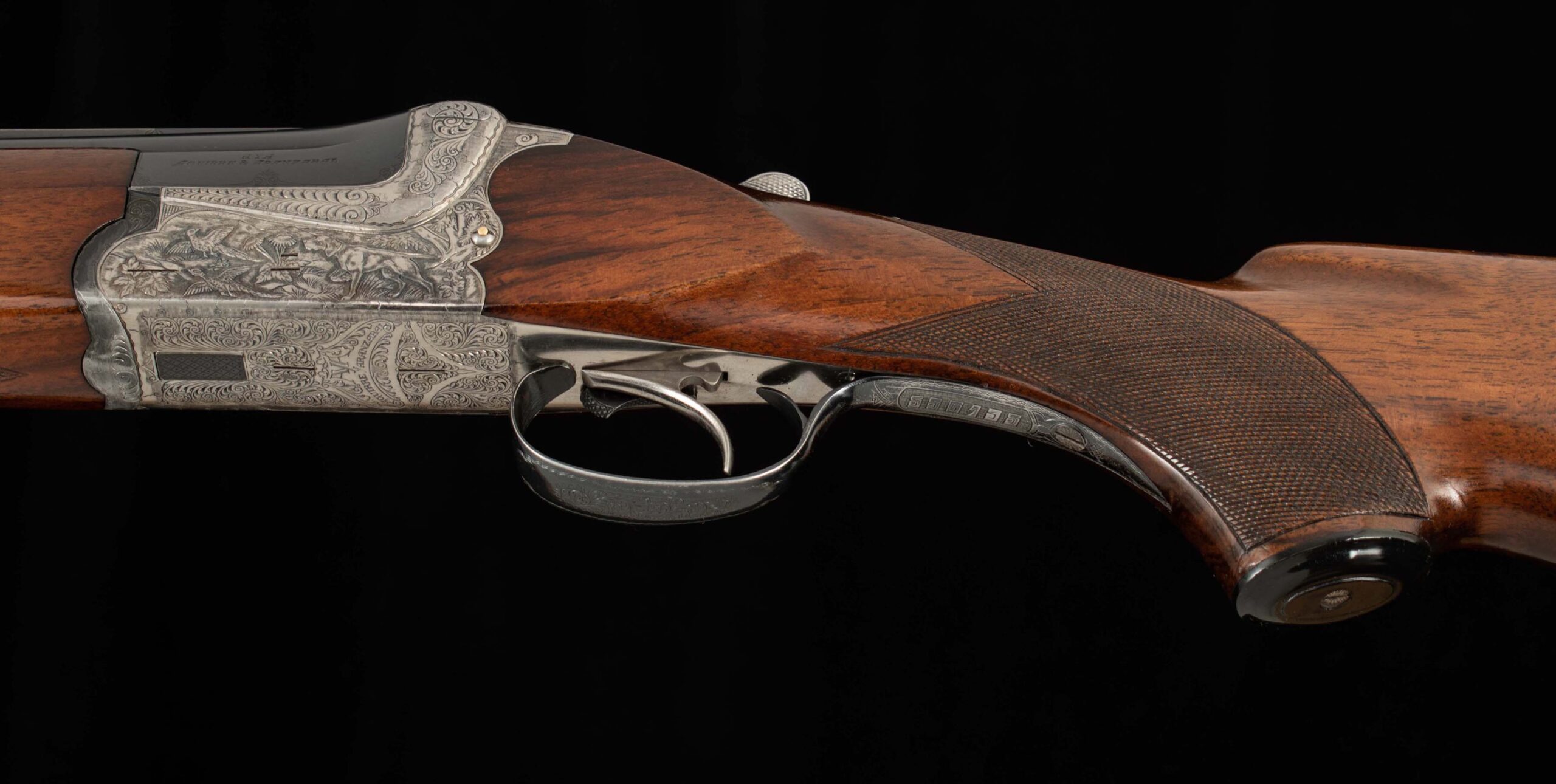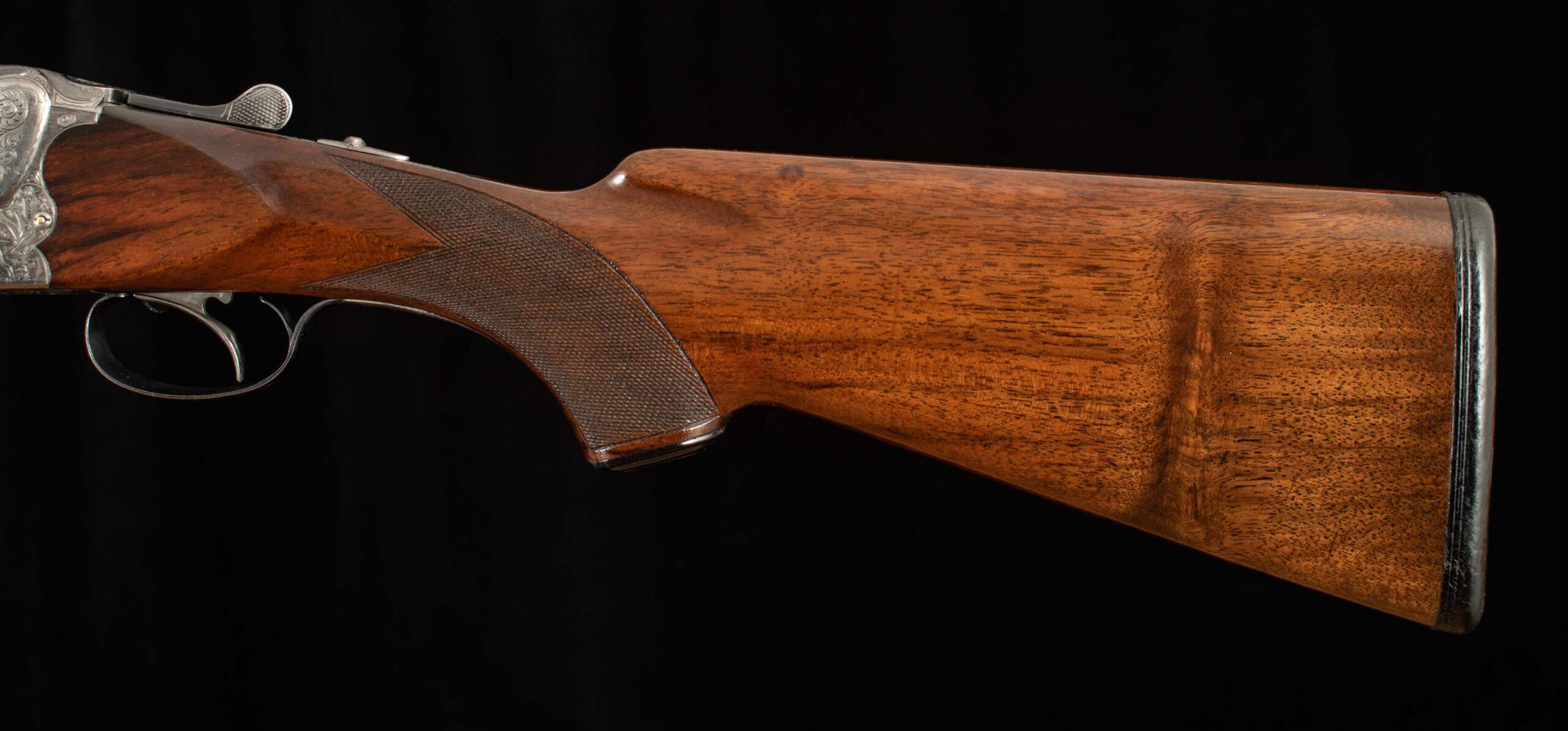 The 28” barrels have a ventilated matte rib with tiny engraving details along the sides where the lightly engraved breech meets the barrels.  The blue on the barrels are very good, only some slight freckling on the right side where the breech meets the receiver.  The two-piece forearm has excellent screws and point pattern hand checkering.  The wood to metal fit is excellent around the scalloped receiver.  The receiver has beautiful deep relief game scene engraving, cocking indicators with gold finish.  The coin finish on the receiver is shiny but has a warmth to it.  The Kersten double locking lug, checkered barrel selector, engraved safety, and the engraved lever all operate with sturdy confidence.  The pistol grip is capped with an engraved screw at its center.  The walnut stock has some impressions in the finish and light handling marks, point pattern hand checkering, and a Purdey style leather butt pad.