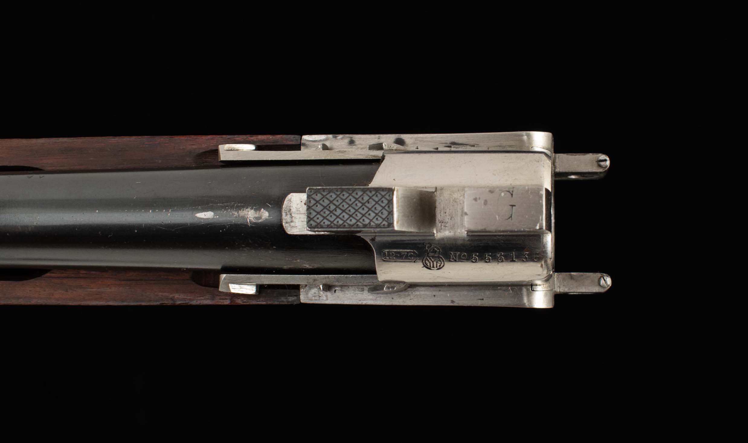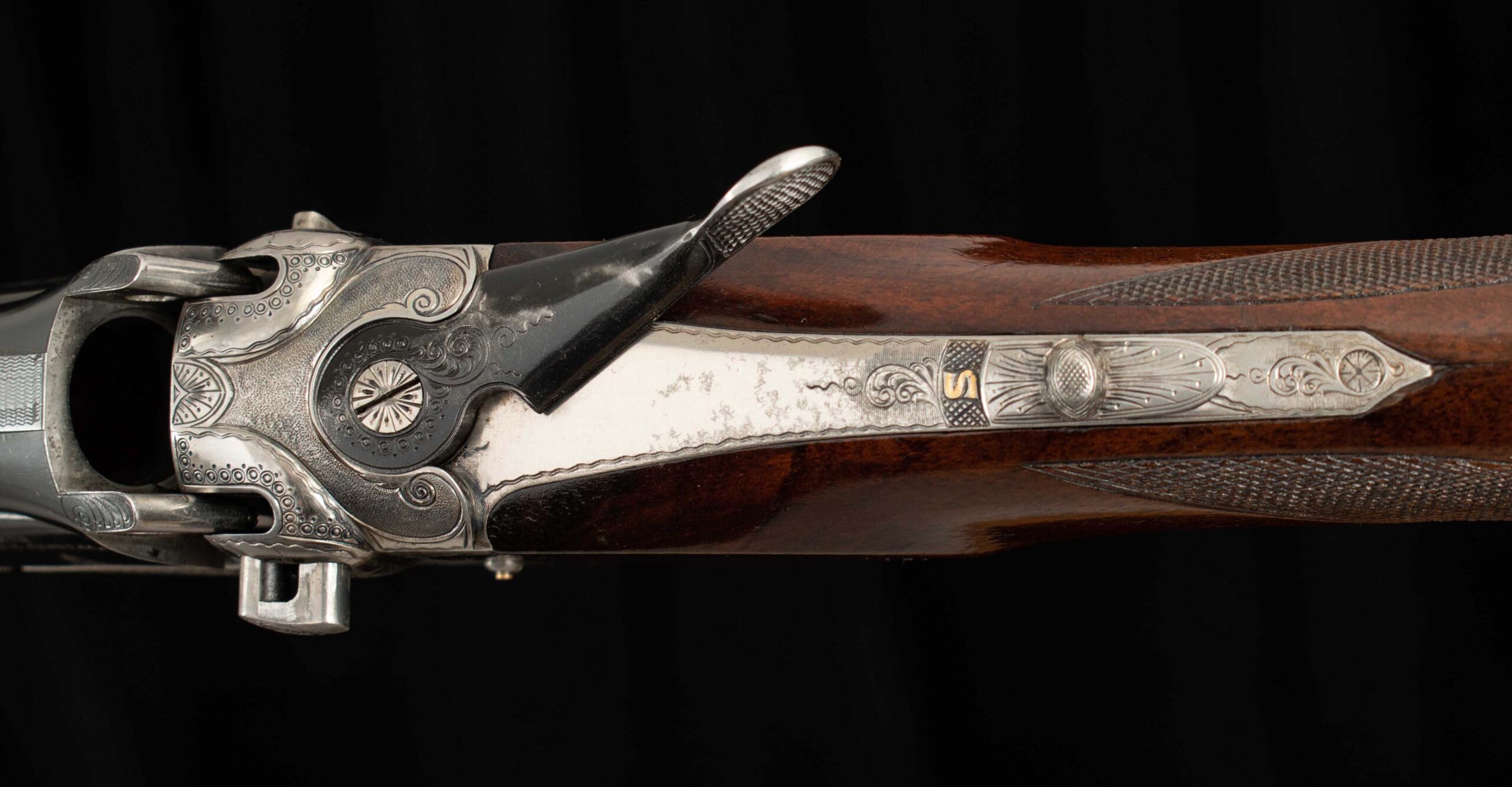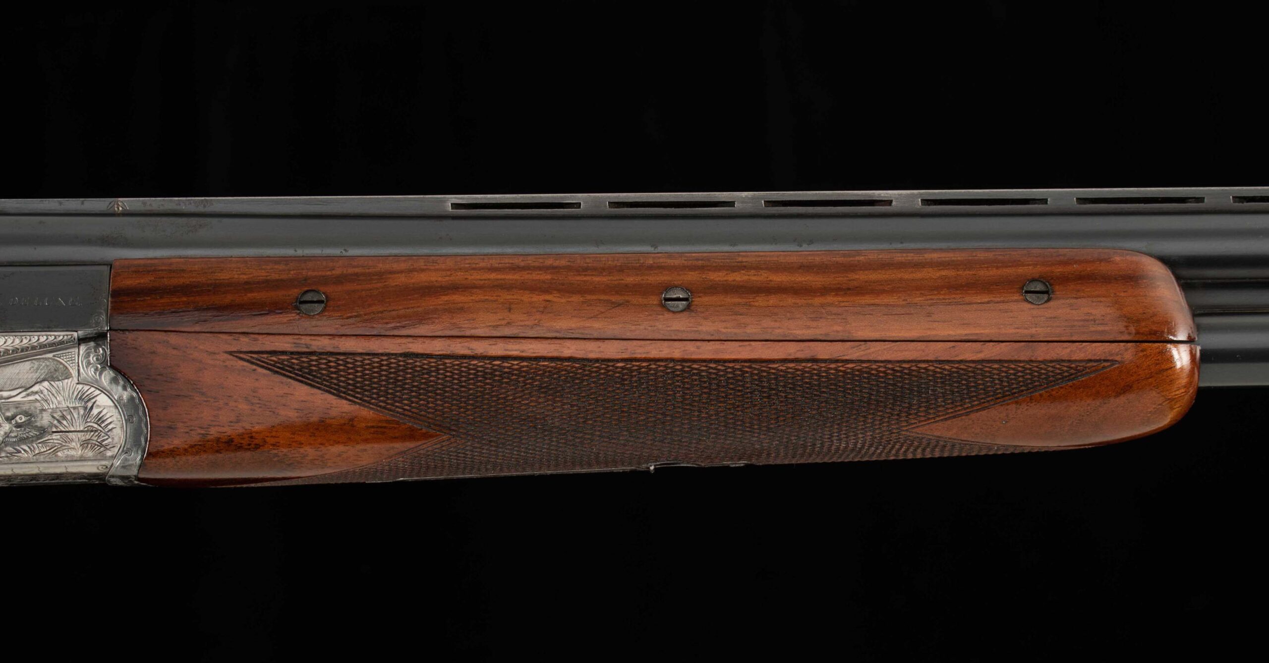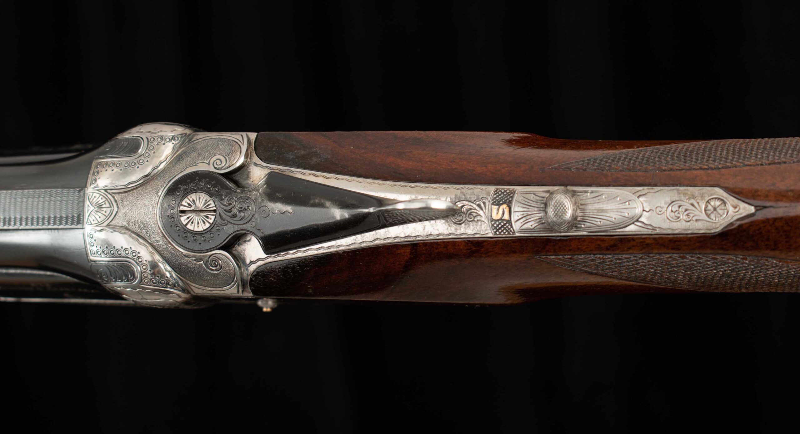 The 28” barrels have a ventilated matte rib with tiny engraving details along the sides where the lightly engraved breech meets the barrels.  The blue on the barrels are very good, only some slight freckling on the right side where the breech meets the receiver.  The two-piece forearm has excellent screws and point pattern hand checkering.  The wood to metal fit is excellent around the scalloped receiver.  The receiver has beautiful deep relief game scene engraving, cocking indicators with gold finish.  The coin finish on the receiver is shiny but has a warmth to it.  The Kersten double locking lug, checkered barrel selector, engraved safety, and the engraved lever all operate with sturdy confidence.  The pistol grip is capped with an engraved screw at its center.  The walnut stock has some impressions in the finish and light handling marks, point pattern hand checkering, and a Purdey style leather butt pad.