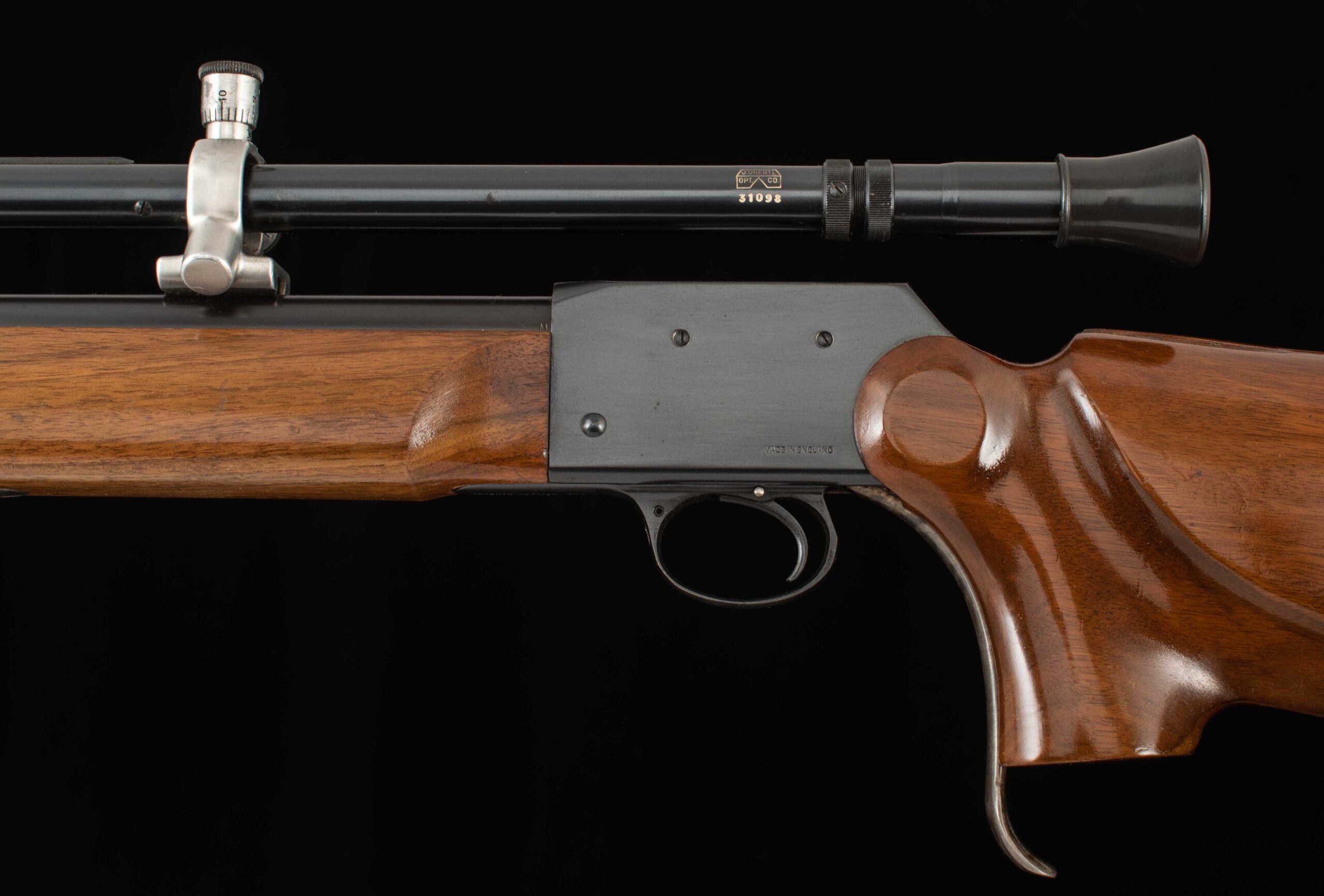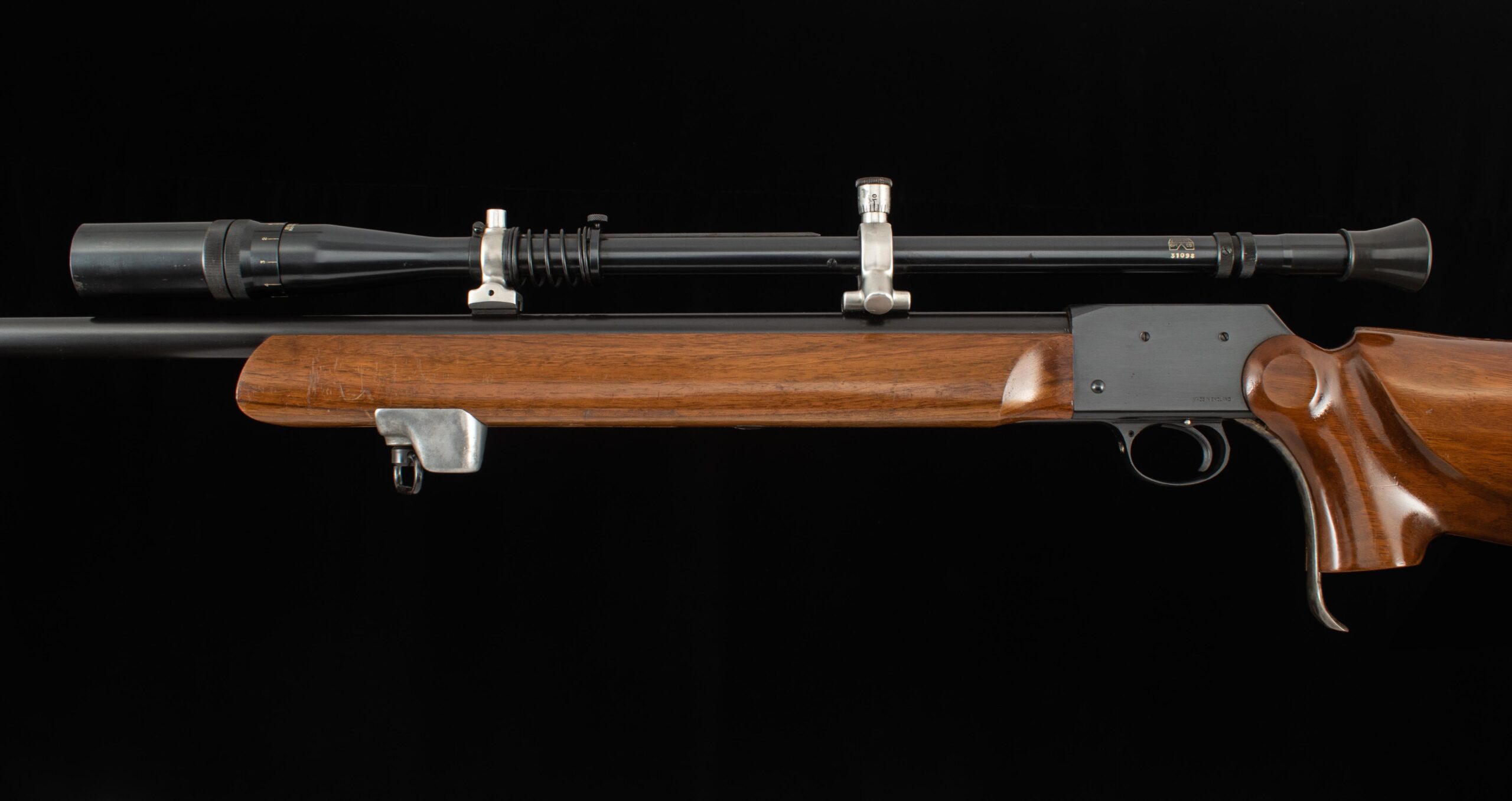 Designed specifically for the shooter who demands the utmost accuracy from their 22LR cartridge. This Birmingham Small Arms rifle is the MK IV- I.S.U meaning the rifle was designed to meet the International Shooting Union requirements for Standard rifle matches. This example, serial number FC1353X has the straight walled barrel which saves about two pounds over the heavier tapered barrel contrasting nicely with the French Walnut furniture and blued action. The barrel has integral dovetail mounts for mounting a scope which this rifle has J. Unertl 14x scope mounted. The action is removable to permit cleaning, and the trigger is adjustable for weight of pull and overtravel (set for 3.6lb), the trigger has no take-up and no over travel- exceptional. The martini action guarantees a positive case extraction no matter how slowly the lever is operated and an ergonomically sculpted stock helps maintain consistent head and hand interface and therefore repeatable shot placement. This rifle also comes with a custom walnut case for the scope, leather sling, test target and accessories. Throughout the decades the Martini action has proved itself as the top performer in the field of precision shooting, guns in this condition are especially hard to find so make the move to the ultimate English target rifle, you will not be disappointed. Have a look at the detailed specifications and pictures below. Thanks for looking!
