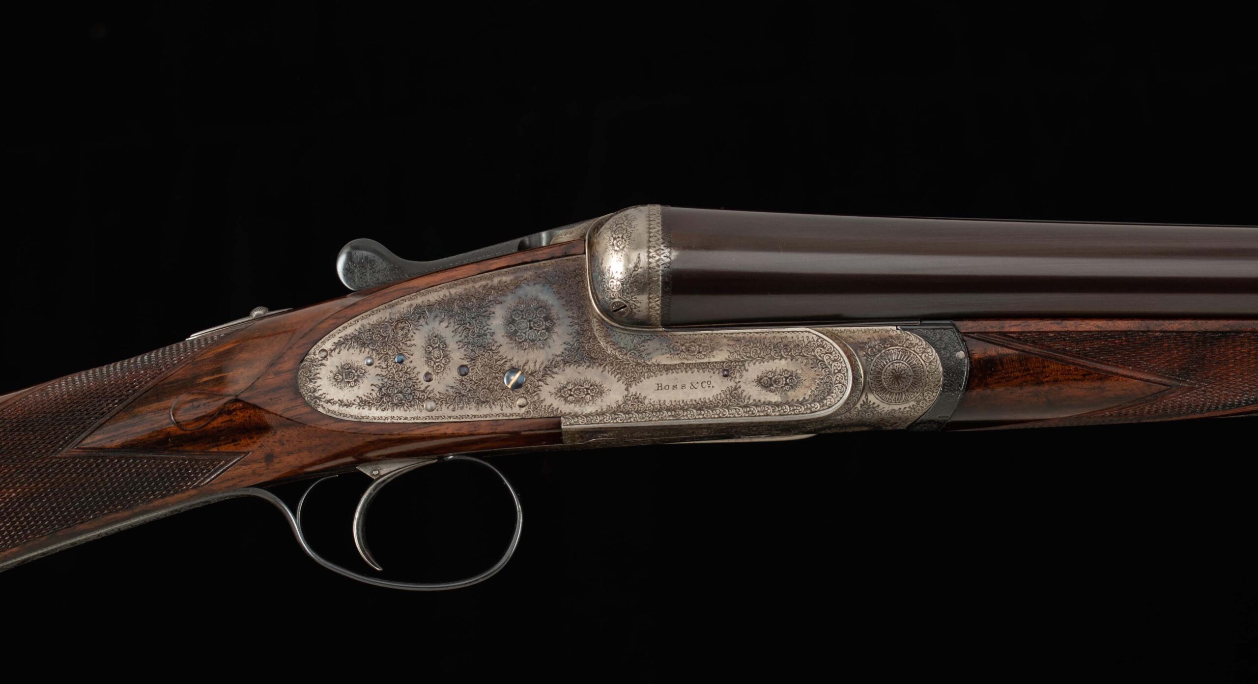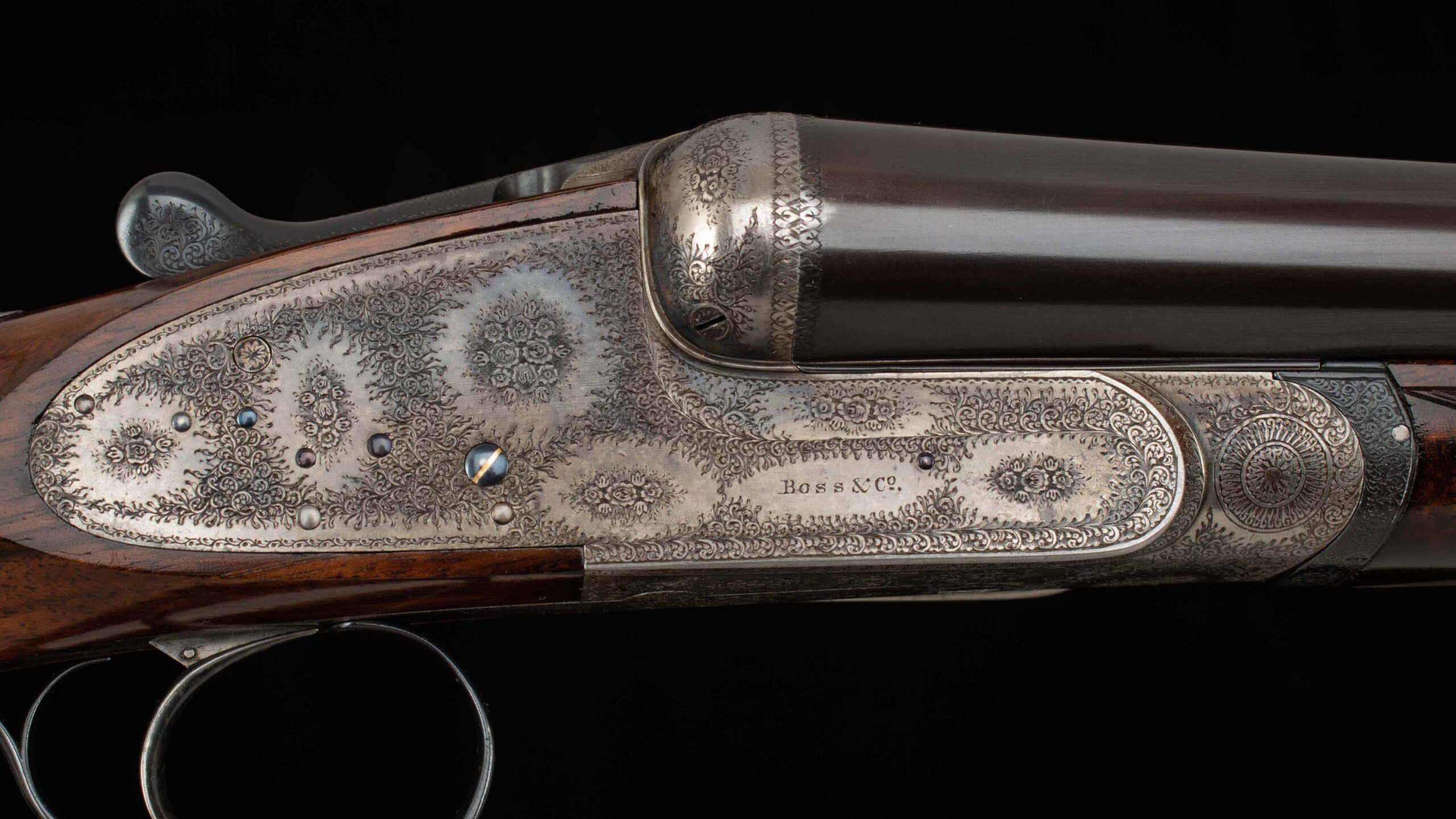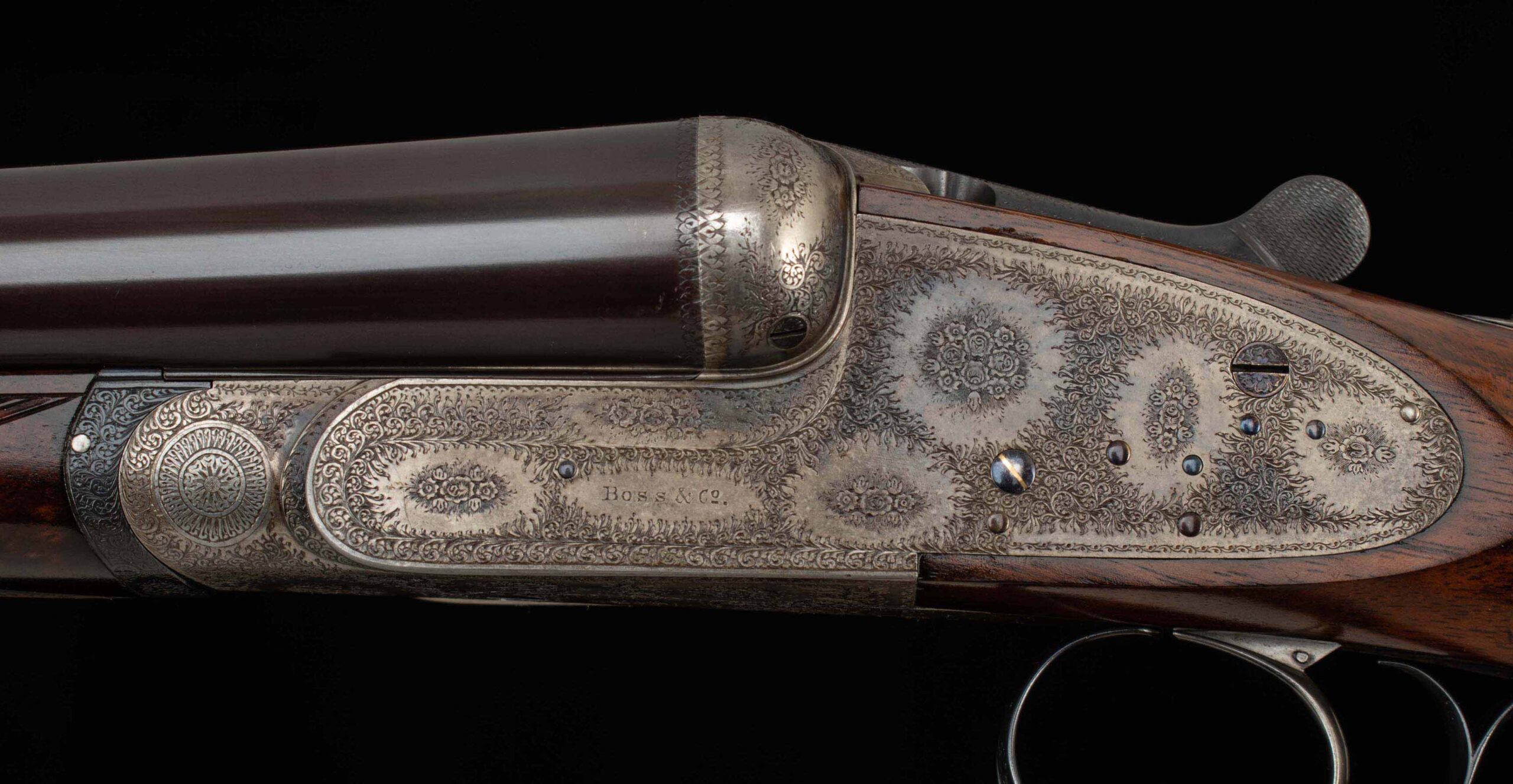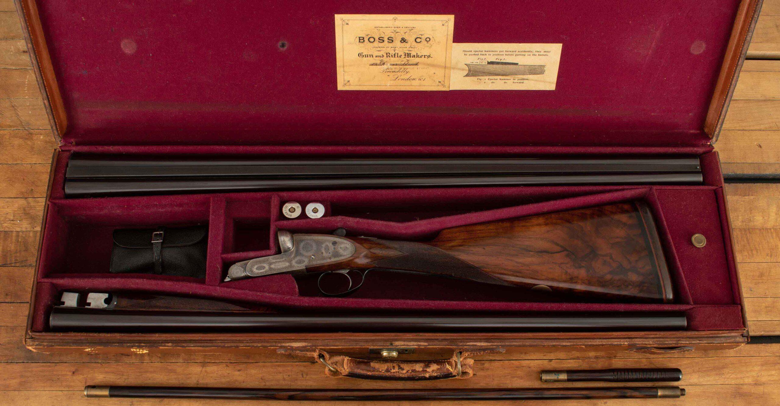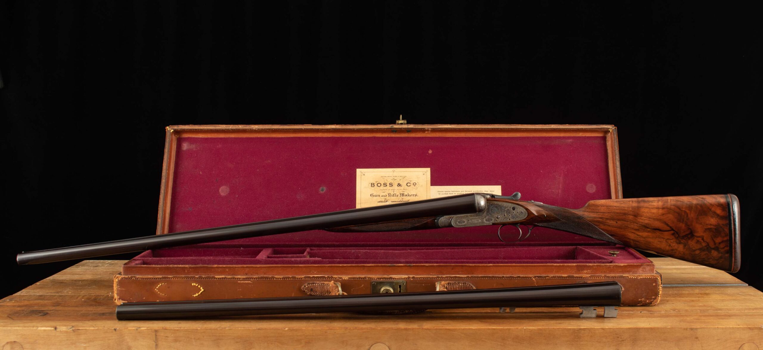 Boss & Co. is the oldest maker in the London trade, having its beginnings in 1812 and operating as a privately held company to this day. Boss only made one grade of gun…A BEST GUN. From the Boss website: “We would say from the outset that we make only one grade of gun and have never placed a second quality make upon the market. This policy has enabled us to retain the services of the finest workmen in London, and to give them continuous employment. The advantages attending the production of best work only are manifold. There is no opportunity for the work of inferior men to be utilised in the economy of the workshop, which is frequently the case when more than one class of weapon is produced. The owner of a Boss & Co gun has the satisfaction of knowing that he has the best gun that money can buy, and that no one has a better gun. The Boss & Co gun has, therefore, always a standard value whether new or second hand. Our output is strictly limited according to the amount of first class labour available.” Take a look at the photo of the factory records; the handwriting in the records gives an idea of the care that is taken in every aspect of bringing these incredible firearms to their owner. The barrels are a classy, traditional brown finish with gorgeous ribs, and silver front bead. The finish is 99%. The frame, sidelocks, barrel fences, and top tang have beautiful scrollwork, and they retain 95% of their factory case color. One specific note, there is a hard to see light scratch on the left sidelock near the very front. This Boss Best gun is still in Proof, the chambers and chokes match the markings and order book this is important because English Guns that are out of proof (anything that changes its original specifications) are considered a lesser investment as any future buyer will be wary of them. Not so with the beautiful example, it is IN PROOF and will continue to accrue value. The black of the top lever and the trigger guard have 95% of their finish. A rolled right edge can be found on the trigger guard, a unique design detail. The forend latch and escutcheon are beautifully engraved and fit perfectly into the flame-figured walnut. Light flame-figure and deep, rich grain continue onto the straight grip English stock with carved drop points. The point checkering pattern has deep, double borders. Boss offered this type of leather covered pad that is cut back to reveal the rubber recoil pad beneath. Upon discussion with the folks at Boss and referencing the factory records for length of pull, we believe the pad to be part of the original order, although it was not specified directly on the order sheet. The brown leather and the brown barrels tie together nicely. Operationally, the assisted-opener springs to life when the top lever is released. The trigger pulls are crisp, and the ejectors are strong and timed perfectly. There is no such thing as an “average” or “typical” Boss shotgun. Each one is crafted with a level of personality and detail that stands out in its own way. This fine gun is no exception. The “One Duck Gun” with hearty 30” barrels and a separate set of 28” barrels, combined with the brown finishes make this gorgeous gun one to be enjoyed in the field, shown off at the club, or displayed as a centerpiece of your collection. It is ready to be stewarded into the next generation by someone who appreciates history and mastery of craft.
