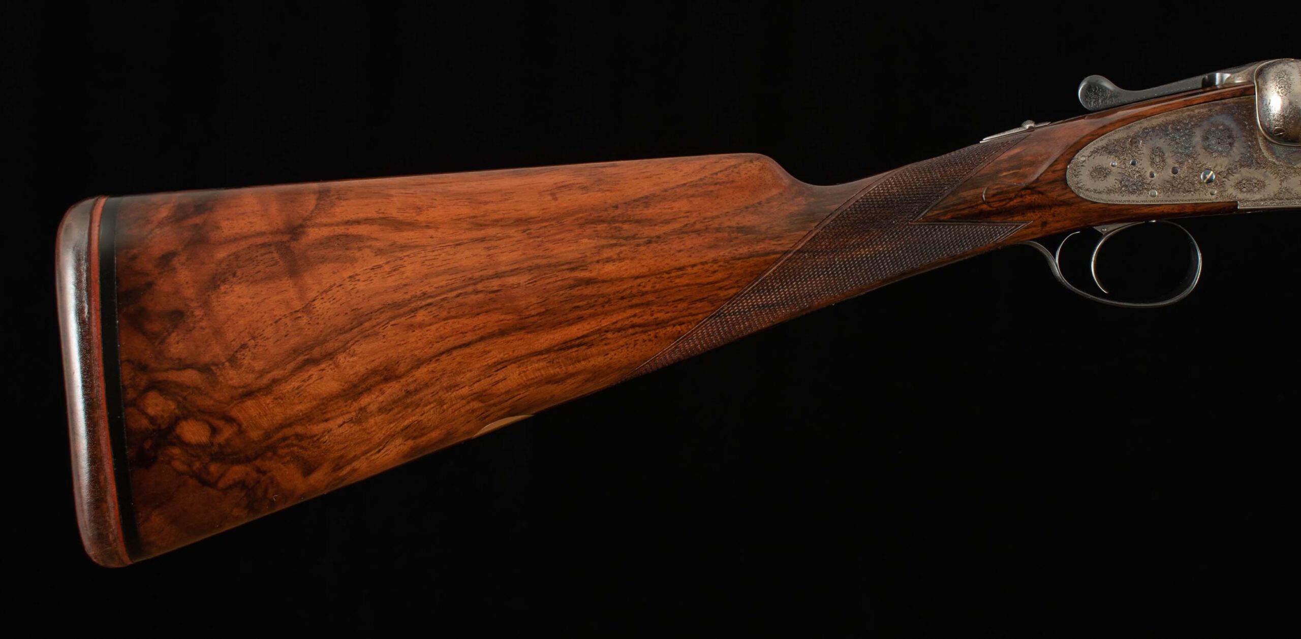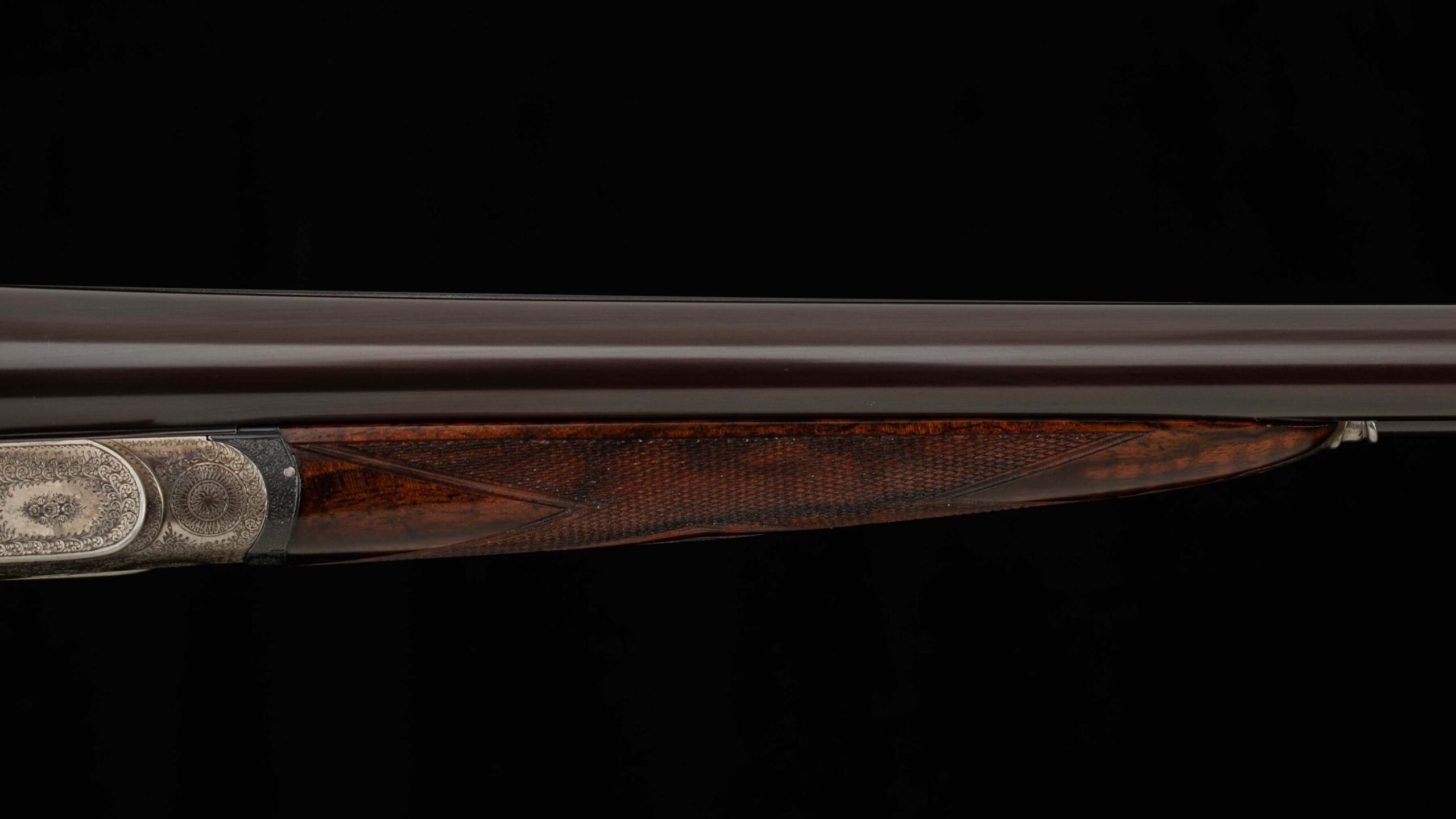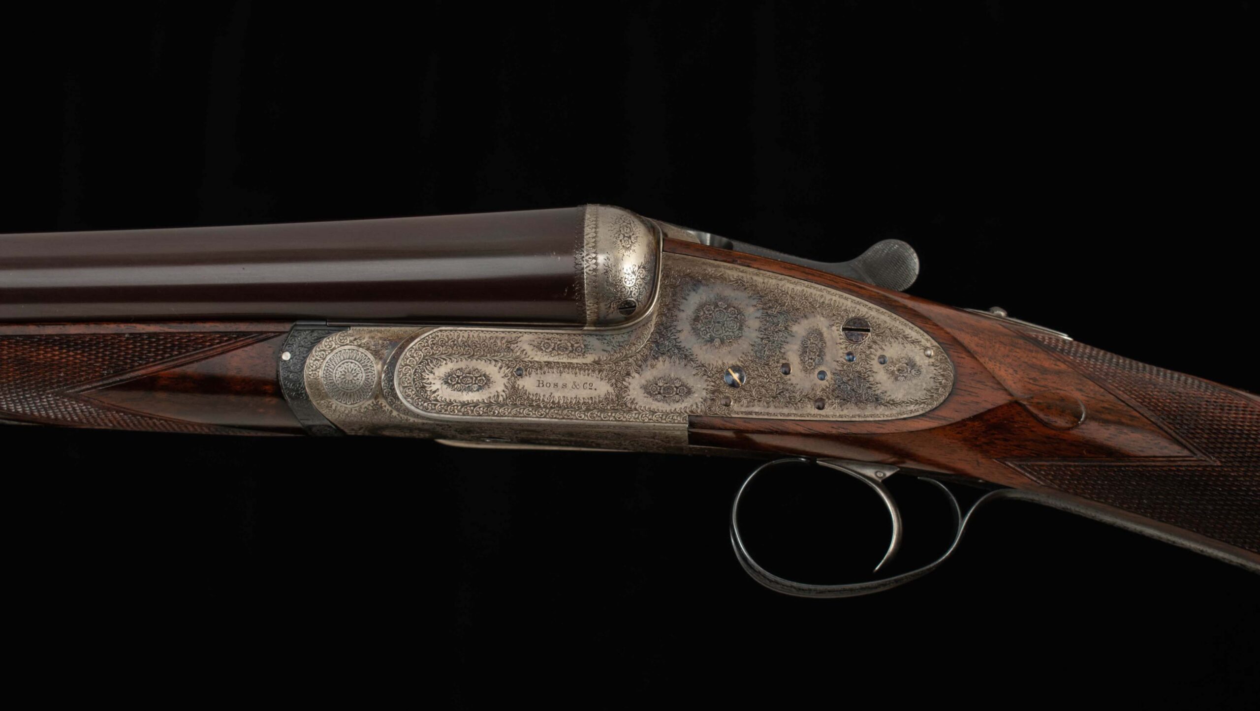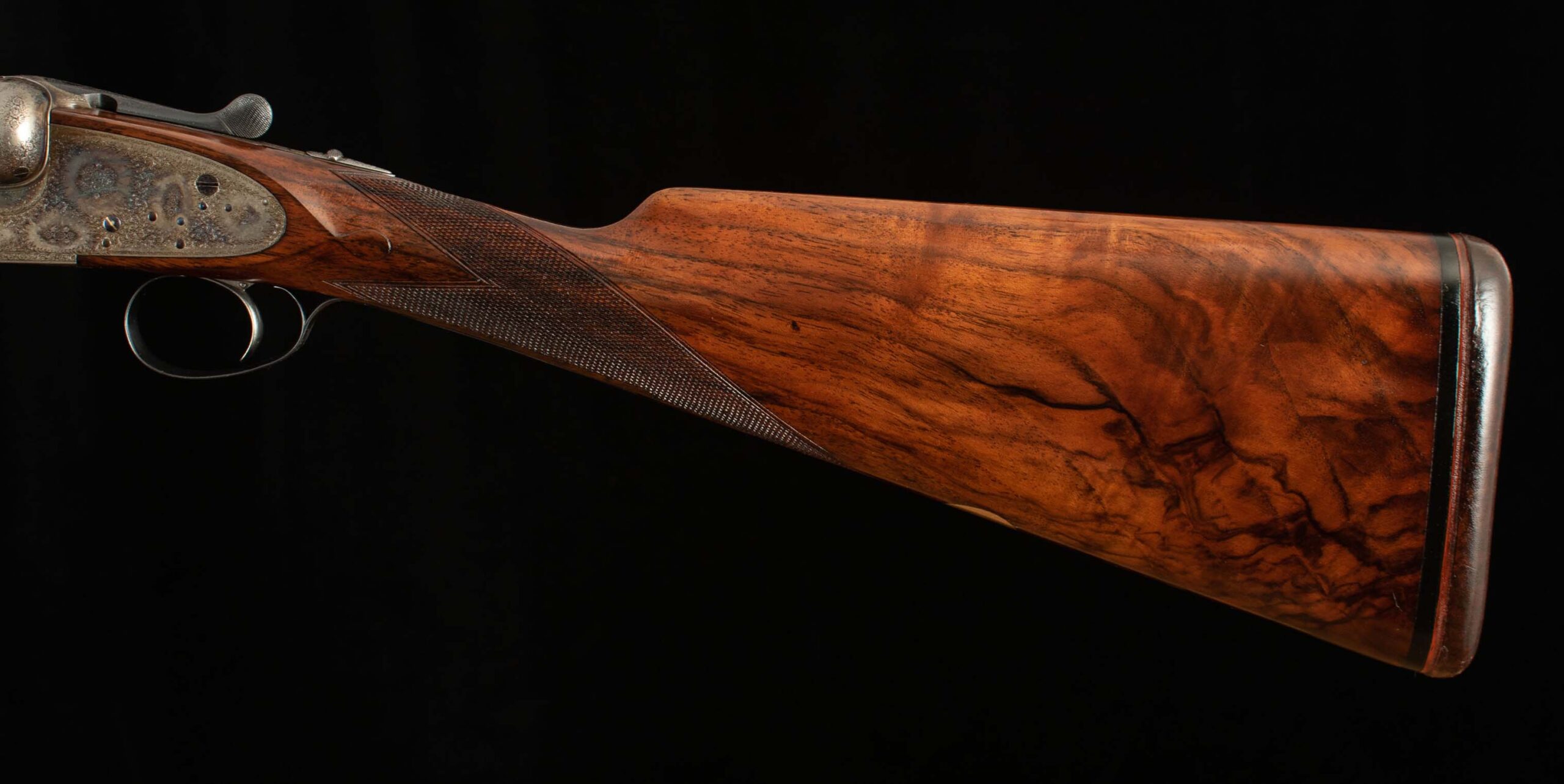 Boss & Co. is the oldest maker in the London trade, having its beginnings in 1812 and operating as a privately held company to this day. Boss only made one grade of gun…A BEST GUN. From the Boss website: “We would say from the outset that we make only one grade of gun and have never placed a second quality make upon the market. This policy has enabled us to retain the services of the finest workmen in London, and to give them continuous employment. The advantages attending the production of best work only are manifold. There is no opportunity for the work of inferior men to be utilised in the economy of the workshop, which is frequently the case when more than one class of weapon is produced. The owner of a Boss & Co gun has the satisfaction of knowing that he has the best gun that money can buy, and that no one has a better gun. The Boss & Co gun has, therefore, always a standard value whether new or second hand. Our output is strictly limited according to the amount of first class labour available.” Take a look at the photo of the factory records; the handwriting in the records gives an idea of the care that is taken in every aspect of bringing these incredible firearms to their owner. The barrels are a classy, traditional brown finish with gorgeous ribs, and silver front bead. The finish is 99%. The frame, sidelocks, barrel fences, and top tang have beautiful scrollwork, and they retain 95% of their factory case color. One specific note, there is a hard to see light scratch on the left sidelock near the very front. This Boss Best gun is still in Proof, the chambers and chokes match the markings and order book this is important because English Guns that are out of proof (anything that changes its original specifications) are considered a lesser investment as any future buyer will be wary of them. Not so with the beautiful example, it is IN PROOF and will continue to accrue value. The black of the top lever and the trigger guard have 95% of their finish. A rolled right edge can be found on the trigger guard, a unique design detail. The forend latch and escutcheon are beautifully engraved and fit perfectly into the flame-figured walnut. Light flame-figure and deep, rich grain continue onto the straight grip English stock with carved drop points. The point checkering pattern has deep, double borders. Boss offered this type of leather covered pad that is cut back to reveal the rubber recoil pad beneath. Upon discussion with the folks at Boss and referencing the factory records for length of pull, we believe the pad to be part of the original order, although it was not specified directly on the order sheet. The brown leather and the brown barrels tie together nicely. Operationally, the assisted-opener springs to life when the top lever is released. The trigger pulls are crisp, and the ejectors are strong and timed perfectly. There is no such thing as an “average” or “typical” Boss shotgun. Each one is crafted with a level of personality and detail that stands out in its own way. This fine gun is no exception. The “One Duck Gun” with hearty 30” barrels and a separate set of 28” barrels, combined with the brown finishes make this gorgeous gun one to be enjoyed in the field, shown off at the club, or displayed as a centerpiece of your collection. It is ready to be stewarded into the next generation by someone who appreciates history and mastery of craft.