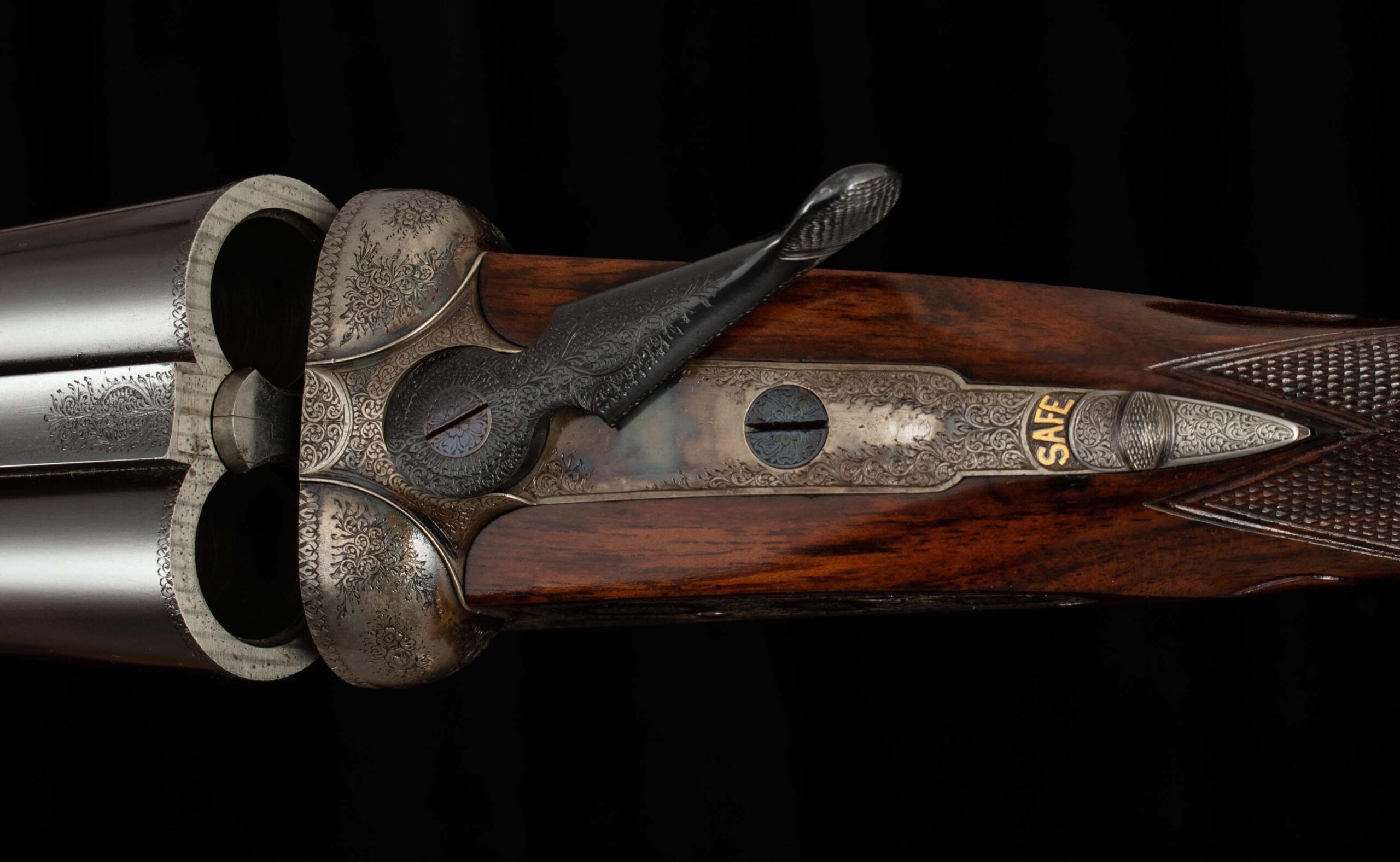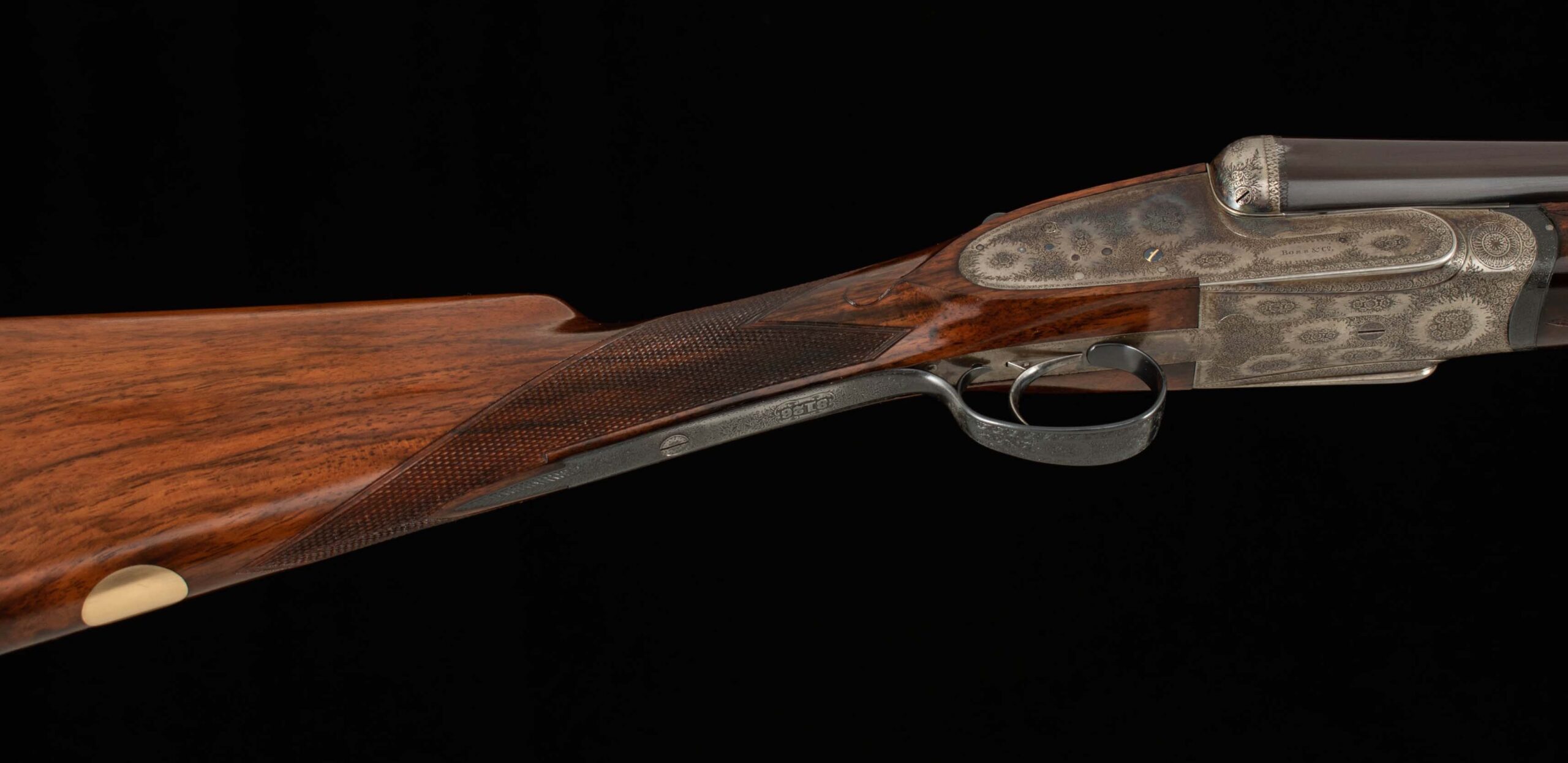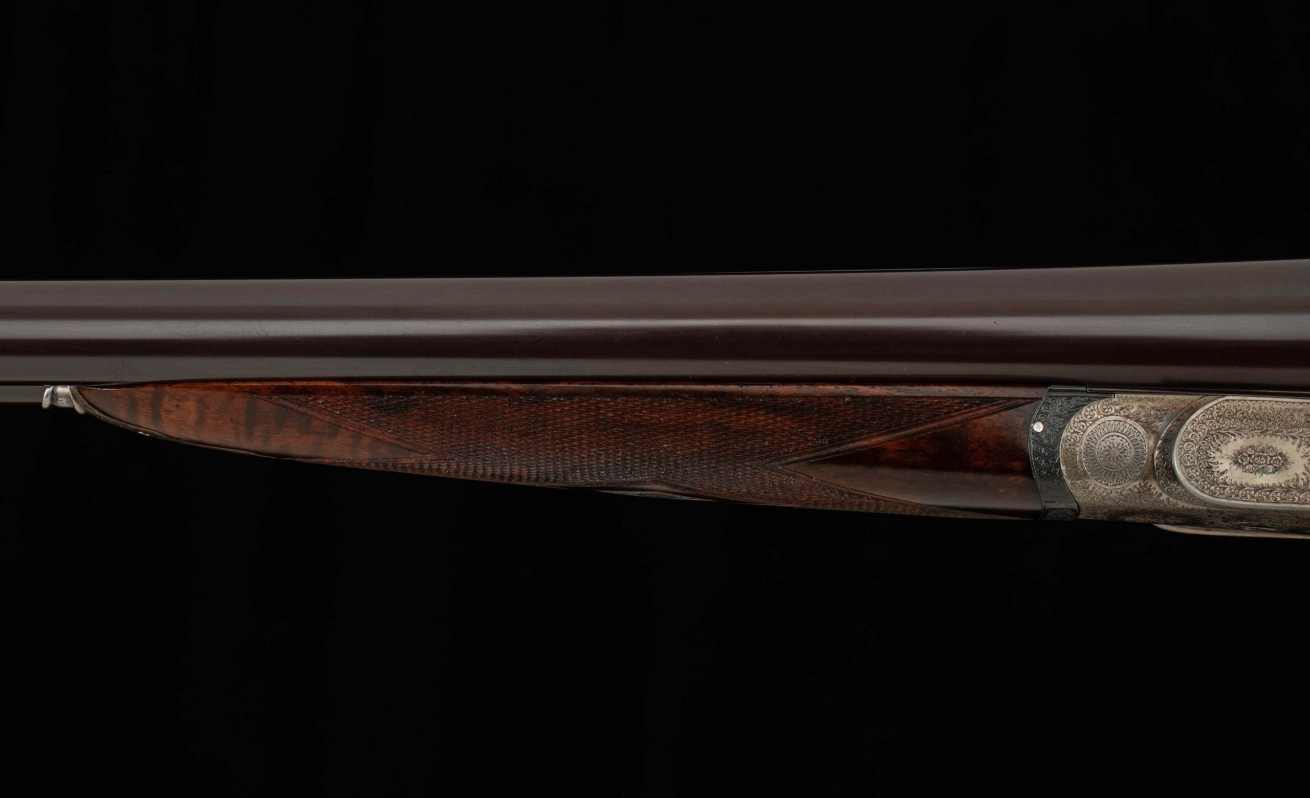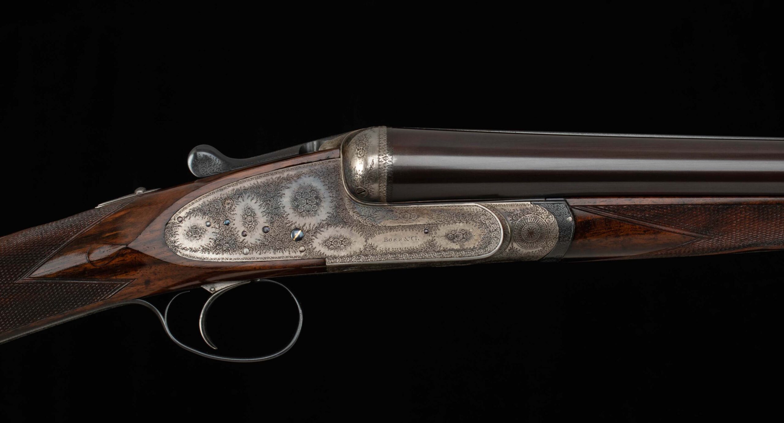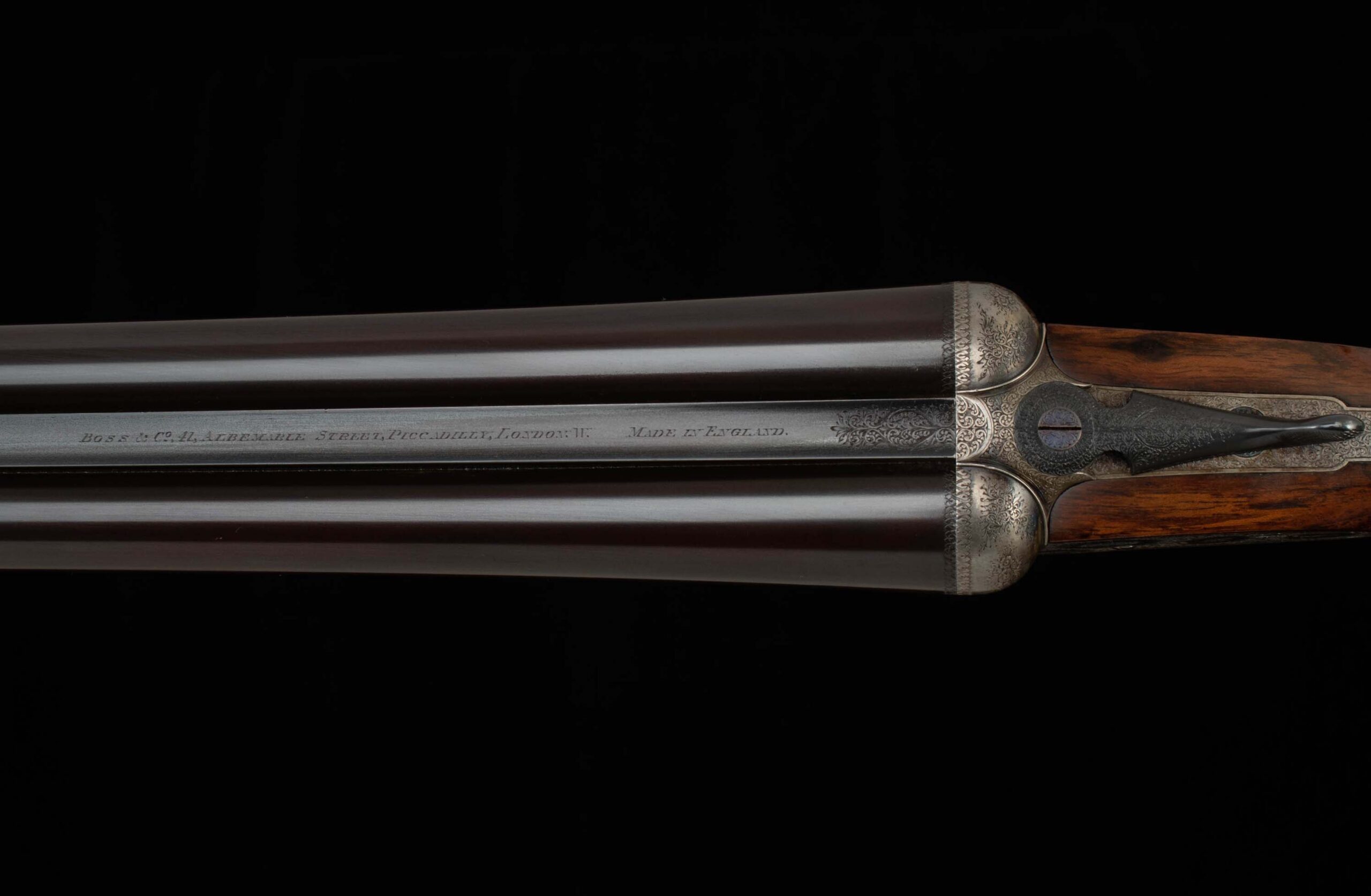 Boss & Co. is the oldest maker in the London trade, having its beginnings in 1812 and operating as a privately held company to this day. Boss only made one grade of gun…A BEST GUN. From the Boss website: “We would say from the outset that we make only one grade of gun and have never placed a second quality make upon the market. This policy has enabled us to retain the services of the finest workmen in London, and to give them continuous employment. The advantages attending the production of best work only are manifold. There is no opportunity for the work of inferior men to be utilised in the economy of the workshop, which is frequently the case when more than one class of weapon is produced. The owner of a Boss & Co gun has the satisfaction of knowing that he has the best gun that money can buy, and that no one has a better gun. The Boss & Co gun has, therefore, always a standard value whether new or second hand. Our output is strictly limited according to the amount of first class labour available.” Take a look at the photo of the factory records; the handwriting in the records gives an idea of the care that is taken in every aspect of bringing these incredible firearms to their owner. The barrels are a classy, traditional brown finish with gorgeous ribs, and silver front bead. The finish is 99%. The frame, sidelocks, barrel fences, and top tang have beautiful scrollwork, and they retain 95% of their factory case color. One specific note, there is a hard to see light scratch on the left sidelock near the very front. This Boss Best gun is still in Proof, the chambers and chokes match the markings and order book this is important because English Guns that are out of proof (anything that changes its original specifications) are considered a lesser investment as any future buyer will be wary of them. Not so with the beautiful example, it is IN PROOF and will continue to accrue value. The black of the top lever and the trigger guard have 95% of their finish. A rolled right edge can be found on the trigger guard, a unique design detail. The forend latch and escutcheon are beautifully engraved and fit perfectly into the flame-figured walnut. Light flame-figure and deep, rich grain continue onto the straight grip English stock with carved drop points. The point checkering pattern has deep, double borders. Boss offered this type of leather covered pad that is cut back to reveal the rubber recoil pad beneath. Upon discussion with the folks at Boss and referencing the factory records for length of pull, we believe the pad to be part of the original order, although it was not specified directly on the order sheet. The brown leather and the brown barrels tie together nicely. Operationally, the assisted-opener springs to life when the top lever is released. The trigger pulls are crisp, and the ejectors are strong and timed perfectly. There is no such thing as an “average” or “typical” Boss shotgun. Each one is crafted with a level of personality and detail that stands out in its own way. This fine gun is no exception. The “One Duck Gun” with hearty 30” barrels and a separate set of 28” barrels, combined with the brown finishes make this gorgeous gun one to be enjoyed in the field, shown off at the club, or displayed as a centerpiece of your collection. It is ready to be stewarded into the next generation by someone who appreciates history and mastery of craft.