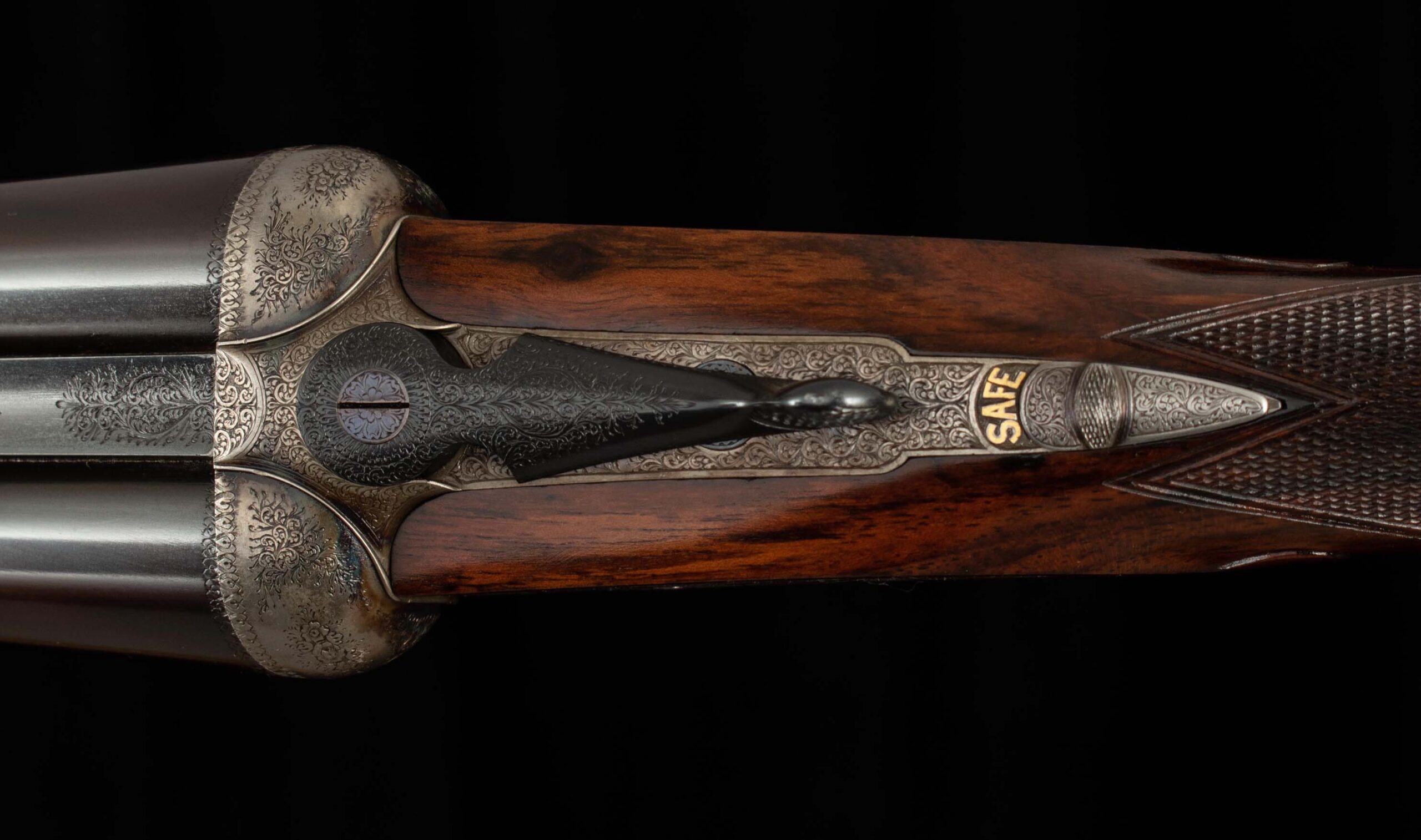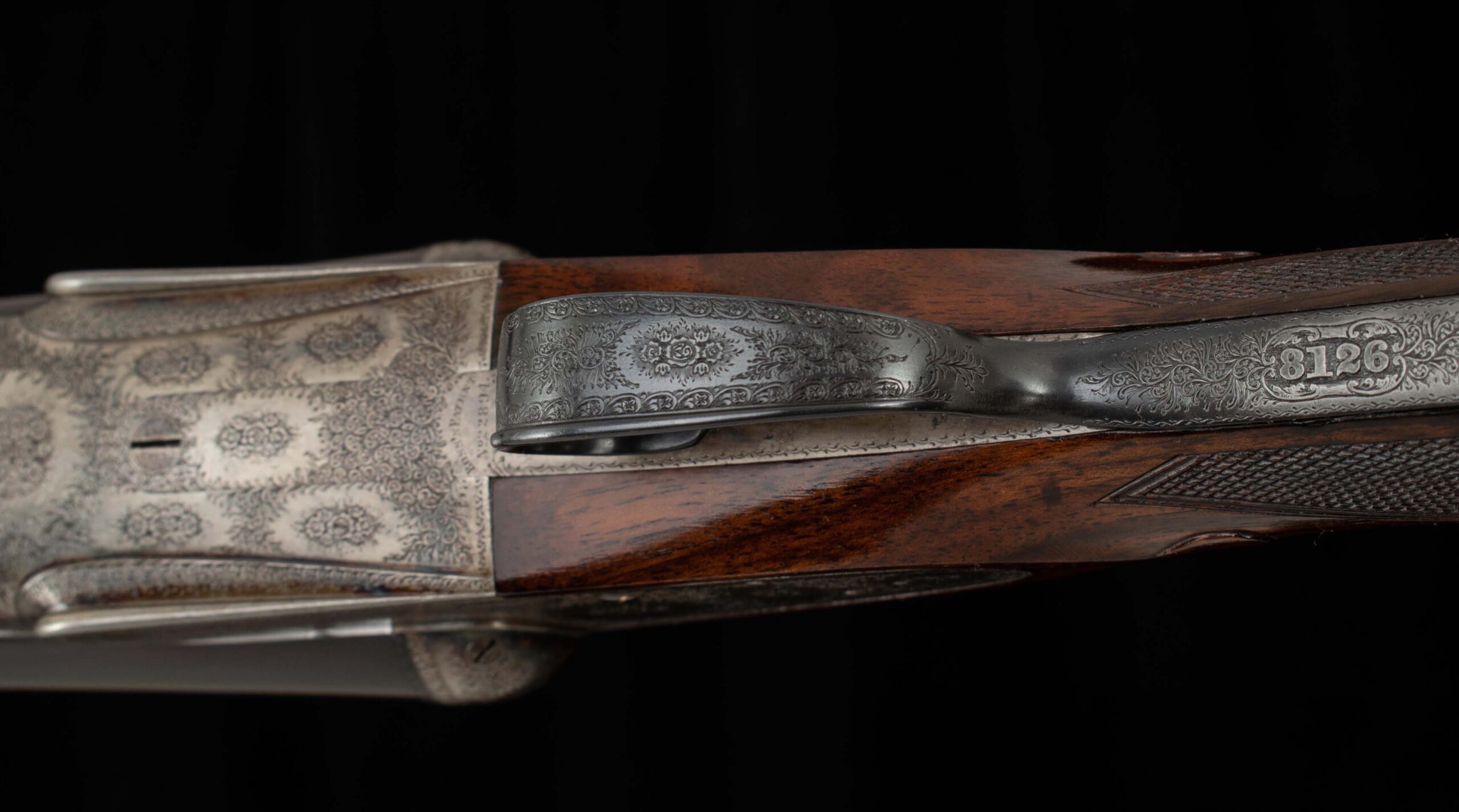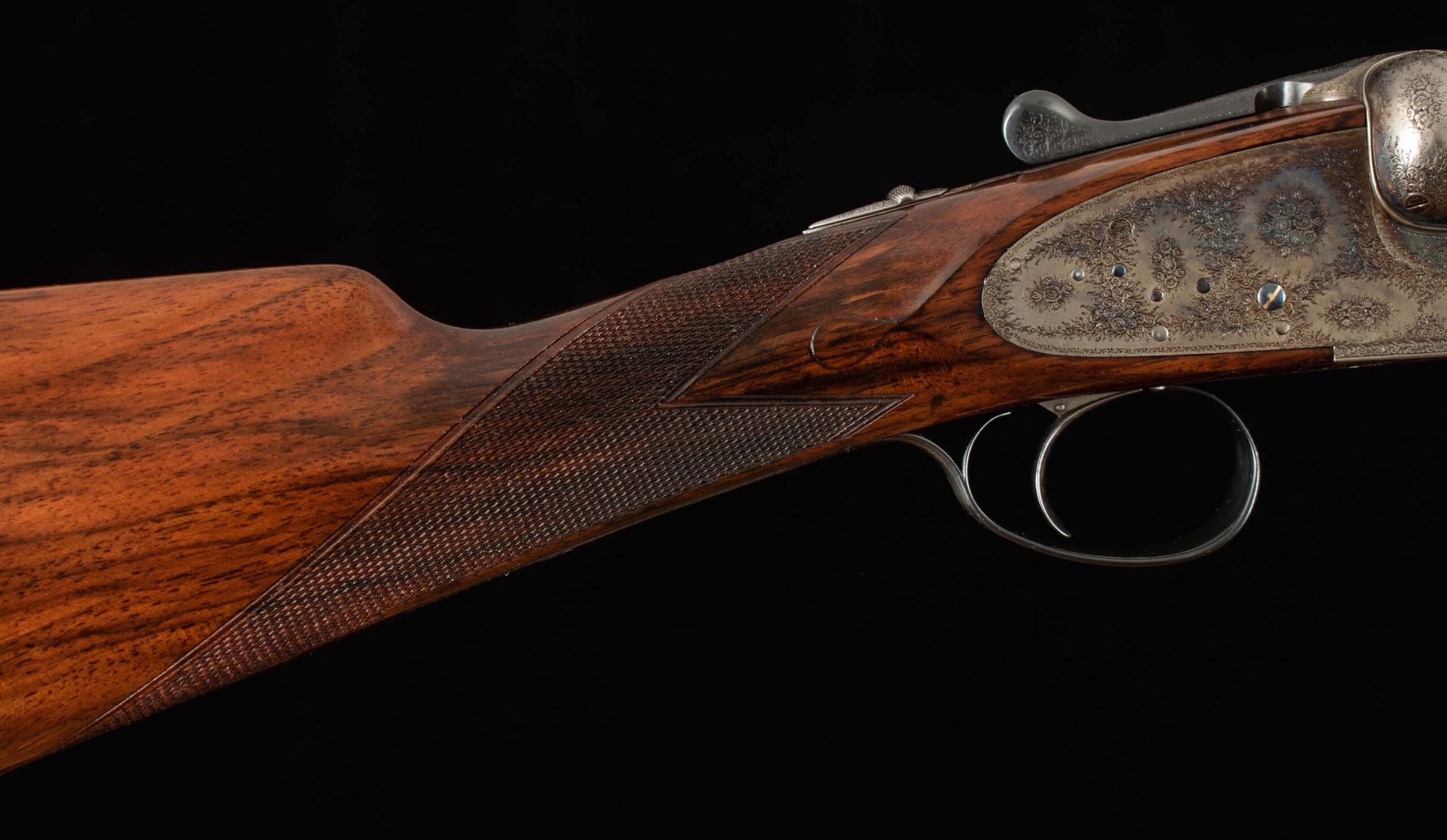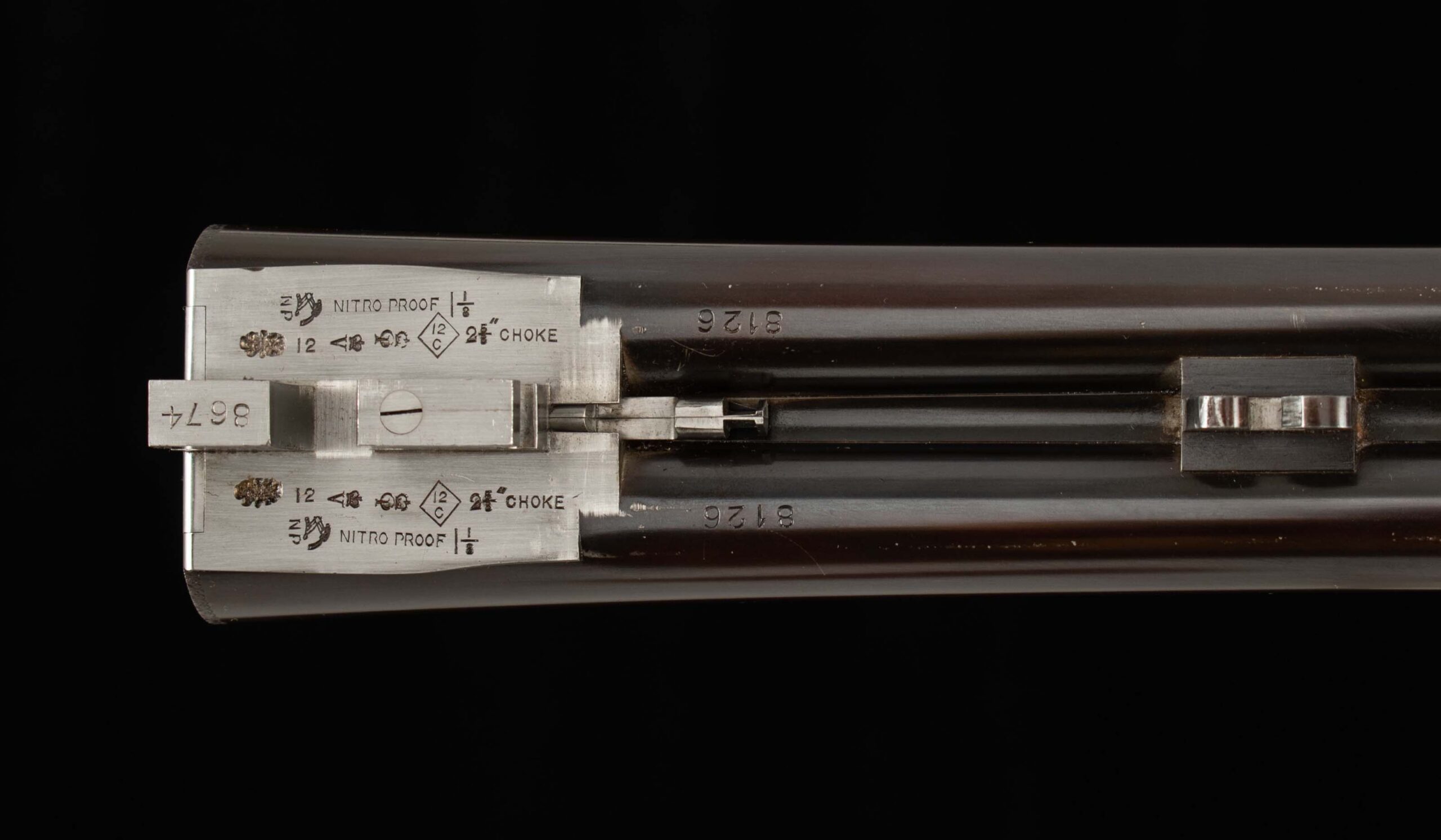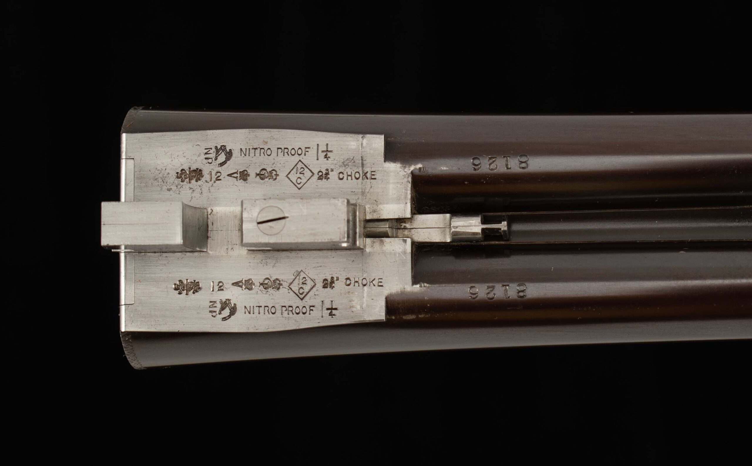 Boss & Co. is the oldest maker in the London trade, having its beginnings in 1812 and operating as a privately held company to this day. Boss only made one grade of gun…A BEST GUN. From the Boss website: “We would say from the outset that we make only one grade of gun and have never placed a second quality make upon the market. This policy has enabled us to retain the services of the finest workmen in London, and to give them continuous employment. The advantages attending the production of best work only are manifold. There is no opportunity for the work of inferior men to be utilised in the economy of the workshop, which is frequently the case when more than one class of weapon is produced. The owner of a Boss & Co gun has the satisfaction of knowing that he has the best gun that money can buy, and that no one has a better gun. The Boss & Co gun has, therefore, always a standard value whether new or second hand. Our output is strictly limited according to the amount of first class labour available.” Take a look at the photo of the factory records; the handwriting in the records gives an idea of the care that is taken in every aspect of bringing these incredible firearms to their owner. The barrels are a classy, traditional brown finish with gorgeous ribs, and silver front bead. The finish is 99%. The frame, sidelocks, barrel fences, and top tang have beautiful scrollwork, and they retain 95% of their factory case color. One specific note, there is a hard to see light scratch on the left sidelock near the very front. This Boss Best gun is still in Proof, the chambers and chokes match the markings and order book this is important because English Guns that are out of proof (anything that changes its original specifications) are considered a lesser investment as any future buyer will be wary of them. Not so with the beautiful example, it is IN PROOF and will continue to accrue value. The black of the top lever and the trigger guard have 95% of their finish. A rolled right edge can be found on the trigger guard, a unique design detail. The forend latch and escutcheon are beautifully engraved and fit perfectly into the flame-figured walnut. Light flame-figure and deep, rich grain continue onto the straight grip English stock with carved drop points. The point checkering pattern has deep, double borders. Boss offered this type of leather covered pad that is cut back to reveal the rubber recoil pad beneath. Upon discussion with the folks at Boss and referencing the factory records for length of pull, we believe the pad to be part of the original order, although it was not specified directly on the order sheet. The brown leather and the brown barrels tie together nicely. Operationally, the assisted-opener springs to life when the top lever is released. The trigger pulls are crisp, and the ejectors are strong and timed perfectly. There is no such thing as an “average” or “typical” Boss shotgun. Each one is crafted with a level of personality and detail that stands out in its own way. This fine gun is no exception. The “One Duck Gun” with hearty 30” barrels and a separate set of 28” barrels, combined with the brown finishes make this gorgeous gun one to be enjoyed in the field, shown off at the club, or displayed as a centerpiece of your collection. It is ready to be stewarded into the next generation by someone who appreciates history and mastery of craft.