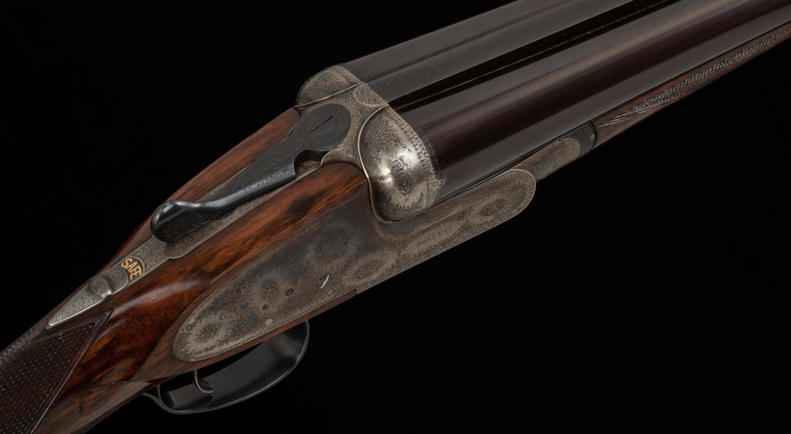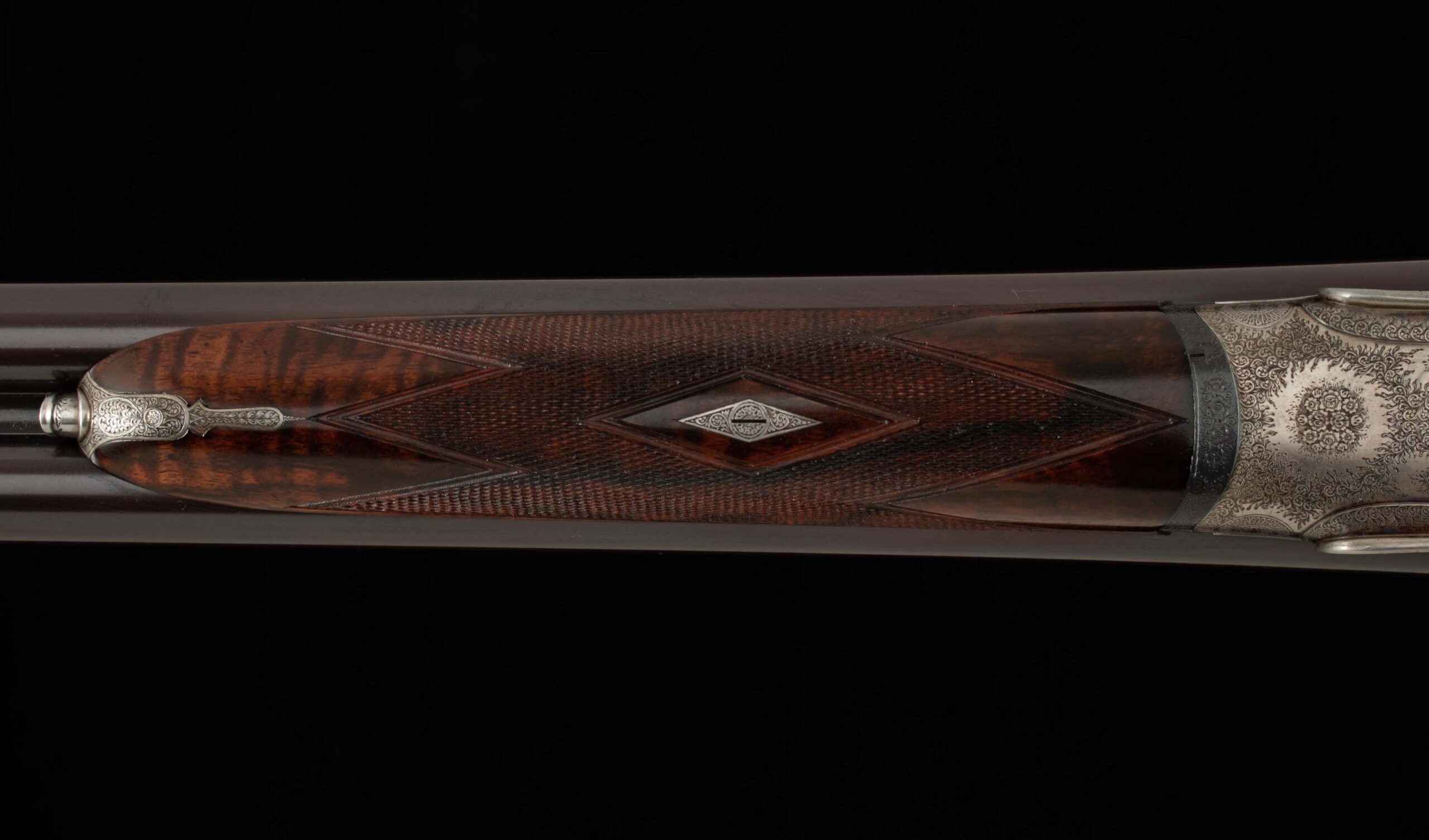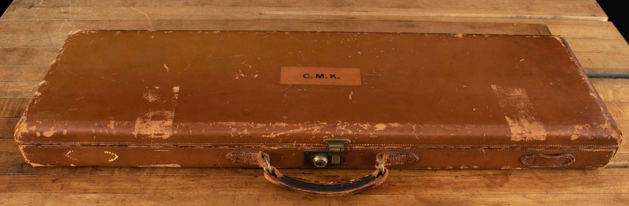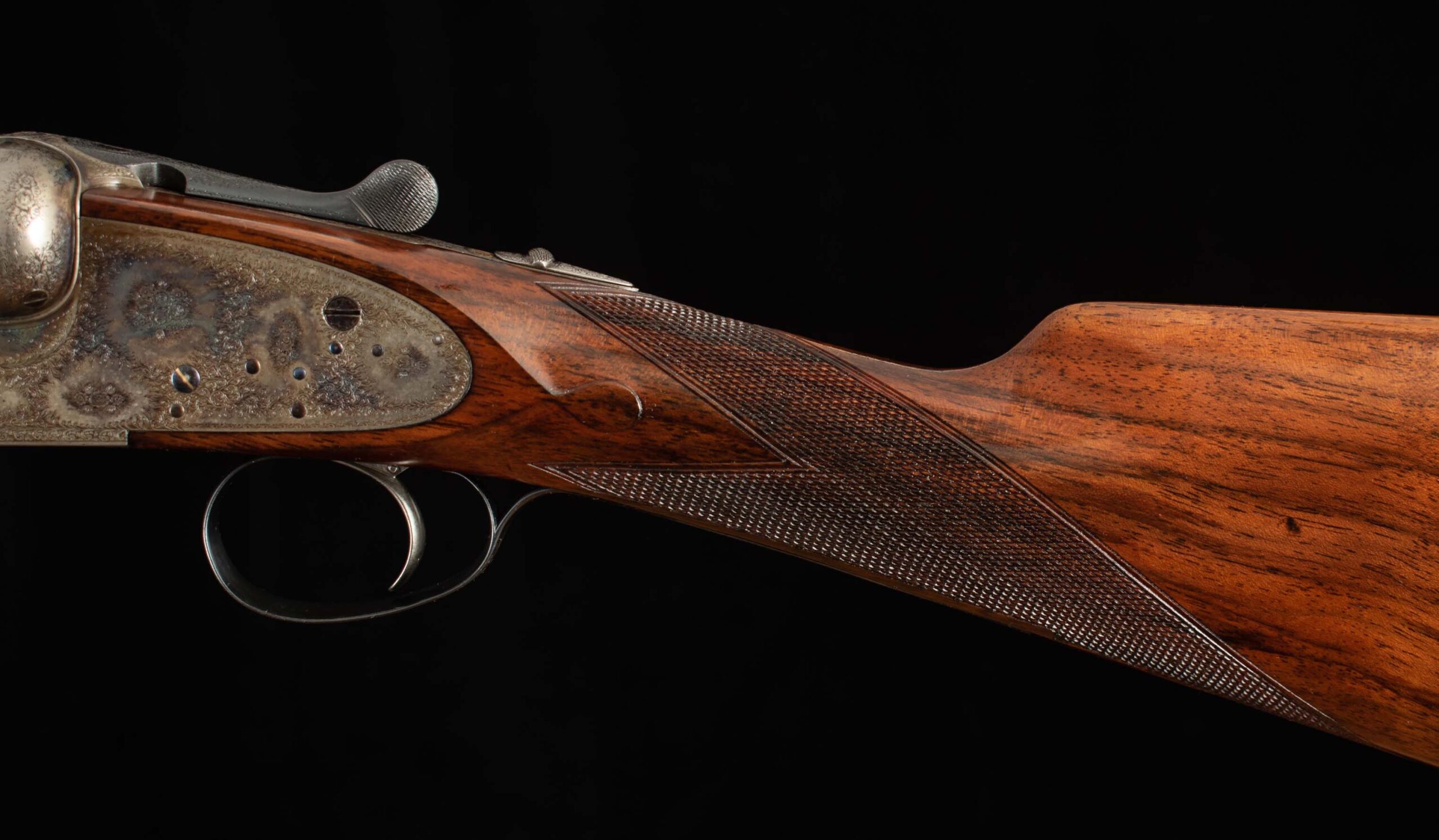 Boss & Co. is the oldest maker in the London trade, having its beginnings in 1812 and operating as a privately held company to this day. Boss only made one grade of gun…A BEST GUN. From the Boss website: “We would say from the outset that we make only one grade of gun and have never placed a second quality make upon the market. This policy has enabled us to retain the services of the finest workmen in London, and to give them continuous employment. The advantages attending the production of best work only are manifold. There is no opportunity for the work of inferior men to be utilised in the economy of the workshop, which is frequently the case when more than one class of weapon is produced. The owner of a Boss & Co gun has the satisfaction of knowing that he has the best gun that money can buy, and that no one has a better gun. The Boss & Co gun has, therefore, always a standard value whether new or second hand. Our output is strictly limited according to the amount of first class labour available.” Take a look at the photo of the factory records; the handwriting in the records gives an idea of the care that is taken in every aspect of bringing these incredible firearms to their owner. The barrels are a classy, traditional brown finish with gorgeous ribs, and silver front bead. The finish is 99%. The frame, sidelocks, barrel fences, and top tang have beautiful scrollwork, and they retain 95% of their factory case color. One specific note, there is a hard to see light scratch on the left sidelock near the very front. This Boss Best gun is still in Proof, the chambers and chokes match the markings and order book this is important because English Guns that are out of proof (anything that changes its original specifications) are considered a lesser investment as any future buyer will be wary of them. Not so with the beautiful example, it is IN PROOF and will continue to accrue value. The black of the top lever and the trigger guard have 95% of their finish. A rolled right edge can be found on the trigger guard, a unique design detail. The forend latch and escutcheon are beautifully engraved and fit perfectly into the flame-figured walnut. Light flame-figure and deep, rich grain continue onto the straight grip English stock with carved drop points. The point checkering pattern has deep, double borders. Boss offered this type of leather covered pad that is cut back to reveal the rubber recoil pad beneath. Upon discussion with the folks at Boss and referencing the factory records for length of pull, we believe the pad to be part of the original order, although it was not specified directly on the order sheet. The brown leather and the brown barrels tie together nicely. Operationally, the assisted-opener springs to life when the top lever is released. The trigger pulls are crisp, and the ejectors are strong and timed perfectly. There is no such thing as an “average” or “typical” Boss shotgun. Each one is crafted with a level of personality and detail that stands out in its own way. This fine gun is no exception. The “One Duck Gun” with hearty 30” barrels and a separate set of 28” barrels, combined with the brown finishes make this gorgeous gun one to be enjoyed in the field, shown off at the club, or displayed as a centerpiece of your collection. It is ready to be stewarded into the next generation by someone who appreciates history and mastery of craft.