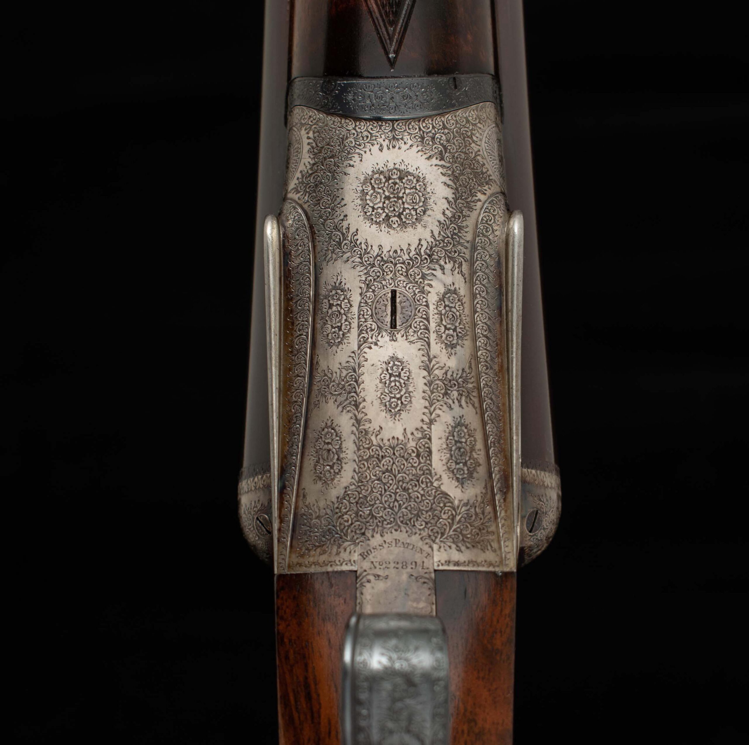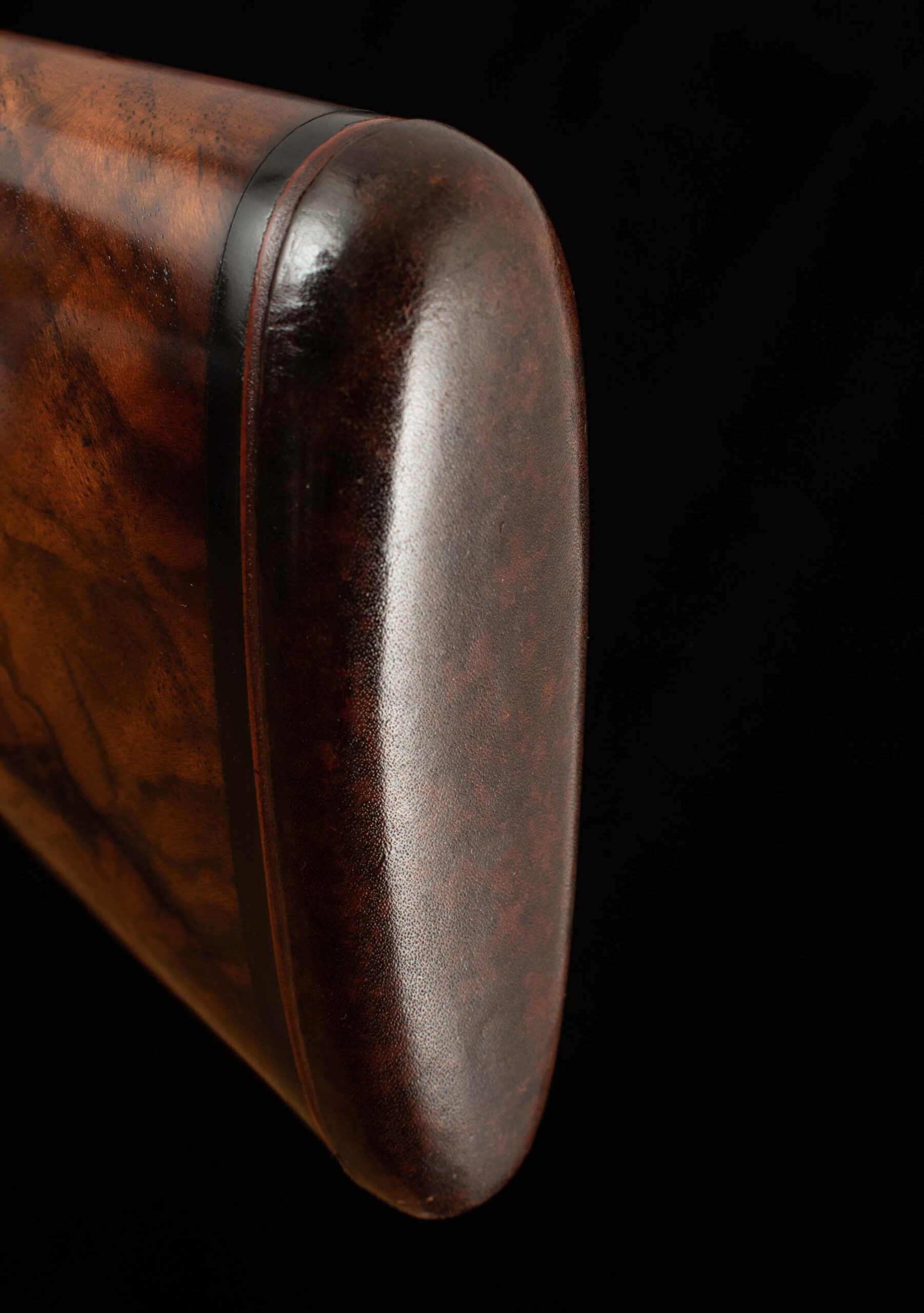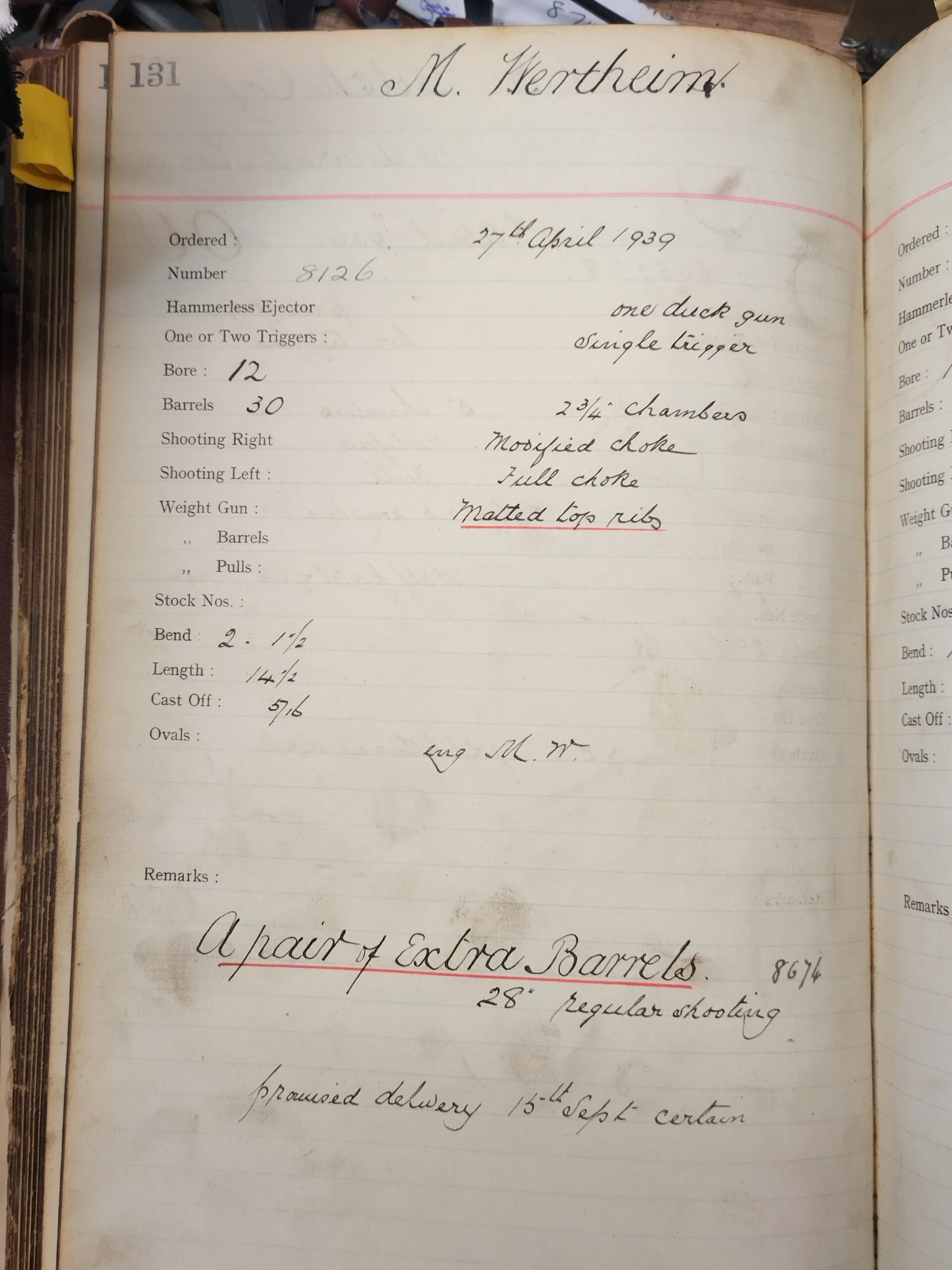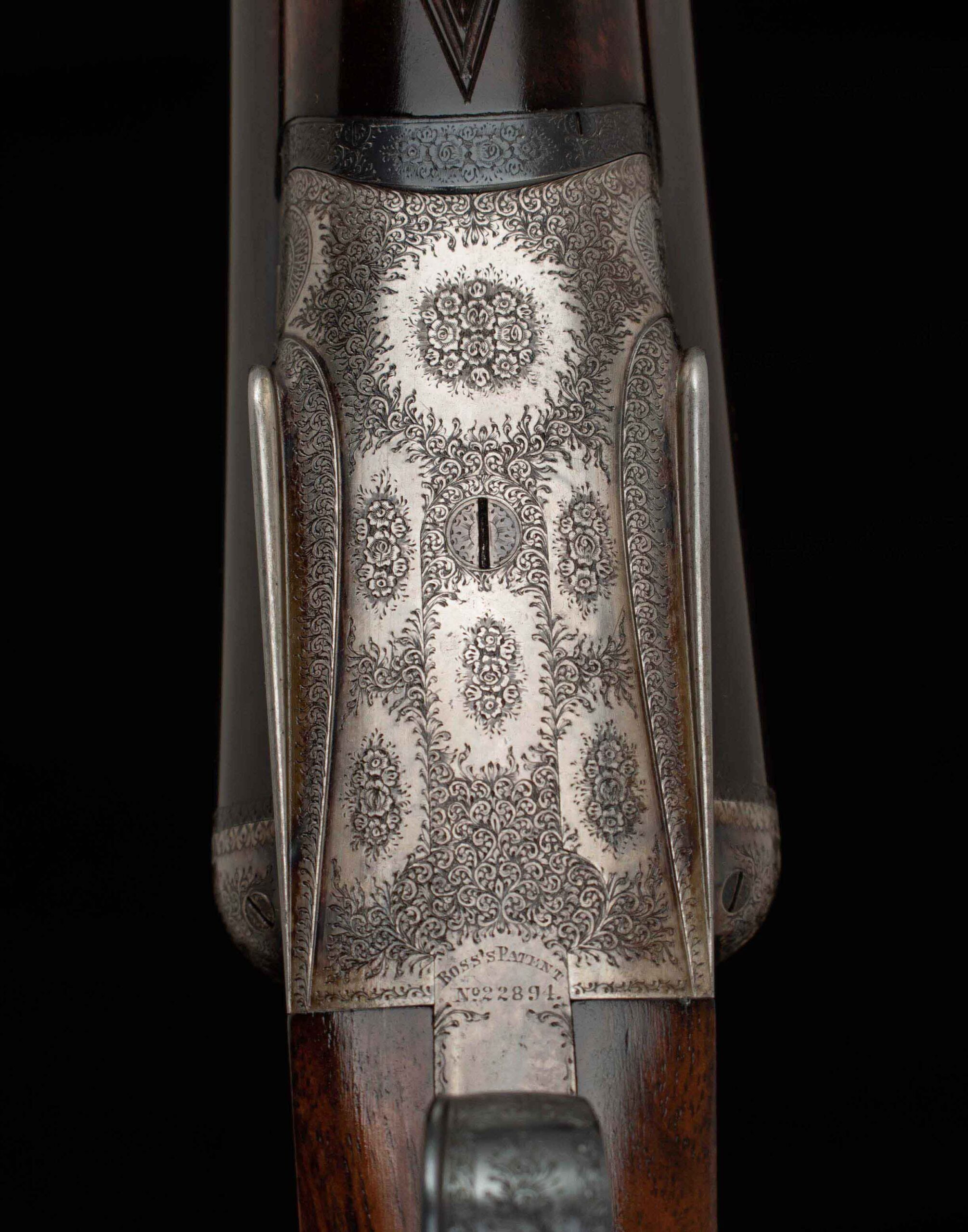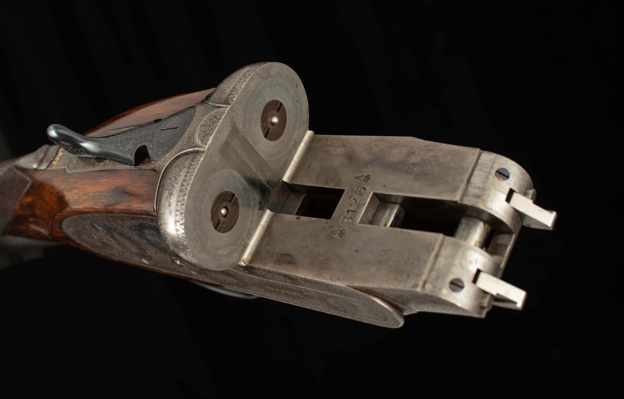 Boss & Co. is the oldest maker in the London trade, having its beginnings in 1812 and operating as a privately held company to this day. Boss only made one grade of gun…A BEST GUN. From the Boss website: “We would say from the outset that we make only one grade of gun and have never placed a second quality make upon the market. This policy has enabled us to retain the services of the finest workmen in London, and to give them continuous employment. The advantages attending the production of best work only are manifold. There is no opportunity for the work of inferior men to be utilised in the economy of the workshop, which is frequently the case when more than one class of weapon is produced. The owner of a Boss & Co gun has the satisfaction of knowing that he has the best gun that money can buy, and that no one has a better gun. The Boss & Co gun has, therefore, always a standard value whether new or second hand. Our output is strictly limited according to the amount of first class labour available.” Take a look at the photo of the factory records; the handwriting in the records gives an idea of the care that is taken in every aspect of bringing these incredible firearms to their owner. The barrels are a classy, traditional brown finish with gorgeous ribs, and silver front bead. The finish is 99%. The frame, sidelocks, barrel fences, and top tang have beautiful scrollwork, and they retain 95% of their factory case color. One specific note, there is a hard to see light scratch on the left sidelock near the very front. This Boss Best gun is still in Proof, the chambers and chokes match the markings and order book this is important because English Guns that are out of proof (anything that changes its original specifications) are considered a lesser investment as any future buyer will be wary of them. Not so with the beautiful example, it is IN PROOF and will continue to accrue value. The black of the top lever and the trigger guard have 95% of their finish. A rolled right edge can be found on the trigger guard, a unique design detail. The forend latch and escutcheon are beautifully engraved and fit perfectly into the flame-figured walnut. Light flame-figure and deep, rich grain continue onto the straight grip English stock with carved drop points. The point checkering pattern has deep, double borders. Boss offered this type of leather covered pad that is cut back to reveal the rubber recoil pad beneath. Upon discussion with the folks at Boss and referencing the factory records for length of pull, we believe the pad to be part of the original order, although it was not specified directly on the order sheet. The brown leather and the brown barrels tie together nicely. Operationally, the assisted-opener springs to life when the top lever is released. The trigger pulls are crisp, and the ejectors are strong and timed perfectly. There is no such thing as an “average” or “typical” Boss shotgun. Each one is crafted with a level of personality and detail that stands out in its own way. This fine gun is no exception. The “One Duck Gun” with hearty 30” barrels and a separate set of 28” barrels, combined with the brown finishes make this gorgeous gun one to be enjoyed in the field, shown off at the club, or displayed as a centerpiece of your collection. It is ready to be stewarded into the next generation by someone who appreciates history and mastery of craft.