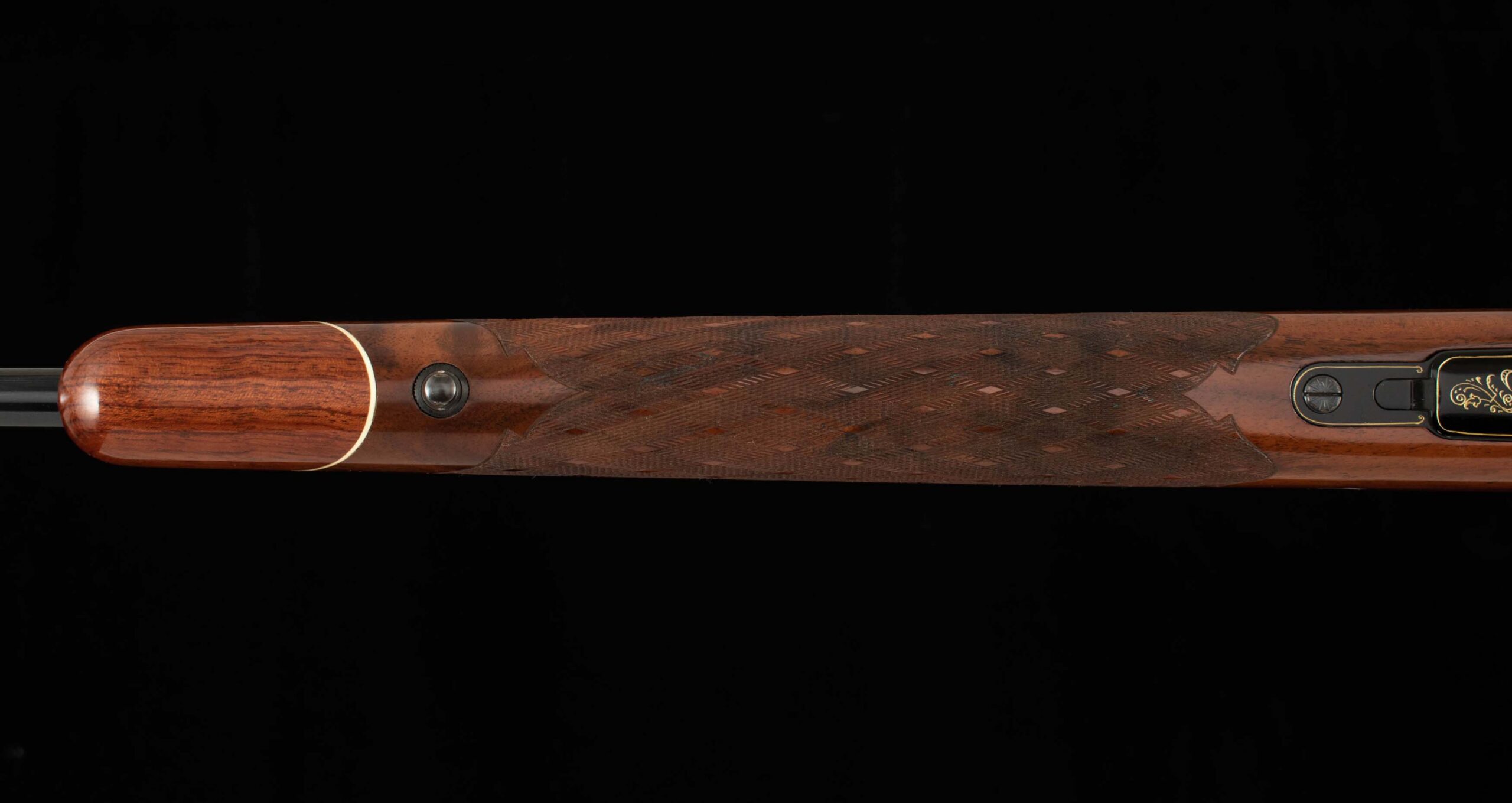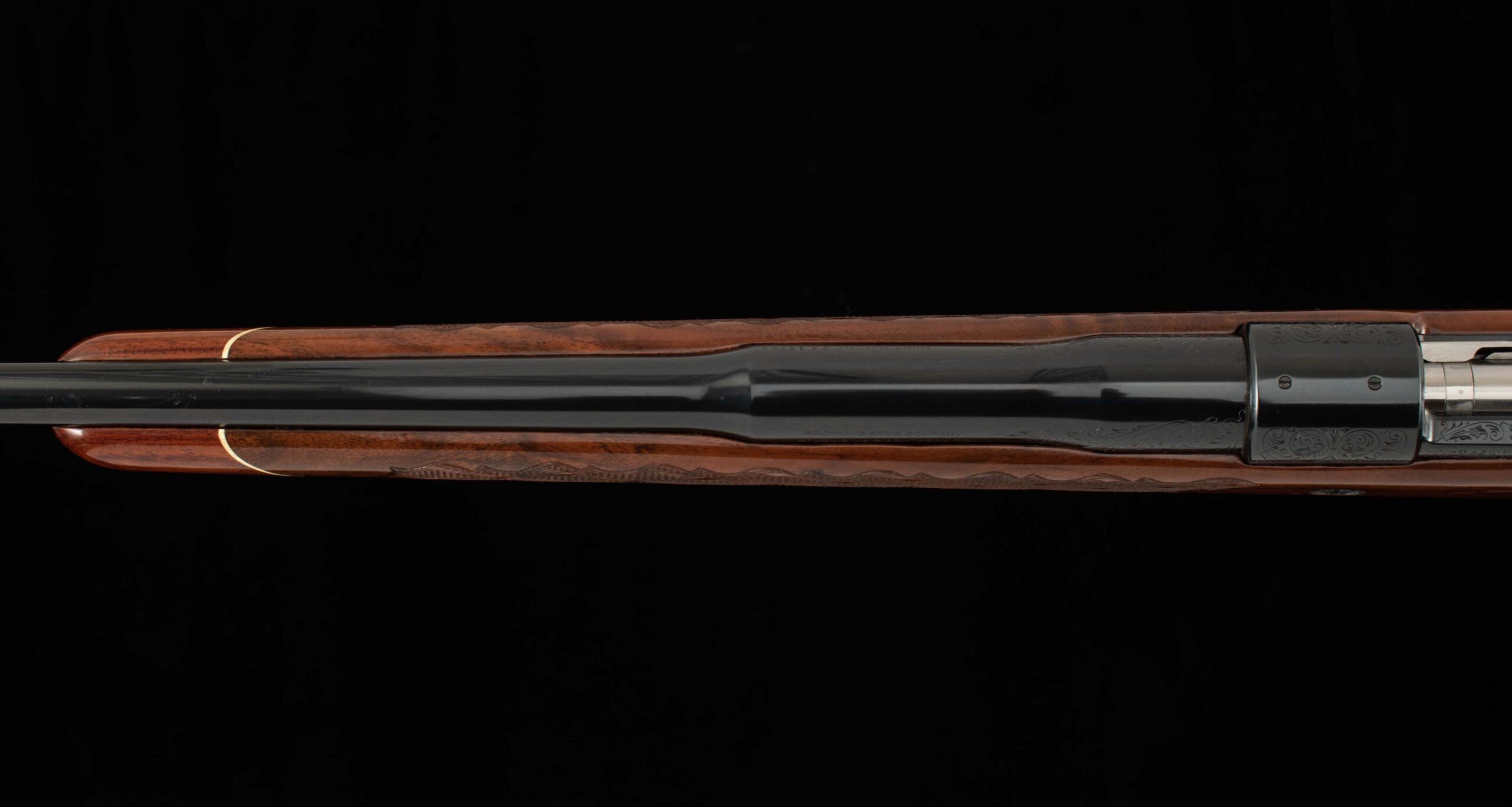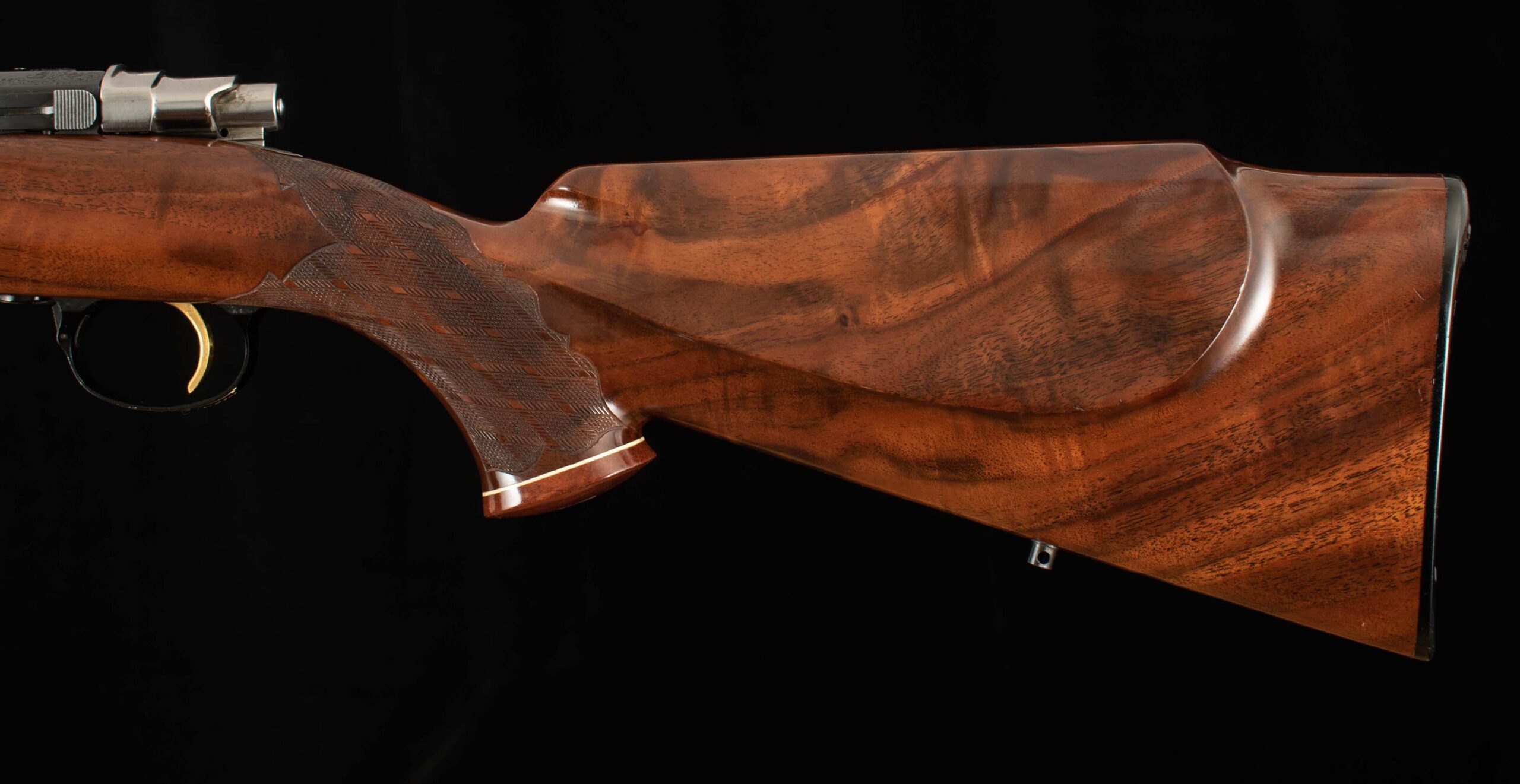 Vintage Firearms is pleased to offer a rare bolt action medallion rifle chambered in the classic American .30-06 Springfield. The Browning High-Power rifles were made in three different grades: Safari, Medallion, and Olympian, offering progressively higher levels of quality and ornateness in the wood, checkering, and special features like engraved floorplates. The medallion grade specifically is an upgrade from the Safari, featuring better wood, skip-line checkering, a rosewood grip cap, and with a distinctive ram head engraved on the floorplate. Production numbers for these rifles are extremely low and often overlooked or not even known by most. In total the estimated production for all calibers in the Medallion Grade is estimated at 4035. This example, produced 1962, is in superb condition. The timeless Mauser action is smooth and elegant while not compromising on ruggedness and reliability. The 22” barrel retains a 99% factory finishes, while the receiver retains 100%, the engraving is clear and crisp. The receiver is tapped for a scope, and it is hard to see if it ever had one fitted given the receiver condition, not a mark visible! The stock features a Monte-Carlo comb with cheek piece, perfect skip-line checkering and a rosewood caped pistol grip and forend, with the classic white line spacer, the butt still has its original factory plate. The wood is stunning with plenty of figure, fiddleback and contrast, there are some marks to the factory Finnish, possible some well-earned hunting scars or maybe just from the gun being handled and admired, please see the photographs. Guns built after 1966 were prone to salt contamination and rust because of the way Browning cured their wood. Not all guns were affected, but the marketplace still has an aversion to guns built from 1967 to about 1971. This Medallion Grade was produced prior to this window meaning it’s salt free! The integrated control feed keeps the rounds right where they need to be, just one less thing you’ll have to think about. This medallion grade features is a hinged base plate making safe unloading a breeze! Perfect for your next hunting trip or as another fine addition to your collection. Check the specifications and pictures below. Thanks for looking!