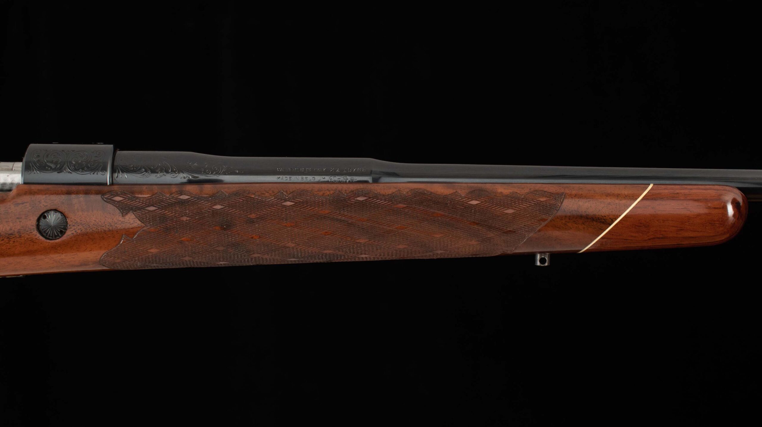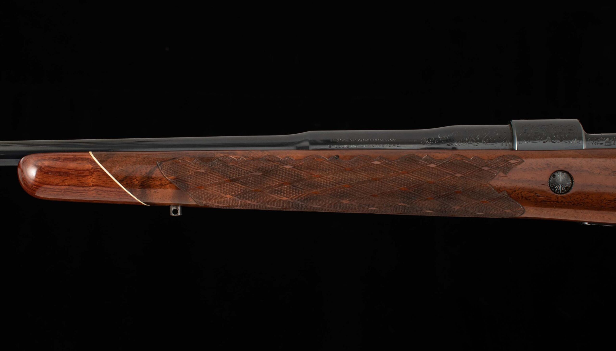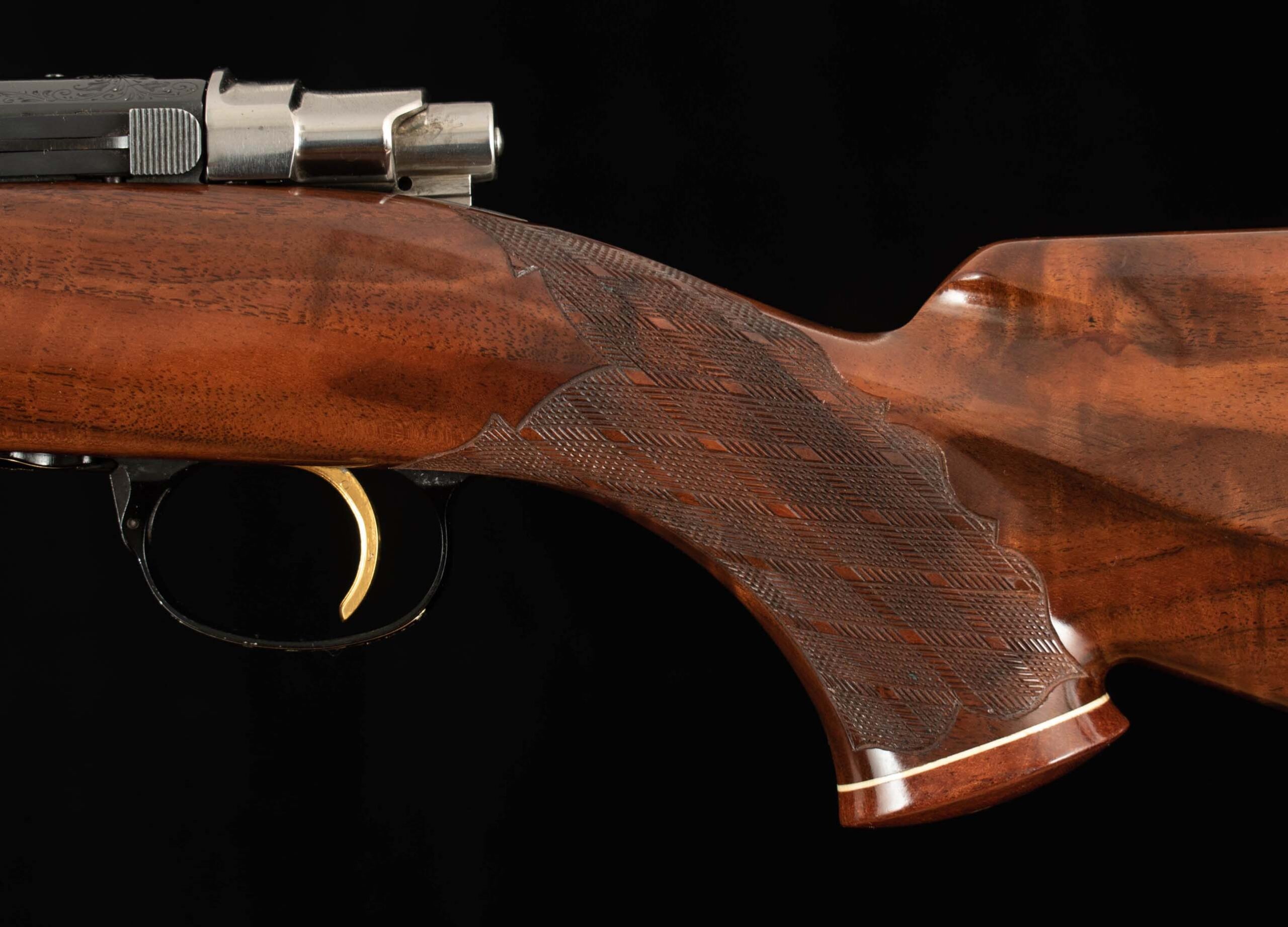 Vintage Firearms is pleased to offer a rare bolt action medallion rifle chambered in the classic American .30-06 Springfield. The Browning High-Power rifles were made in three different grades: Safari, Medallion, and Olympian, offering progressively higher levels of quality and ornateness in the wood, checkering, and special features like engraved floorplates. The medallion grade specifically is an upgrade from the Safari, featuring better wood, skip-line checkering, a rosewood grip cap, and with a distinctive ram head engraved on the floorplate. Production numbers for these rifles are extremely low and often overlooked or not even known by most. In total the estimated production for all calibers in the Medallion Grade is estimated at 4035. This example, produced 1962, is in superb condition. The timeless Mauser action is smooth and elegant while not compromising on ruggedness and reliability. The 22” barrel retains a 99% factory finishes, while the receiver retains 100%, the engraving is clear and crisp. The receiver is tapped for a scope, and it is hard to see if it ever had one fitted given the receiver condition, not a mark visible! The stock features a Monte-Carlo comb with cheek piece, perfect skip-line checkering and a rosewood caped pistol grip and forend, with the classic white line spacer, the butt still has its original factory plate. The wood is stunning with plenty of figure, fiddleback and contrast, there are some marks to the factory Finnish, possible some well-earned hunting scars or maybe just from the gun being handled and admired, please see the photographs. Guns built after 1966 were prone to salt contamination and rust because of the way Browning cured their wood. Not all guns were affected, but the marketplace still has an aversion to guns built from 1967 to about 1971. This Medallion Grade was produced prior to this window meaning it’s salt free! The integrated control feed keeps the rounds right where they need to be, just one less thing you’ll have to think about. This medallion grade features is a hinged base plate making safe unloading a breeze! Perfect for your next hunting trip or as another fine addition to your collection. Check the specifications and pictures below. Thanks for looking!