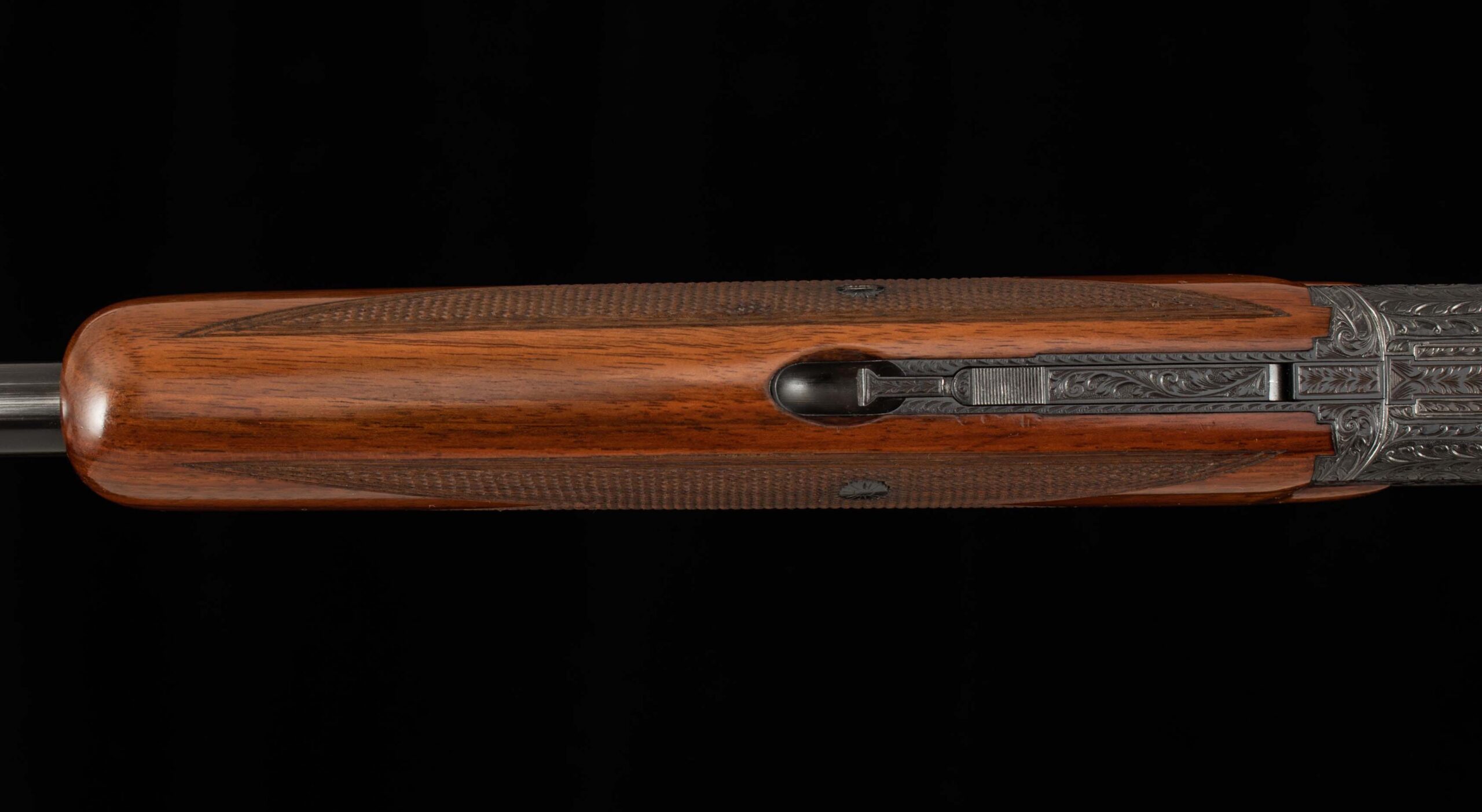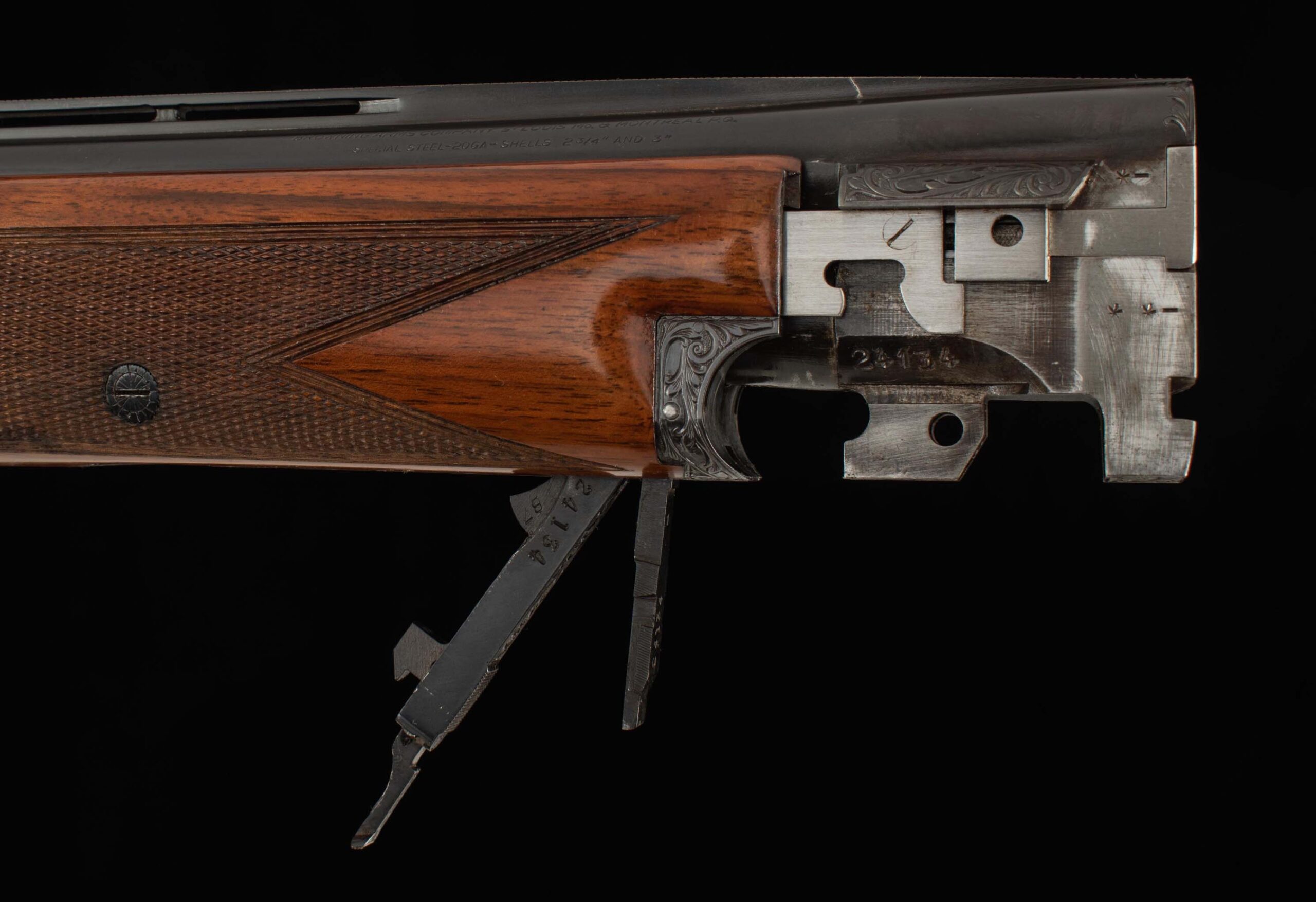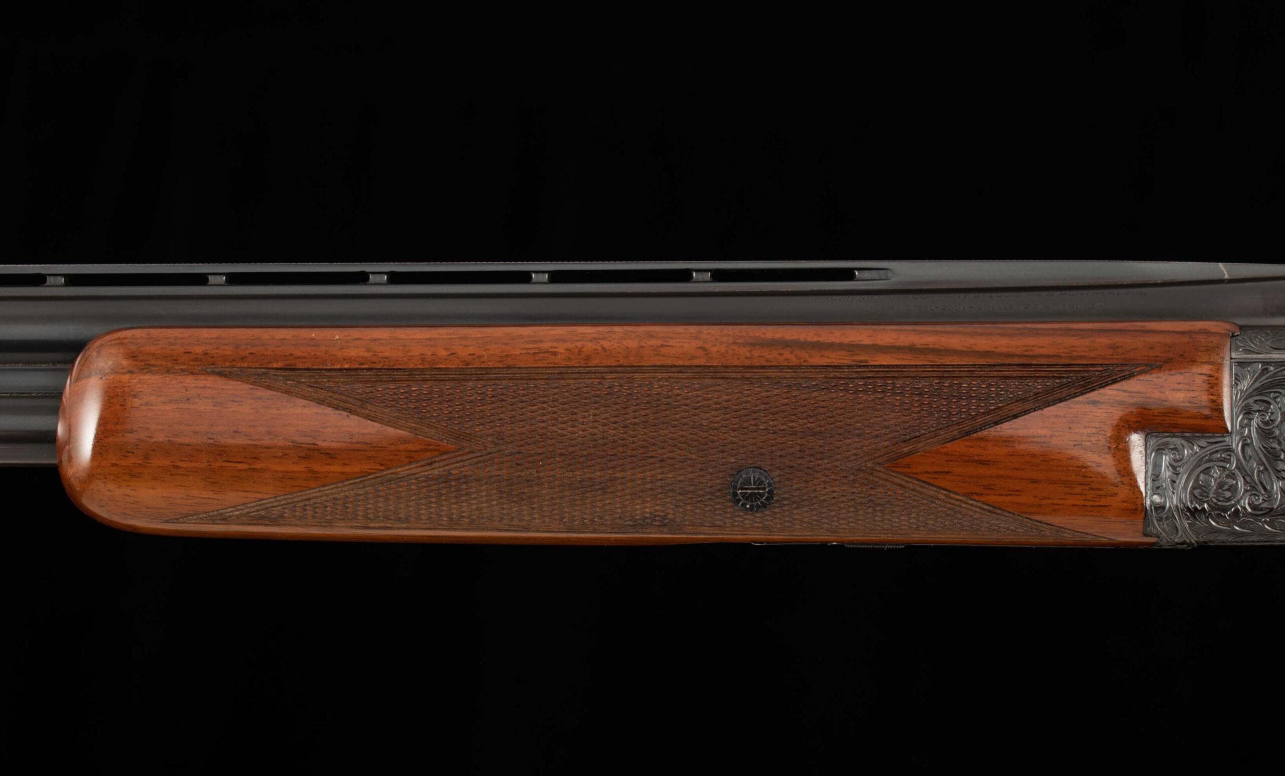 | General Specs: Browning, 1962, 20 Gauge, 6lbs, 5oz., Chokes M/F, LOP 14 1/4″, DAH 2 1/4″, DAC 1 3/8″ Serial Number: 24134 I’ve looked over every nook and cranny of this incredible deep chiseled engraving to identify an engraver’s signature and can’t find one. Also, I often can’t see the ketchup in the fridge only for my wife to walk up and pull it out of the door right in front of me, anyway, so maybe you’ll have more luck than me. If I were the engraver, I would want the world to know my name; I’m sure you would too. The beauty of collecting these fine firearms is that while they are “production” guns, they are built by craftsmen each with their own gift, every piece of wood has its own hue and grain pattern, and in this case, the metal work has been upgraded with incredible care and detail to show off game scenes on each side, a grouse in flight on the bottom of the receiver, all surrounded by intricate floral details. This wood of the gun is nicely checkered in a point pattern with double borders. The barrels have mirror bores, with a few light handling marks in the finish, and a ventilated rib with silver front bead. Don’t overthink it; this gun is a looker, go shoot it and have some fun!