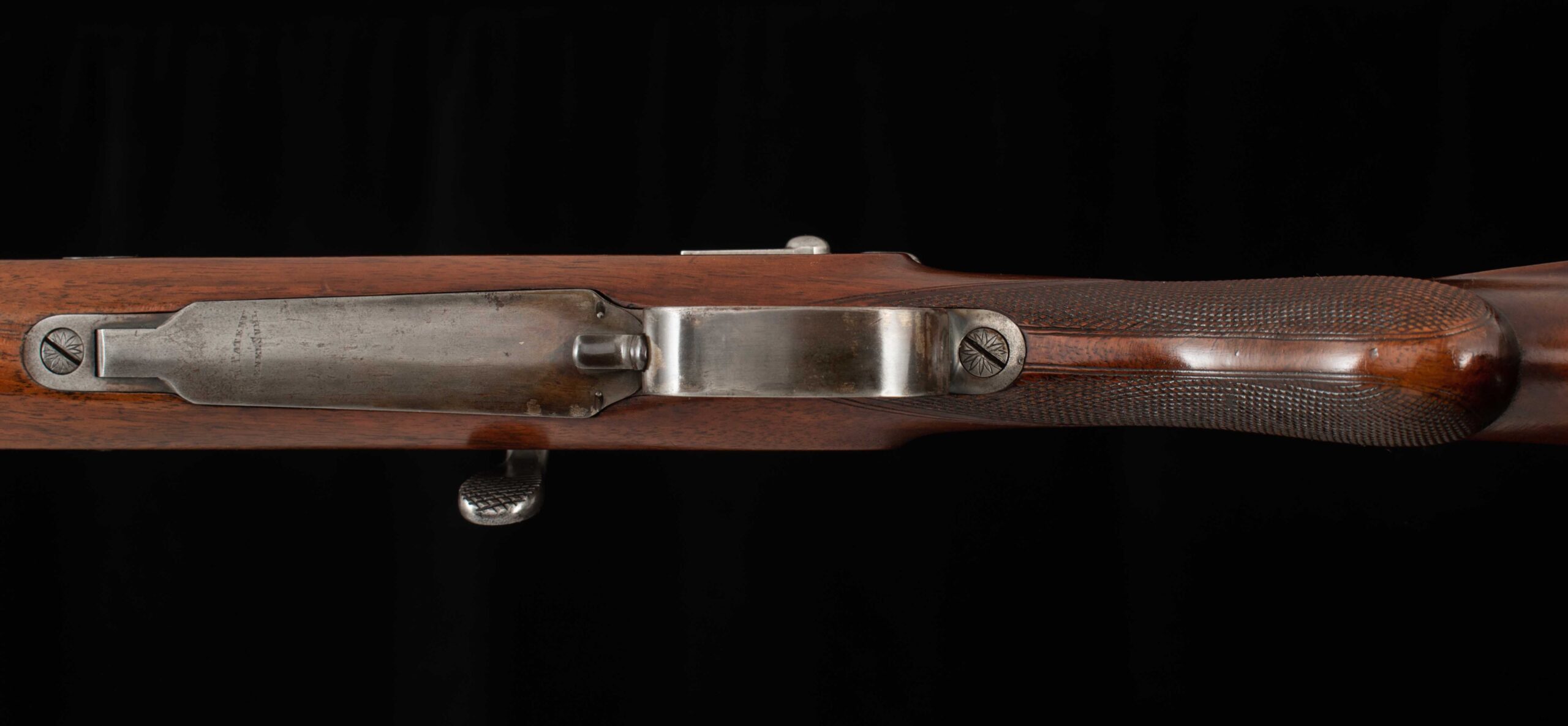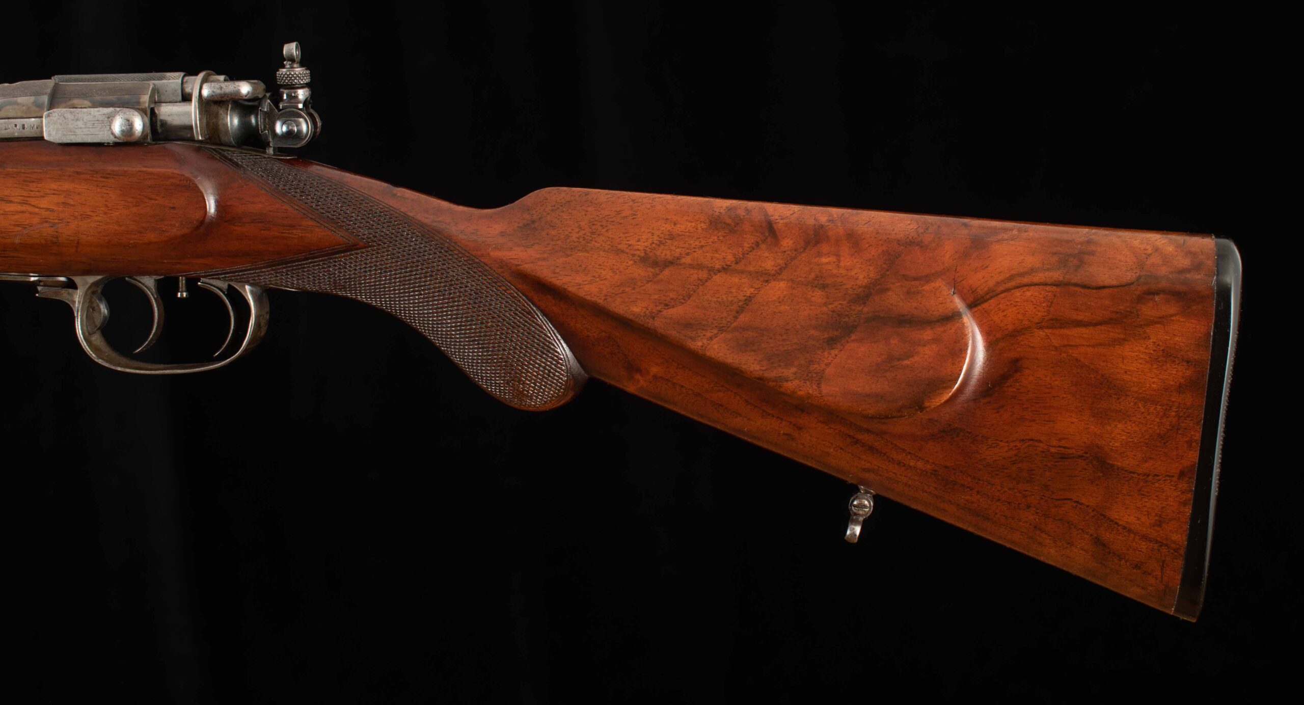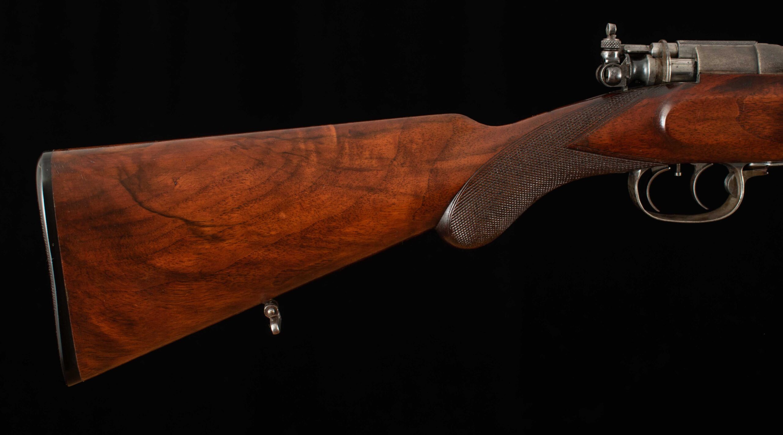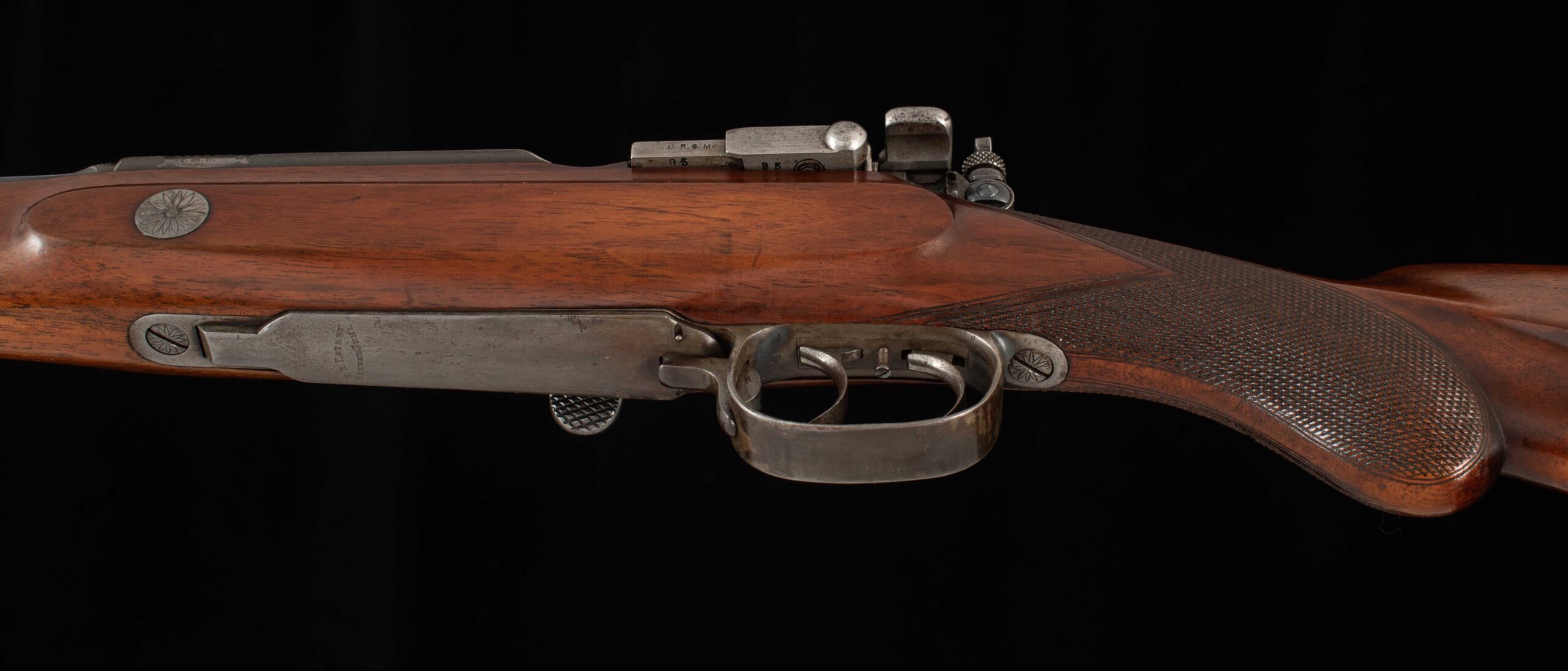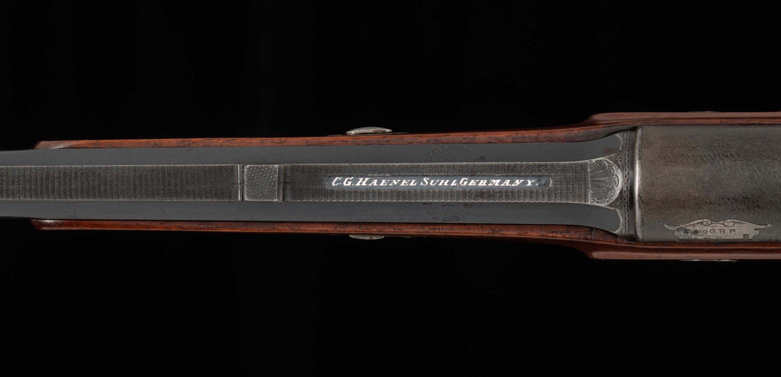 | General Specs: C.G. Haenel, 9x57mm, 7lbs., LOP 13 3/4″ Serial Number: 12995 This capable rifle is packed full of desirable details. At the muzzle end of the half-octagon barrel we find an integrated, rocker-style day/night selectable front blade, and at the breech end of its milled integral top rib, a silver inlay “C.G. Haenel Suhl Germany”, the barrel has a mirror bore that rates 8.5/10. The hinged floorplate and follower is designed and machined in such a way that it makes me a little embarrassed for all the flimsy spring-style followers we see in guns that come through our doors! Dovetailed into the cocking mechanism of the bolt, you’ll find a Rigby-Style Rear Peep Sight, designed for quick sight placement and follow-up shots. There is a dovetail filler in the top rib that has been expertly crafted if you wanted to replace a more traditional rear sight. The stock has a handsome design, checkering, tone, grain, and cheekpiece, all with a hand-rubbed oil finish. Adjustable double-set triggers and sling swivels, and the controlled-round feed action all function just as they should. The star of the show is somewhat hidden on this gun, revealed in our stunning photos of the case color hardening on the action. You can catch a glimpse of the vibrant color with a look into the open action but it is best appreciated with the action out of the stock so please enjoy the accompanying photographs. Thanks for looking!