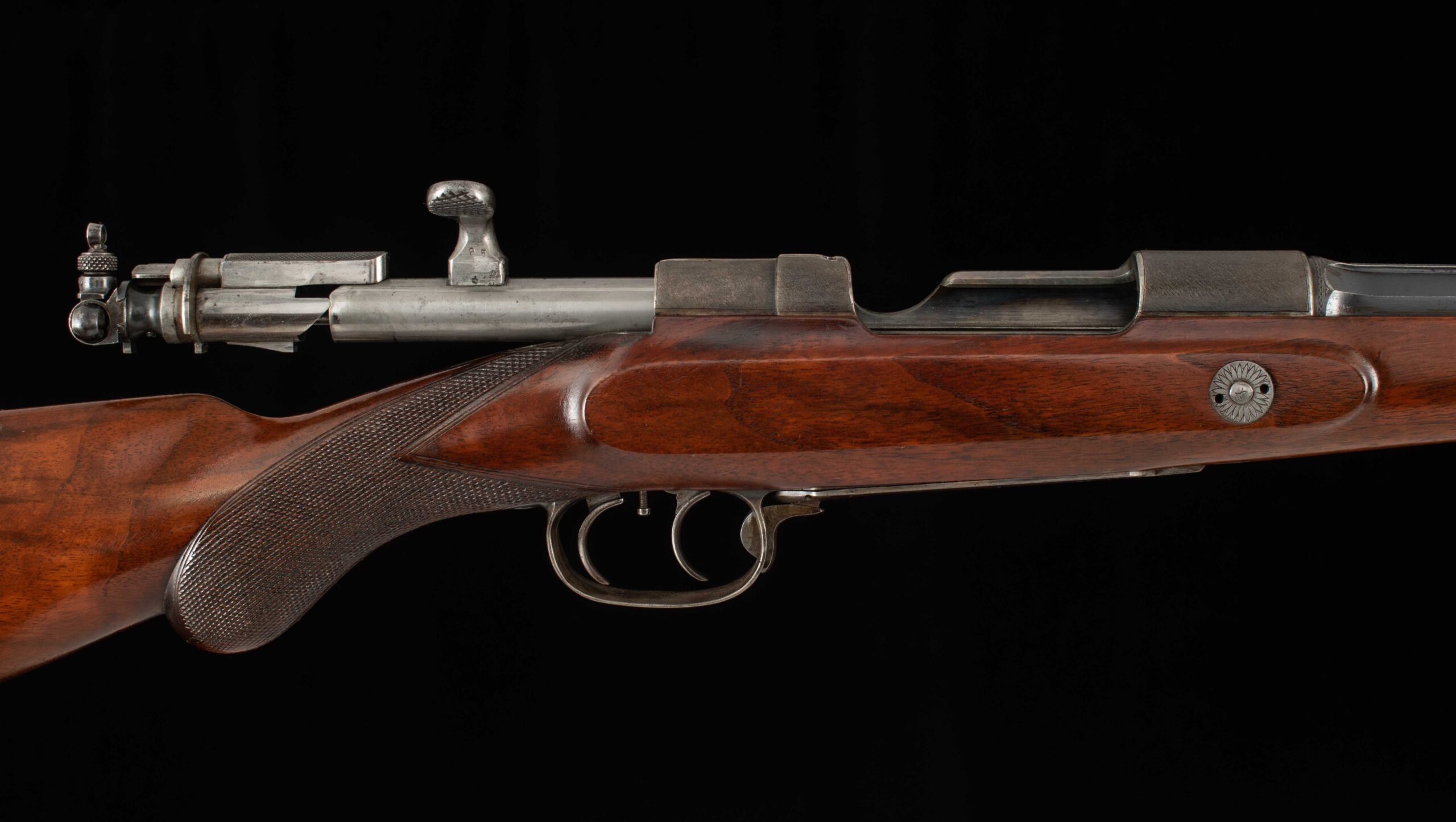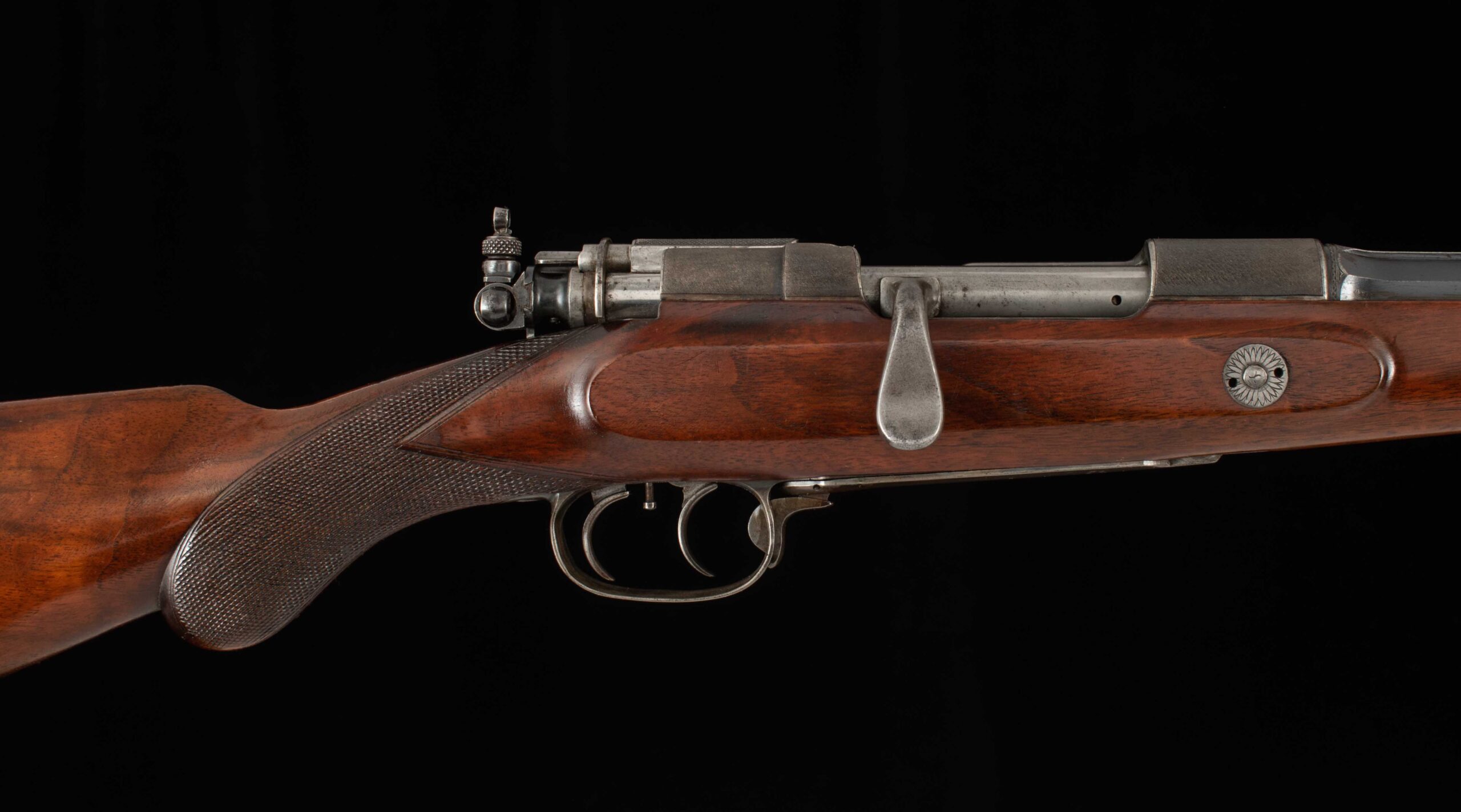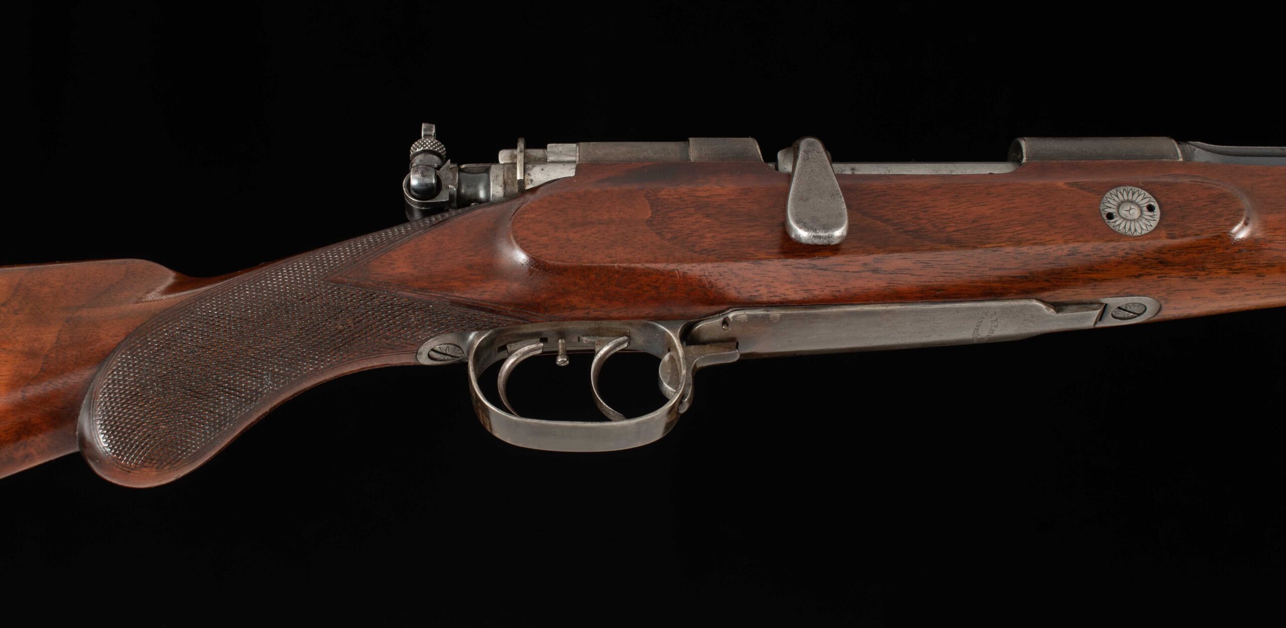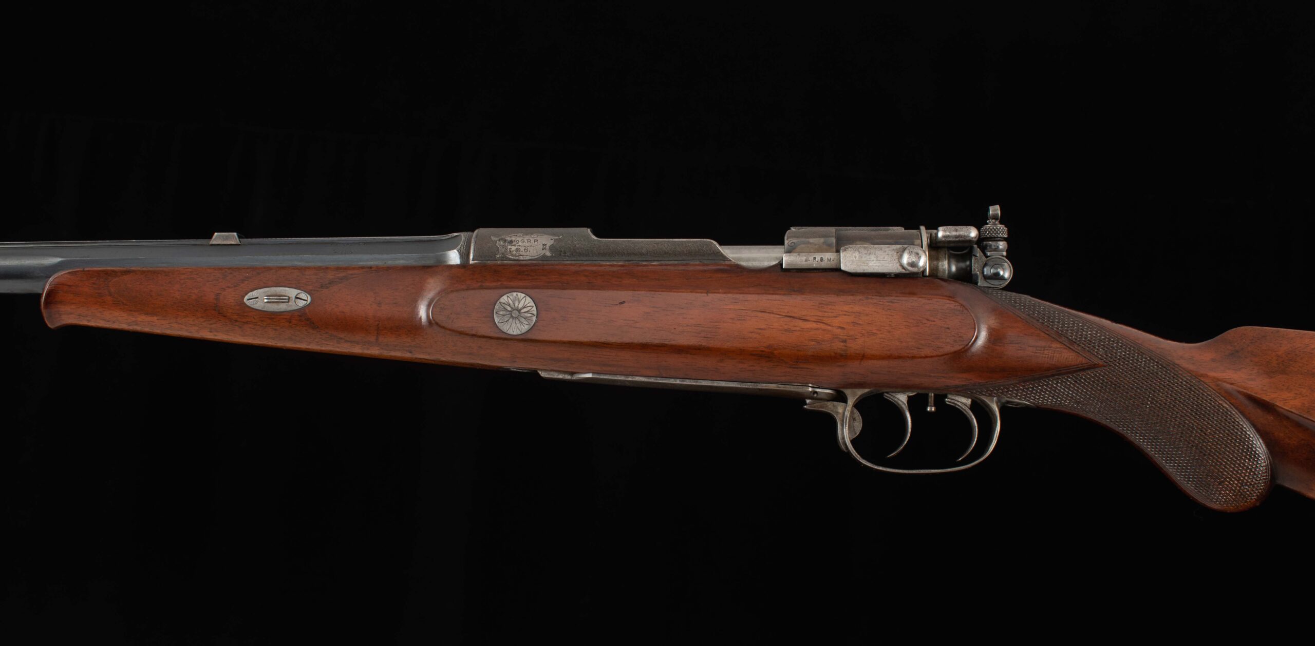 | General Specs: C.G. Haenel, 9x57mm, 7lbs., LOP 13 3/4″ Serial Number: 12995 This capable rifle is packed full of desirable details. At the muzzle end of the half-octagon barrel we find an integrated, rocker-style day/night selectable front blade, and at the breech end of its milled integral top rib, a silver inlay “C.G. Haenel Suhl Germany”, the barrel has a mirror bore that rates 8.5/10. The hinged floorplate and follower is designed and machined in such a way that it makes me a little embarrassed for all the flimsy spring-style followers we see in guns that come through our doors! Dovetailed into the cocking mechanism of the bolt, you’ll find a Rigby-Style Rear Peep Sight, designed for quick sight placement and follow-up shots. There is a dovetail filler in the top rib that has been expertly crafted if you wanted to replace a more traditional rear sight. The stock has a handsome design, checkering, tone, grain, and cheekpiece, all with a hand-rubbed oil finish. Adjustable double-set triggers and sling swivels, and the controlled-round feed action all function just as they should. The star of the show is somewhat hidden on this gun, revealed in our stunning photos of the case color hardening on the action. You can catch a glimpse of the vibrant color with a look into the open action but it is best appreciated with the action out of the stock so please enjoy the accompanying photographs. Thanks for looking!