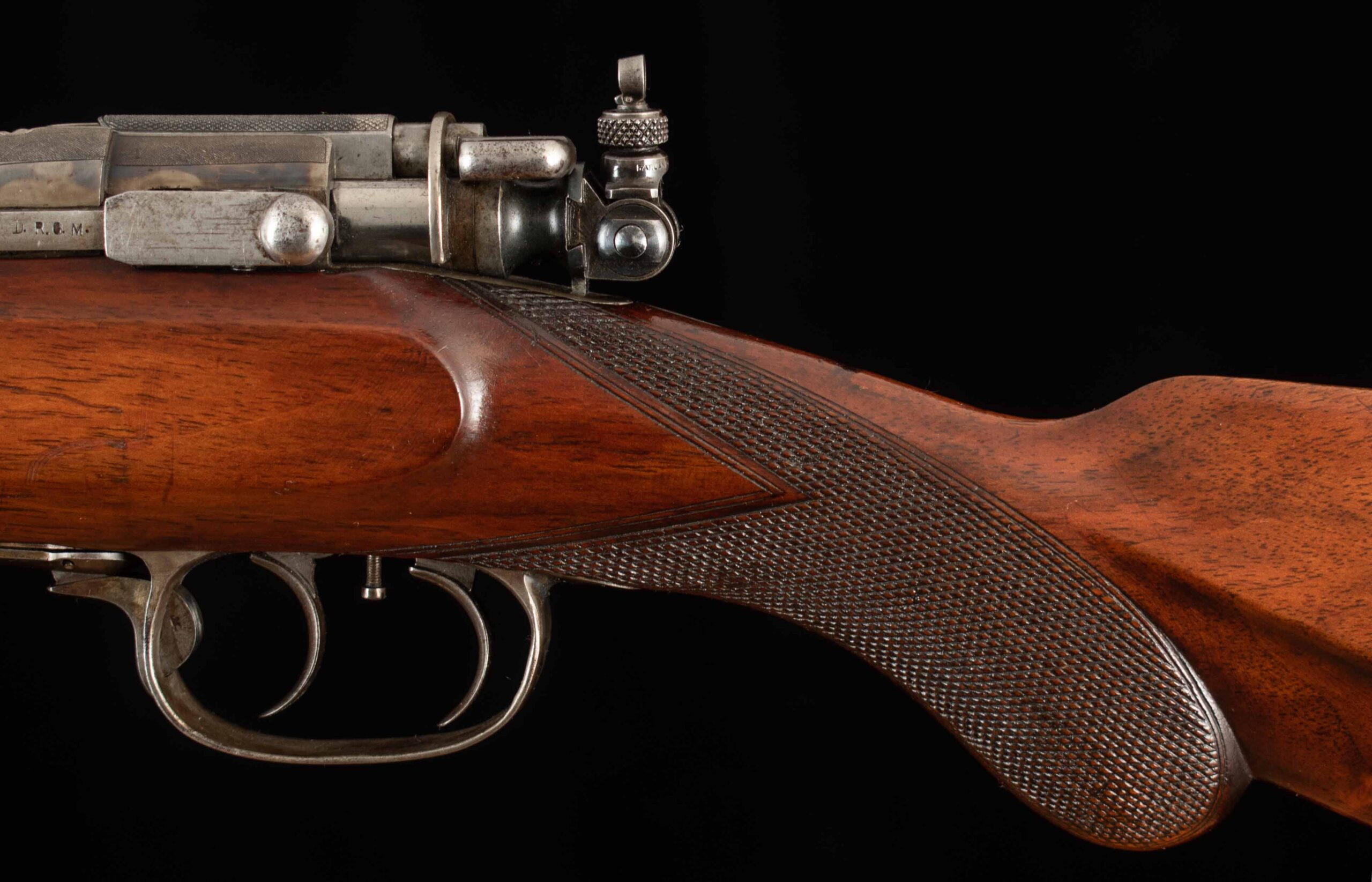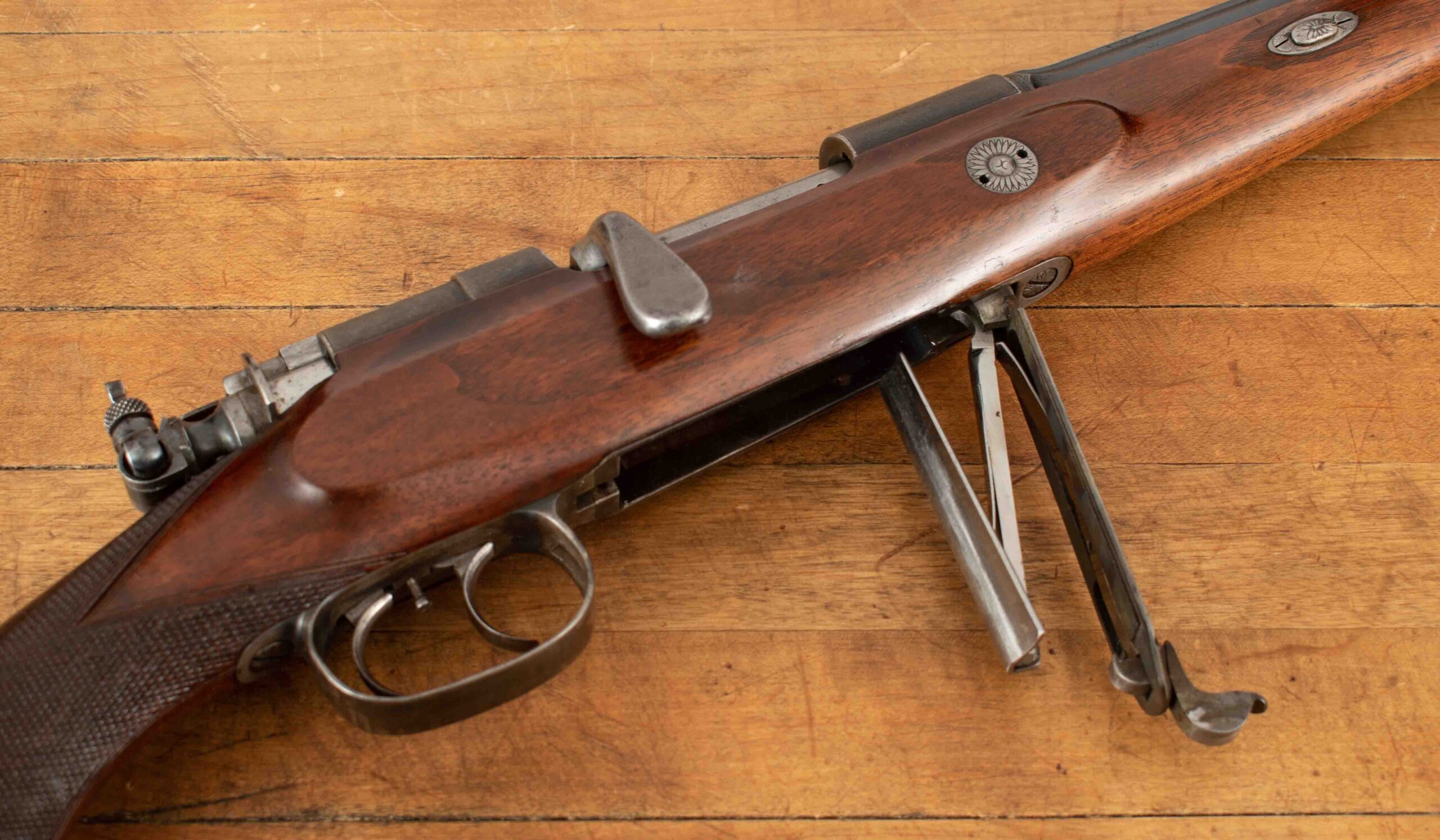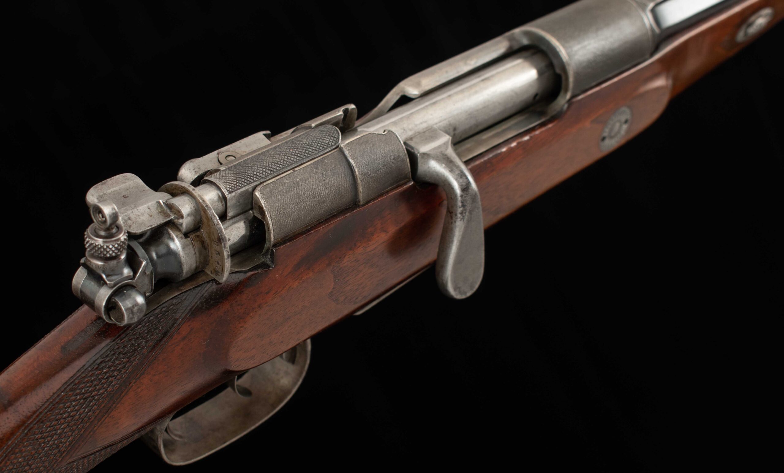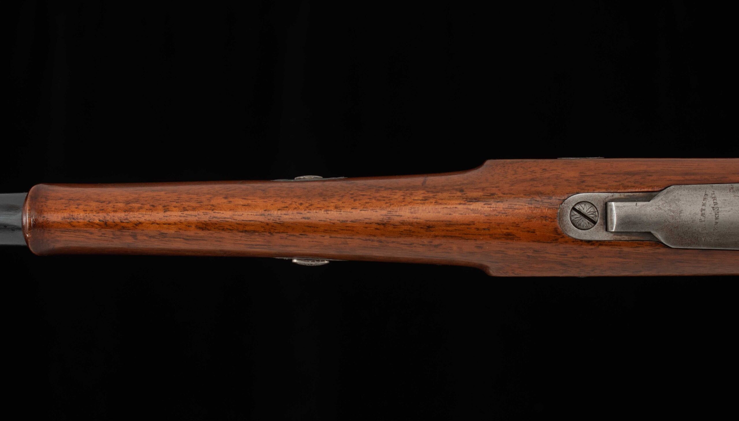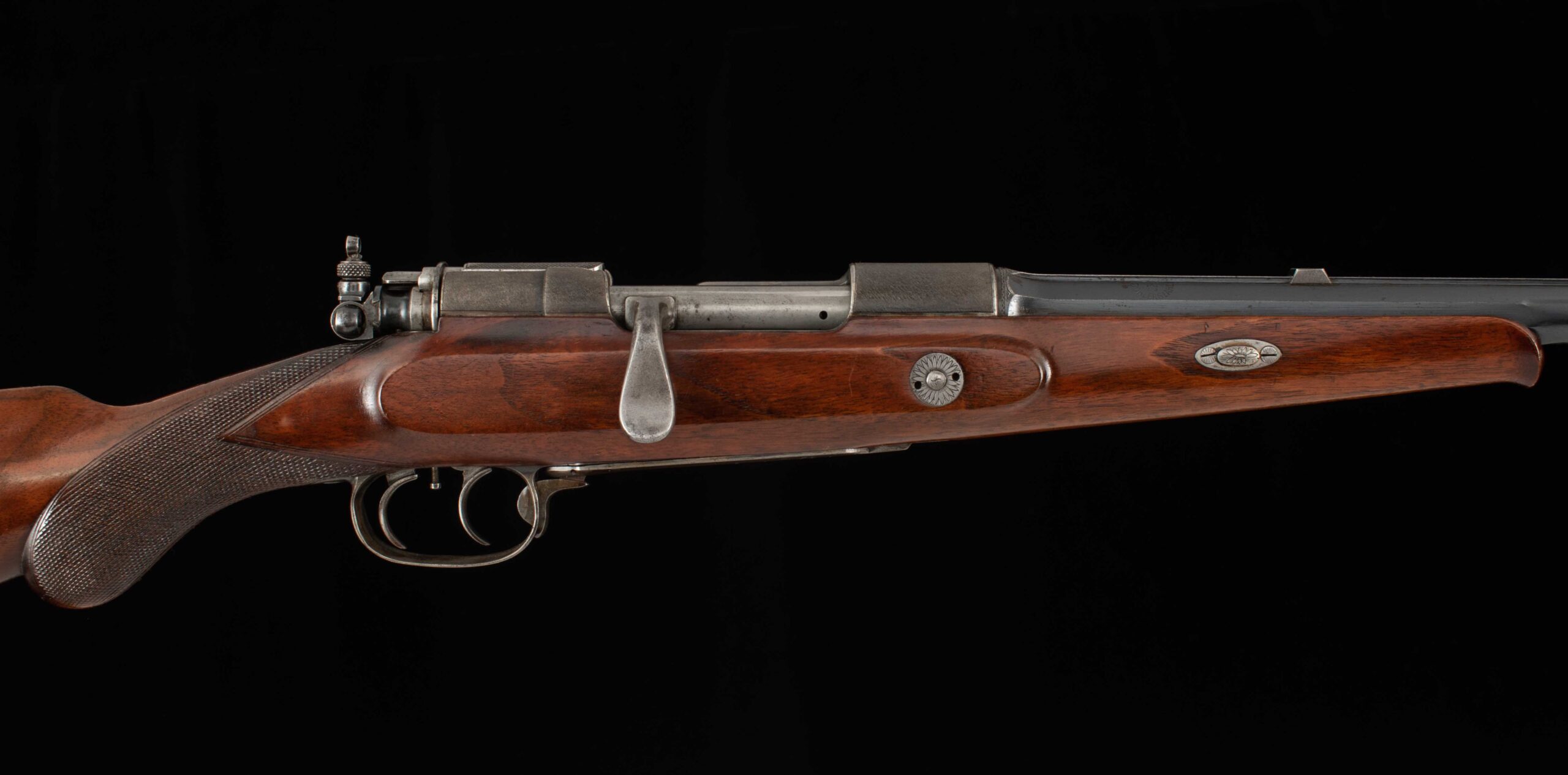 | General Specs: C.G. Haenel, 9x57mm, 7lbs., LOP 13 3/4″ Serial Number: 12995 This capable rifle is packed full of desirable details. At the muzzle end of the half-octagon barrel we find an integrated, rocker-style day/night selectable front blade, and at the breech end of its milled integral top rib, a silver inlay “C.G. Haenel Suhl Germany”, the barrel has a mirror bore that rates 8.5/10. The hinged floorplate and follower is designed and machined in such a way that it makes me a little embarrassed for all the flimsy spring-style followers we see in guns that come through our doors! Dovetailed into the cocking mechanism of the bolt, you’ll find a Rigby-Style Rear Peep Sight, designed for quick sight placement and follow-up shots. There is a dovetail filler in the top rib that has been expertly crafted if you wanted to replace a more traditional rear sight. The stock has a handsome design, checkering, tone, grain, and cheekpiece, all with a hand-rubbed oil finish. Adjustable double-set triggers and sling swivels, and the controlled-round feed action all function just as they should. The star of the show is somewhat hidden on this gun, revealed in our stunning photos of the case color hardening on the action. You can catch a glimpse of the vibrant color with a look into the open action but it is best appreciated with the action out of the stock so please enjoy the accompanying photographs. Thanks for looking!