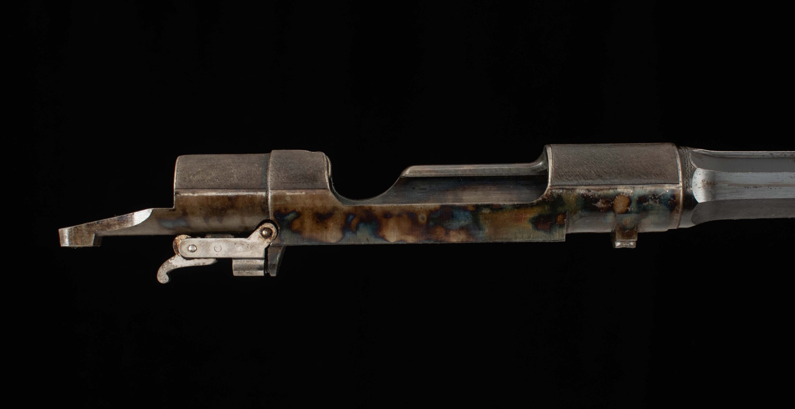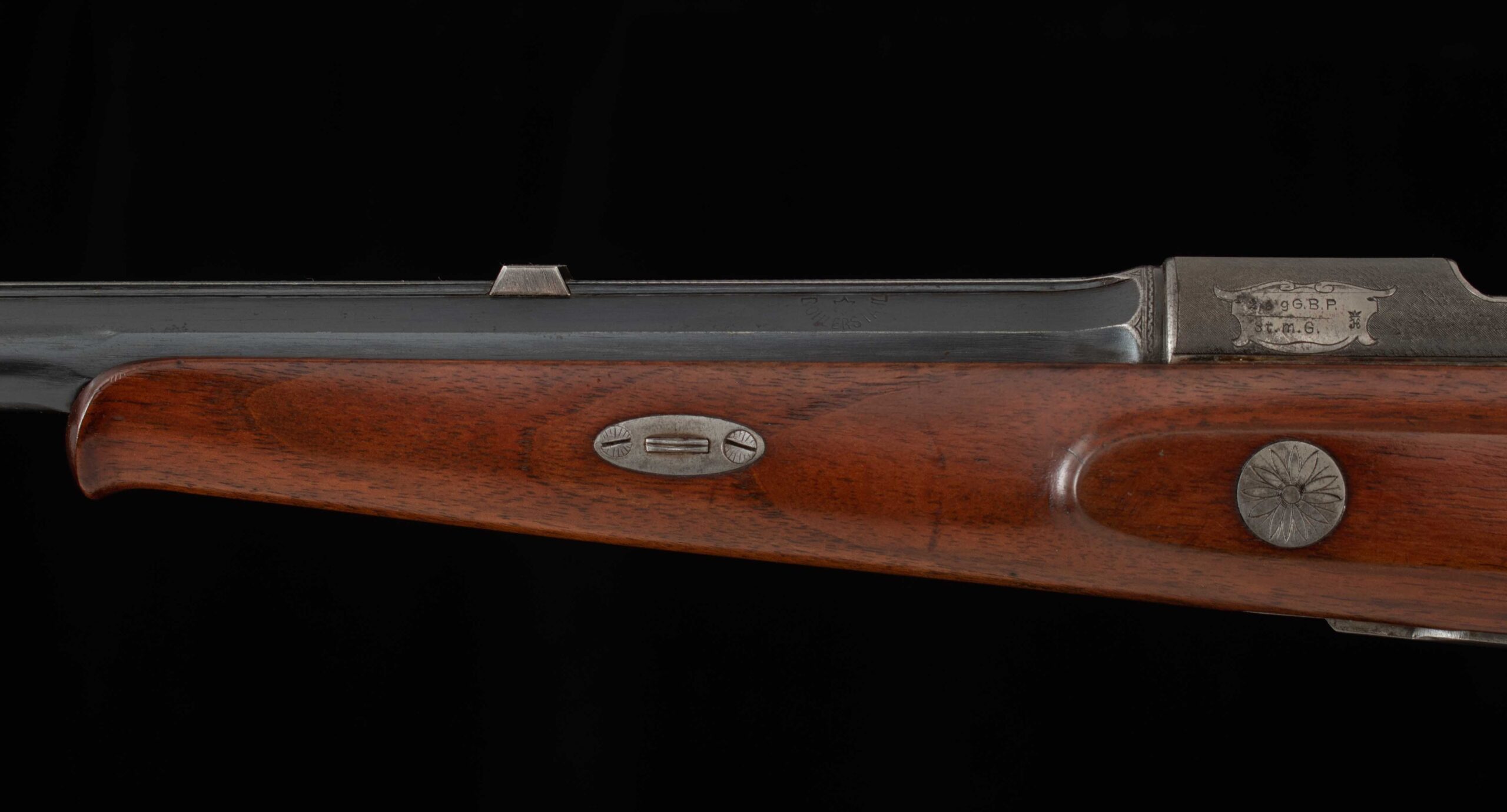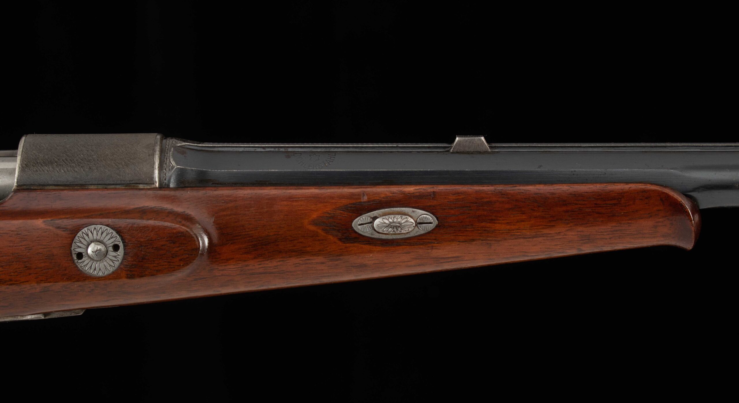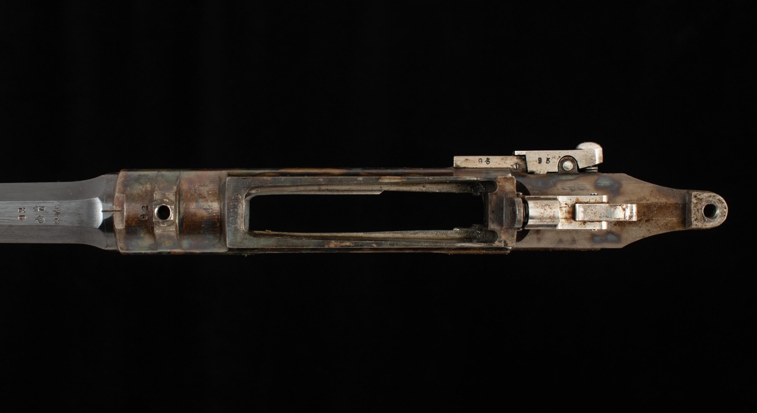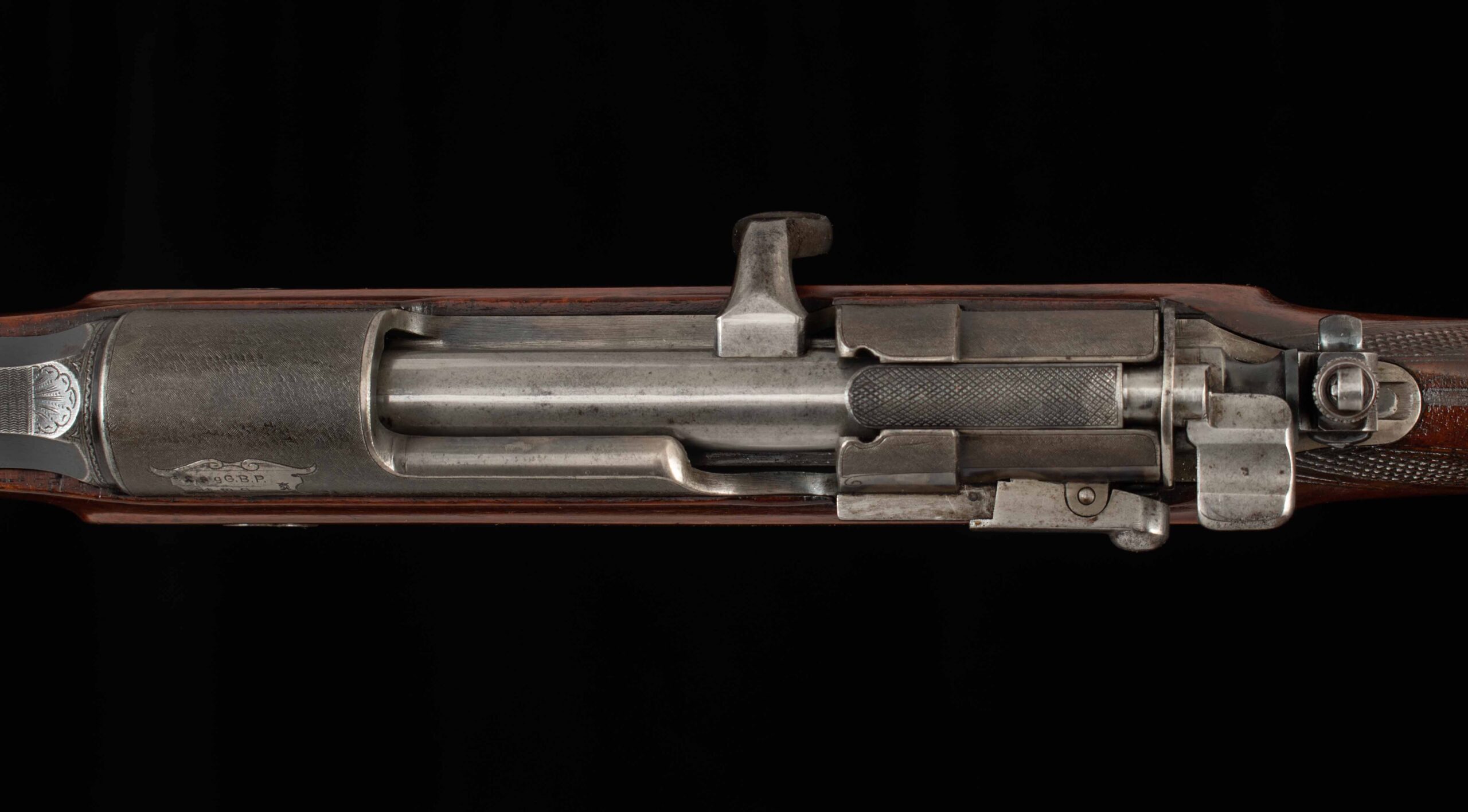 | General Specs: C.G. Haenel, 9x57mm, 7lbs., LOP 13 3/4″ Serial Number: 12995 This capable rifle is packed full of desirable details. At the muzzle end of the half-octagon barrel we find an integrated, rocker-style day/night selectable front blade, and at the breech end of its milled integral top rib, a silver inlay “C.G. Haenel Suhl Germany”, the barrel has a mirror bore that rates 8.5/10. The hinged floorplate and follower is designed and machined in such a way that it makes me a little embarrassed for all the flimsy spring-style followers we see in guns that come through our doors! Dovetailed into the cocking mechanism of the bolt, you’ll find a Rigby-Style Rear Peep Sight, designed for quick sight placement and follow-up shots. There is a dovetail filler in the top rib that has been expertly crafted if you wanted to replace a more traditional rear sight. The stock has a handsome design, checkering, tone, grain, and cheekpiece, all with a hand-rubbed oil finish. Adjustable double-set triggers and sling swivels, and the controlled-round feed action all function just as they should. The star of the show is somewhat hidden on this gun, revealed in our stunning photos of the case color hardening on the action. You can catch a glimpse of the vibrant color with a look into the open action but it is best appreciated with the action out of the stock so please enjoy the accompanying photographs. Thanks for looking!