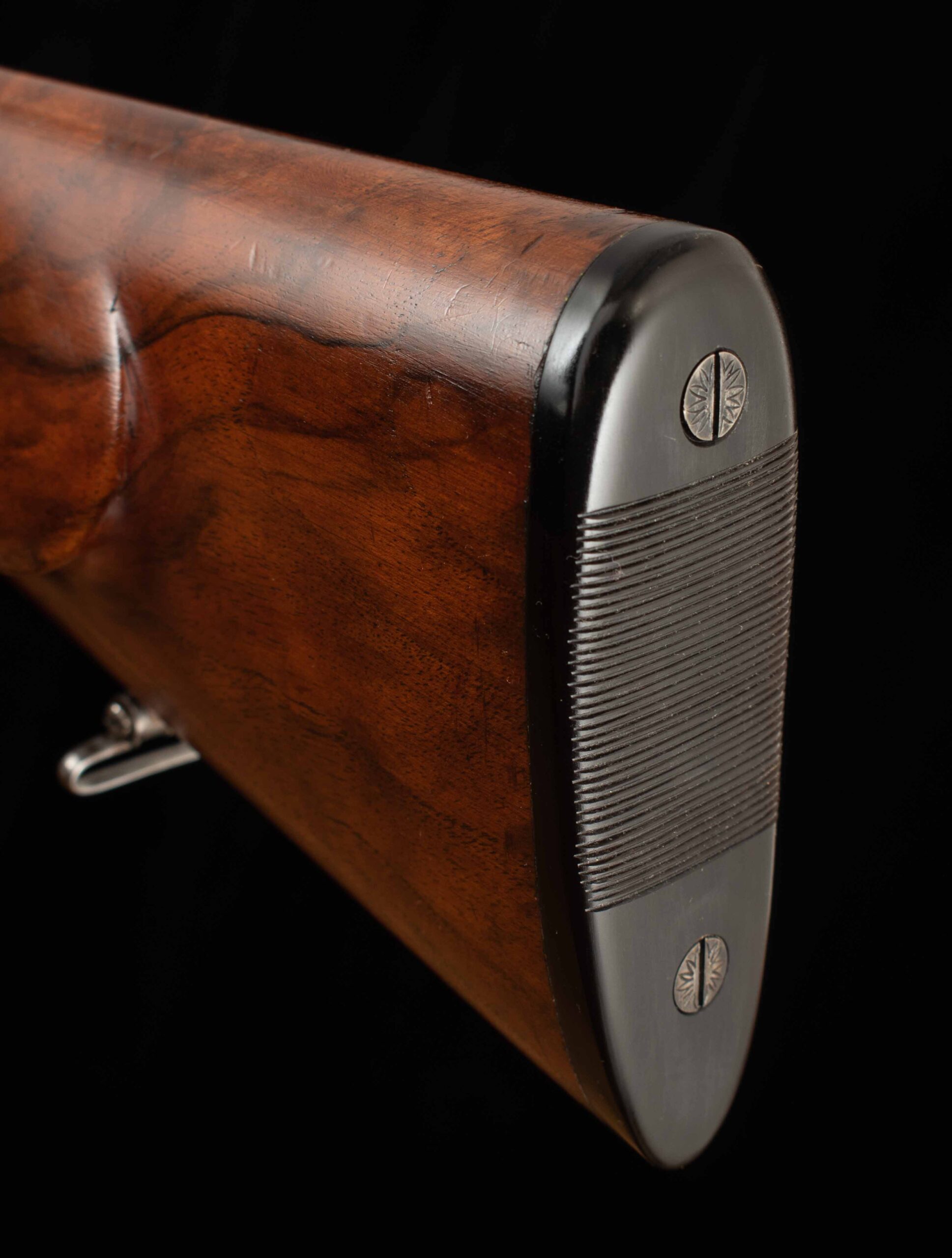 | Type: round pistol grip/ sporter with Schnabel LOP: 13 3/4″ LOP To End Of Wood: 13 3/8″ Checkering Condition: excellent Butt Treatment: horn plate |