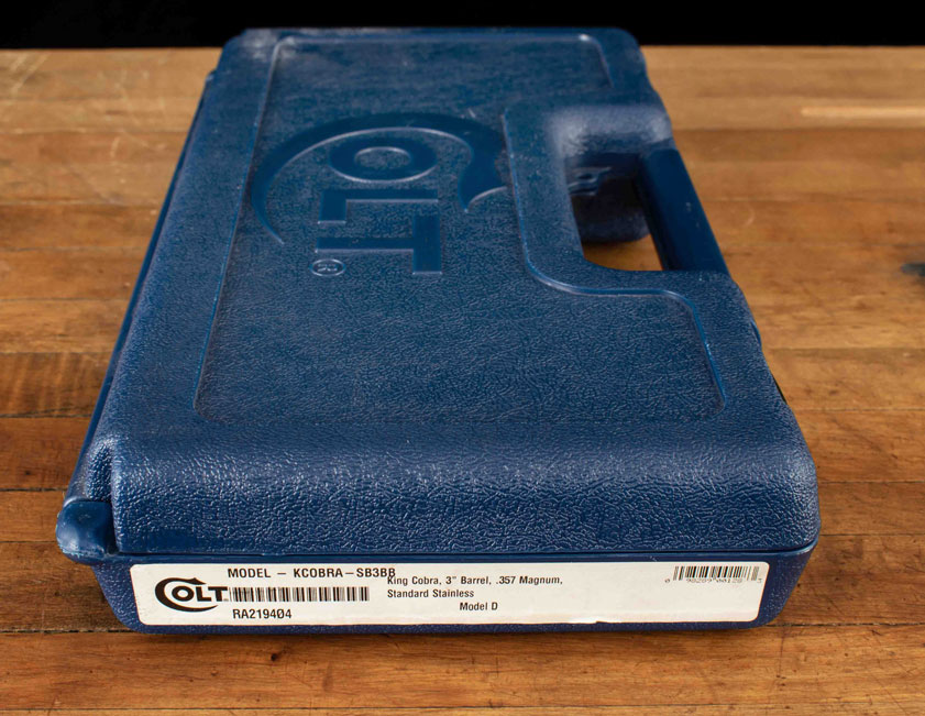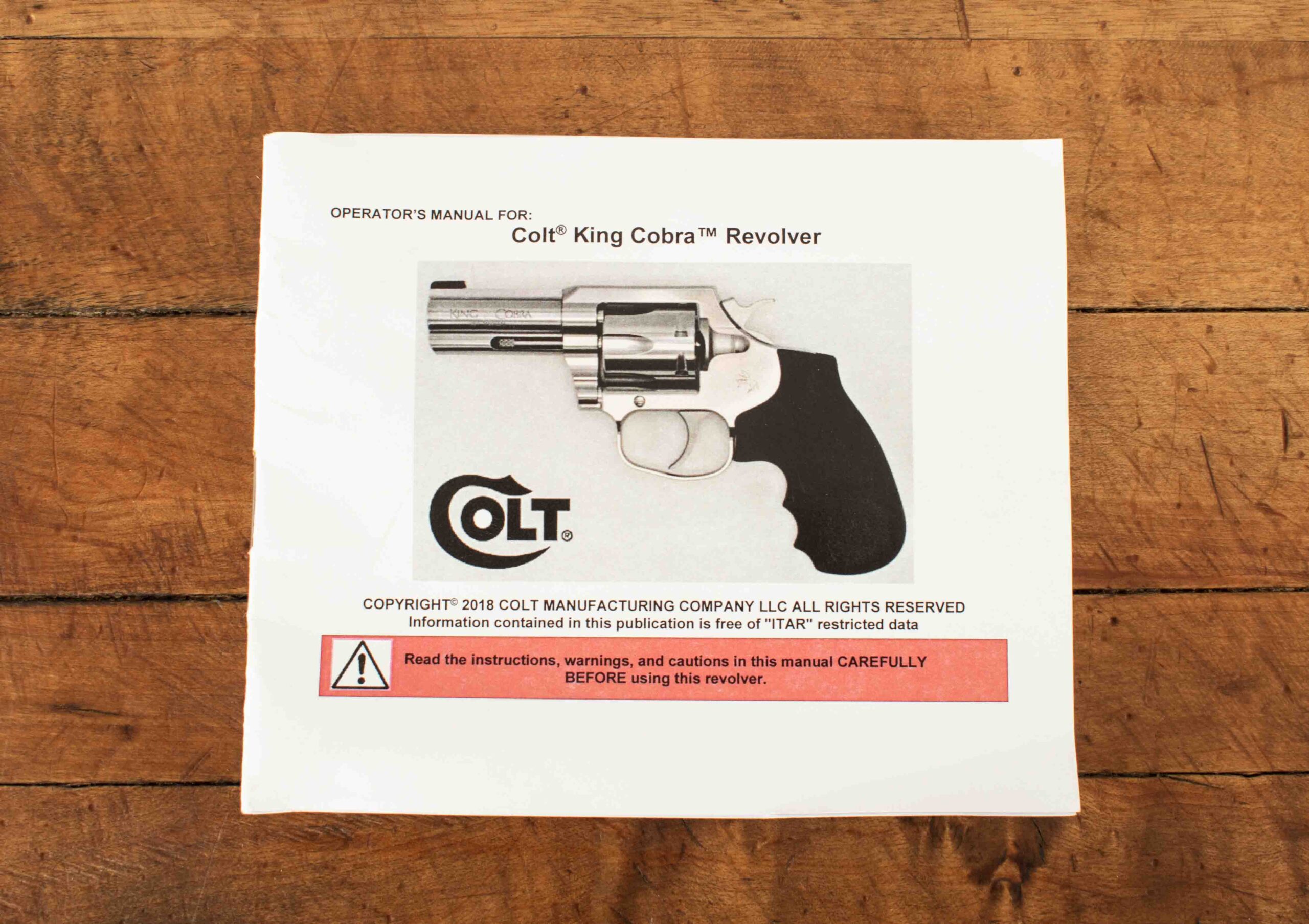 The Colt King Cobra is a medium framed revolver capable of firing the potent .357magnum and .38 special rounds, it has a recessed cylinder, a full-length ejector rod housing and a solid rib. At its release the King Cobra represented excellent value in a heavy-duty revolver, it was moderately priced, dependable, and powerful. This example was manufactured circa 2024 and is entirely stainless steel and displays 99% on the barrel, trigger guard, and receiver. The barrel is 3 inches and has a mirror bore. It comes equipped with Colts black neoprene combat grips with finger grooves and stippling. This King Cobra comes with its blue Colt carry case and associated documents. We at Vintage Firearms invite you to have a look at the specifications and pictures below. Thanks for looking!