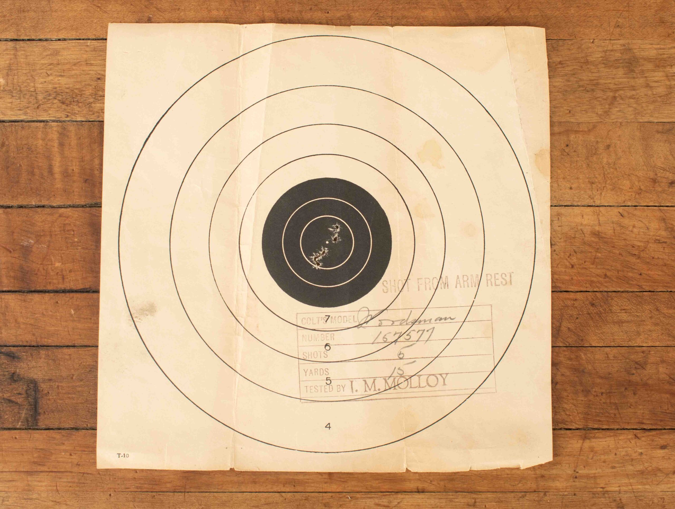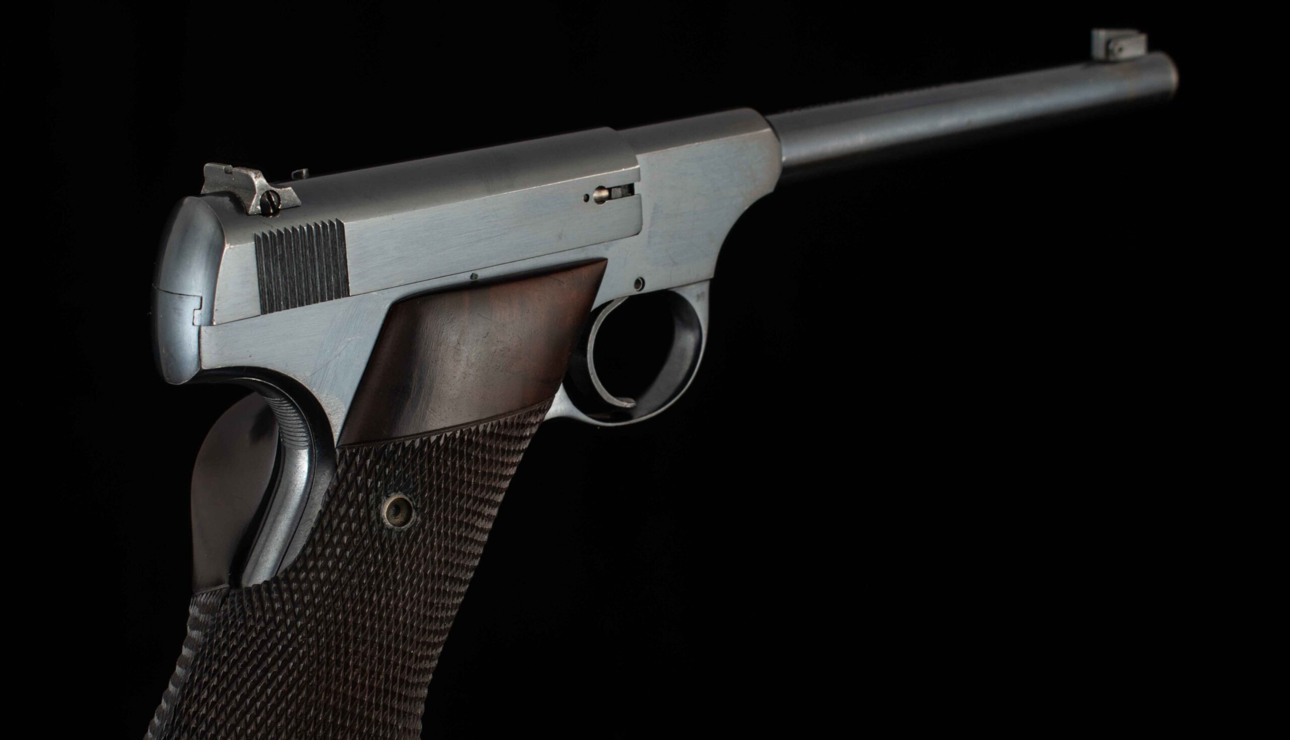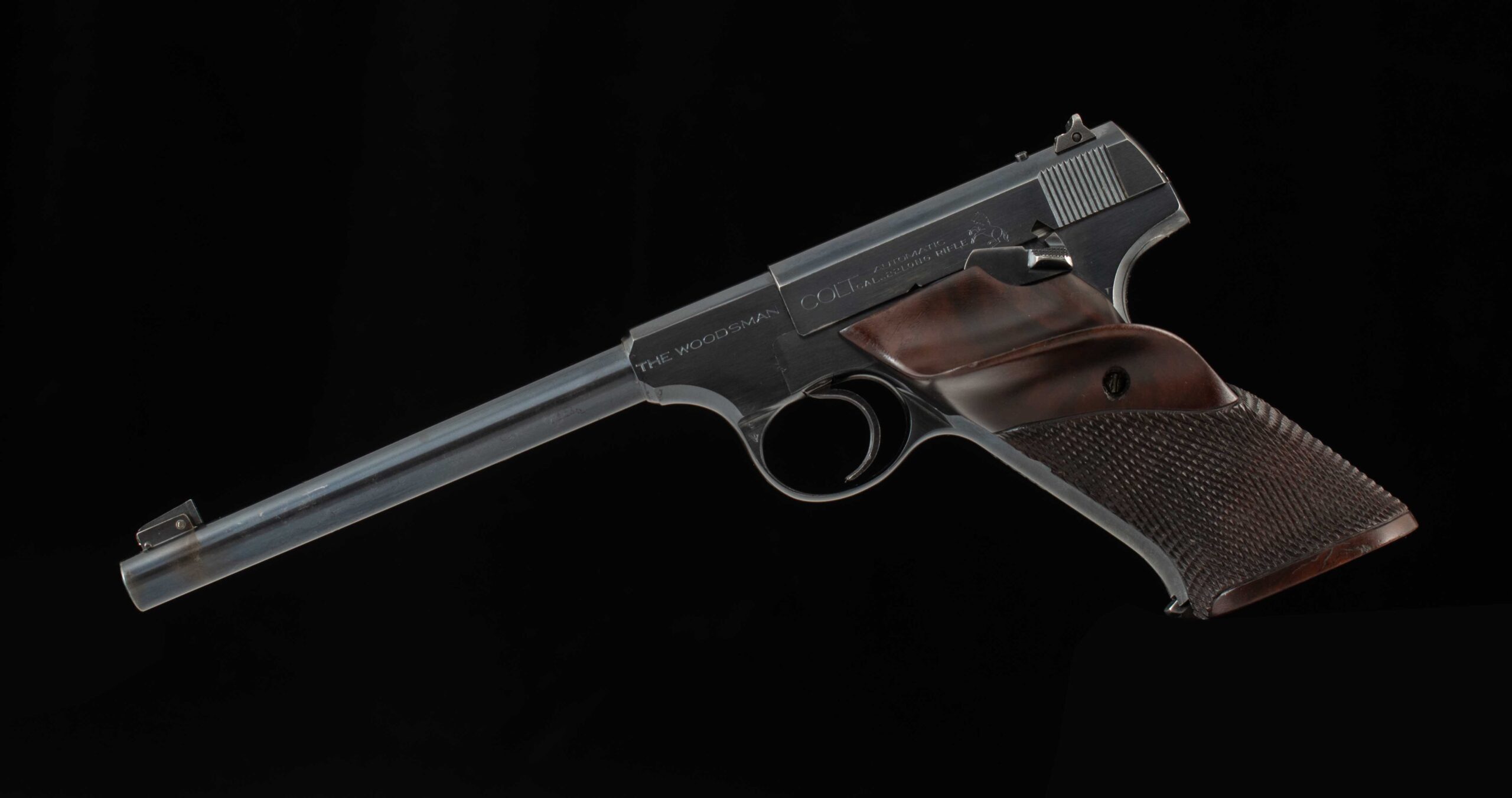The quintessential American rimfire pistol. Designed by John Moses Browning and finalized by Colt’s engineers F. Chadwick and G. Tansley, the Woodsman was first introduced in 1915 and was to be in production in various forms until 1977. The pistol was the first successful semi-automatic .22 rimfire gun to be offered, earlier attempts had been problematic, but Mr. Browning got it right by using an angled magazine to ensure the rimmed cartridge would not ‘rimlock’ onto its predecessor. The Woodsman has remained a favorite with shooters and collectors since its introduction. This example serial number 157577 was manufactured in 1941 and is in superb condition with 98% of its original factory finish with clear roll marks and a mirror bore. There is slight wear at the muzzle. It is fitted with target grips and has it original factory grips included. It has its test target and two magazines. The target trigger is exceptional and breaks cleanly at 3lbs. Thanks for looking!
