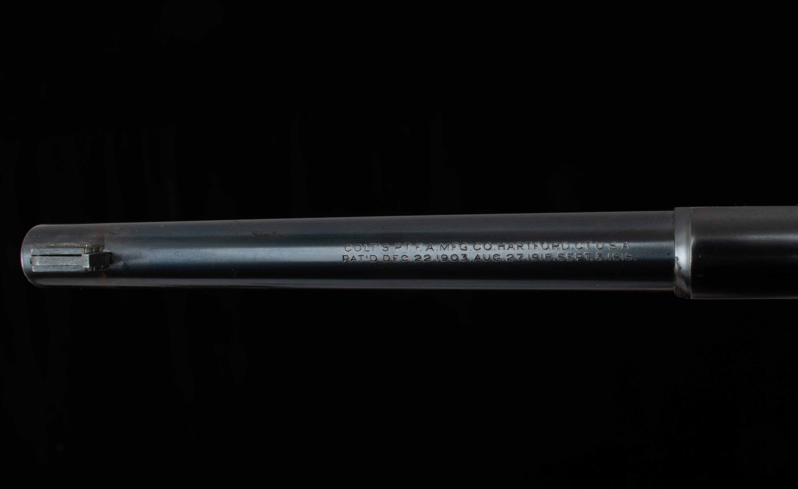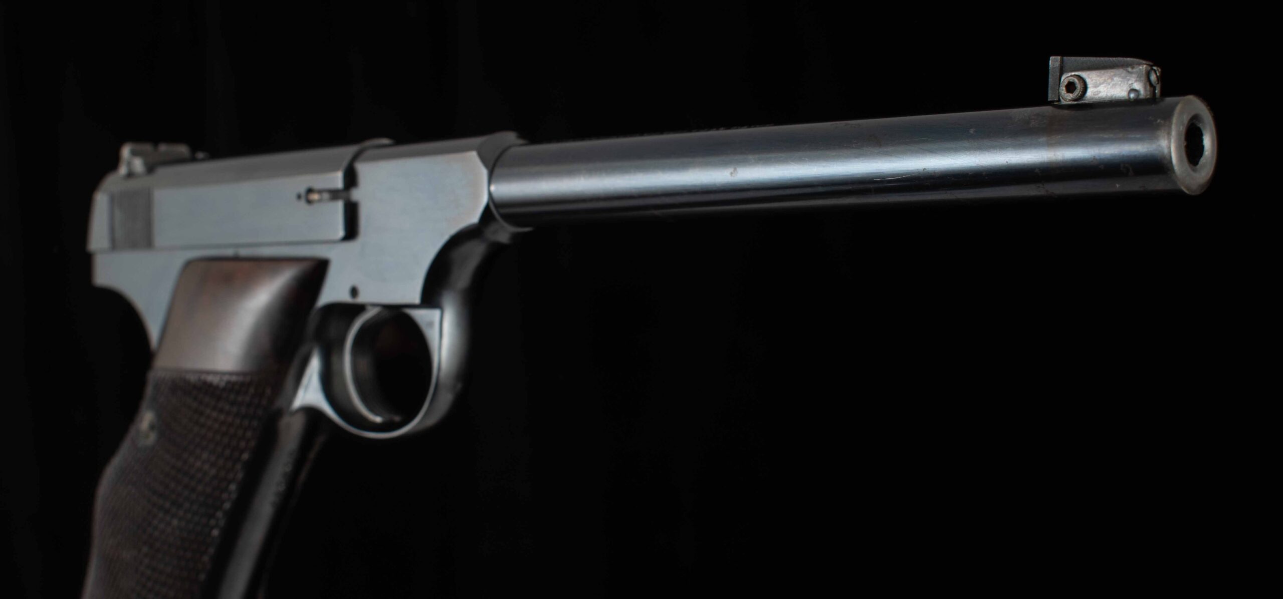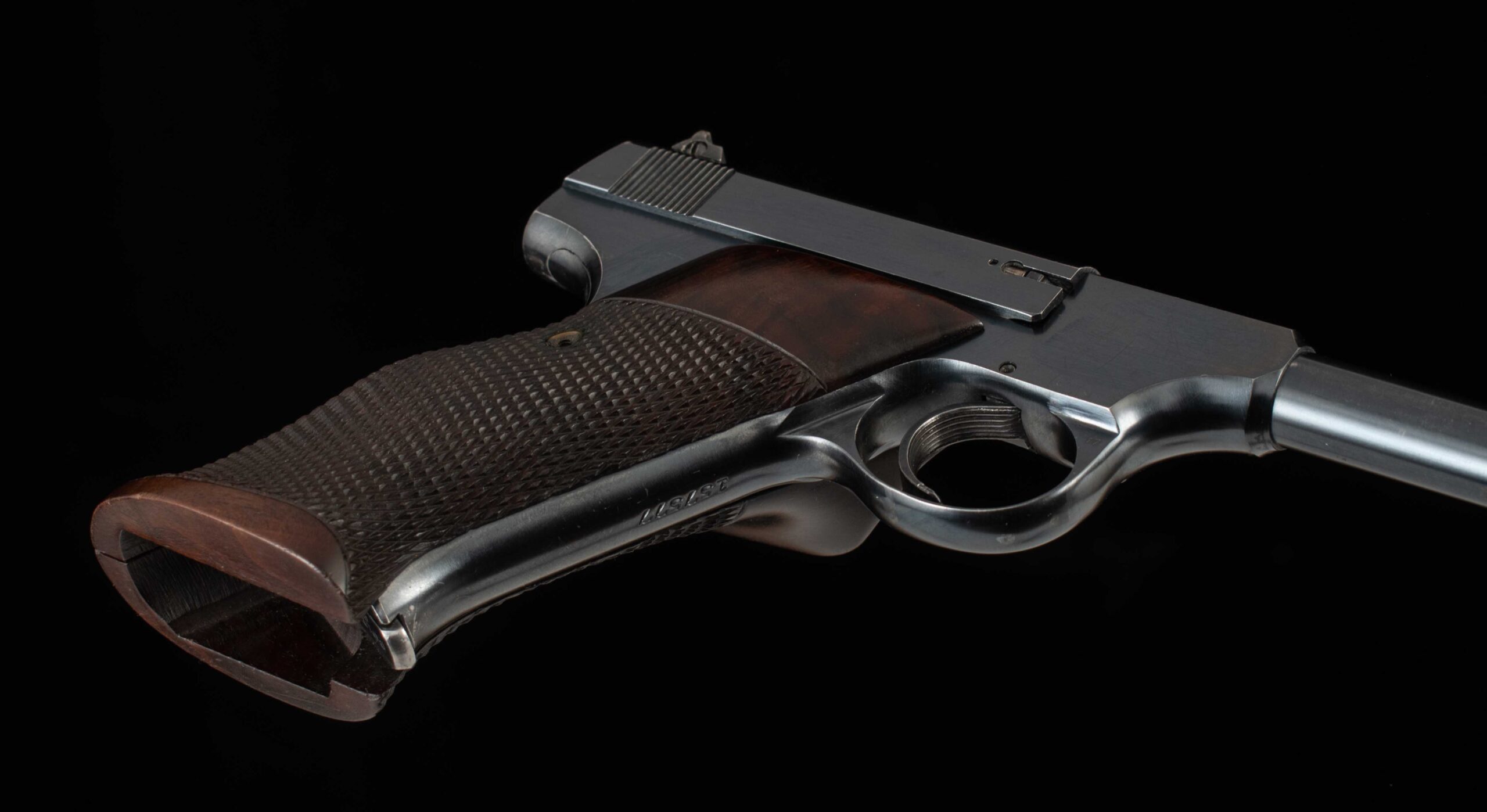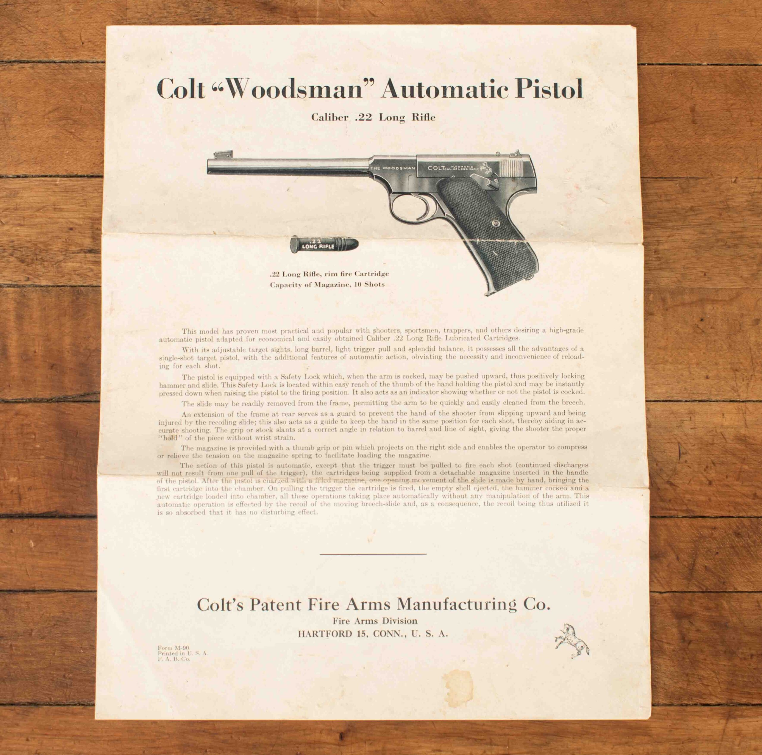 The quintessential American rimfire pistol. Designed by John Moses Browning and finalized by Colt’s engineers F. Chadwick and G. Tansley, the Woodsman was first introduced in 1915 and was to be in production in various forms until 1977. The pistol was the first successful semi-automatic .22 rimfire gun to be offered, earlier attempts had been problematic, but Mr. Browning got it right by using an angled magazine to ensure the rimmed cartridge would not ‘rimlock’ onto its predecessor. The Woodsman has remained a favorite with shooters and collectors since its introduction. This example serial number 157577 was manufactured in 1941 and is in superb condition with 98% of its original factory finish with clear roll marks and a mirror bore. There is slight wear at the muzzle. It is fitted with target grips and has it original factory grips included. It has its test target and two magazines. The target trigger is exceptional and breaks cleanly at 3lbs. Thanks for looking!
