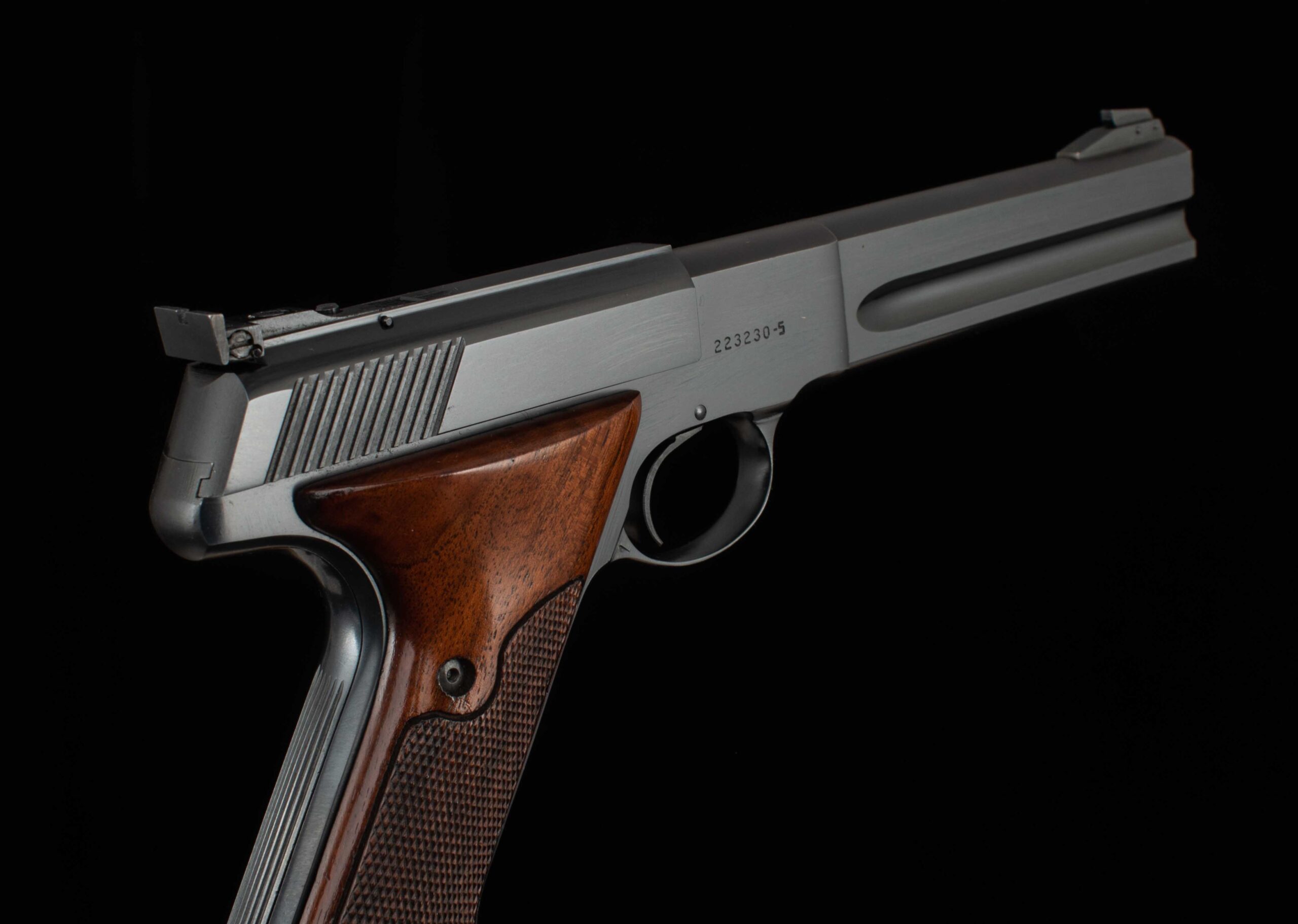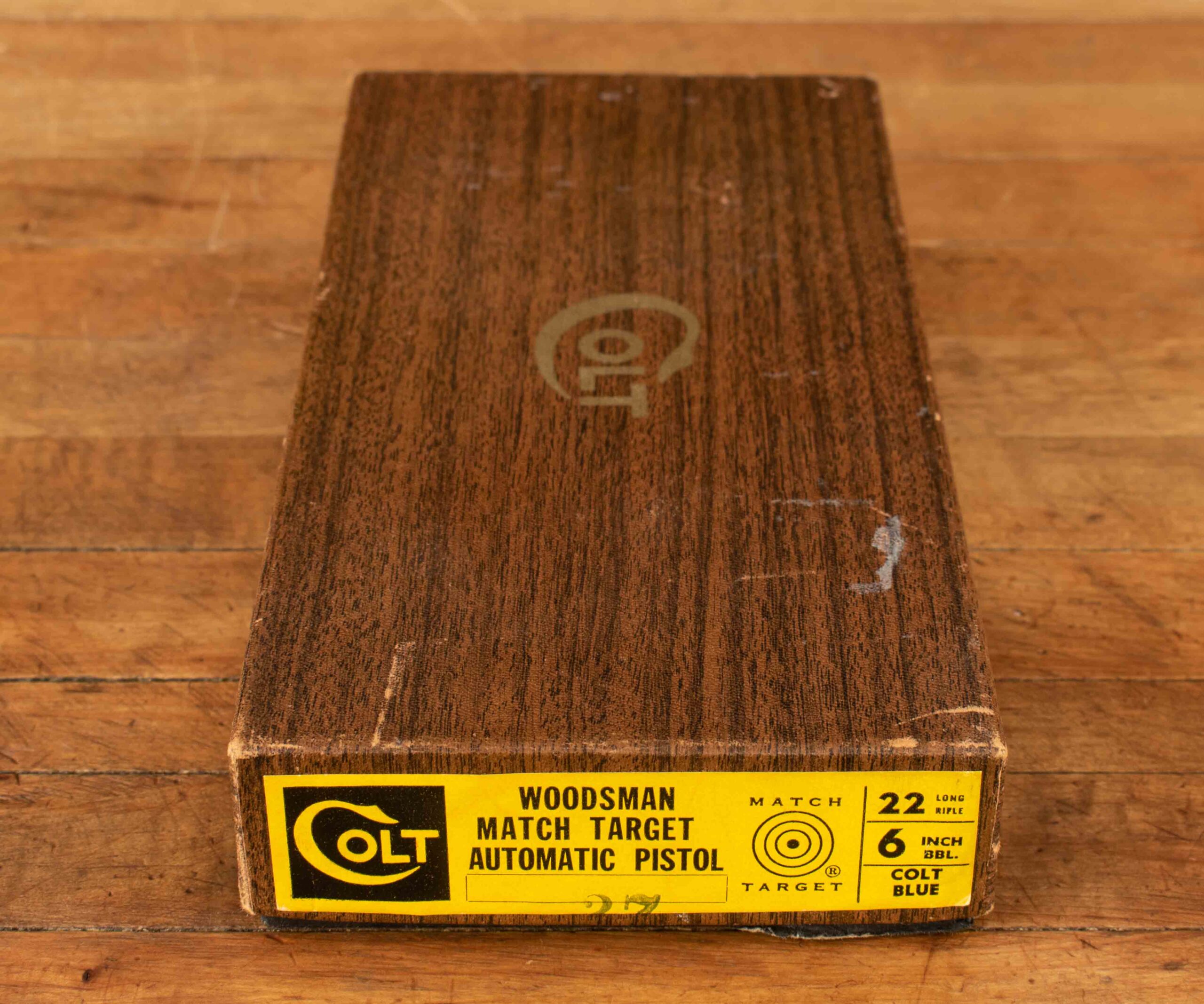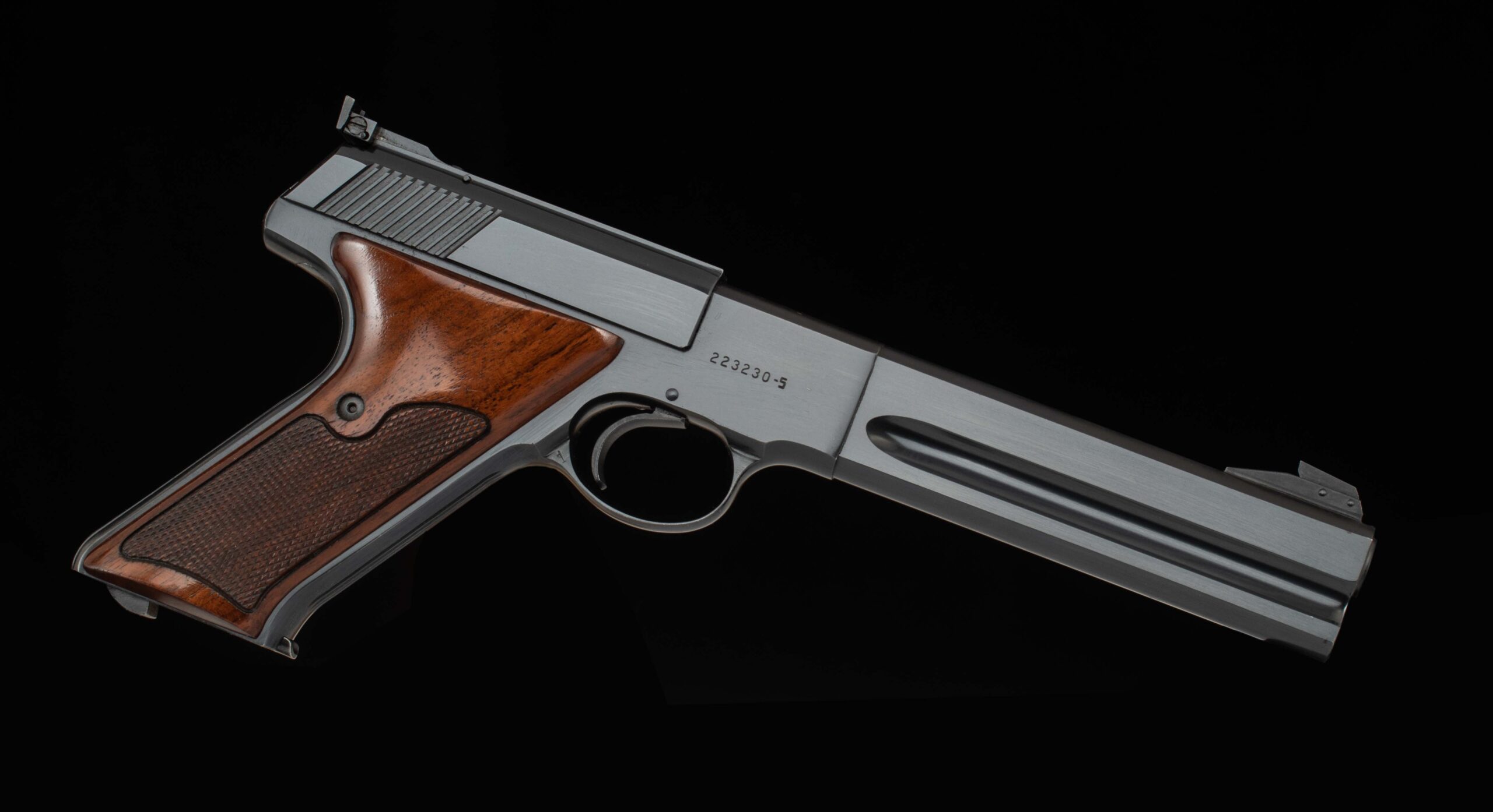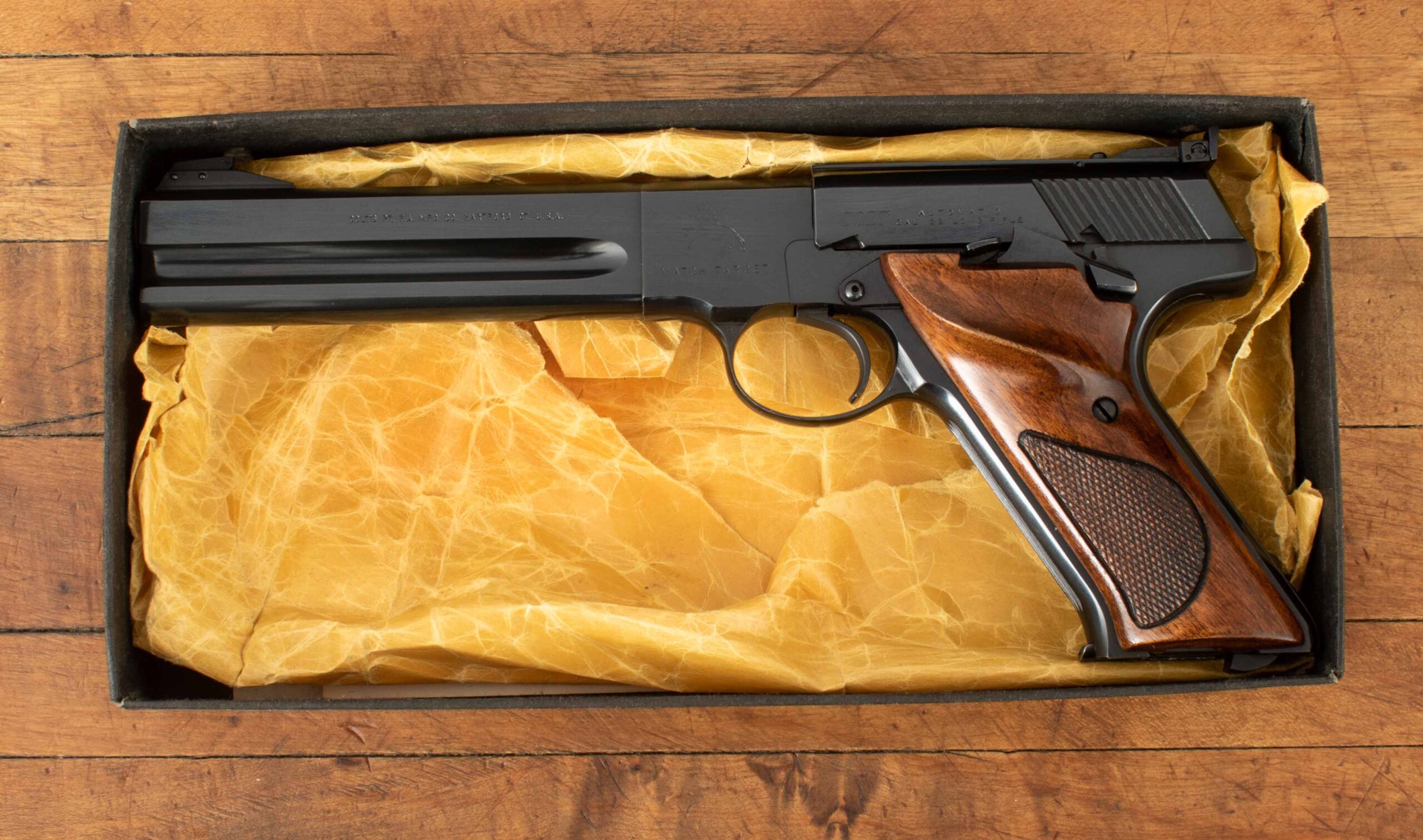 The quintessential American rimfire pistol. Designed by John Moses Browning and finalized by Colt’s engineers F. Chadwick and G. Tansley, the Woodsman was first introduced in 1915 and was to be in production in various forms until 1977. The pistol was the first successful semi-automatic .22 rimfire gun to be offered, earlier attempts had been problematic, but Mr. Browning got it right by using an angled magazine to ensure the rimmed cartridge would not ‘rimlock’ onto its predecessor. The Woodsman has remained a favorite with shooters and collectors since its introduction. This example serial number 223230-S was manufactured in 1968 and is in superb condition with 99% of its original factory finish with clear roll marks and a mirror bore. The target trigger is exceptional and breaks cleanly at 3.8lbs and it comes factory fitted with a heavy barrel and adjustable target sights, ideal for your next competition. Included with are its original box, test target, and documents. Have a look at the detailed specifications and pictures below. Thanks for looking!