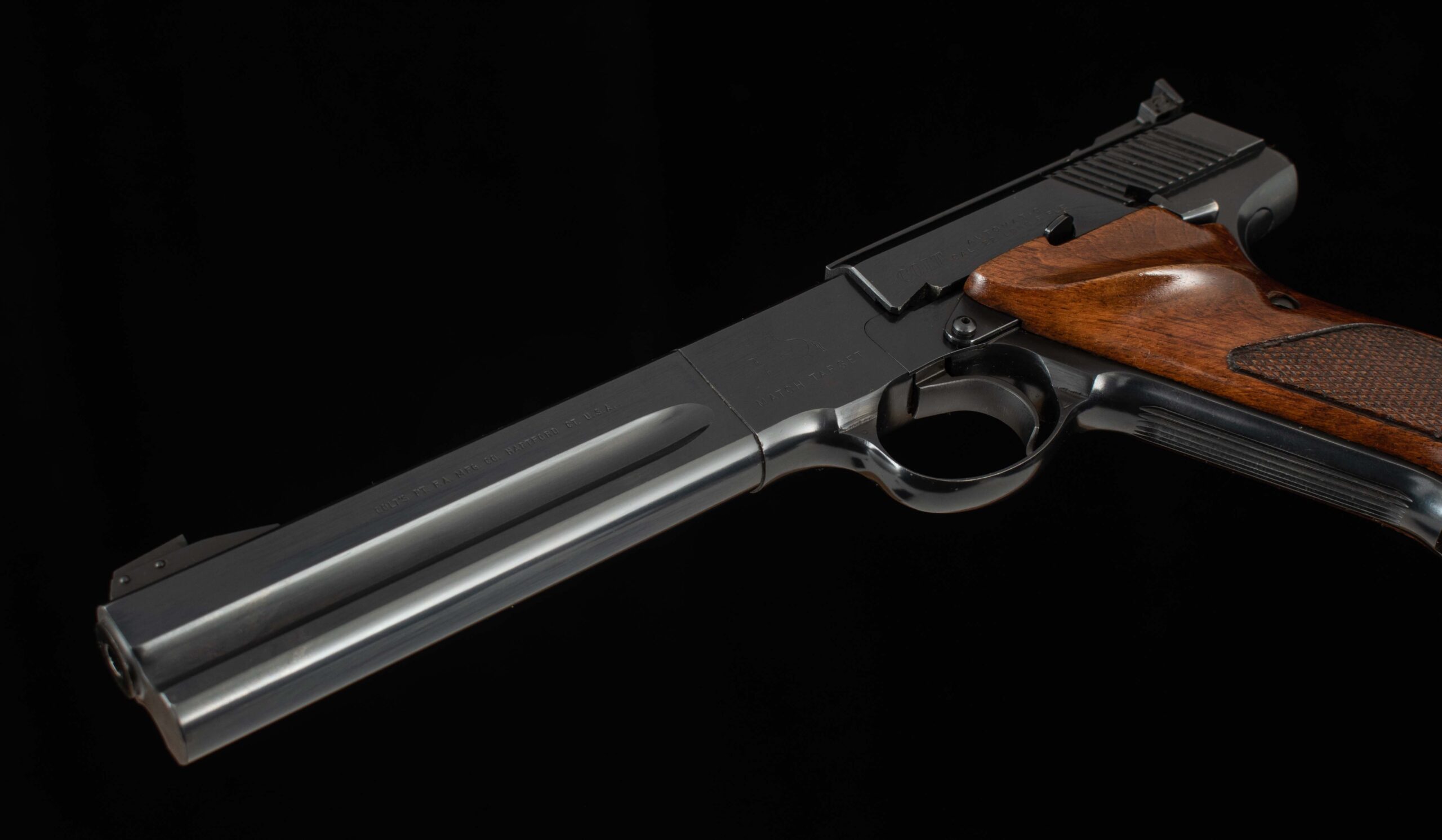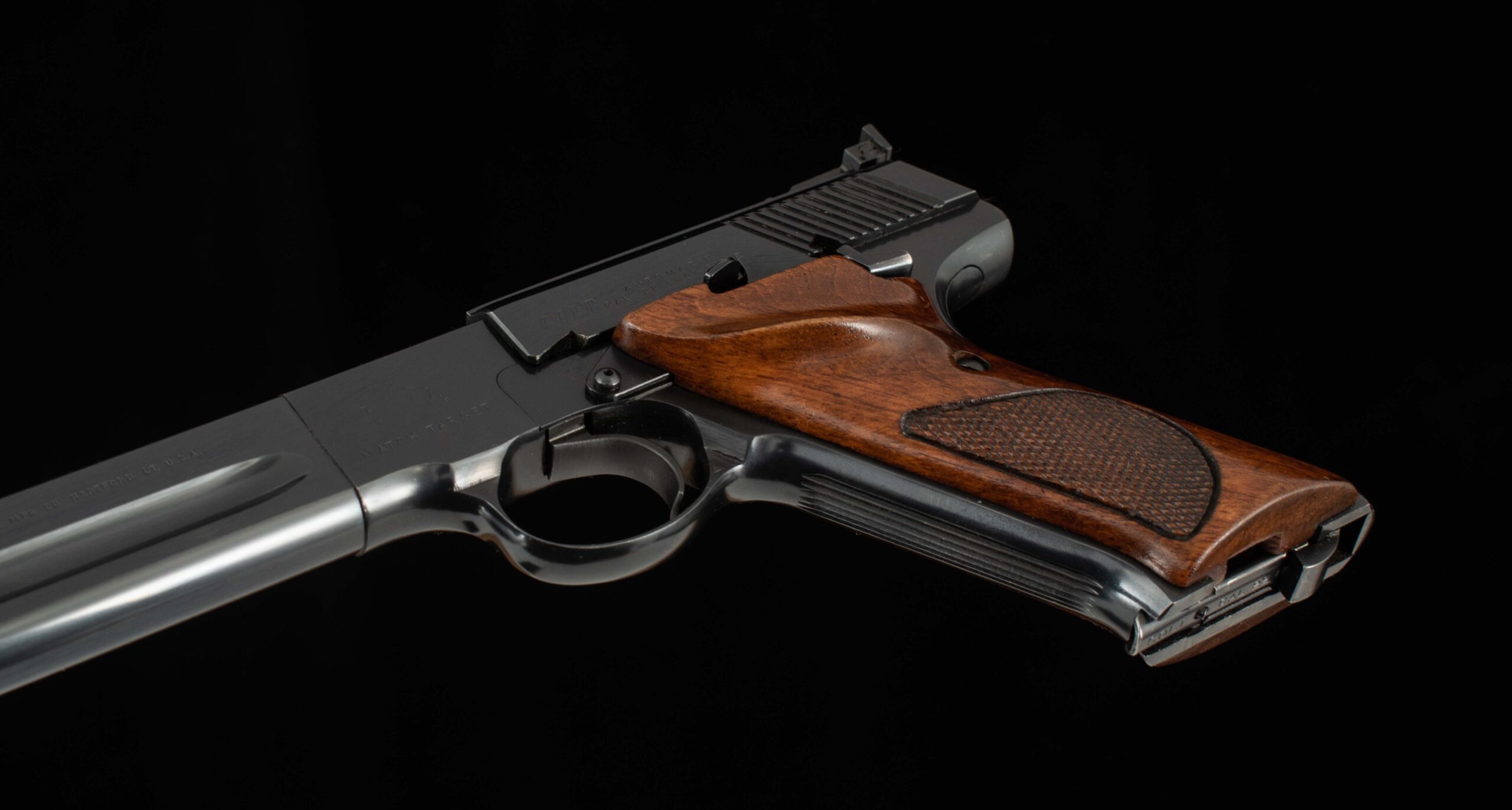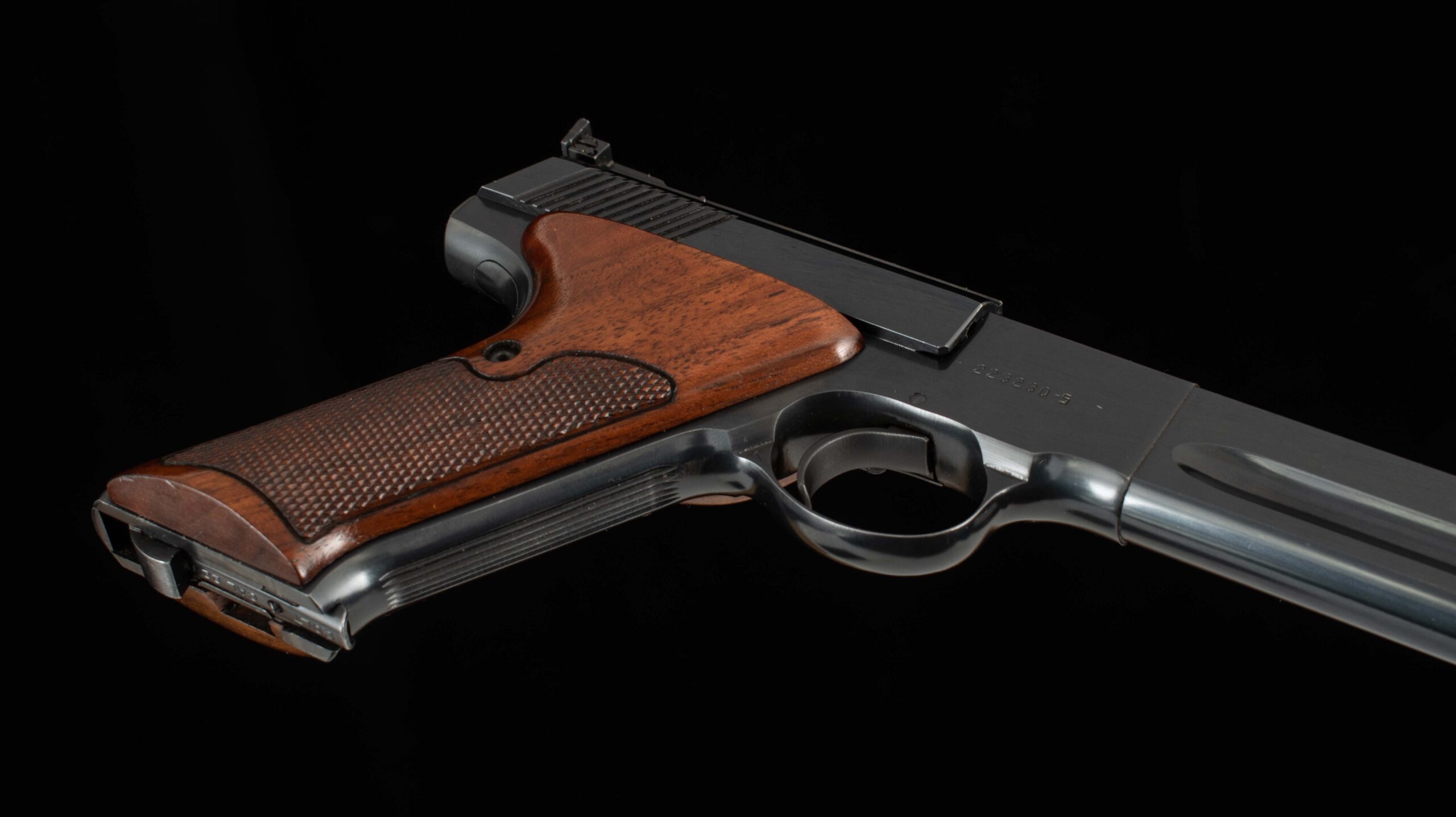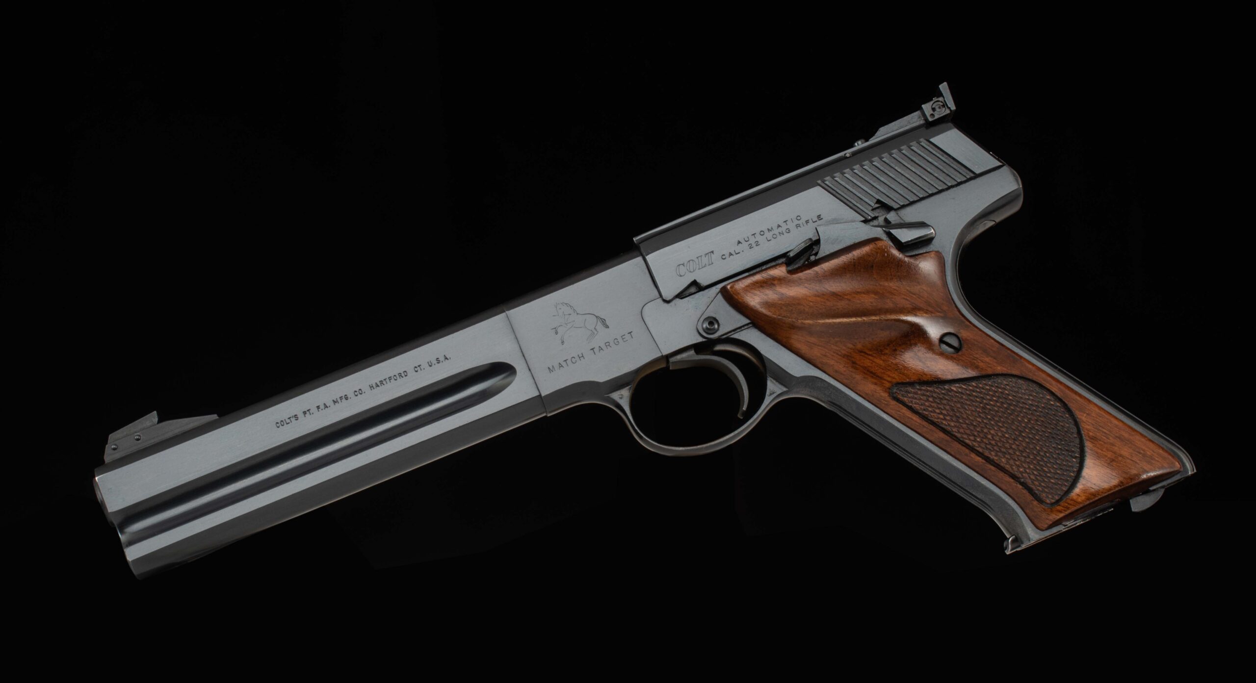 The quintessential American rimfire pistol. Designed by John Moses Browning and finalized by Colt’s engineers F. Chadwick and G. Tansley, the Woodsman was first introduced in 1915 and was to be in production in various forms until 1977. The pistol was the first successful semi-automatic .22 rimfire gun to be offered, earlier attempts had been problematic, but Mr. Browning got it right by using an angled magazine to ensure the rimmed cartridge would not ‘rimlock’ onto its predecessor. The Woodsman has remained a favorite with shooters and collectors since its introduction. This example serial number 223230-S was manufactured in 1968 and is in superb condition with 99% of its original factory finish with clear roll marks and a mirror bore. The target trigger is exceptional and breaks cleanly at 3.8lbs and it comes factory fitted with a heavy barrel and adjustable target sights, ideal for your next competition. Included with are its original box, test target, and documents. Have a look at the detailed specifications and pictures below. Thanks for looking!