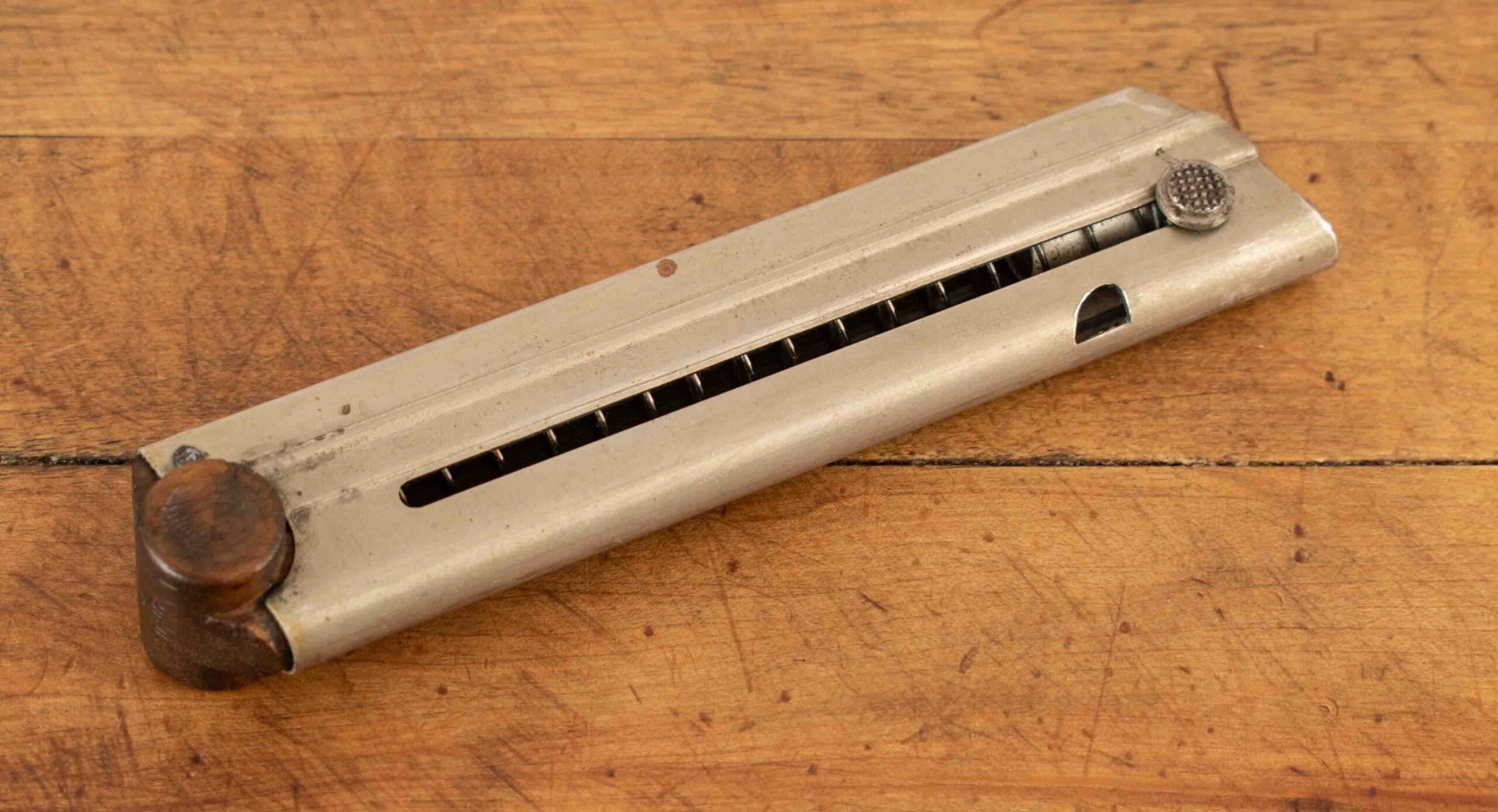 Vintage Firearms is pleased to offer this interesting P.08. The frame is serial number 59913, it is likely a commercial 1908 (considered ‘scarce’ in the Standard Catalog of Lugers, A. Davis) while the slide is from a DWM 1914 pattern Luger. The two parts have been expertly put together post war to sell to the international market, a common practice. This example was exported to the United States of America and is stamped GERMANY. The frame has matching serial numbers on the take down lever, trigger and cover. The barrel, slide and components share matching serial number 1048; the safety reads GERICHERT and the chamber indicator GALADEN, the receiver has clear proof marks. The magazine is serial number 9304. The gun is in 95% condition with an excellent bore. The gun functions well and its tolerances are still tight; there is no hold open and no stock lug. Overall, an interesting example of a commercial gun with a military slide. It would make a great shooter or an interesting sample of post war ingenuity and market forces. Whatever its story, it’s a most intriguing gun. Thanks for looking!