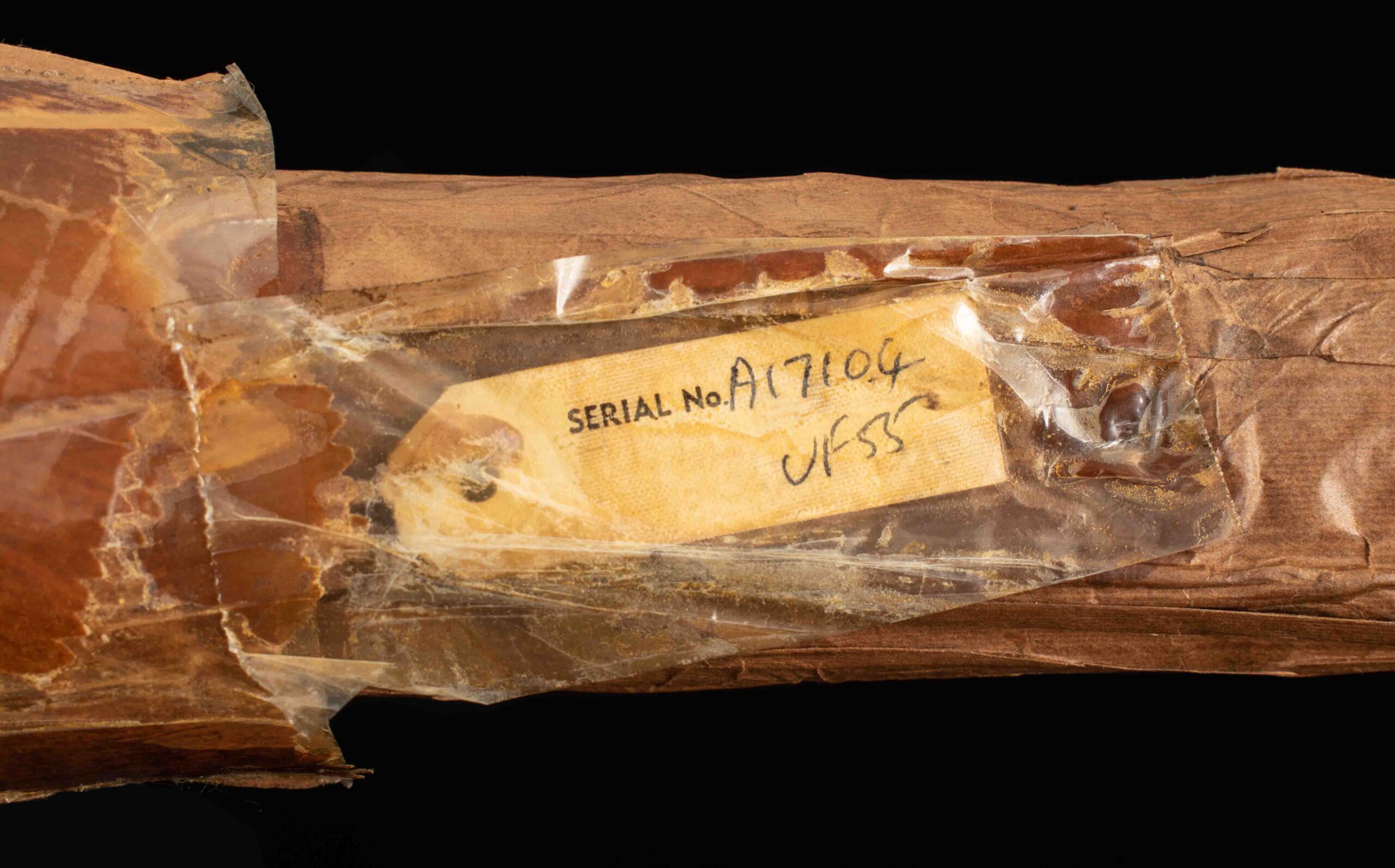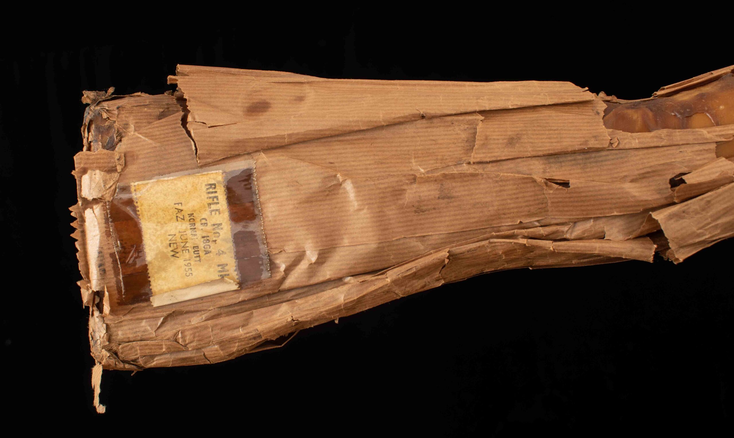 Vintage Firearms is pleased to offer an ROF Fazakerley produced Enfield No.4 MK2, the one final iterations of the British Lee-Enfield platform. This example, serial number UF. 55 A17104, is still mummified, unfired, straight from the factory and comes with its bayonet. The only part which has been unwrapped is a small section of the receiver to expose the serial number. This rifle was produced in June of 1955, meaning it was produced to a higher standard than the wartime productions. This British mummy would make a fine addition to your collection. Have a look at the detailed specifications and pictures for more details. Thanks for looking!