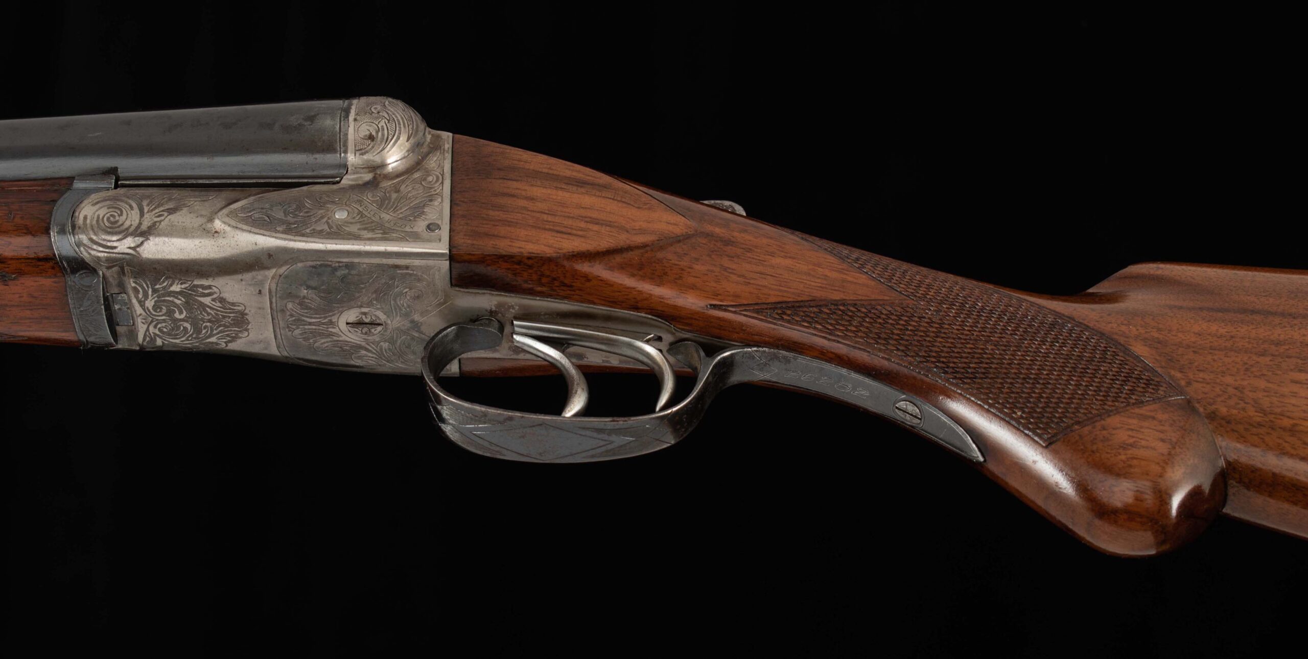 | General Specs: A.H. Fox, 1920, 12 Gauge, 6lbs. 15oz., Chokes IM/F, LOP 14 1/4″, DAH 3″, DAC 1 3/4″ Serial Number: 26282