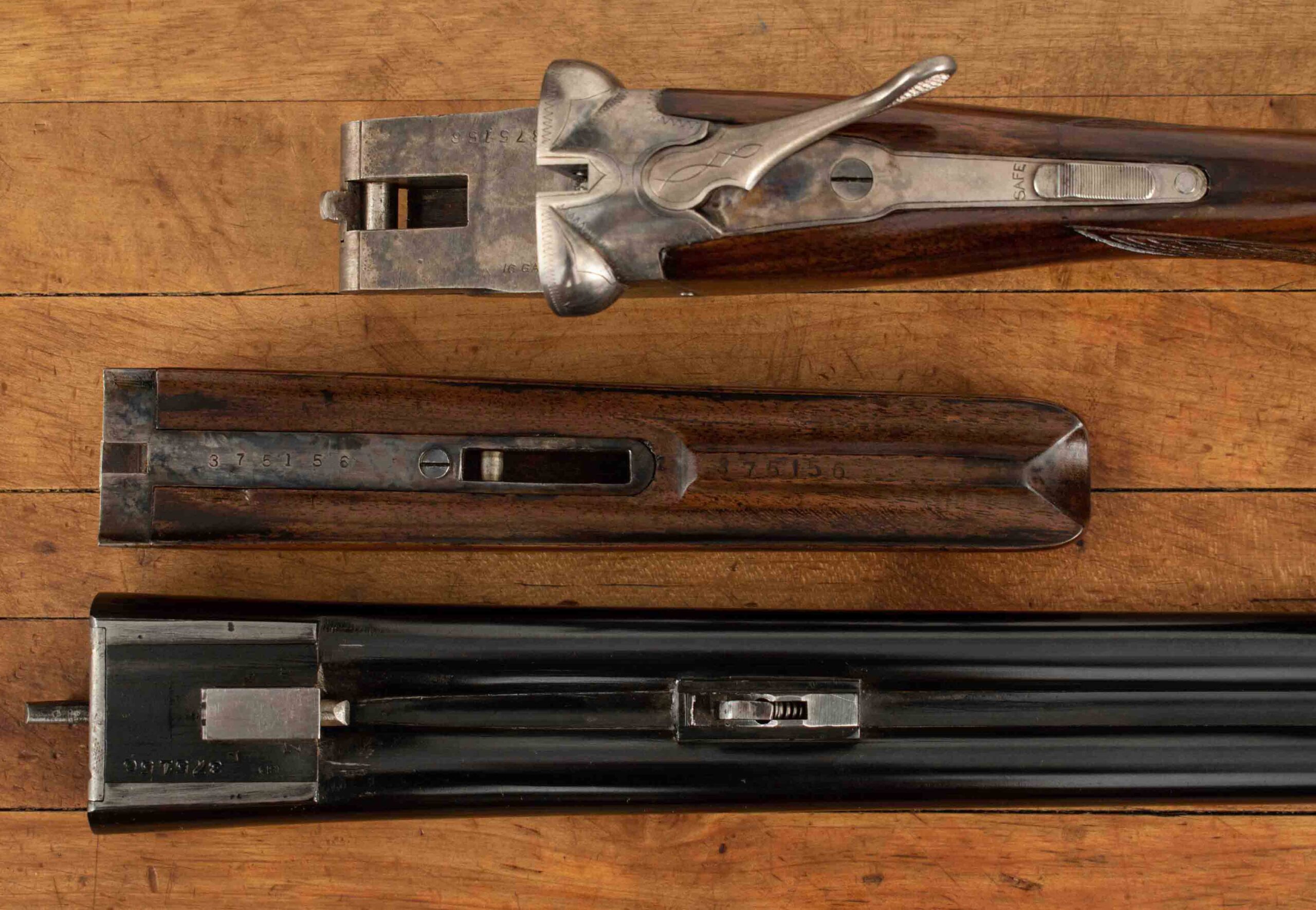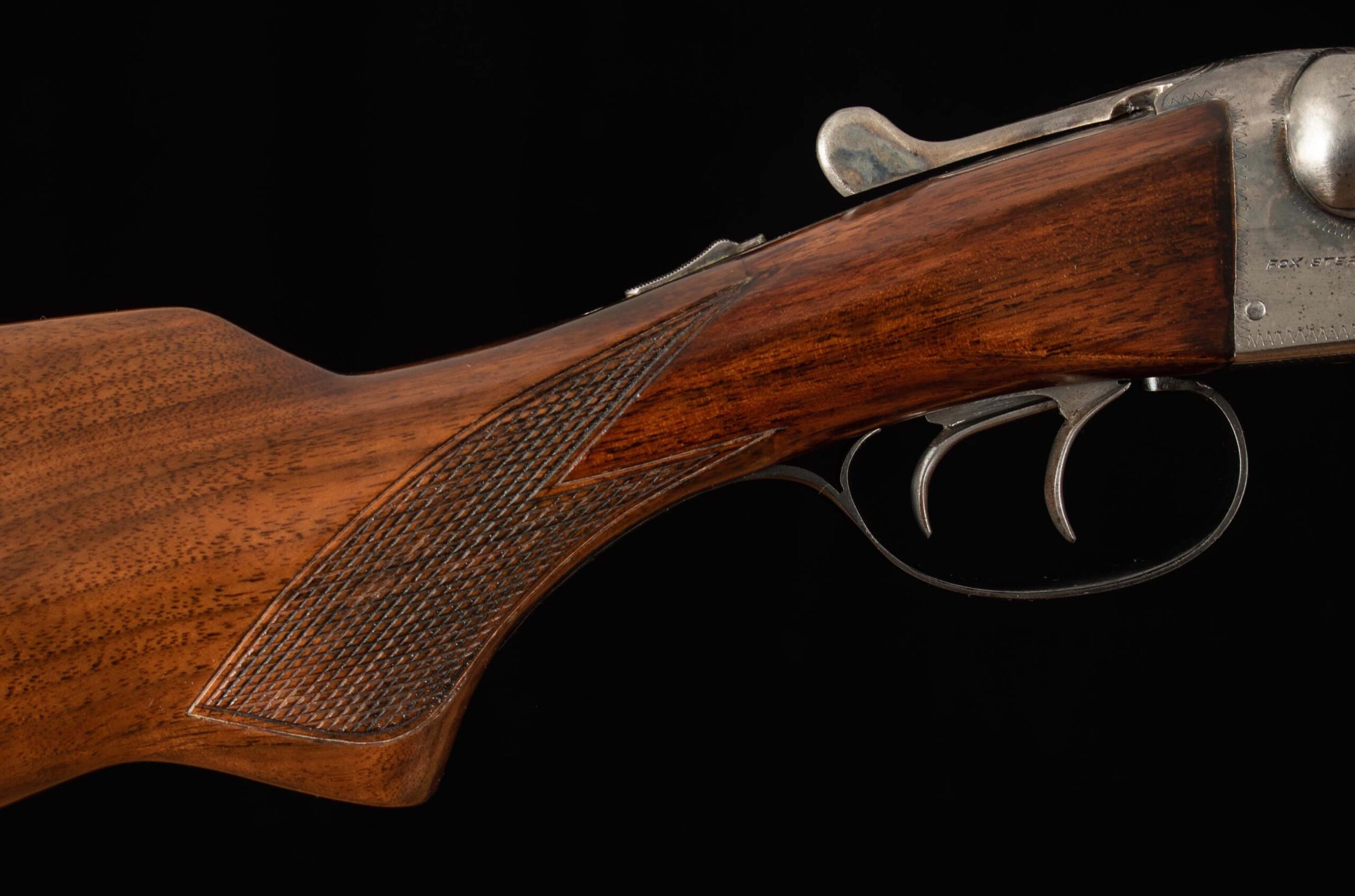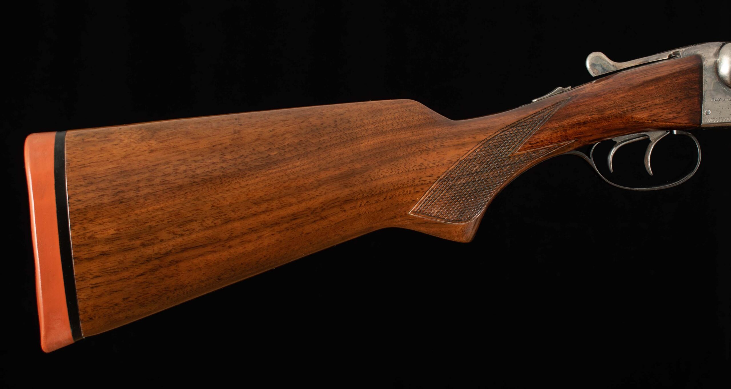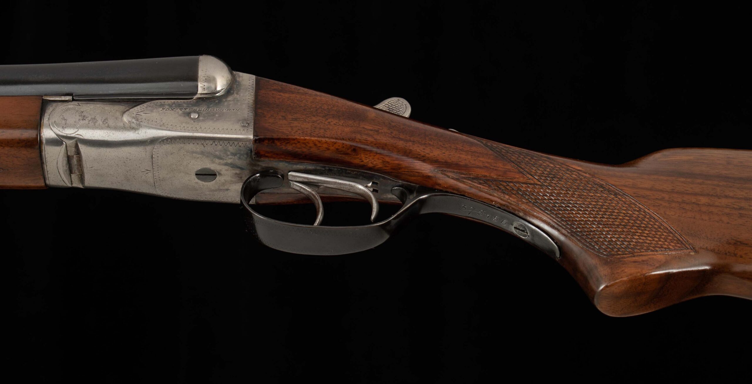 | General Specs: Fox, 1938, 16 Gauge, 6lbs. 4oz., Chokes LM/F, LOP 13 5/8″, DAH 2 13/16″, DAC 1 11/16″ Serial Number: 375156