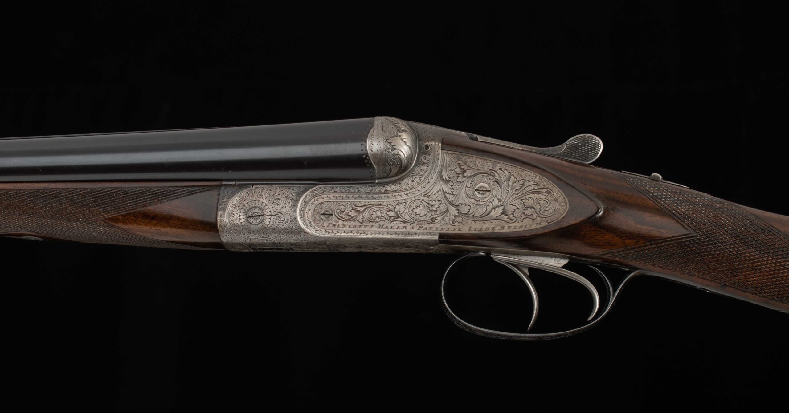 Vintage Firearms is pleased to present this deft handling, lightweight, sidelock ejector, from August Francotte.  Made in Liege, Belgium in 1907, this pre-war gun, has all original metal finishes and a fresh restoration by our talented gunsmiths on the stock and forend, with a beautiful hand rubbed oil finish.  Double bordered, point pattern checkering gives a comfortable, stylish, and confident grip to this handy little double barrel.  The barrels have mirror bores and factory blue in 98% condition.  The top rib has very a very nice, crisp matting design and scroll engraving with a gold bar on the rib extension. The receiver engraving still has the little hooks and catches from the engraver tools, and the case color has mostly faded to a handsome patina.  The trigger guard retains 95% of its factory charcoal blue.  The action features deep relief engraving with side clips on the breech fences, and a bottom lug for an exceptionally confident lock up.  The gun is tight on hinge and tight on face.  The top lever is centered.  The manual safety, double triggers, and ejectors all function as they should.  The chokes offer versatility for upland birds and rabbits with skeet and improved mod, respectively.  The gun is mechanically excellent and is a VFI CERTIFIED GUN HAVING THE ACTION AND FOREND IRON STRIPPED, ULTRASONIC CLEANED, ALL PARTS SCRUBBED CLEAN, INSPECTED FOR FUNCTION AND INTEGRITY, LUBRICATED, AND REASSEMBLED, NOW CARRYING A 90-DAY MECHANICAL WARRANTY.  This is a $450 service in our shop. Coming in at 5 pounds and 12 ounces, this shotgun will be a delight to carry.  An attractive gun with vintage style, historic craftsmanship, great features and a warranty; a worthy consideration for your collection.