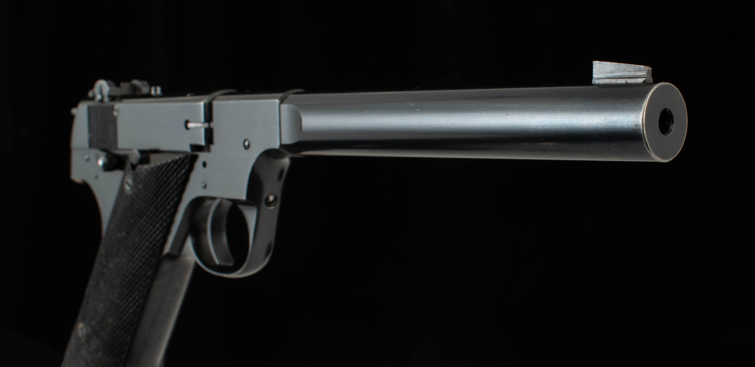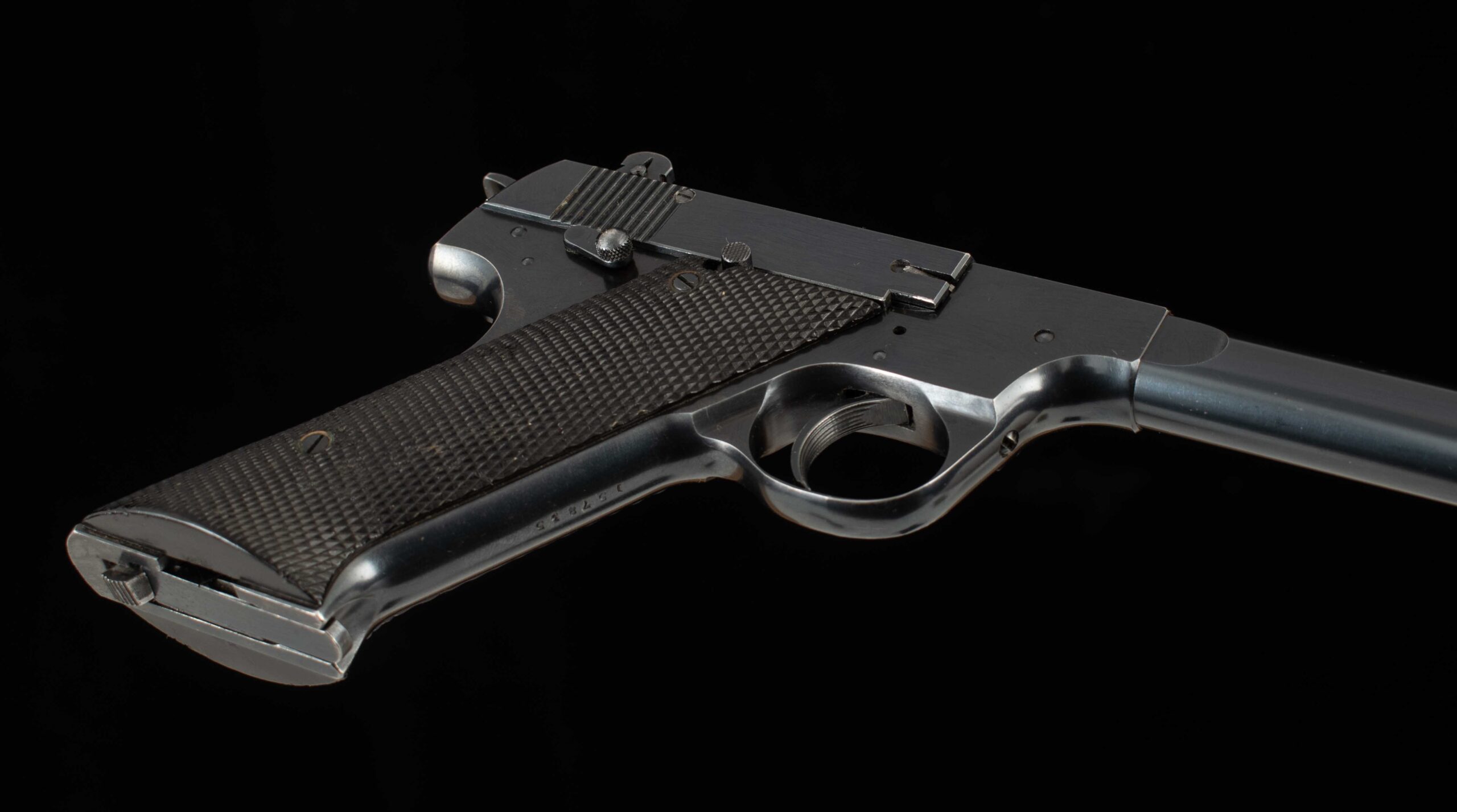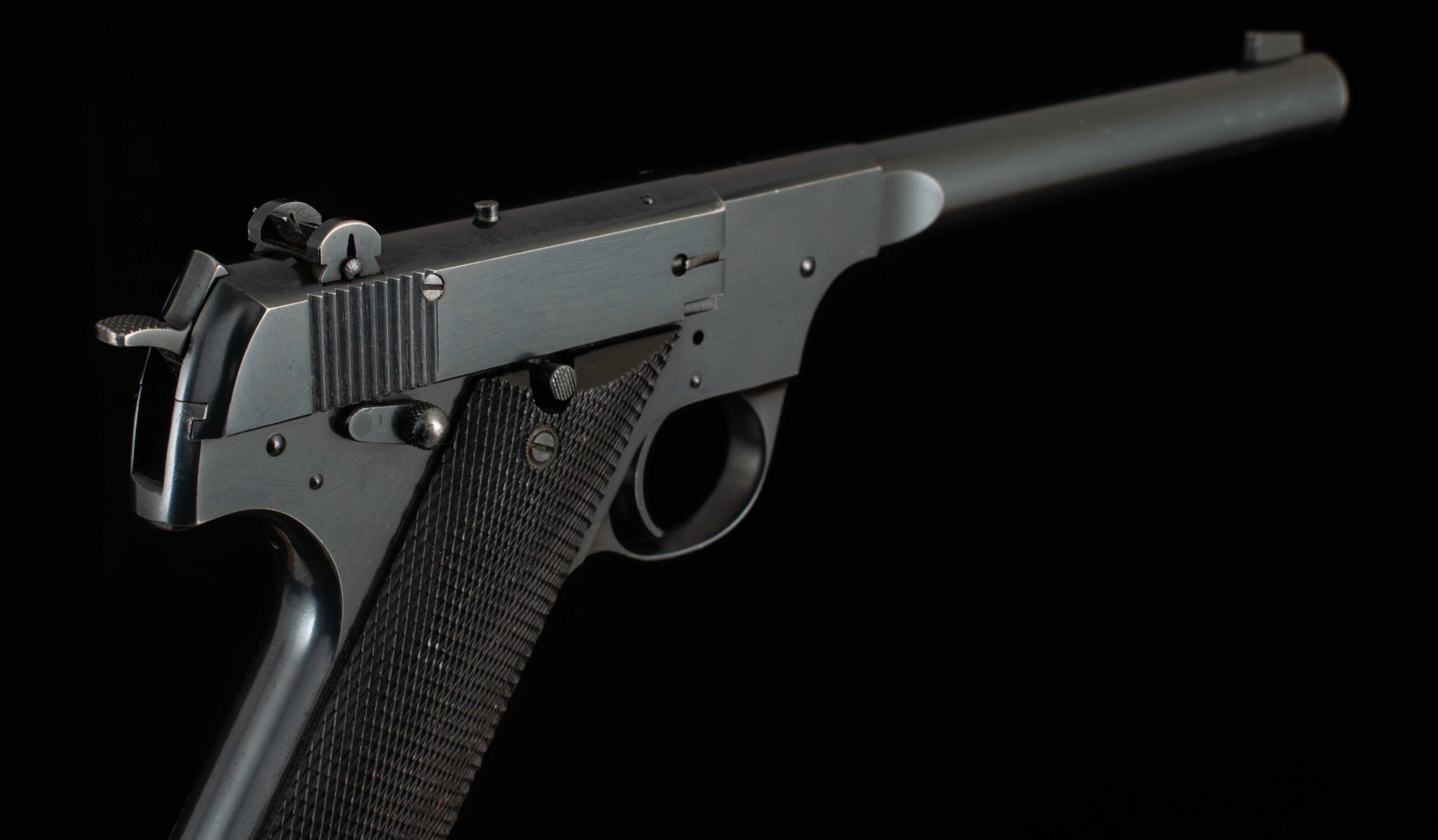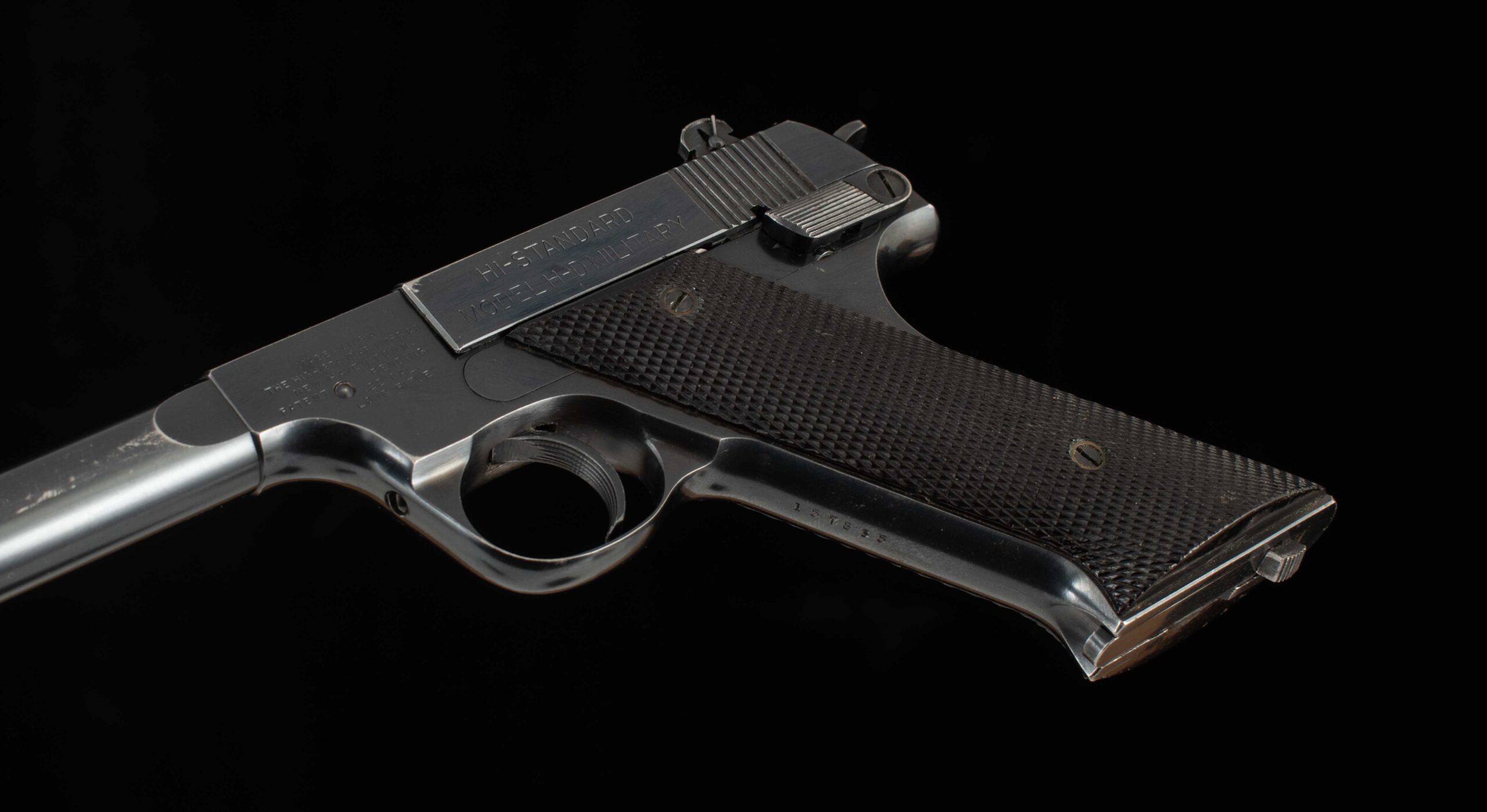 | General Specs: Hi-Standard, 1946, .22LR, 40oz., Barrel 6 3/4″ Serial Number: 157835The Hi Standard H-D is a rarity in the .22LR semi auto field; when most manufacturers were producing hammerless semi autos, HI-STANDARD bucked the trend and brought to market their Model H-D; the “H” stands for hammer. Hammer guns have some advantages over internal mechanisms in that it is easy to see what condition the gun is in and makes for a great training gun. During WWII, the US armed forces bought several thousand Model H-Ds for training, this is why Hi-Standard later added the word “Military” to the model name to honor its war time achievements, and it made for a great patriotic advertisement too! This example was built in 1946 and is serial numbered 157835. The gun has 99% factory bluing on the receiver, the barrel is 95% with a some holster wear at the muzzle. The grips are in excellent condition, wood to metal fit is superb. The pistol has a 6 3/4inch barrel exhibiting sharp rifling and mirror bore, the action is smooth with the trigger breaking crisply at 3lb. HI-STANDARD set the standard for high quality yet affordable pistols and this gun is no exception, a wonderful addition to any hi-quality collection and an ideal gun to take to the range for a day of plinking. Thanks for looking!