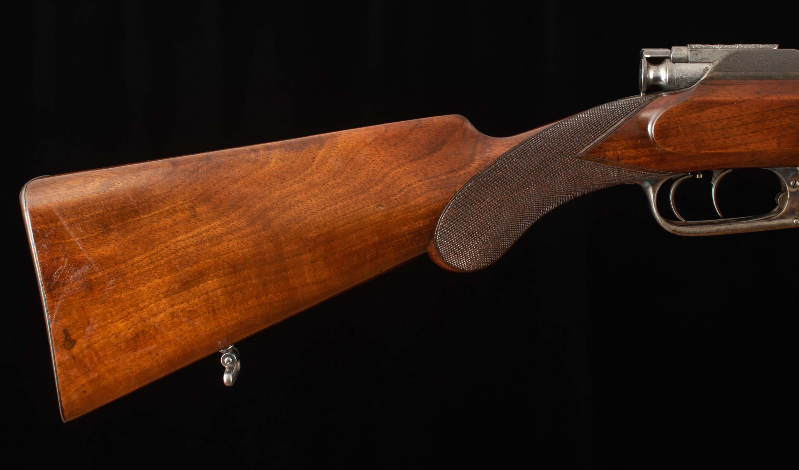 | Type: round pistol grip with cheek piece/sporter with Schnabel forend LOP: 13 1/2″ LOP To End Of Wood: 13 3/8″ Checkering Condition: very good Butt Treatment: metal plate with nib |