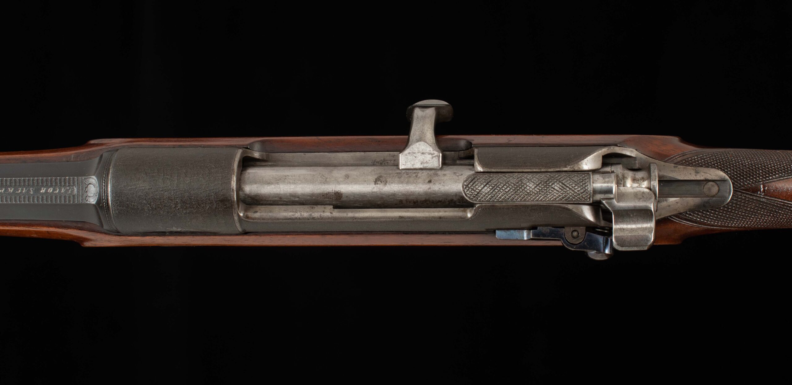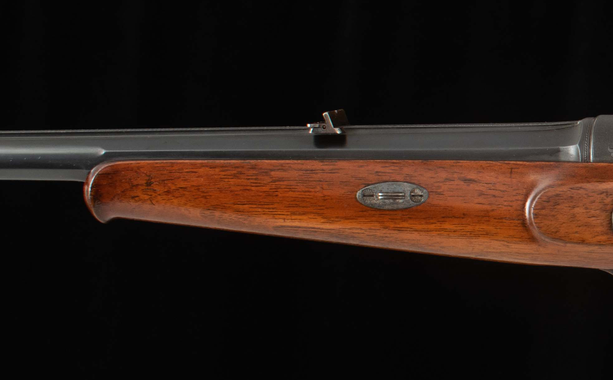 Vintage Firearms is pleased to present this fine sporting rifle. The maker of the Gewehr 88 action is unknown (there are a couple markings that I haven’t been able to identify, maybe one of you will be able to help us know who built this great rifle), but the half-octagon barrel, at the breech end of its milled integral top rib, has a silver inlay “Jacob Sackreuter – Frankfurt A/M”. It has a mirror bore and the rifling is in exceptional condition. The sighting system features a one-leaf express sight at the rear, and an adjustable front post dovetailed into the integral rib’s front ramp; a fine piece of engineering and craftsmanship. The controlled round feed action is smooth as butter. The maker case color on the magazine housing, trigger guard, and on the action where it hasn’t been matted, is all strong and gives a unique and classy look. The deluxe wood stock features a graceful cheekpiece, Schnabel forend, round knob half pistol grip, fine checkering, case colored and engraved screws, wedge key and embellishments, as well as a smooth, case colored smooth metal buttplate with nib, wood to metal fit is superb. Flip open the trapdoor on the magazine housing and you’ll find a reusable en bloc clip for easy loading. Chambered in Patrone 88 or M/88, the predecessor to the 8x57mm cartridge, this is a capable and deadly hunting cartridge for the hunter who loads his own ammo. Show up to hunting camp with a rifle that will have all your hunting buddies’ respect and admiration.