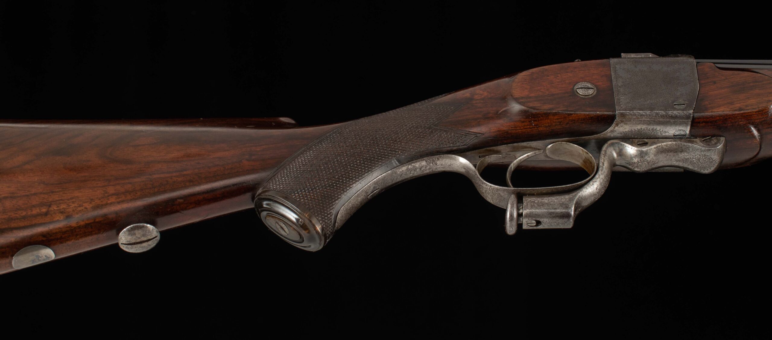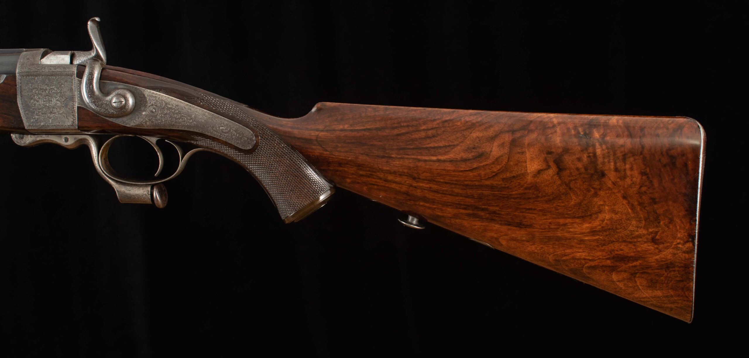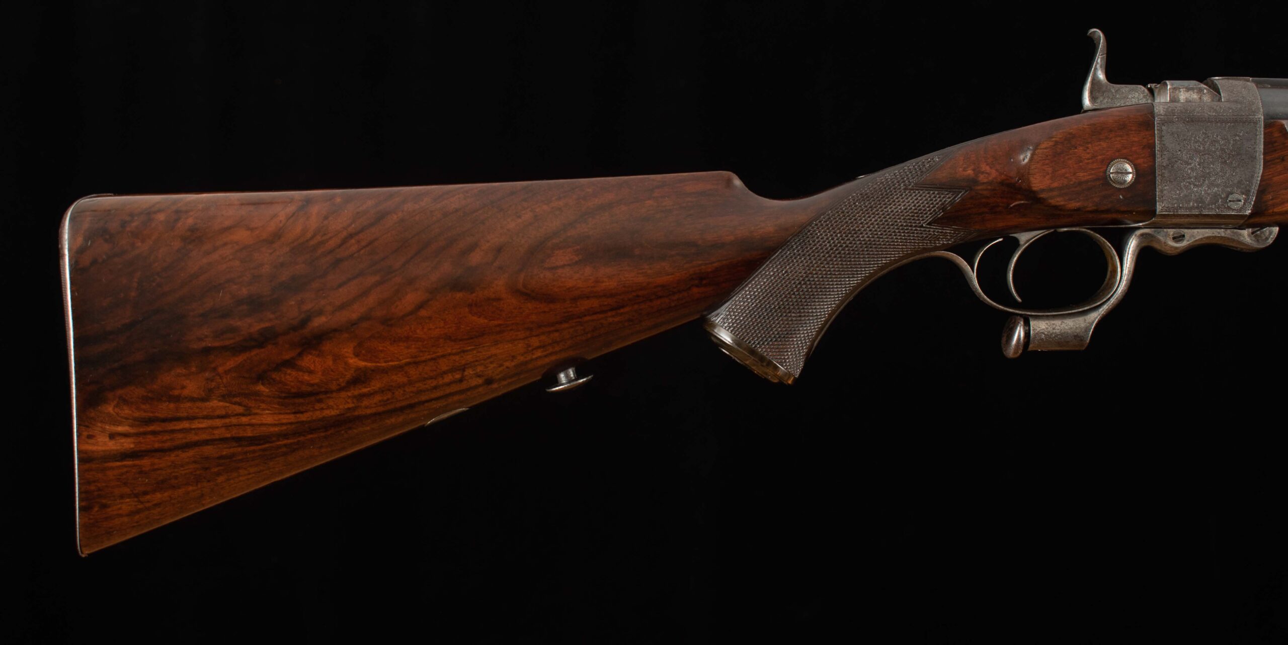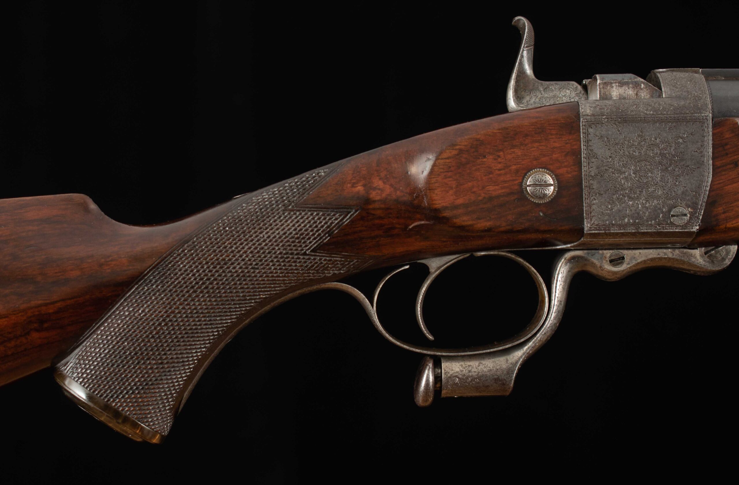 | Action: falling block Receiver Condition: 90% factory Screws: very good Engraving: crisp, fine scroll Trigger Type: single-crisp Trigger Guard Color: 60% Case Color |