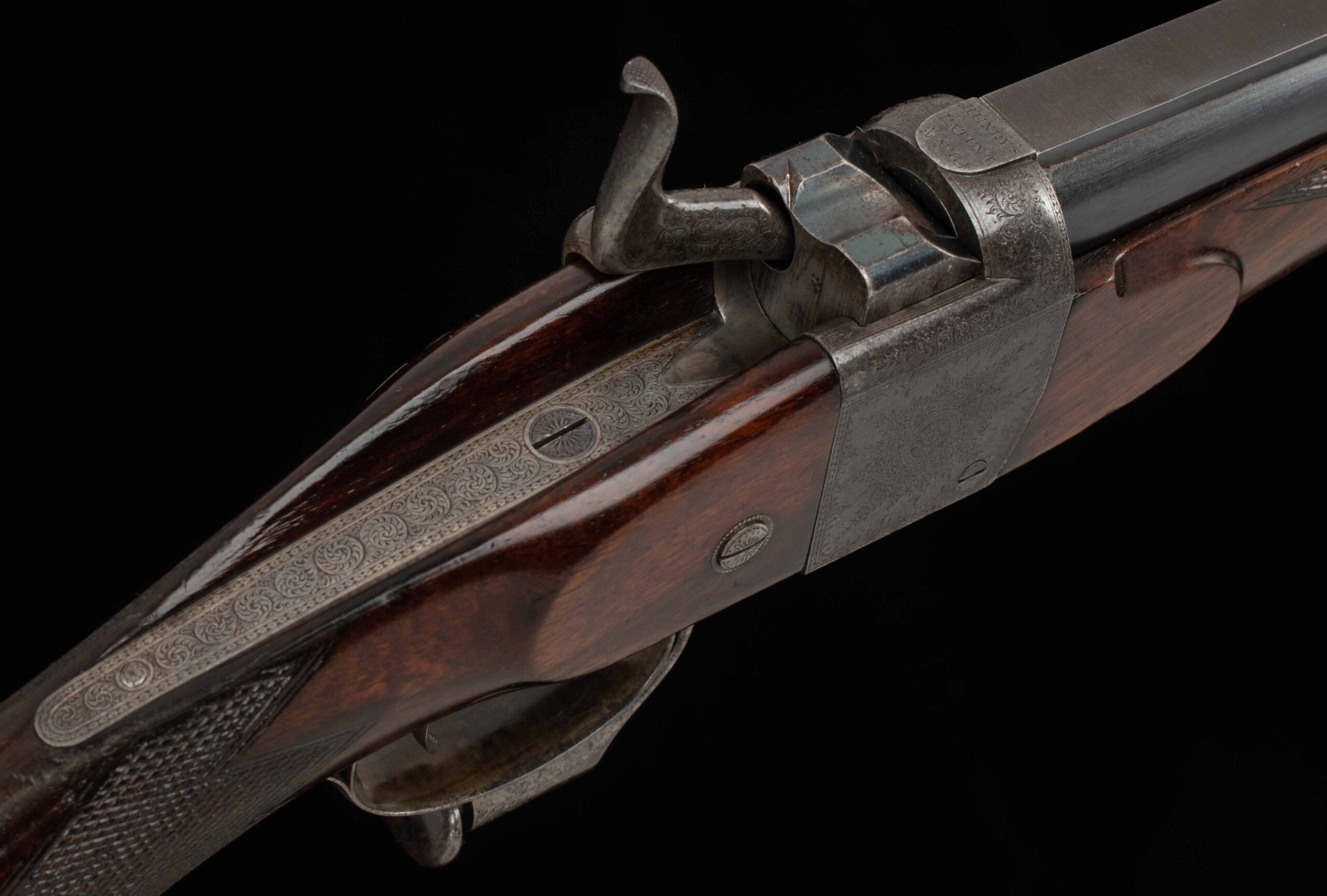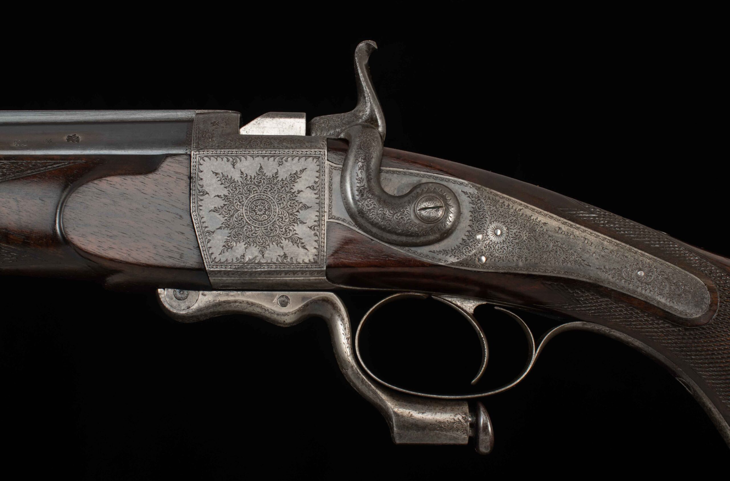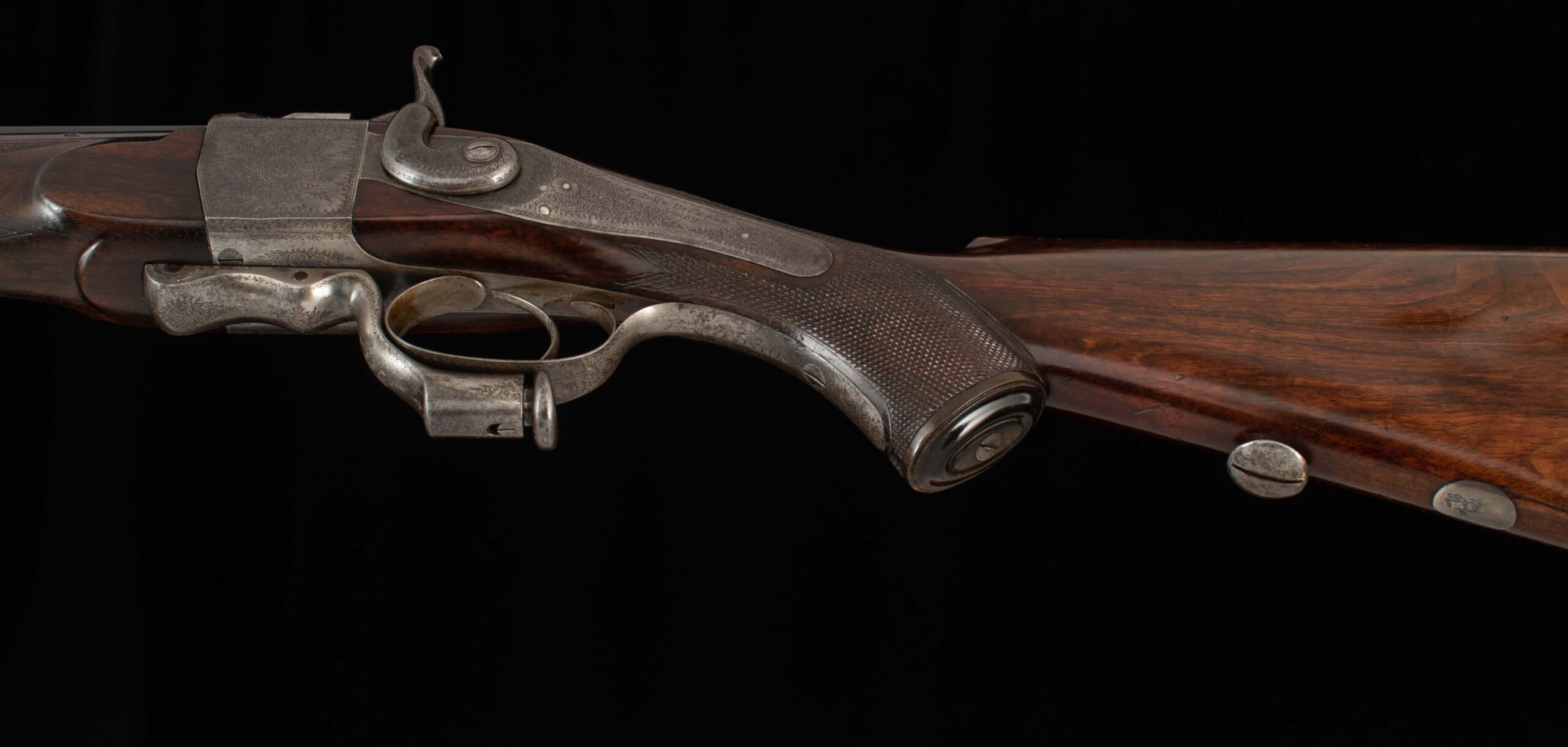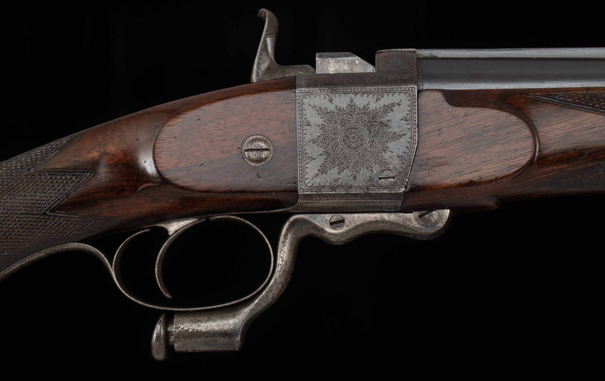 | Action: falling block Receiver Condition: 90% factory Screws: very good Engraving: crisp, fine scroll Trigger Type: single-crisp Trigger Guard Color: 60% Case Color |