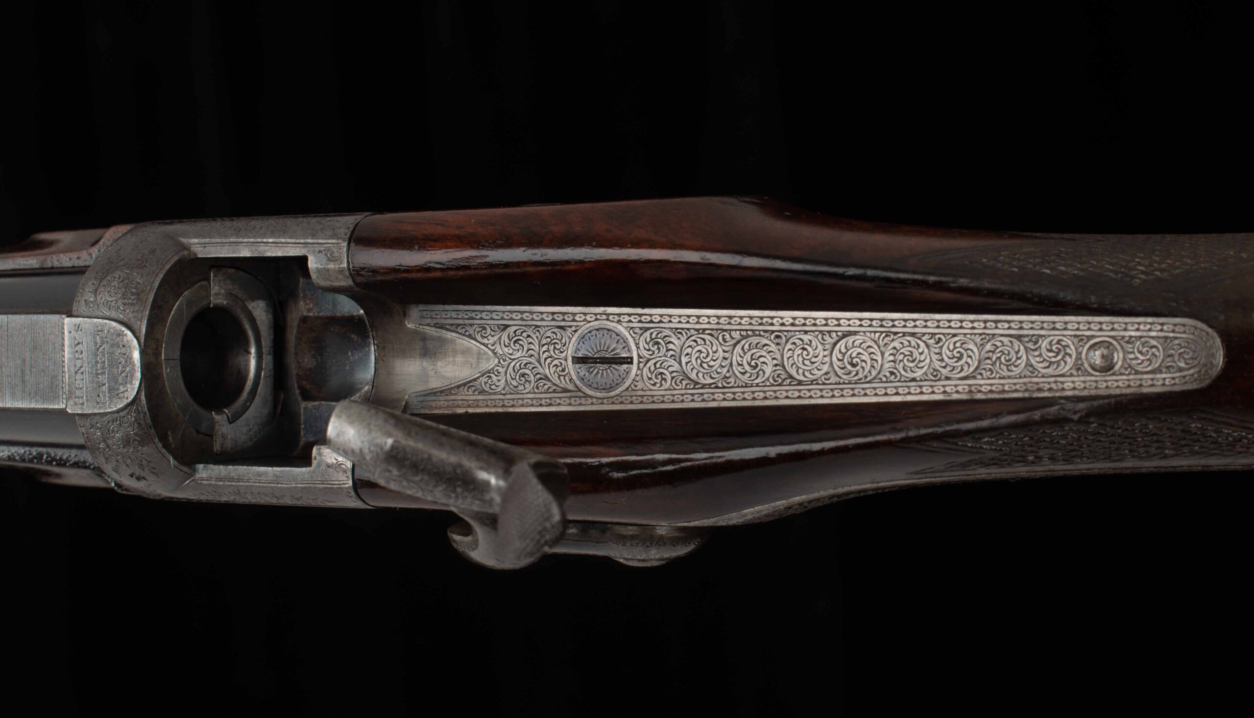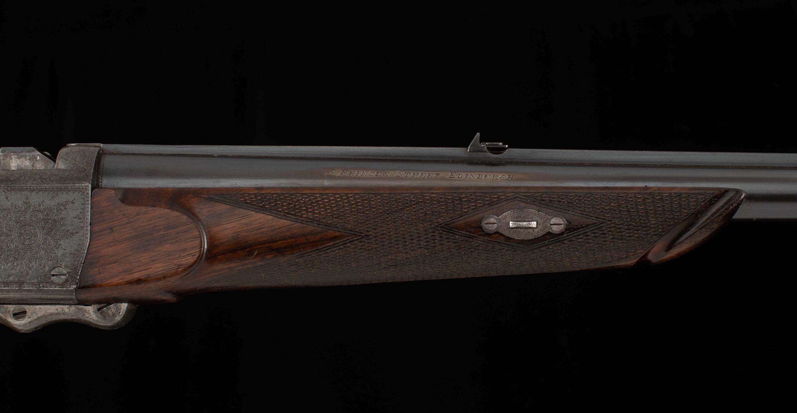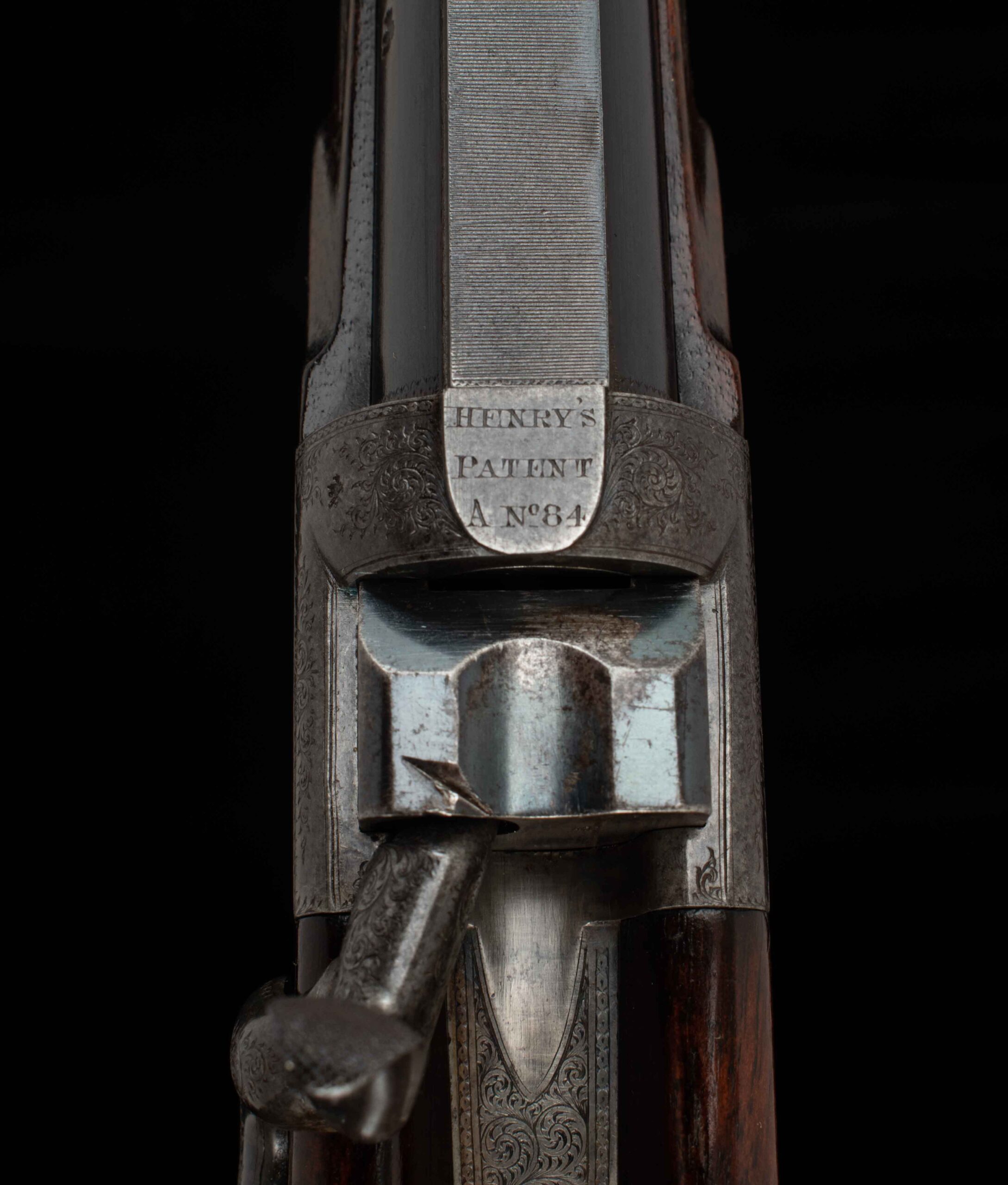 John Dickson & Son built this beautiful rifle in the falling block design. Dickson was known for quality barrel work, and you can see it in this instance with the integral top rib, dovetail mounted V-notch flip up express rear sight, and dovetail mounted front post. The bore rates 9.5 out of 10, with strong rifling. On the top of the breech is engraved “Henry’s Patent A No 84”. The falling block is nitre blued, with a notable mark into the steel. In various spots, behind the hammer, inside the trigger guard, and behind the underlever you can see the beautiful case color in vibrant variation; on the rest of the receiver the case color has turned to a rich, deep colored patina. My favorite detail of this gun is the intricate scroll engraving in the top tang, beautifully executed. The shows light handling marks, more significant near the forend, but overall a handsome oil finish on a pretty piece of wood with nice checkering and very good wood to metal fit. On the underside of the stock you’ll find a stud for a sash style rifle sling, an empty oval inlay ready for your initials, and an attractive horn grip cap with engraved screw. The buttstock terminates in a metal buttplate with a widows peak nib, featuring scroll work near the top for decoration and cut checkering for grip. Keep an eye out for its “little brother” – we have a similar .360 BPE from Alexander Henry, soon to hit the site. There are nitro loads available for each of these cartridges, if black powder isn’t attractive to you. Ready for its next safari, or as a featured piece in a collection of fine arms, this handsome rifle in the venerable .500 Black Powder Express is here for your consideration. Please enjoy the photos and detailed specs.