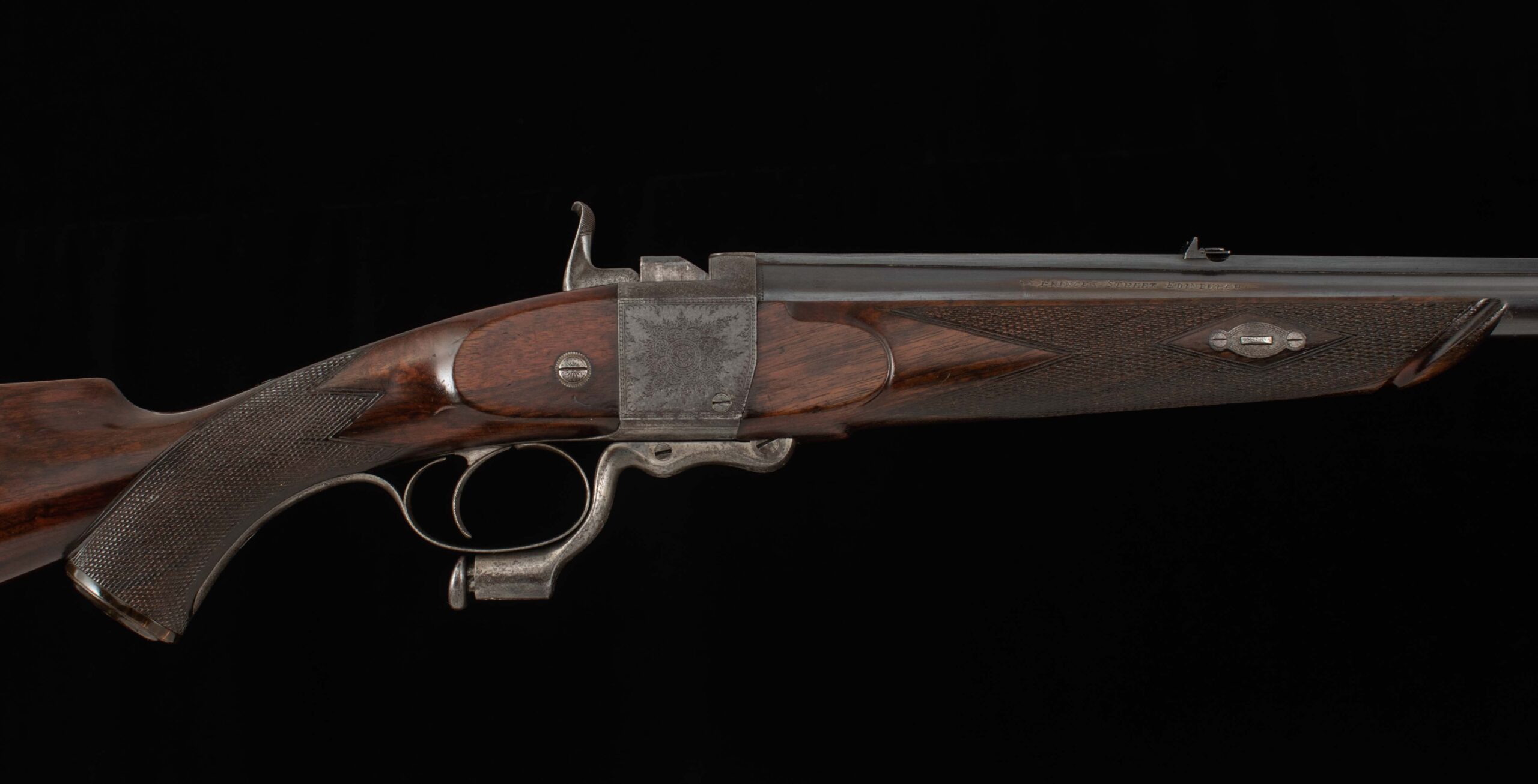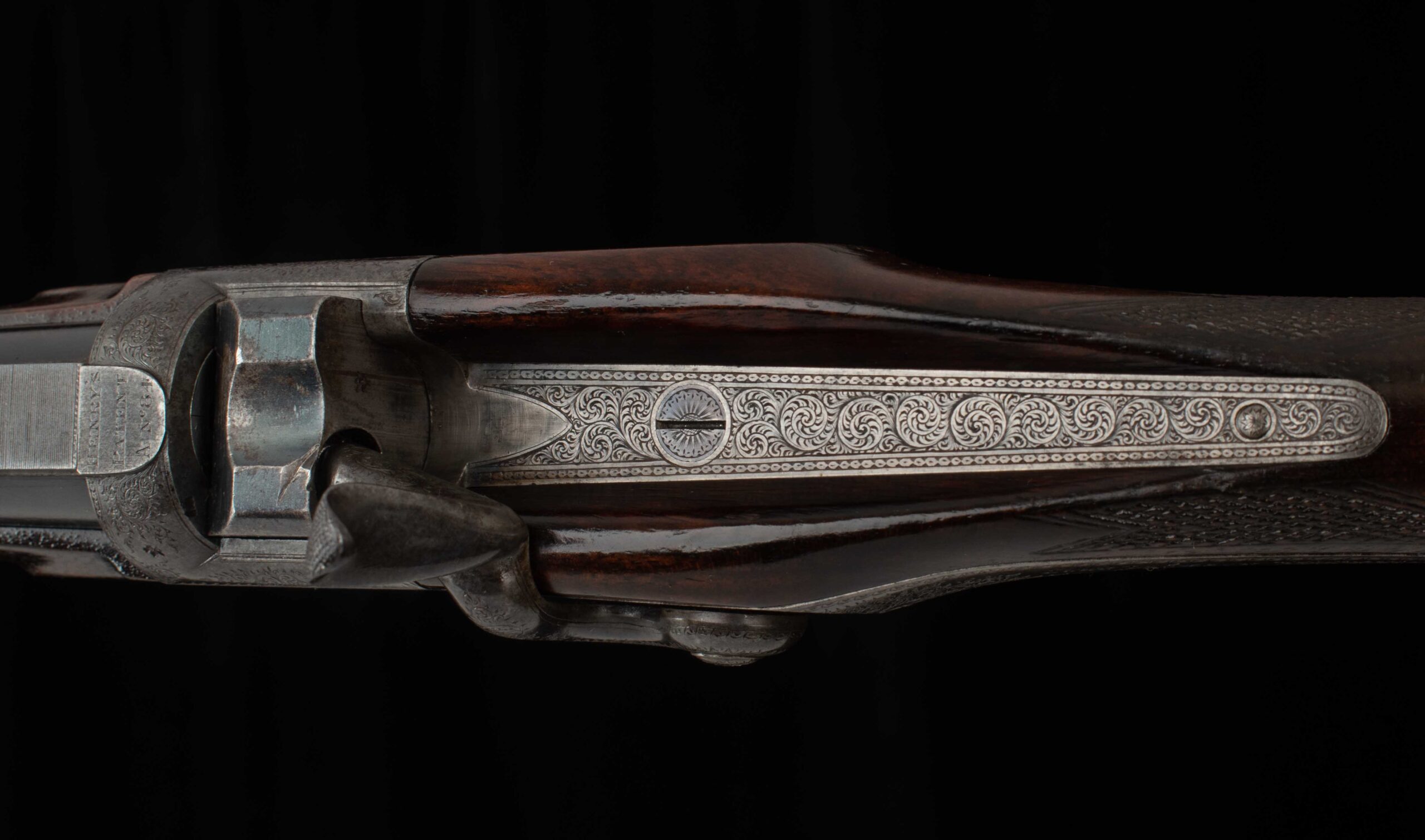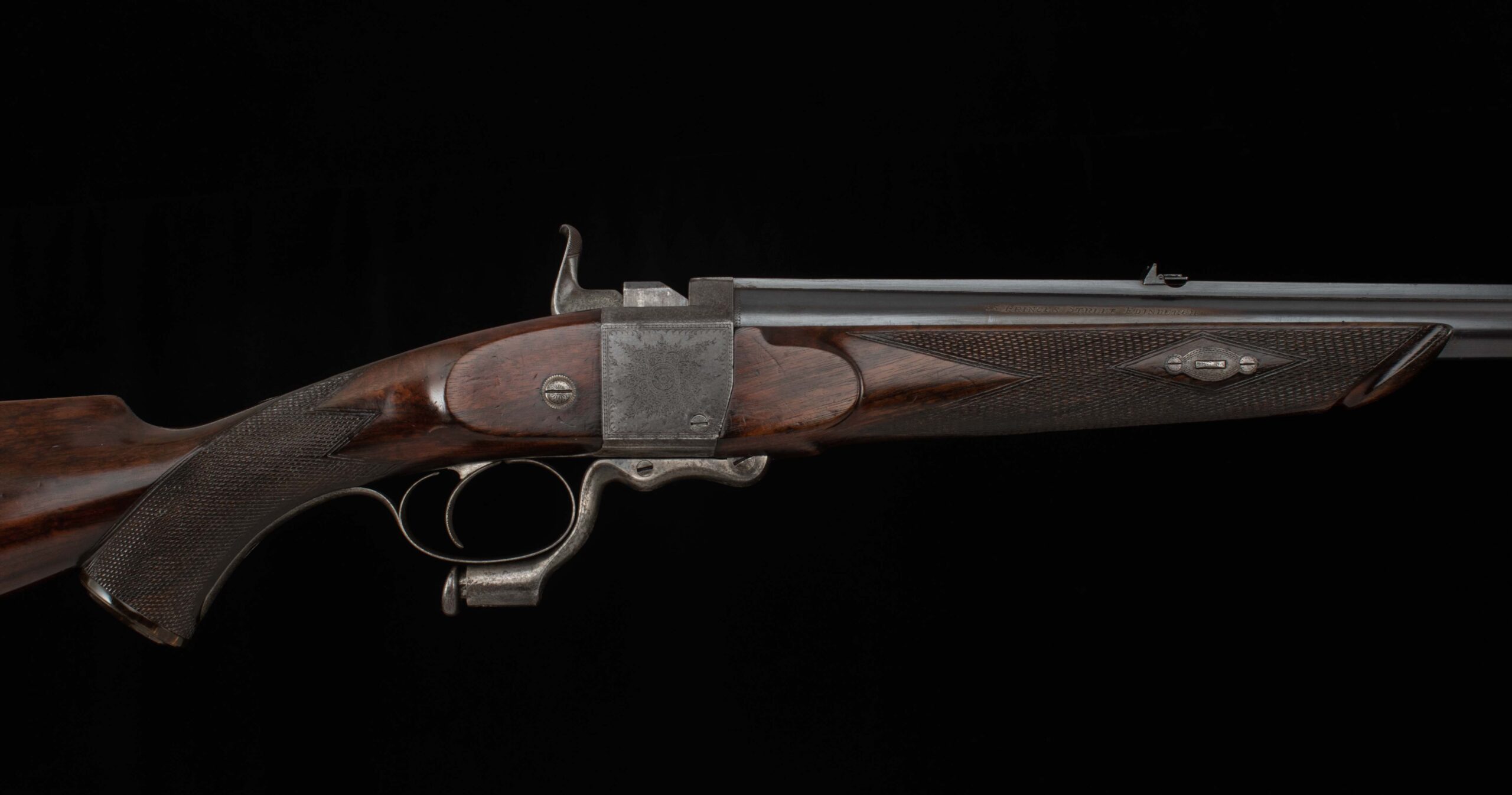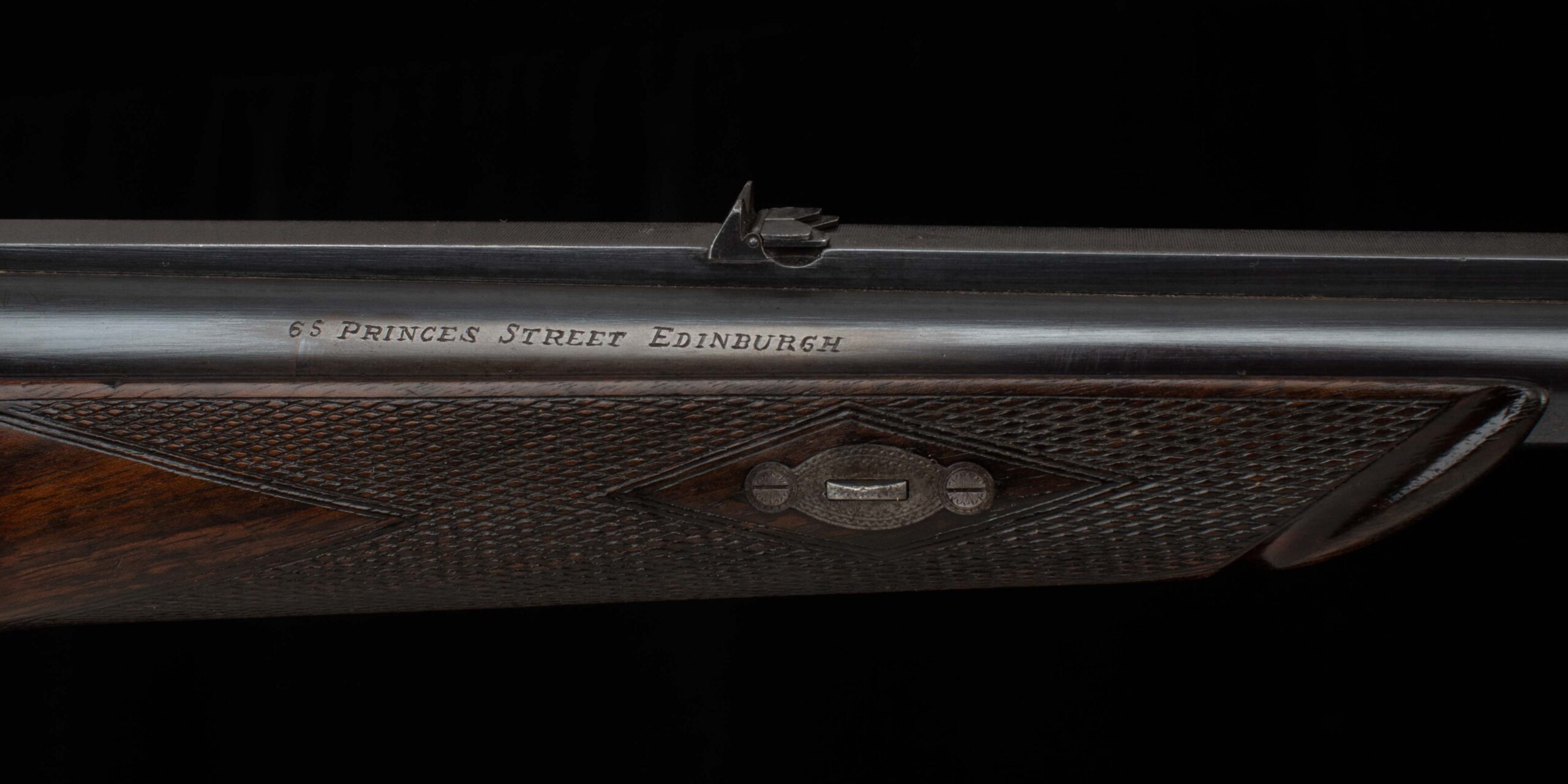 John Dickson & Son built this beautiful rifle in the falling block design. Dickson was known for quality barrel work, and you can see it in this instance with the integral top rib, dovetail mounted V-notch flip up express rear sight, and dovetail mounted front post. The bore rates 9.5 out of 10, with strong rifling. On the top of the breech is engraved “Henry’s Patent A No 84”. The falling block is nitre blued, with a notable mark into the steel. In various spots, behind the hammer, inside the trigger guard, and behind the underlever you can see the beautiful case color in vibrant variation; on the rest of the receiver the case color has turned to a rich, deep colored patina. My favorite detail of this gun is the intricate scroll engraving in the top tang, beautifully executed. The shows light handling marks, more significant near the forend, but overall a handsome oil finish on a pretty piece of wood with nice checkering and very good wood to metal fit. On the underside of the stock you’ll find a stud for a sash style rifle sling, an empty oval inlay ready for your initials, and an attractive horn grip cap with engraved screw. The buttstock terminates in a metal buttplate with a widows peak nib, featuring scroll work near the top for decoration and cut checkering for grip. Keep an eye out for its “little brother” – we have a similar .360 BPE from Alexander Henry, soon to hit the site. There are nitro loads available for each of these cartridges, if black powder isn’t attractive to you. Ready for its next safari, or as a featured piece in a collection of fine arms, this handsome rifle in the venerable .500 Black Powder Express is here for your consideration. Please enjoy the photos and detailed specs.