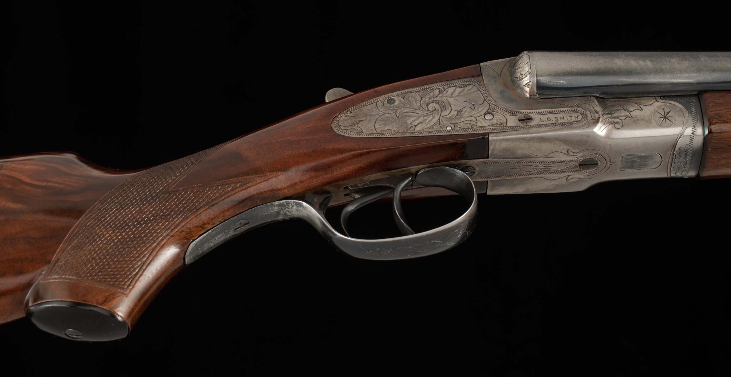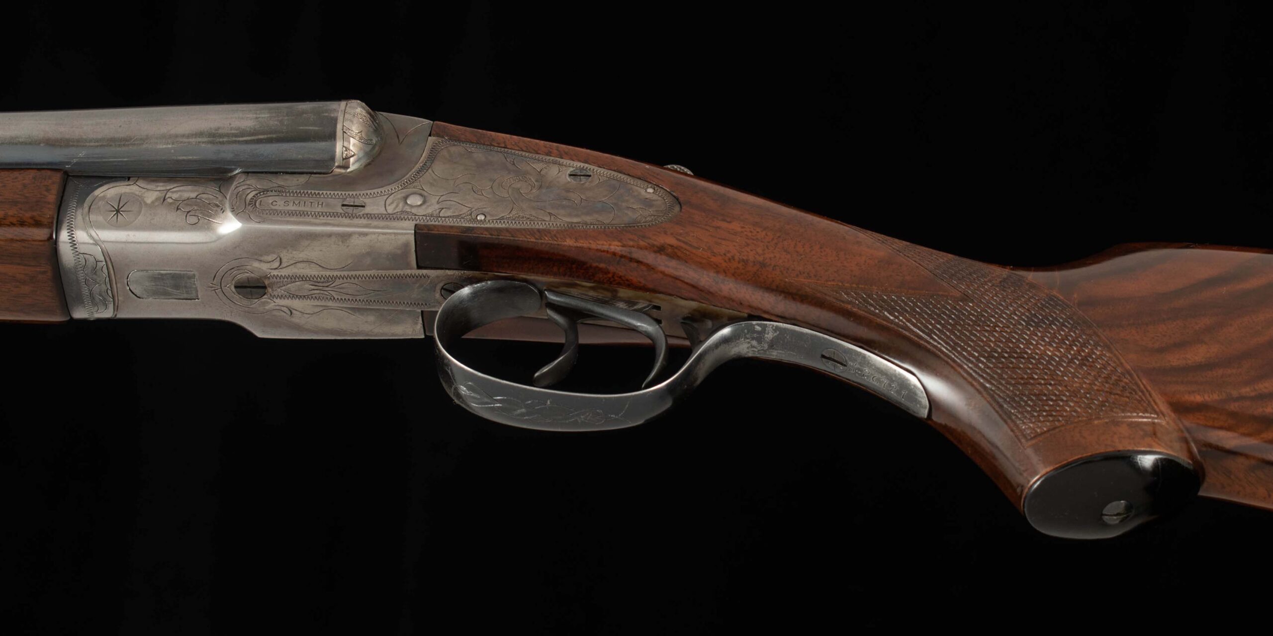 The Single Sighting Plane Rib was a feature available on L.C. Smith double barrels as a marketing effort to combat the growing demand for over and under and single barrel guns.  The shape of the single sighting plane rib, and it’s height relative to the barrels, essentially makes the barrels disappear; it’s ingenious and interesting.  This guns is ready for use, it has some wear on the original finish of the barrels, which have mirror bores.  The action is tight on hinge and locks up tight on face with the top lever landing just right of center.  The double triggers, extractors, and auto-safety all function as they should.  With fresh finish and refreshed checkering on the beautiful walnut stock, featuring pretty grain lines, eye-catching fiddleback, and a Silvers pad, this sharp Elsie is nice to look at as well.  The action has crisp engraving and 65% factory case color, faded in some areas, but vibrant in others.  This shotgun has been a steady companion to hunters since 1948 and is ready for many more years in the field.