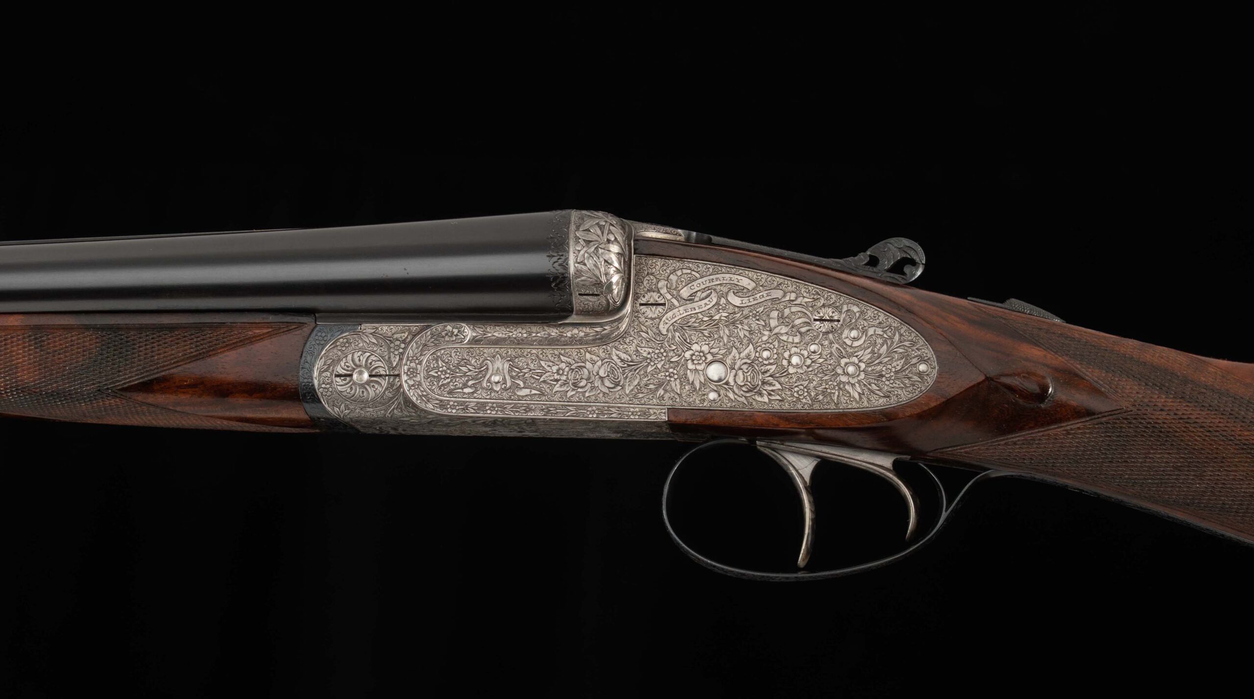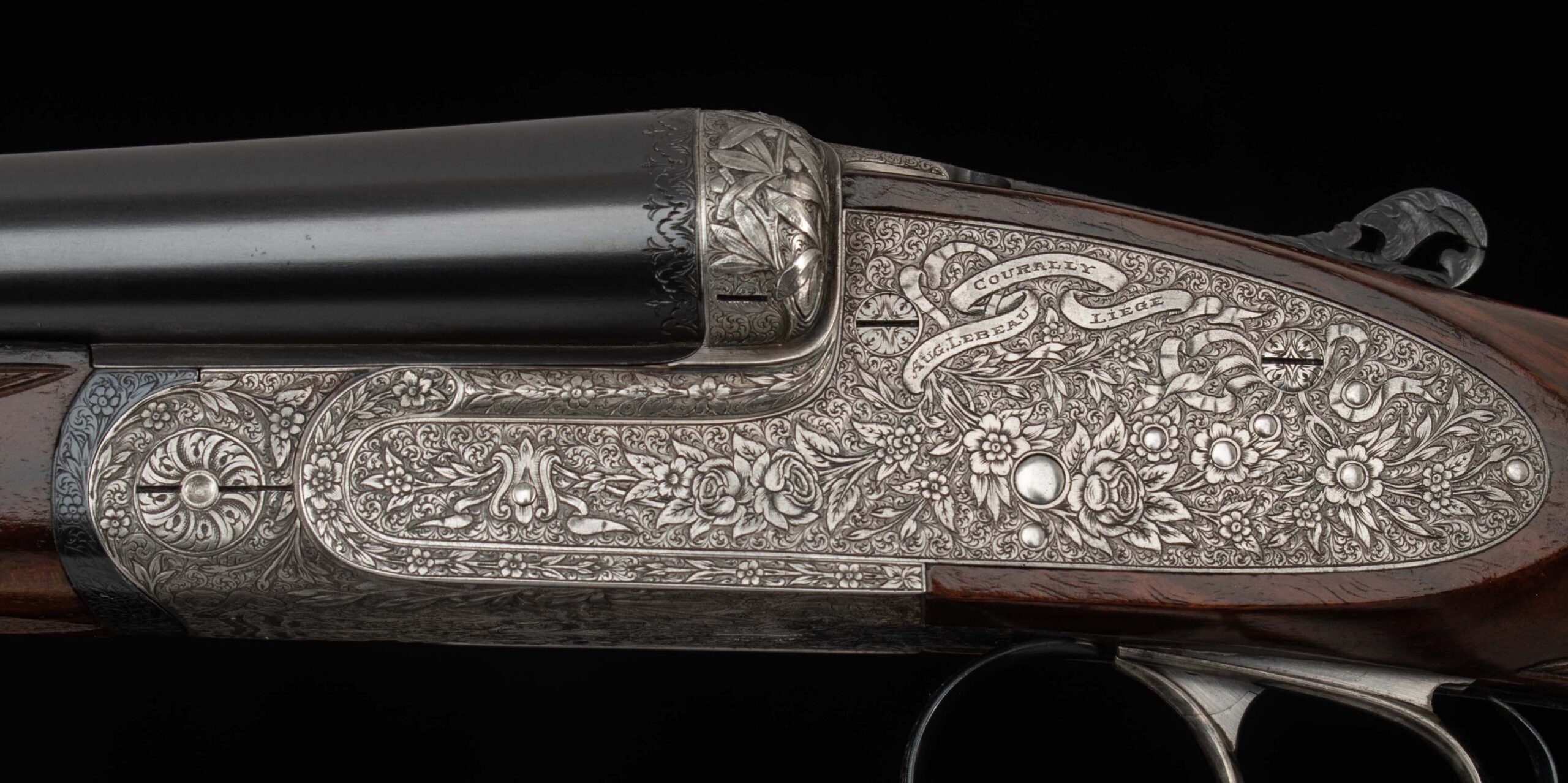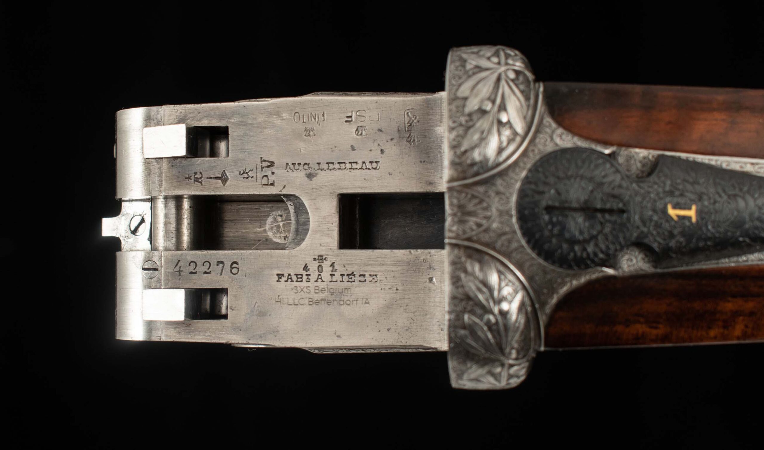 | General Specs: Lebeau-Courally, 1929, 20 Gauge, 5lbs. 14oz., Chokes XF/XF; M/F, LOP 14 5/8″, DAH 2 1/16″, DAC 1 1/4″ Serial Number: 42276 Made in 1929, for S. Corte in Italy, as the first gun in a pair; today this beauty stands alone, with an added barrel (made in Italy). The story of how and when a pair like this is split is curious to me. Was it damaged or sold along the way? Wherever it is, if it is still in the condition of this gun, it is a shame they were separated; but on the other hand, it makes owning this exquisite shotgun much easier, you still get two barrels without the cost of a second gun, so maybe it all works out! When you first approach this gun, your eye is immediately drawn to the coin finish and exquisite floral engraving. The closer you look, the better it gets. The details of the shape of the receiver, skeletonized top lever, deep relief engraving on the barrel fences and bottom of the frame add texture and interest. The engraver signed near the trigger guard, M. Hannay. The tear drops behind the locks, imperial pigeon in gold in the fore end, and double-bordered point checkering decorate the stunning walnut that really needed no help. The straight stock features a gorgeous piece of wood that features wavy, deep grain with areas of tight burl and fiddleback, finished in a simple checkered butt. The wood to metal fit is pristine. As much as this gun deserves to be the centerpiece in a collector’s gunroom, the combination of barrels and chokes, will tempt you to take this lovely gun out to the range or out in the field for some upland game hunting. Please review the detailed specifications and enjoy the stunning photos included below.