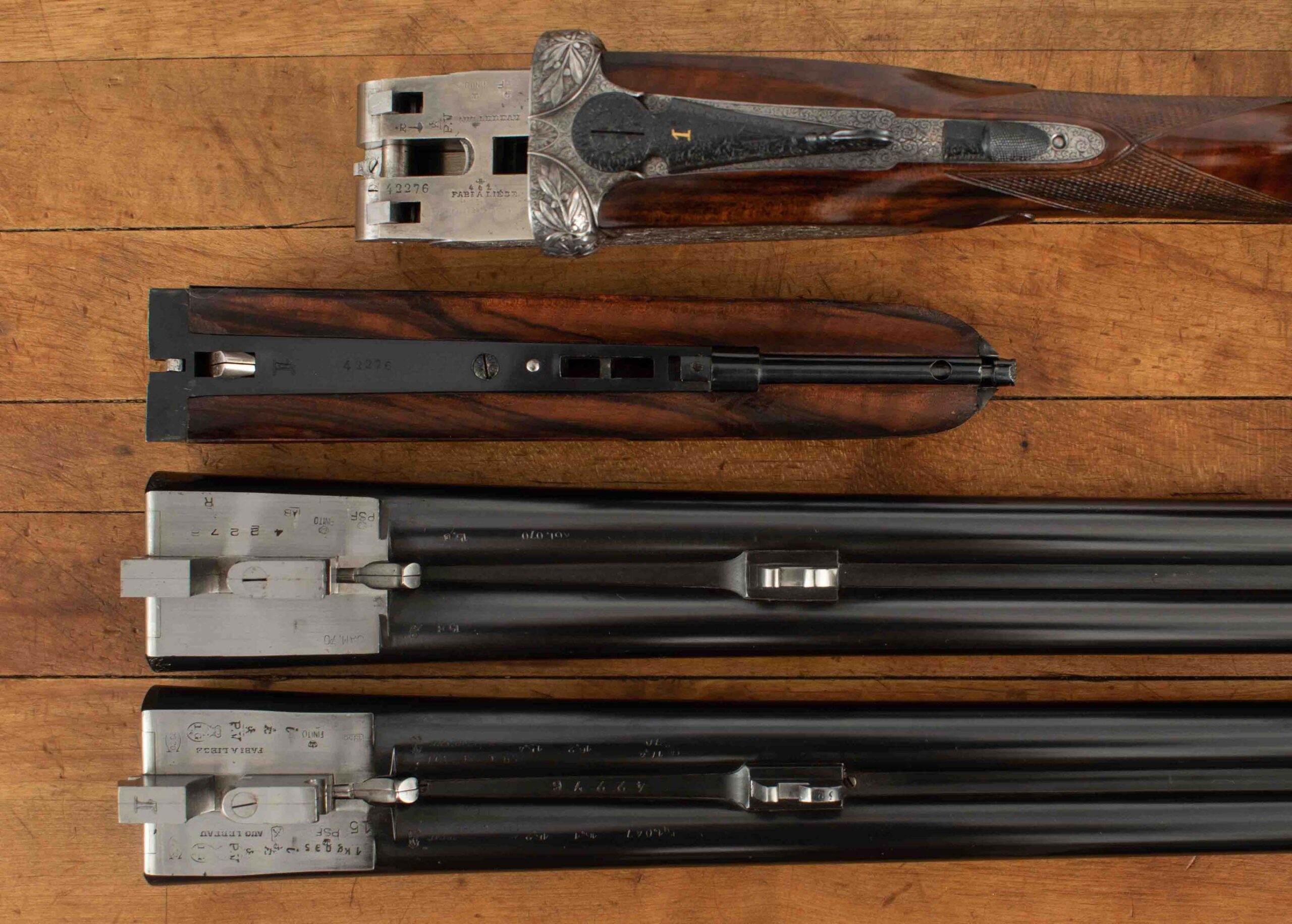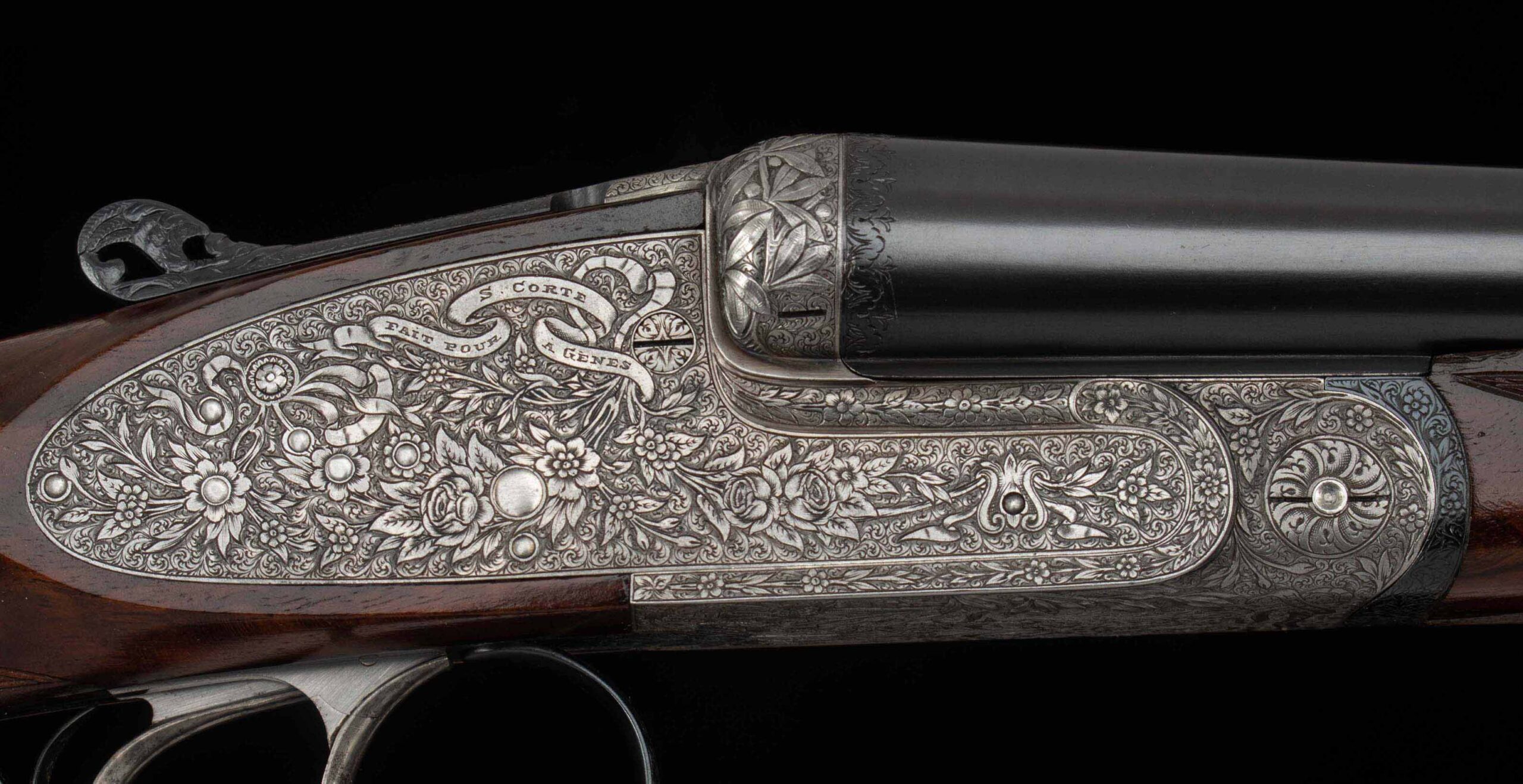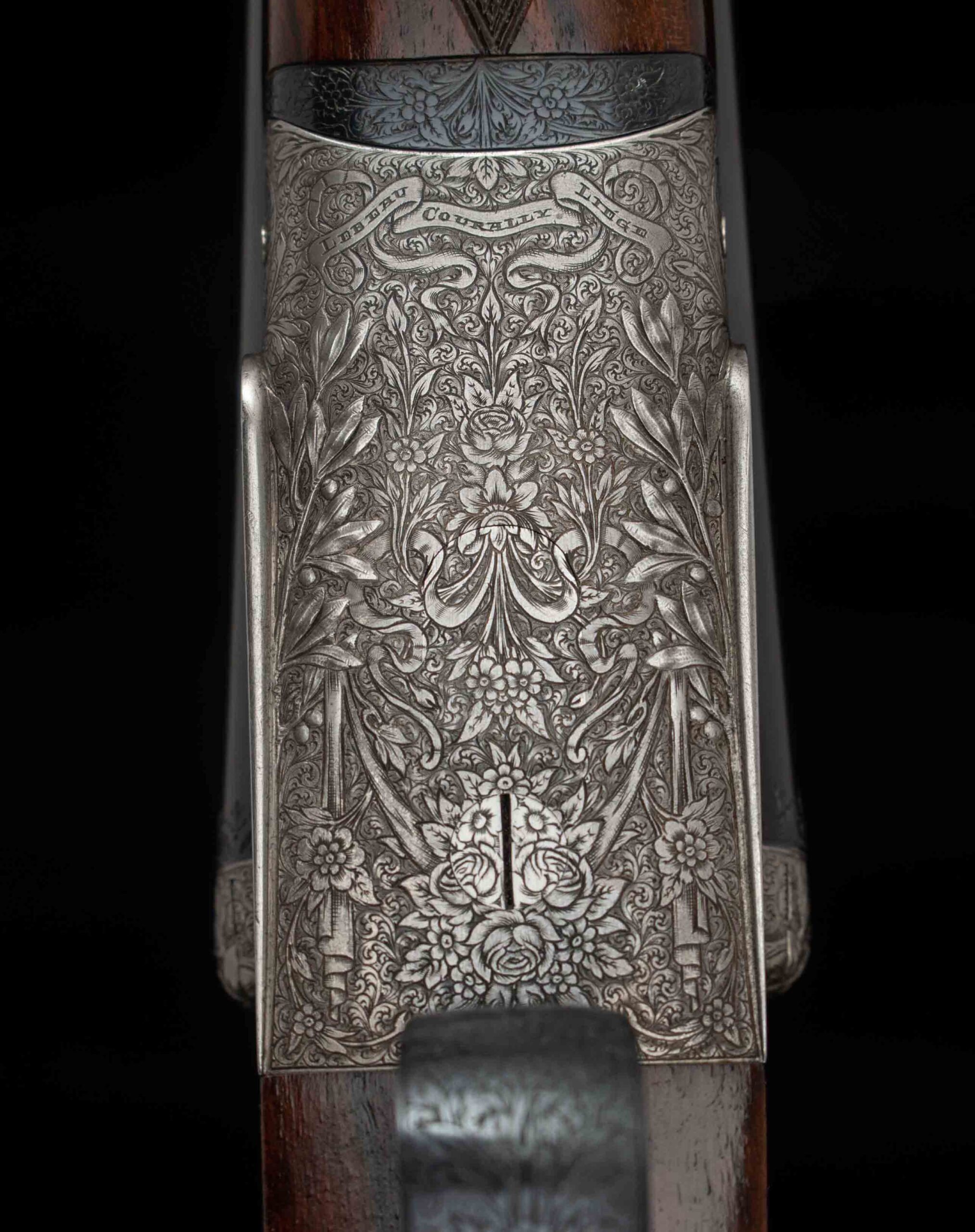 | General Specs: Lebeau-Courally, 1929, 20 Gauge, 5lbs. 14oz., Chokes XF/XF; M/F, LOP 14 5/8″, DAH 2 1/16″, DAC 1 1/4″ Serial Number: 42276 Made in 1929, for S. Corte in Italy, as the first gun in a pair; today this beauty stands alone, with an added barrel (made in Italy). The story of how and when a pair like this is split is curious to me. Was it damaged or sold along the way? Wherever it is, if it is still in the condition of this gun, it is a shame they were separated; but on the other hand, it makes owning this exquisite shotgun much easier, you still get two barrels without the cost of a second gun, so maybe it all works out! When you first approach this gun, your eye is immediately drawn to the coin finish and exquisite floral engraving. The closer you look, the better it gets. The details of the shape of the receiver, skeletonized top lever, deep relief engraving on the barrel fences and bottom of the frame add texture and interest. The engraver signed near the trigger guard, M. Hannay. The tear drops behind the locks, imperial pigeon in gold in the fore end, and double-bordered point checkering decorate the stunning walnut that really needed no help. The straight stock features a gorgeous piece of wood that features wavy, deep grain with areas of tight burl and fiddleback, finished in a simple checkered butt. The wood to metal fit is pristine. As much as this gun deserves to be the centerpiece in a collector’s gunroom, the combination of barrels and chokes, will tempt you to take this lovely gun out to the range or out in the field for some upland game hunting. Please review the detailed specifications and enjoy the stunning photos included below.