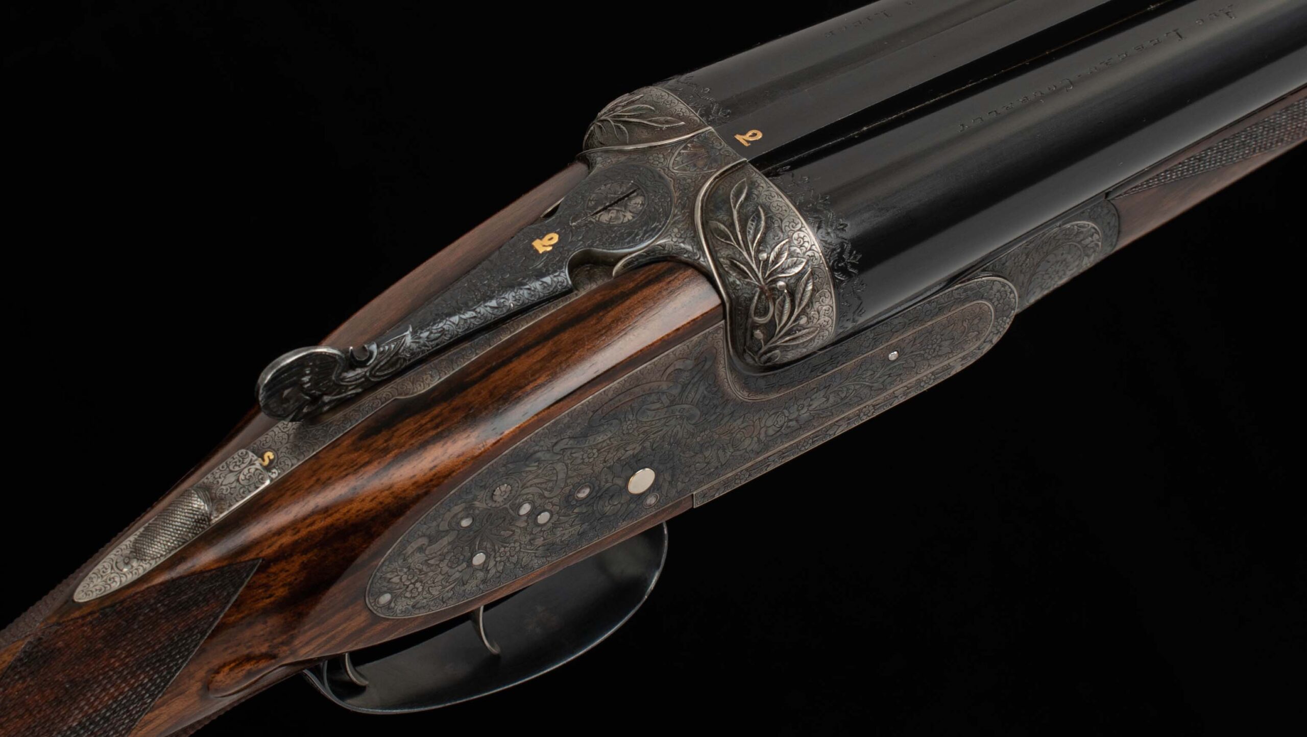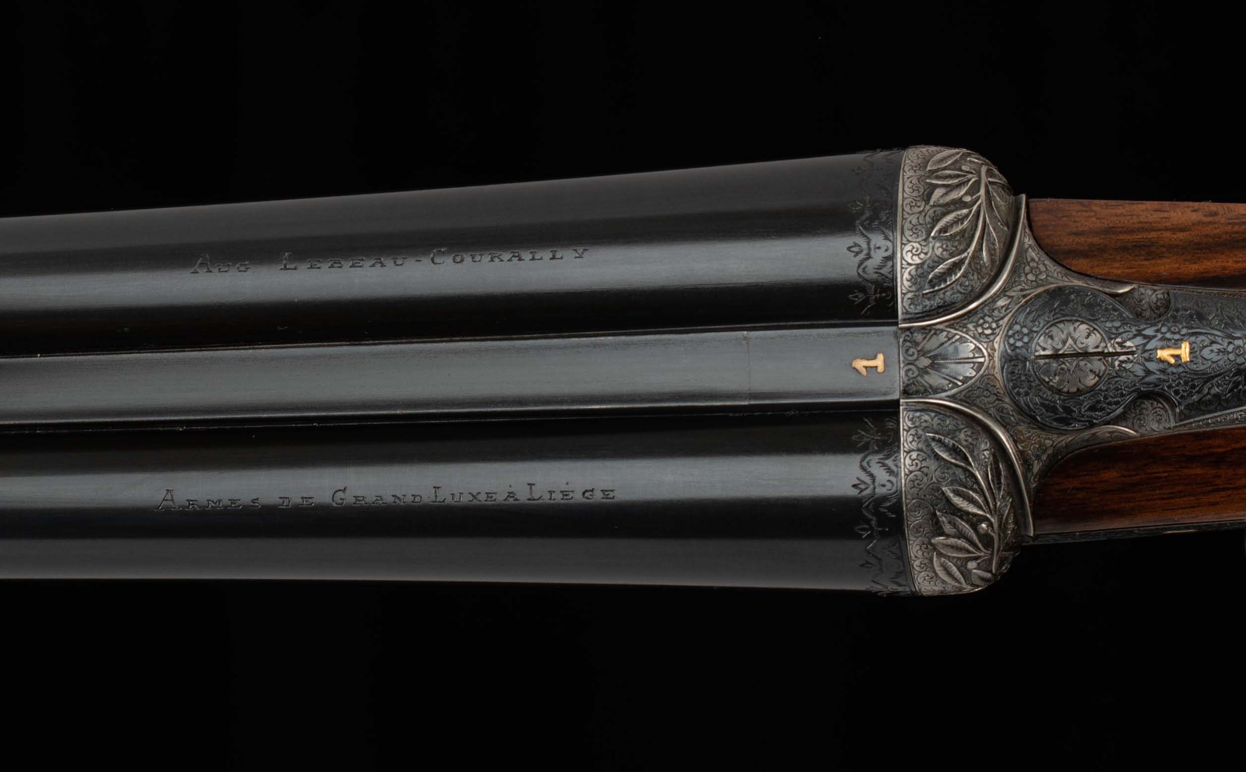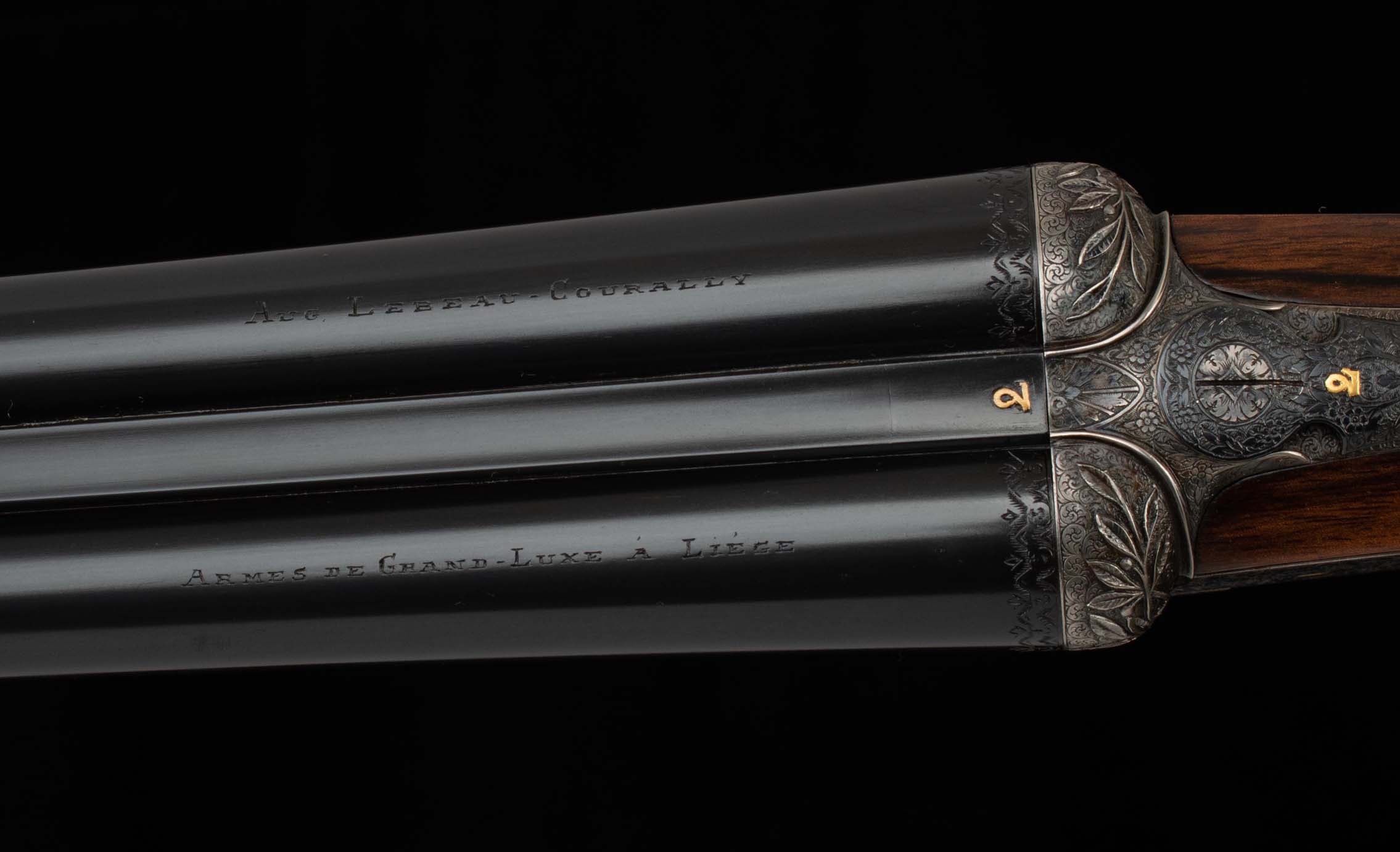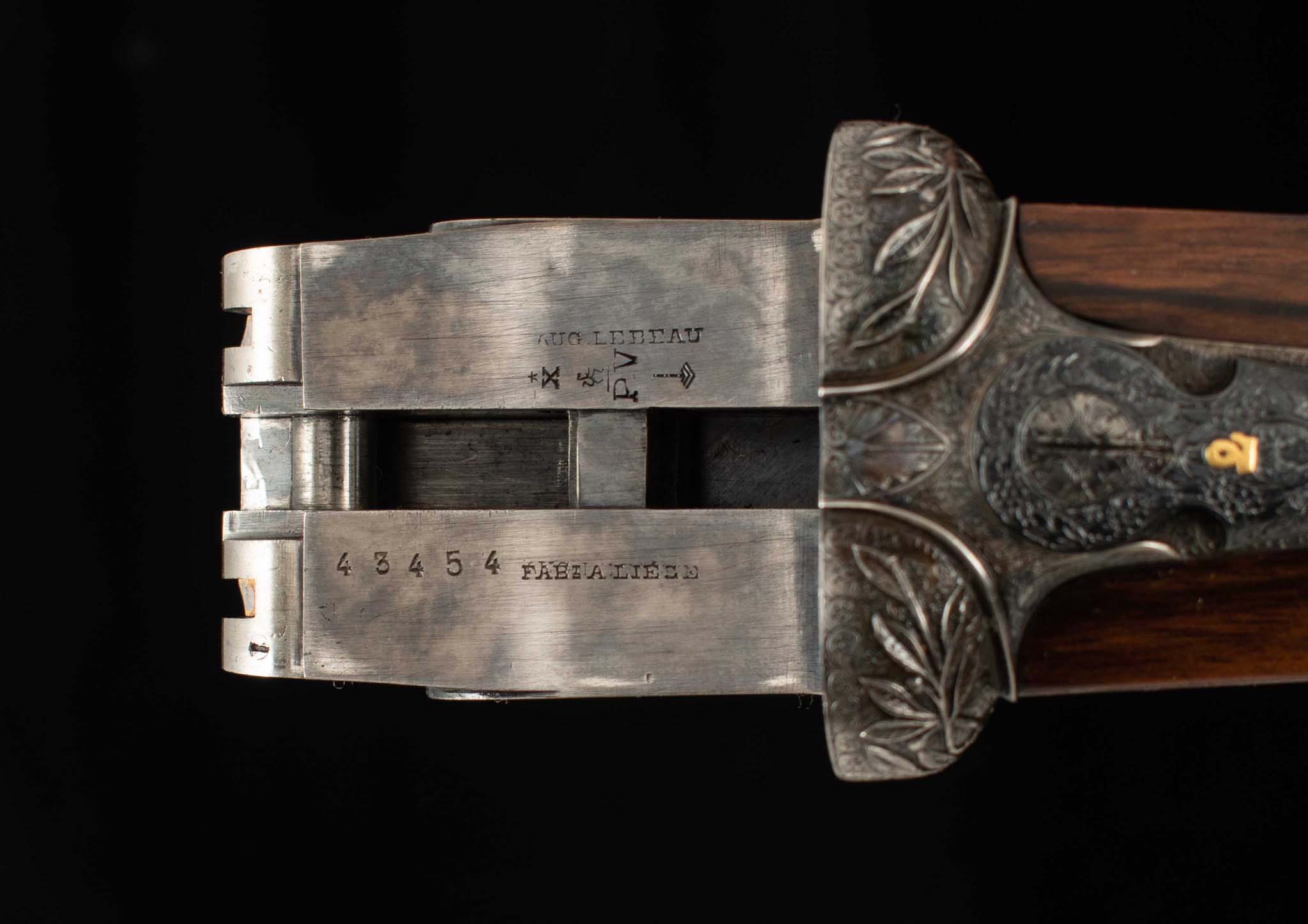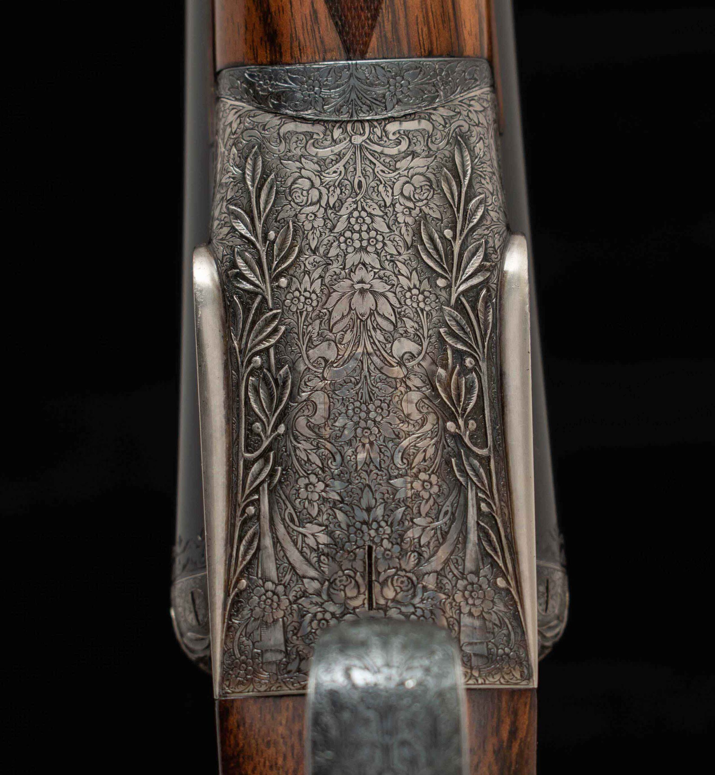 | General Specs: Lebeau Courally, 1960, 12 Gauge, 6lbs. 10oz., Chokes IM/F, LOP 14 3/8″, DAH 2 1/16″, DAC 1 1/2″ Serial Number: 43453,43454 Liège, Belgium was home to some of the world’s finest gunmakers, and still produces some of Europe’s best double shotguns. Lebeau Courally is and has been at the top of the list for the who’s who in Europe to order their bespoke shotguns. This matched pair was ordered for the House of S.C.A.M (Milanese Automotive Construction Society) with the initials G.B. engraved on the gold ovals on the belly of the stocks, was made in 1960. While the name suggests automotive, this manufacturer also produced many firearms during WWII. As happens with these fine firearms, they have changed hands over the years, and now the ovals on the belly of the stock read JD. Whoever has held these beautiful guns over the last 65 years, has given them the care they deserve. The barrels on both guns have factory blue that looks brand new, the bores are mirror, and the engraved borders and makers name at the breech end are crisp and clear. The gold inlay of 1 and 2, respectively are nicely done and present on the breech end of the rib as well as the skeletonized and highly engraved top lever of each gun. The breech fences have deep relief and scroll engraving with a raised border following from the rib down to the frame and around the sidelock, that is sharp and creates a visual flow that is unique and very well done. The frame and sidelocks have a combination of floral and scroll engraving, accentuated by a single gold pin and ribbon showing the maker’s name. The bottom of the receiver exemplifies the level of craftsmanship in the sculpted frame and the precision fit of the trigger plate, again, covered in floral and scroll, but accentuated here with deep relief branches and leaves near those sculpted edges. The trigger guard hosts a central bouquet, surrounded by intricately detailed floral engraving. The screws or in superb condition, with each being engraved perfectly to its surroundings. The Anson forend latch is engraved, and has the matching 1 or 2 gold inlay. Incorporated into the borderless, point checkering pattern is a diamond of negative space that hosts a gold emblem marked “Imperial Extra Luxe” with a pigeon and crown design surrounding. Each gun hosts highly figured walnut with borderless point pattern checkering that follows around the daintiest wrist I have ever held on a 12 gauge double gun. The English stock terminates in a leather covered pad. Of course, with such a fine pair of guns a two gun Motor Case is included. Every aspect of craftsmanship and beauty on this matched pair draw attention where it is due, and yet there is something subtle about them as well, not too flashy; they are rich and warm. We provide the most comprehensive photography and specifications in the marketplace to guide you in making an informed choice. Just remember, nowhere is it more apparent than in the gun world…you get what you pay for! Thanks for looking!