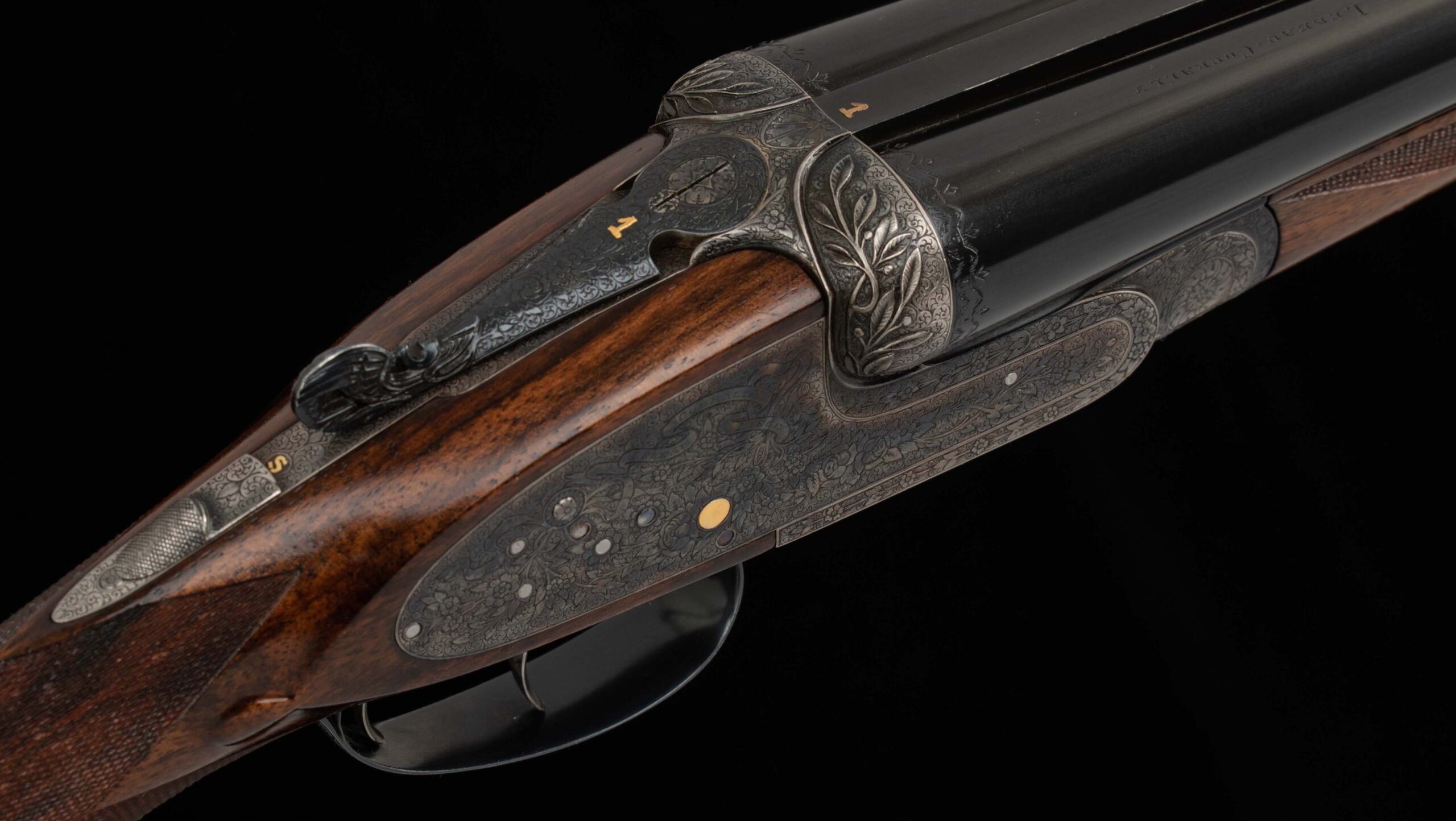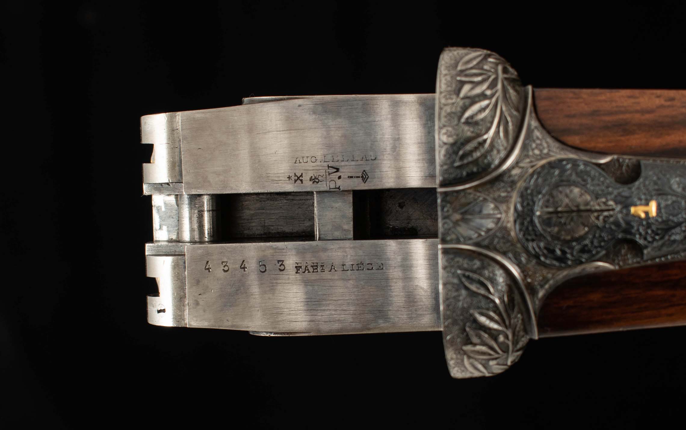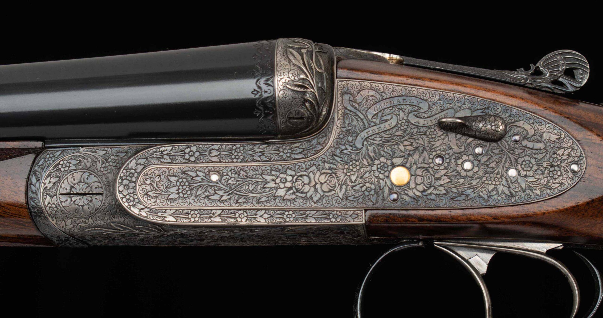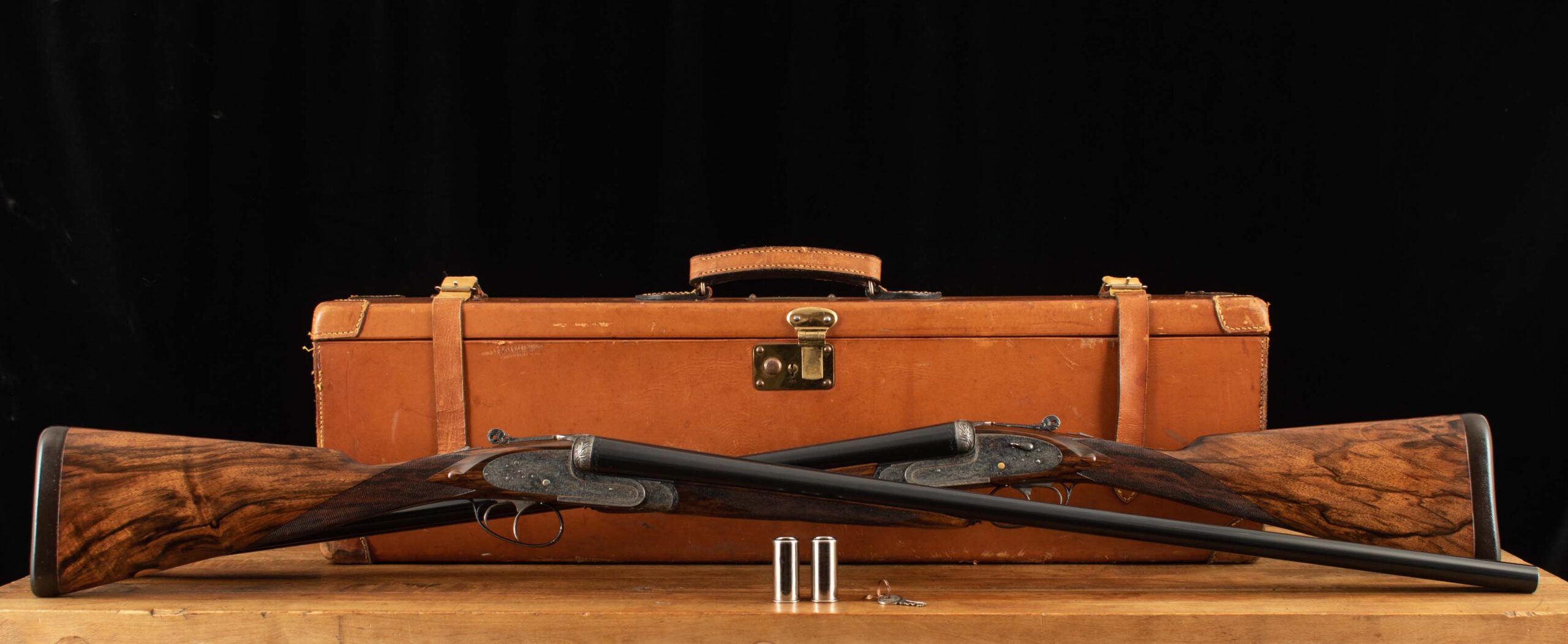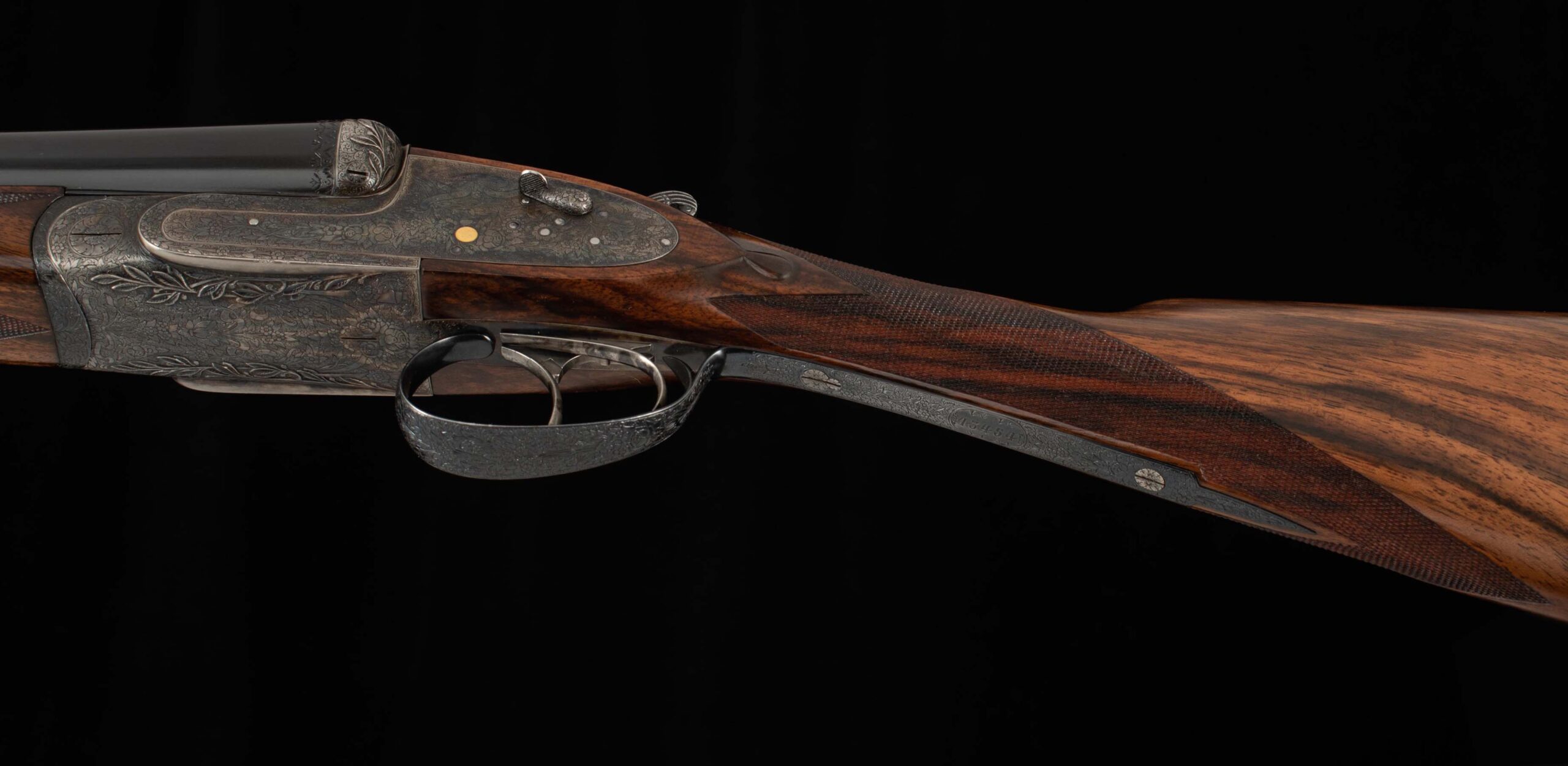 | General Specs: Lebeau Courally, 1960, 12 Gauge, 6lbs. 10oz., Chokes IM/F, LOP 14 3/8″, DAH 2 1/16″, DAC 1 1/2″ Serial Number: 43453,43454 Liège, Belgium was home to some of the world’s finest gunmakers, and still produces some of Europe’s best double shotguns. Lebeau Courally is and has been at the top of the list for the who’s who in Europe to order their bespoke shotguns. This matched pair was ordered for the House of S.C.A.M (Milanese Automotive Construction Society) with the initials G.B. engraved on the gold ovals on the belly of the stocks, was made in 1960. While the name suggests automotive, this manufacturer also produced many firearms during WWII. As happens with these fine firearms, they have changed hands over the years, and now the ovals on the belly of the stock read JD. Whoever has held these beautiful guns over the last 65 years, has given them the care they deserve. The barrels on both guns have factory blue that looks brand new, the bores are mirror, and the engraved borders and makers name at the breech end are crisp and clear. The gold inlay of 1 and 2, respectively are nicely done and present on the breech end of the rib as well as the skeletonized and highly engraved top lever of each gun. The breech fences have deep relief and scroll engraving with a raised border following from the rib down to the frame and around the sidelock, that is sharp and creates a visual flow that is unique and very well done. The frame and sidelocks have a combination of floral and scroll engraving, accentuated by a single gold pin and ribbon showing the maker’s name. The bottom of the receiver exemplifies the level of craftsmanship in the sculpted frame and the precision fit of the trigger plate, again, covered in floral and scroll, but accentuated here with deep relief branches and leaves near those sculpted edges. The trigger guard hosts a central bouquet, surrounded by intricately detailed floral engraving. The screws or in superb condition, with each being engraved perfectly to its surroundings. The Anson forend latch is engraved, and has the matching 1 or 2 gold inlay. Incorporated into the borderless, point checkering pattern is a diamond of negative space that hosts a gold emblem marked “Imperial Extra Luxe” with a pigeon and crown design surrounding. Each gun hosts highly figured walnut with borderless point pattern checkering that follows around the daintiest wrist I have ever held on a 12 gauge double gun. The English stock terminates in a leather covered pad. Of course, with such a fine pair of guns a two gun Motor Case is included. Every aspect of craftsmanship and beauty on this matched pair draw attention where it is due, and yet there is something subtle about them as well, not too flashy; they are rich and warm. We provide the most comprehensive photography and specifications in the marketplace to guide you in making an informed choice. Just remember, nowhere is it more apparent than in the gun world…you get what you pay for! Thanks for looking!