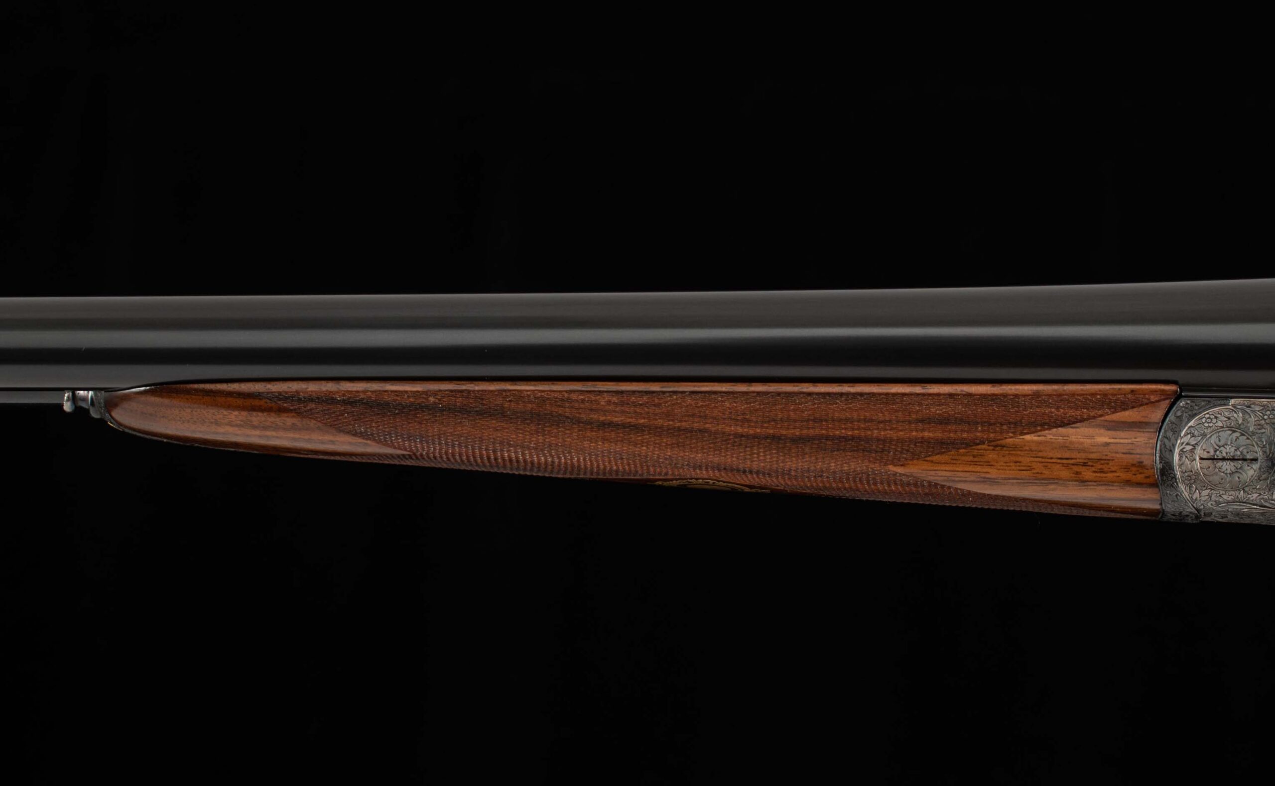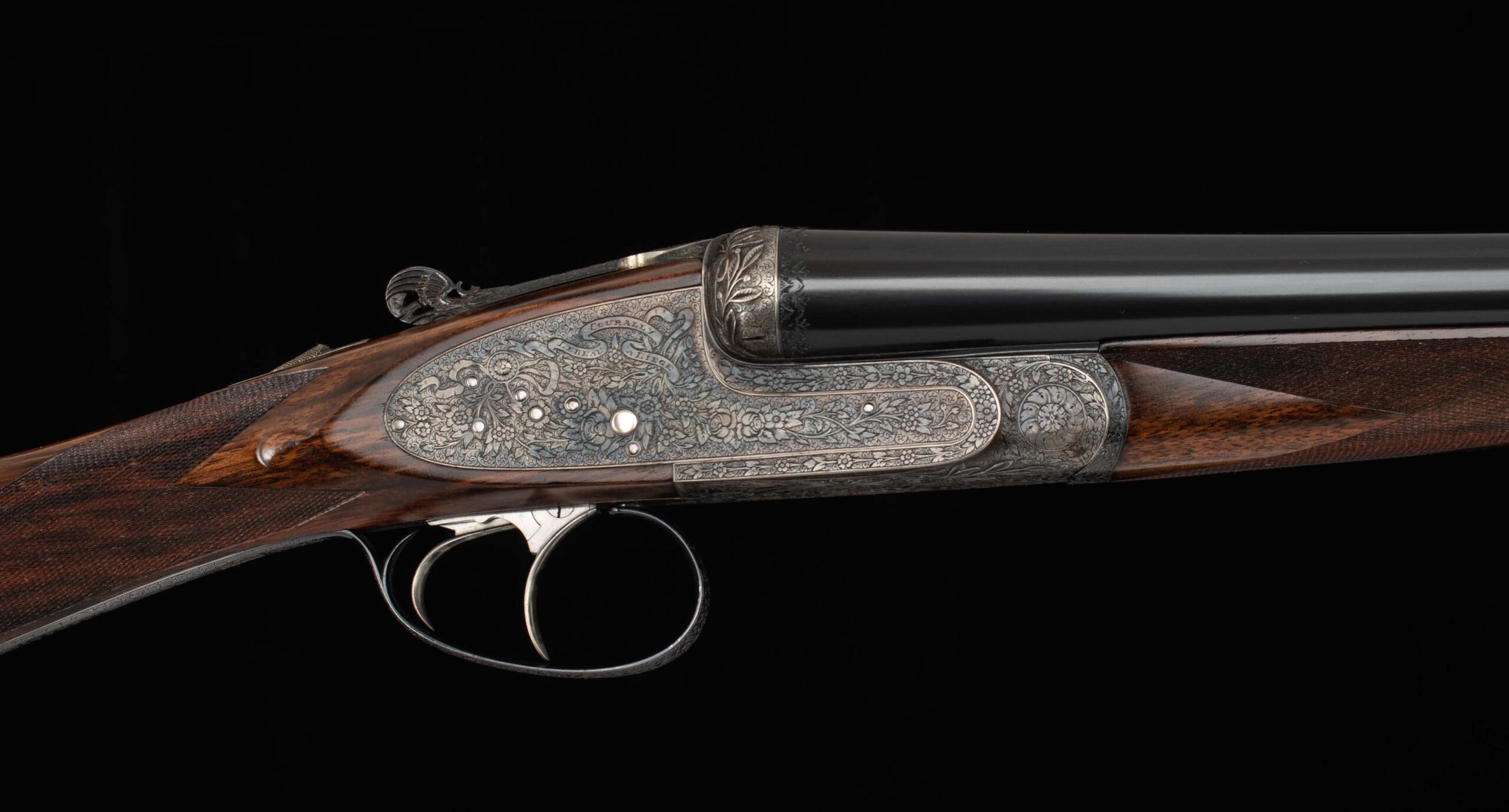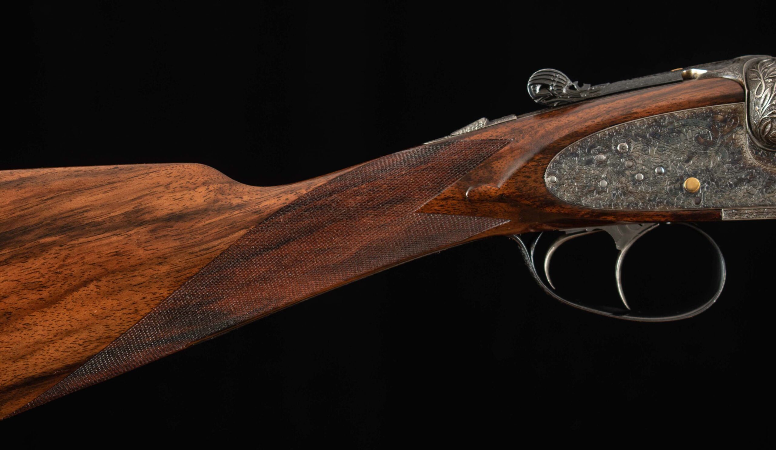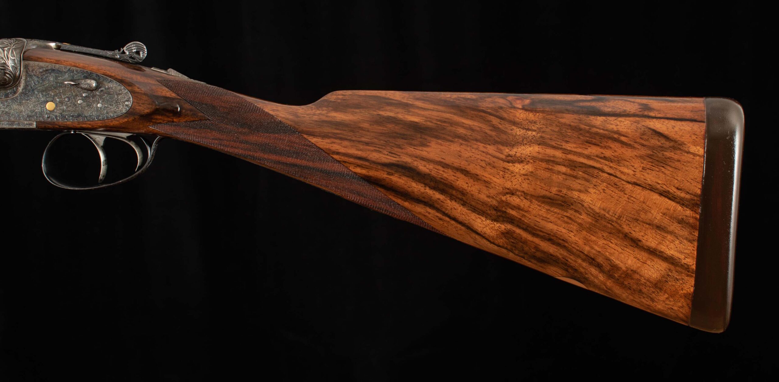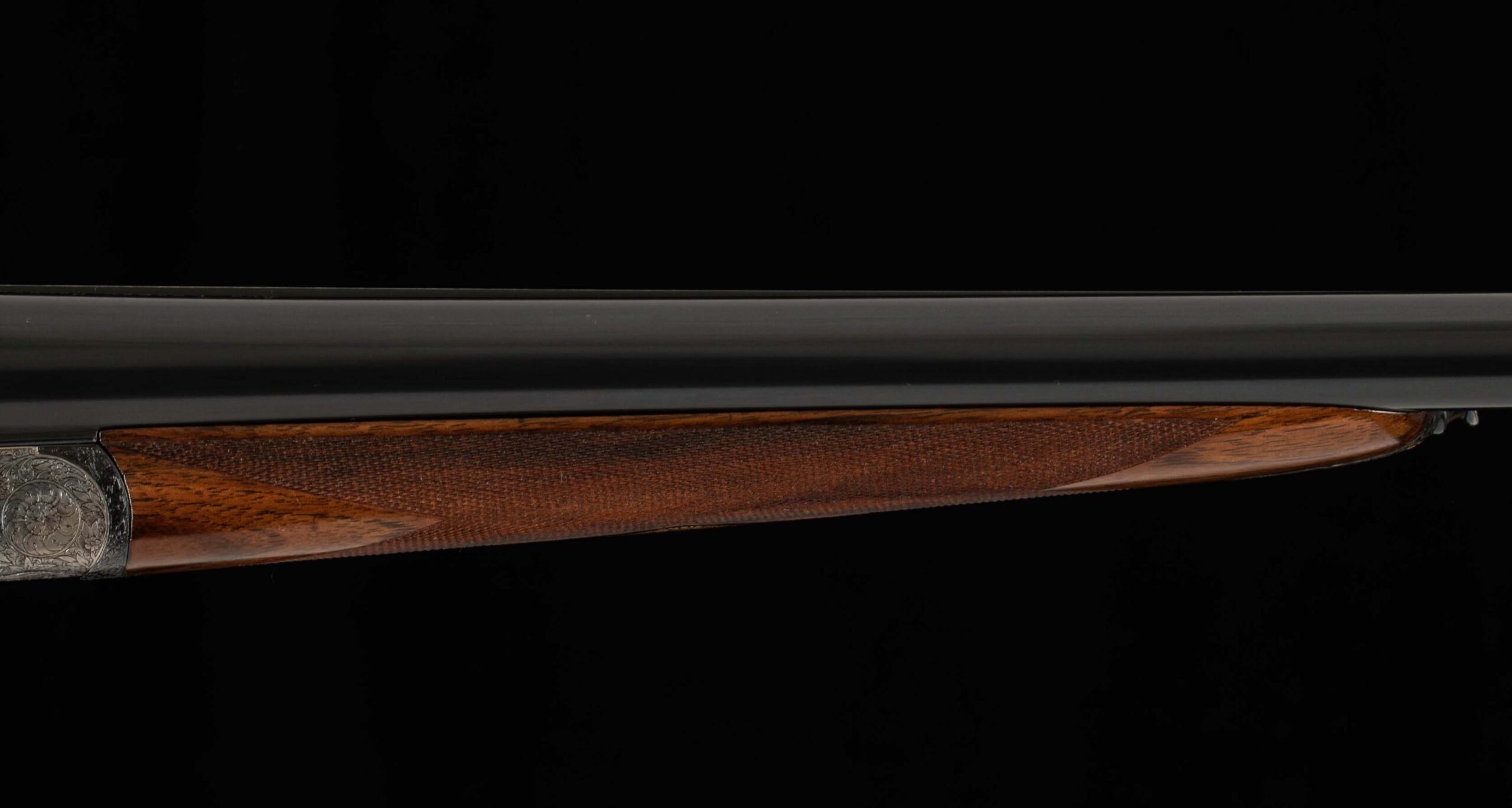 | General Specs: Lebeau Courally, 1960, 12 Gauge, 6lbs. 10oz., Chokes IM/F, LOP 14 3/8″, DAH 2 1/16″, DAC 1 1/2″ Serial Number: 43453,43454 Liège, Belgium was home to some of the world’s finest gunmakers, and still produces some of Europe’s best double shotguns. Lebeau Courally is and has been at the top of the list for the who’s who in Europe to order their bespoke shotguns. This matched pair was ordered for the House of S.C.A.M (Milanese Automotive Construction Society) with the initials G.B. engraved on the gold ovals on the belly of the stocks, was made in 1960. While the name suggests automotive, this manufacturer also produced many firearms during WWII. As happens with these fine firearms, they have changed hands over the years, and now the ovals on the belly of the stock read JD. Whoever has held these beautiful guns over the last 65 years, has given them the care they deserve. The barrels on both guns have factory blue that looks brand new, the bores are mirror, and the engraved borders and makers name at the breech end are crisp and clear. The gold inlay of 1 and 2, respectively are nicely done and present on the breech end of the rib as well as the skeletonized and highly engraved top lever of each gun. The breech fences have deep relief and scroll engraving with a raised border following from the rib down to the frame and around the sidelock, that is sharp and creates a visual flow that is unique and very well done. The frame and sidelocks have a combination of floral and scroll engraving, accentuated by a single gold pin and ribbon showing the maker’s name. The bottom of the receiver exemplifies the level of craftsmanship in the sculpted frame and the precision fit of the trigger plate, again, covered in floral and scroll, but accentuated here with deep relief branches and leaves near those sculpted edges. The trigger guard hosts a central bouquet, surrounded by intricately detailed floral engraving. The screws or in superb condition, with each being engraved perfectly to its surroundings. The Anson forend latch is engraved, and has the matching 1 or 2 gold inlay. Incorporated into the borderless, point checkering pattern is a diamond of negative space that hosts a gold emblem marked “Imperial Extra Luxe” with a pigeon and crown design surrounding. Each gun hosts highly figured walnut with borderless point pattern checkering that follows around the daintiest wrist I have ever held on a 12 gauge double gun. The English stock terminates in a leather covered pad. Of course, with such a fine pair of guns a two gun Motor Case is included. Every aspect of craftsmanship and beauty on this matched pair draw attention where it is due, and yet there is something subtle about them as well, not too flashy; they are rich and warm. We provide the most comprehensive photography and specifications in the marketplace to guide you in making an informed choice. Just remember, nowhere is it more apparent than in the gun world…you get what you pay for! Thanks for looking!