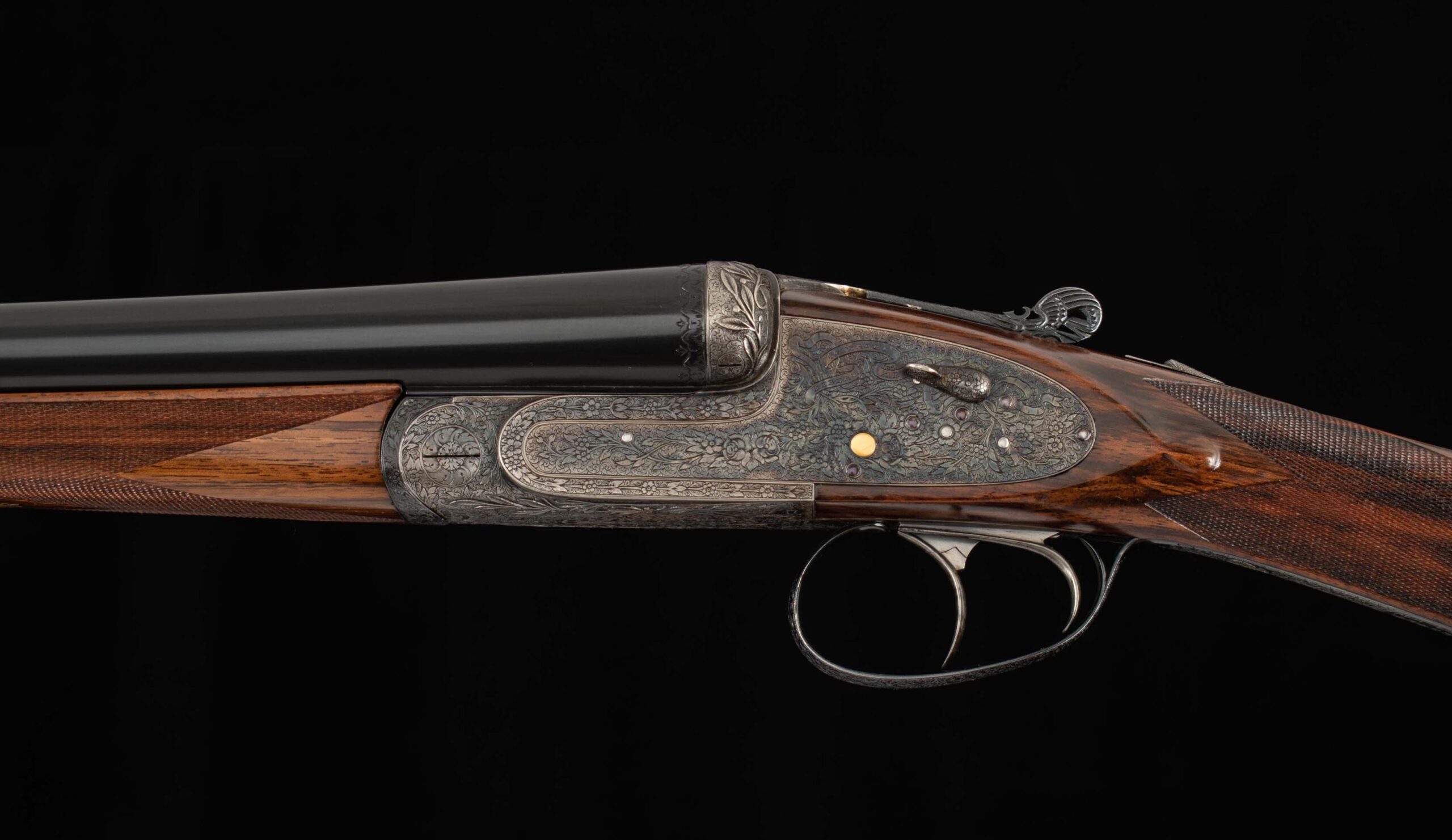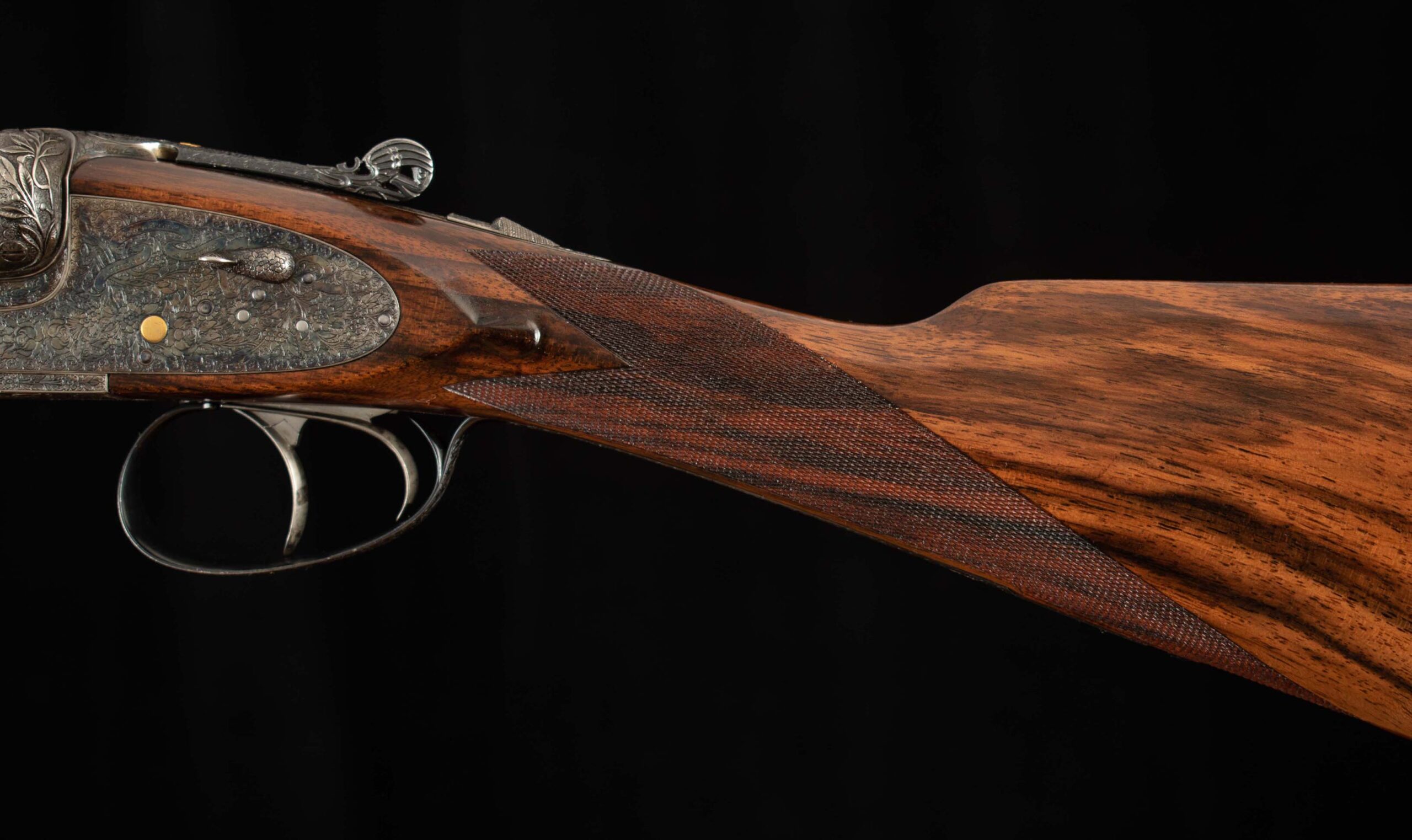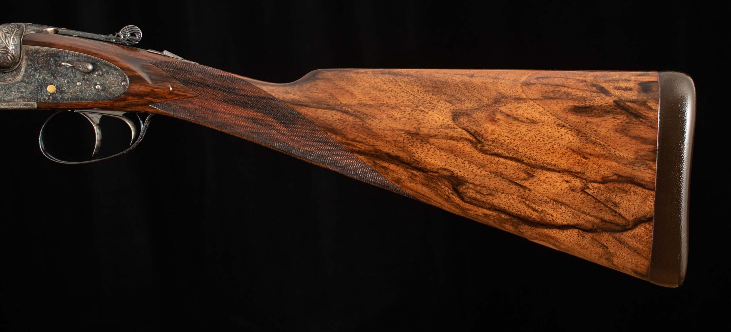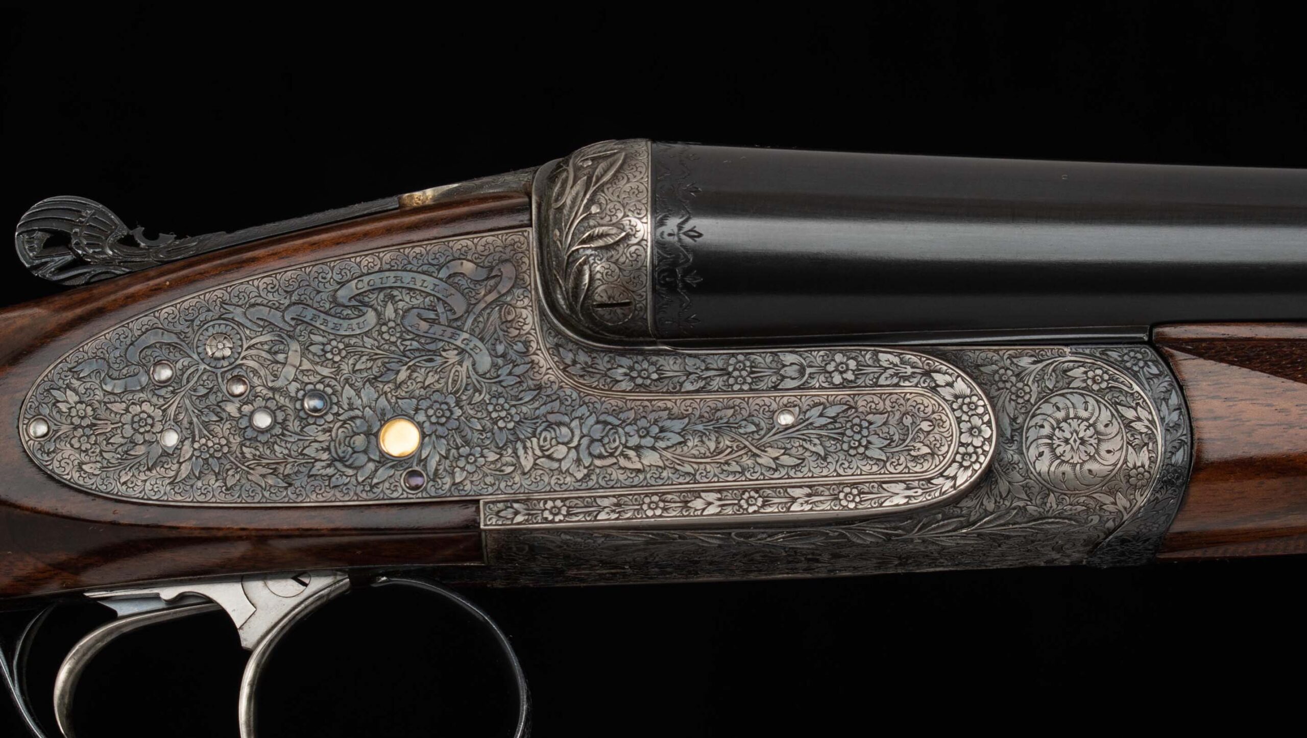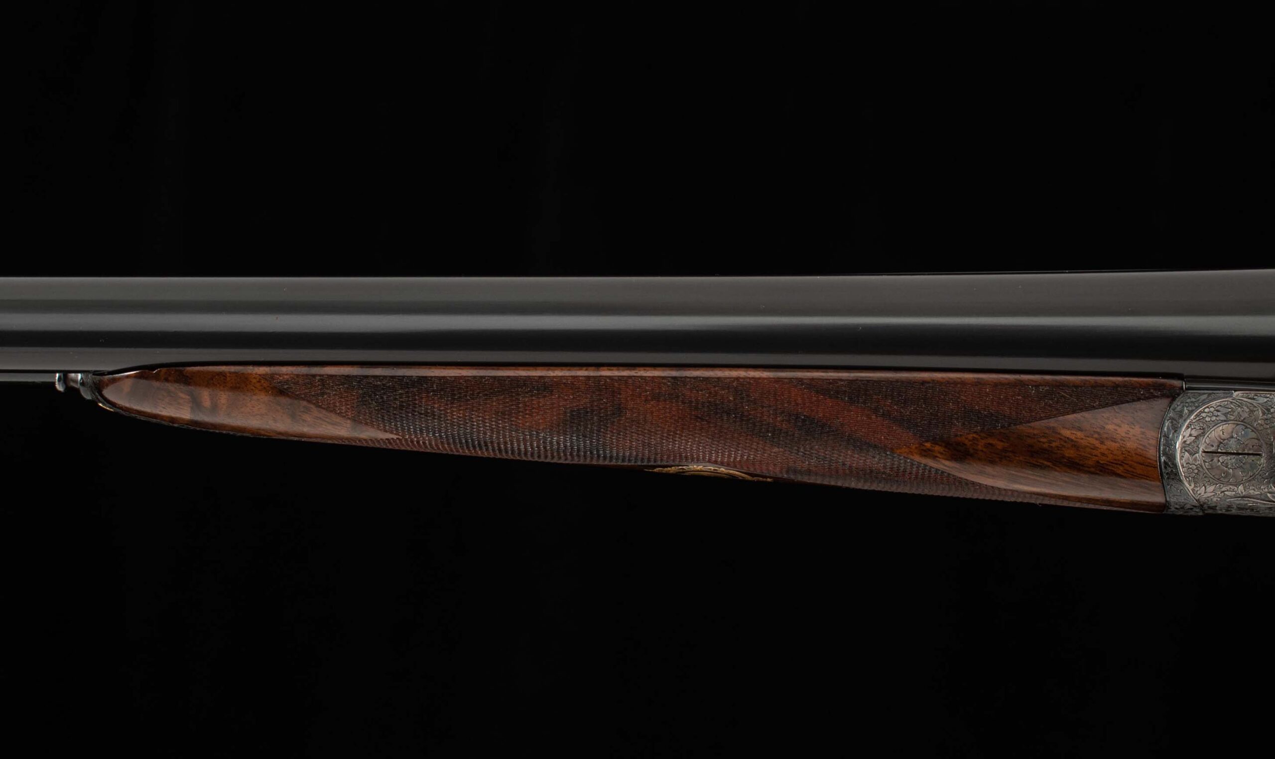 | General Specs: Lebeau Courally, 1960, 12 Gauge, 6lbs. 10oz., Chokes IM/F, LOP 14 3/8″, DAH 2 1/16″, DAC 1 1/2″ Serial Number: 43453,43454 Liège, Belgium was home to some of the world’s finest gunmakers, and still produces some of Europe’s best double shotguns. Lebeau Courally is and has been at the top of the list for the who’s who in Europe to order their bespoke shotguns. This matched pair was ordered for the House of S.C.A.M (Milanese Automotive Construction Society) with the initials G.B. engraved on the gold ovals on the belly of the stocks, was made in 1960. While the name suggests automotive, this manufacturer also produced many firearms during WWII. As happens with these fine firearms, they have changed hands over the years, and now the ovals on the belly of the stock read JD. Whoever has held these beautiful guns over the last 65 years, has given them the care they deserve. The barrels on both guns have factory blue that looks brand new, the bores are mirror, and the engraved borders and makers name at the breech end are crisp and clear. The gold inlay of 1 and 2, respectively are nicely done and present on the breech end of the rib as well as the skeletonized and highly engraved top lever of each gun. The breech fences have deep relief and scroll engraving with a raised border following from the rib down to the frame and around the sidelock, that is sharp and creates a visual flow that is unique and very well done. The frame and sidelocks have a combination of floral and scroll engraving, accentuated by a single gold pin and ribbon showing the maker’s name. The bottom of the receiver exemplifies the level of craftsmanship in the sculpted frame and the precision fit of the trigger plate, again, covered in floral and scroll, but accentuated here with deep relief branches and leaves near those sculpted edges. The trigger guard hosts a central bouquet, surrounded by intricately detailed floral engraving. The screws or in superb condition, with each being engraved perfectly to its surroundings. The Anson forend latch is engraved, and has the matching 1 or 2 gold inlay. Incorporated into the borderless, point checkering pattern is a diamond of negative space that hosts a gold emblem marked “Imperial Extra Luxe” with a pigeon and crown design surrounding. Each gun hosts highly figured walnut with borderless point pattern checkering that follows around the daintiest wrist I have ever held on a 12 gauge double gun. The English stock terminates in a leather covered pad. Of course, with such a fine pair of guns a two gun Motor Case is included. Every aspect of craftsmanship and beauty on this matched pair draw attention where it is due, and yet there is something subtle about them as well, not too flashy; they are rich and warm. We provide the most comprehensive photography and specifications in the marketplace to guide you in making an informed choice. Just remember, nowhere is it more apparent than in the gun world…you get what you pay for! Thanks for looking!