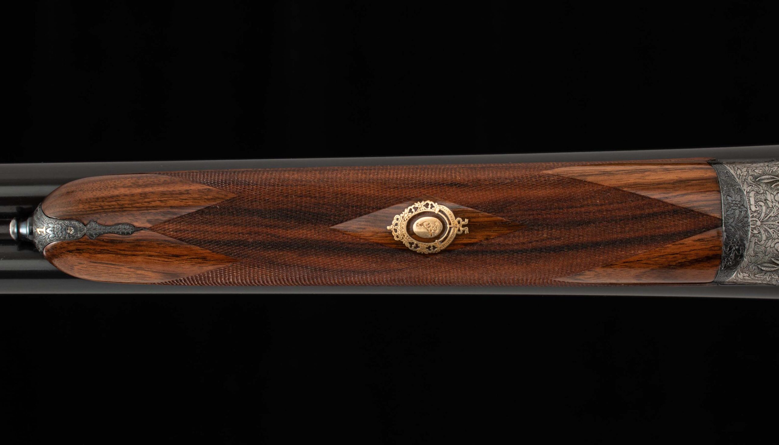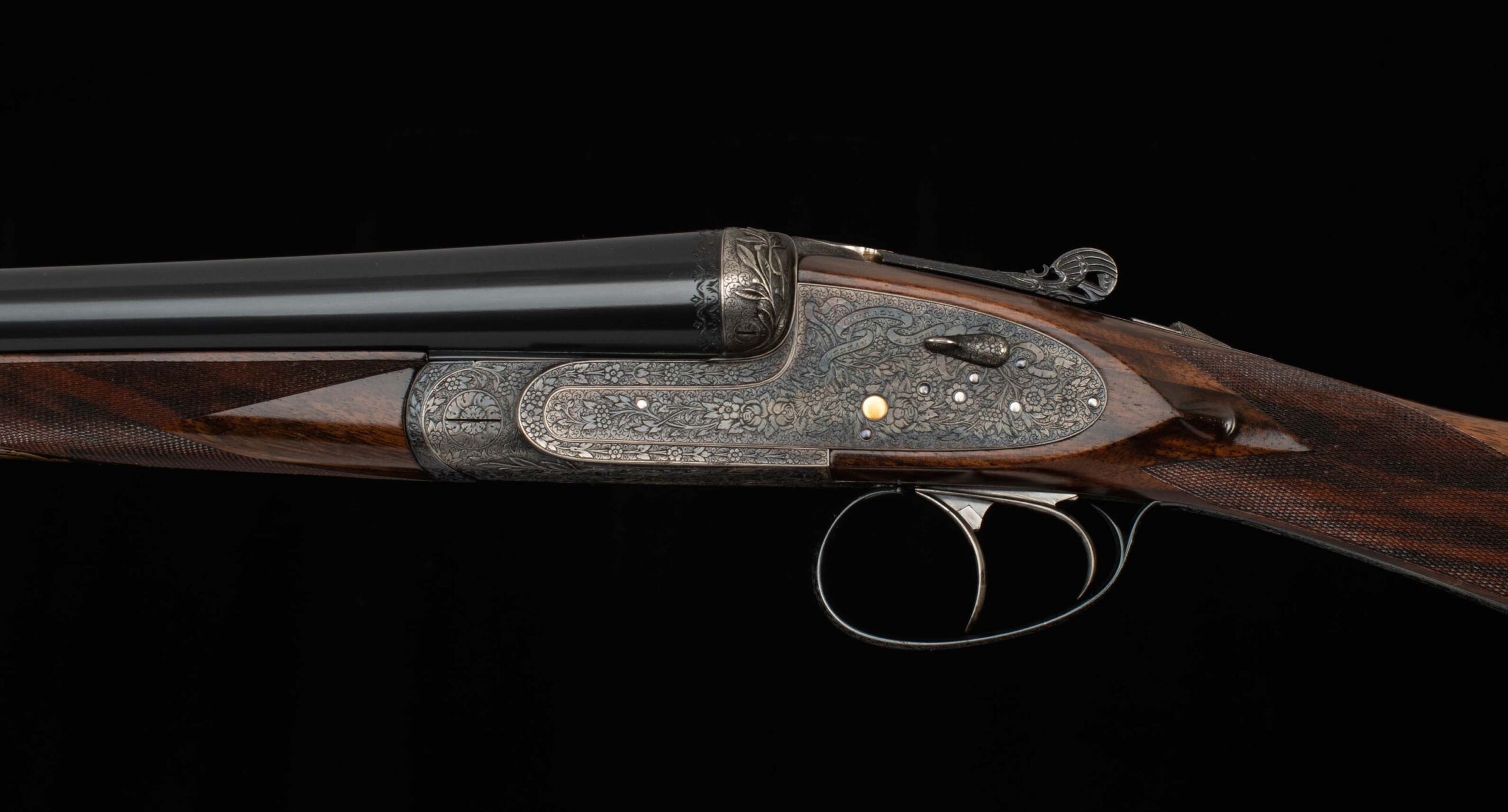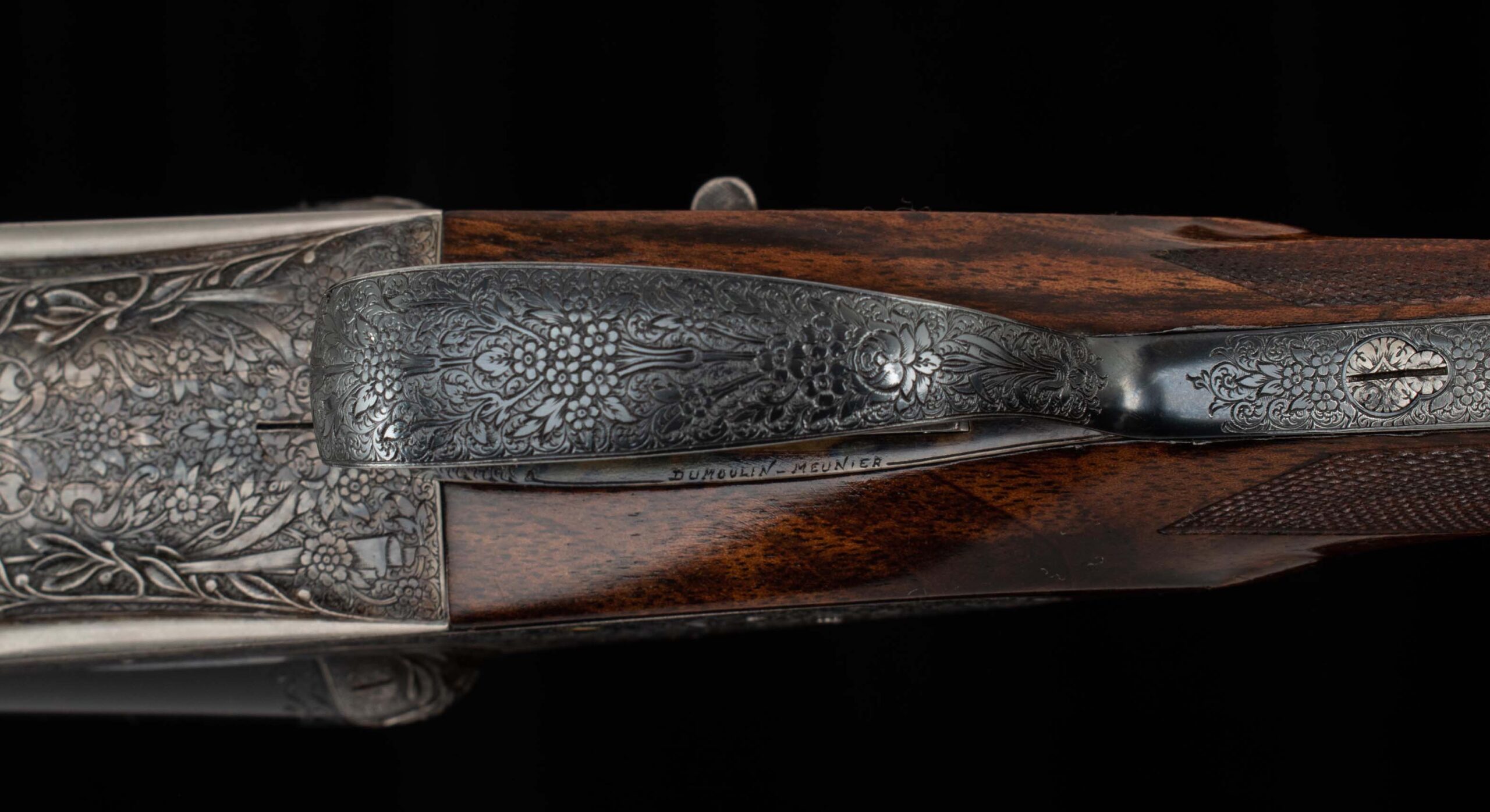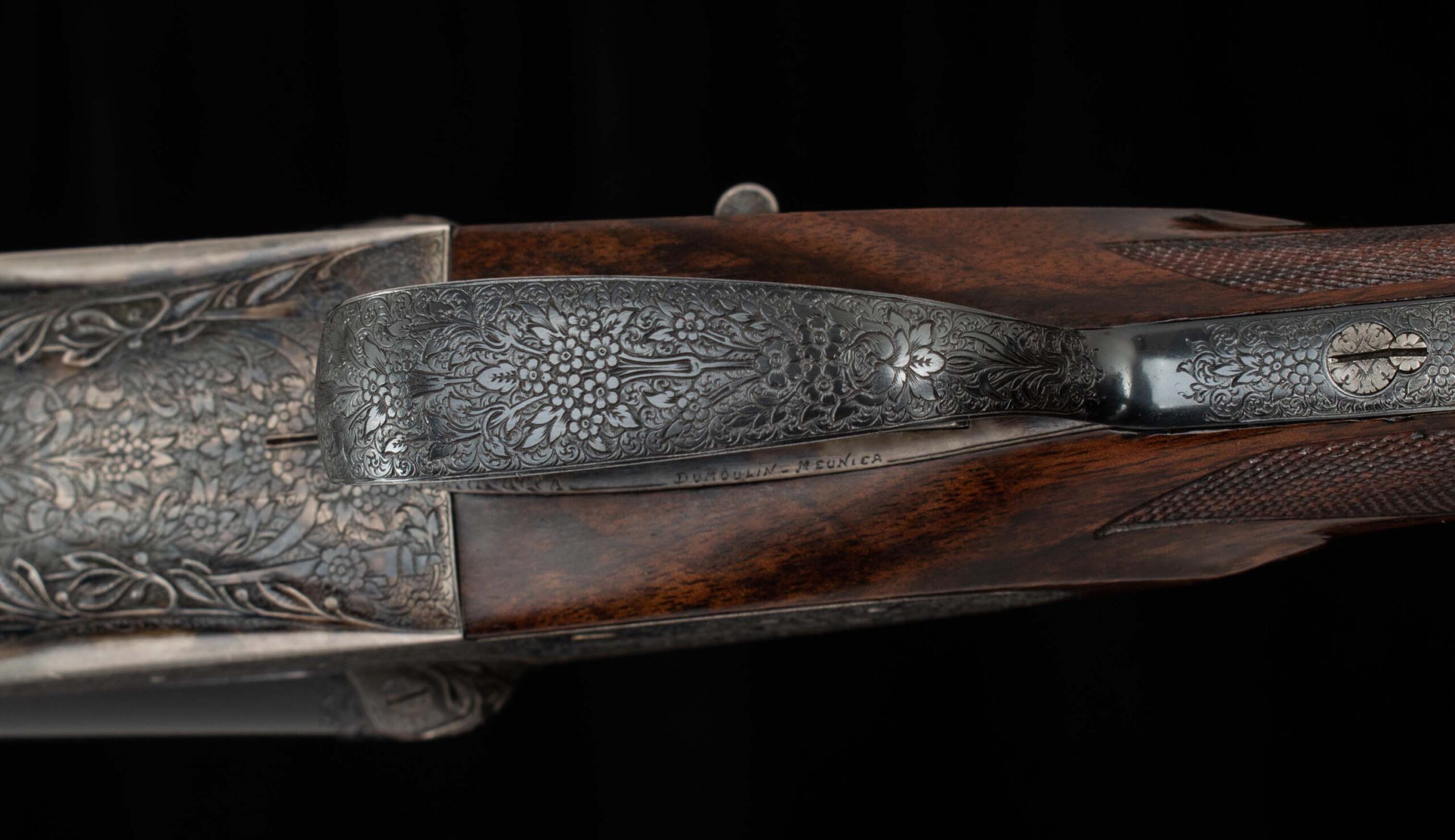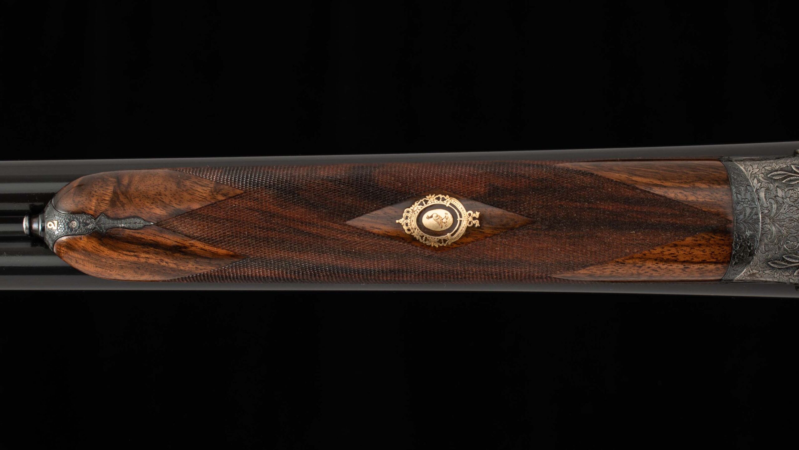 | General Specs: Lebeau Courally, 1960, 12 Gauge, 6lbs. 10oz., Chokes IM/F, LOP 14 3/8″, DAH 2 1/16″, DAC 1 1/2″ Serial Number: 43453,43454 Liège, Belgium was home to some of the world’s finest gunmakers, and still produces some of Europe’s best double shotguns. Lebeau Courally is and has been at the top of the list for the who’s who in Europe to order their bespoke shotguns. This matched pair was ordered for the House of S.C.A.M (Milanese Automotive Construction Society) with the initials G.B. engraved on the gold ovals on the belly of the stocks, was made in 1960. While the name suggests automotive, this manufacturer also produced many firearms during WWII. As happens with these fine firearms, they have changed hands over the years, and now the ovals on the belly of the stock read JD. Whoever has held these beautiful guns over the last 65 years, has given them the care they deserve. The barrels on both guns have factory blue that looks brand new, the bores are mirror, and the engraved borders and makers name at the breech end are crisp and clear. The gold inlay of 1 and 2, respectively are nicely done and present on the breech end of the rib as well as the skeletonized and highly engraved top lever of each gun. The breech fences have deep relief and scroll engraving with a raised border following from the rib down to the frame and around the sidelock, that is sharp and creates a visual flow that is unique and very well done. The frame and sidelocks have a combination of floral and scroll engraving, accentuated by a single gold pin and ribbon showing the maker’s name. The bottom of the receiver exemplifies the level of craftsmanship in the sculpted frame and the precision fit of the trigger plate, again, covered in floral and scroll, but accentuated here with deep relief branches and leaves near those sculpted edges. The trigger guard hosts a central bouquet, surrounded by intricately detailed floral engraving. The screws or in superb condition, with each being engraved perfectly to its surroundings. The Anson forend latch is engraved, and has the matching 1 or 2 gold inlay. Incorporated into the borderless, point checkering pattern is a diamond of negative space that hosts a gold emblem marked “Imperial Extra Luxe” with a pigeon and crown design surrounding. Each gun hosts highly figured walnut with borderless point pattern checkering that follows around the daintiest wrist I have ever held on a 12 gauge double gun. The English stock terminates in a leather covered pad. Of course, with such a fine pair of guns a two gun Motor Case is included. Every aspect of craftsmanship and beauty on this matched pair draw attention where it is due, and yet there is something subtle about them as well, not too flashy; they are rich and warm. We provide the most comprehensive photography and specifications in the marketplace to guide you in making an informed choice. Just remember, nowhere is it more apparent than in the gun world…you get what you pay for! Thanks for looking!