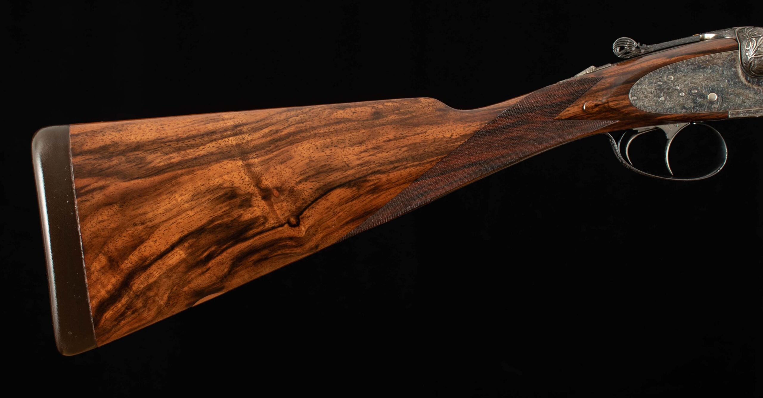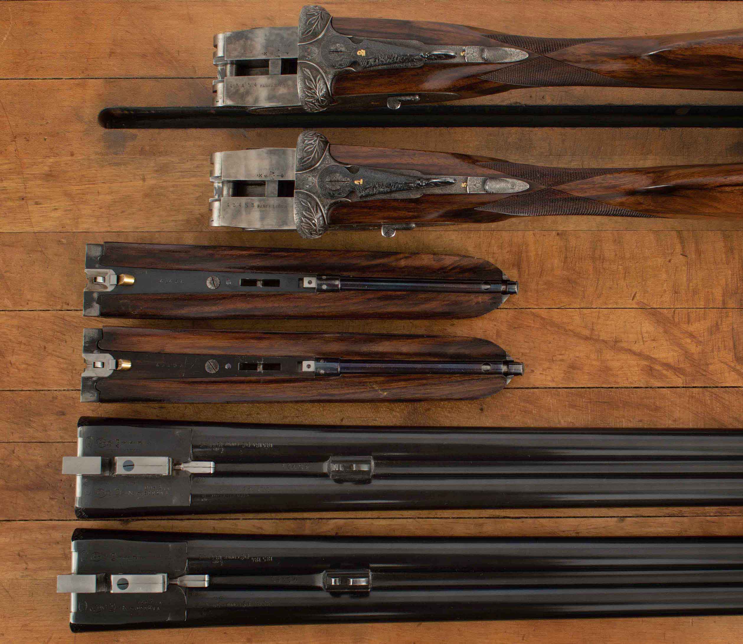 | Type: English/splinter LOP: 14 3/8″ both LOP To End Of Wood: 13 1/2″ both DAH: 2 1/16″ both DAC: 1 1/2″ both Cast: Heel 3/8″ off, Toe 1/2″ off Checkering Condition: both superb Butt Treatment: both, leather covered pad |