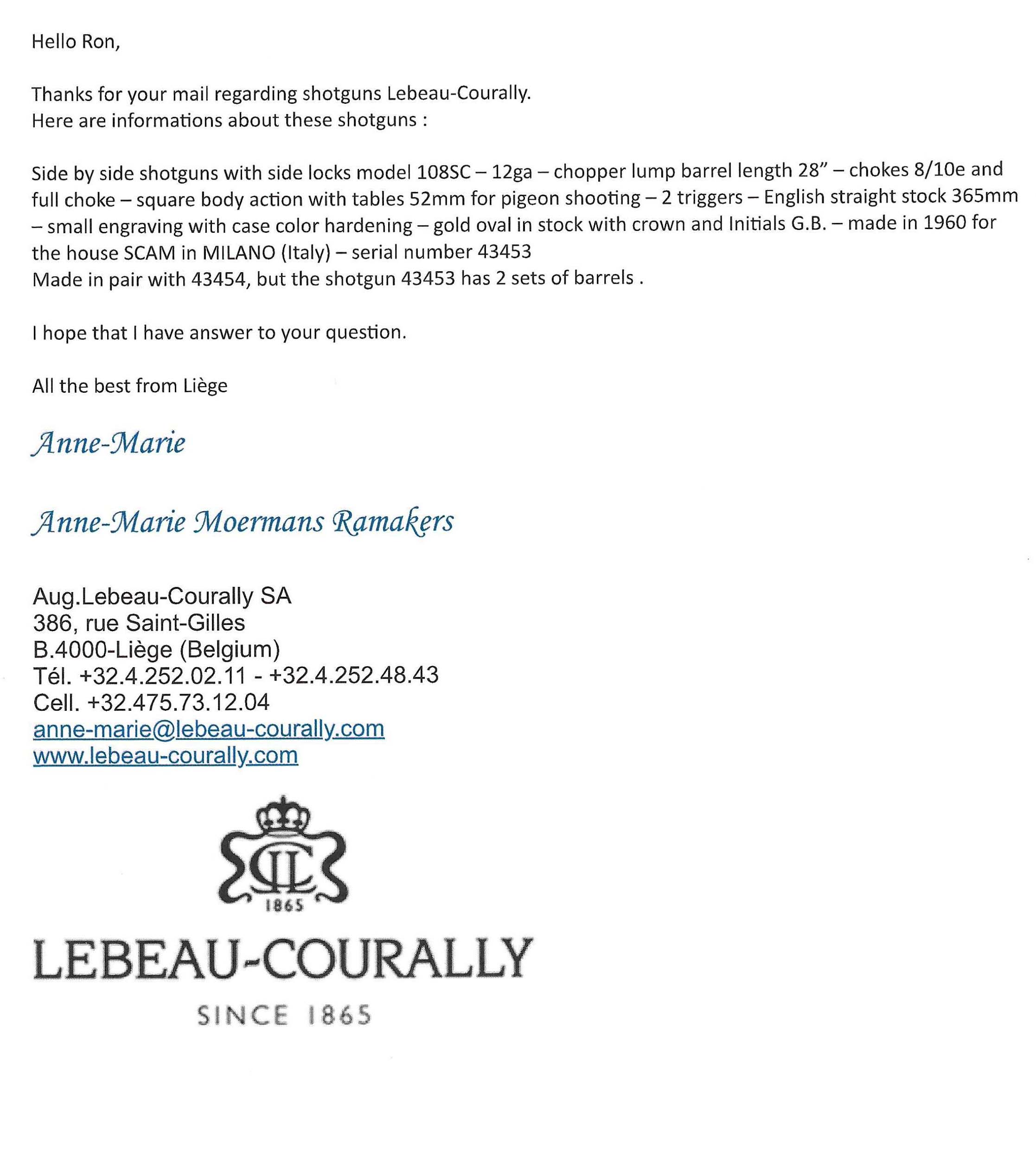 | General Specs: Lebeau Courally, 1960, 12 Gauge, 6lbs. 10oz., Chokes IM/F, LOP 14 3/8″, DAH 2 1/16″, DAC 1 1/2″ Serial Number: 43453,43454Liège, Belgium was home to some of the world’s finest gunmakers, and still produces some of Europe’s best double shotguns. Lebeau Courally is and has been at the top of the list for the who’s who in Europe to order their bespoke shotguns. This matched pair was ordered for the House of S.C.A.M (Milanese Automotive Construction Society) with the initials G.B. engraved on the gold ovals on the belly of the stocks, was made in 1960. While the name suggests automotive, this manufacturer also produced many firearms during WWII. As happens with these fine firearms, they have changed hands over the years, and now the ovals on the belly of the stock read JD. Whoever has held these beautiful guns over the last 65 years, has given them the care they deserve. The barrels on both guns have factory blue that looks brand new, the bores are mirror, and the engraved borders and makers name at the breech end are crisp and clear. As noted in the Lebeau-Courally letter, Gun number 1 was furnished with two barrels, one has to wonder what became of extra set, but such is the fascinating history of firearms, a mystery for the ages! The gold inlay of 1 and 2, respectively are nicely done and present on the breech end of the rib as well as the skeletonized and highly engraved top lever of each gun. The breech fences have deep relief and scroll engraving with a raised border following from the rib down to the frame and around the sidelock, that is sharp and creates a visual flow that is unique and very well done. The frame and sidelocks have a combination of floral and scroll engraving, accentuated by a single gold pin and ribbon showing the maker’s name. The bottom of the receiver exemplifies the level of craftsmanship in the sculpted frame and the precision fit of the trigger plate, again, covered in floral and scroll, but accentuated here with deep relief branches and leaves near those sculpted edges. The trigger guard hosts a central bouquet, surrounded by intricately detailed floral engraving. The screws or in superb condition, with each being engraved perfectly to its surroundings. The Anson forend latch is engraved, and has the matching 1 or 2 gold inlay. Incorporated into the borderless, point checkering pattern is a diamond of negative space that hosts a gold emblem marked “Imperial Extra Luxe” with a pigeon and crown design surrounding. Each gun hosts highly figured walnut with borderless point pattern checkering that follows around the daintiest wrist I have ever held on a 12 gauge double gun. The English stock terminates in a leather covered pad. Of course, with such a fine pair of guns a two gun Motor Case is included. Every aspect of craftsmanship and beauty on this matched pair draw attention where it is due, and yet there is something subtle about them as well, not too flashy; they are rich and warm. We provide the most comprehensive photography and specifications in the marketplace to guide you in making an informed choice. Just remember, nowhere is it more apparent than in the gun world…you get what you pay for! Thanks for looking!