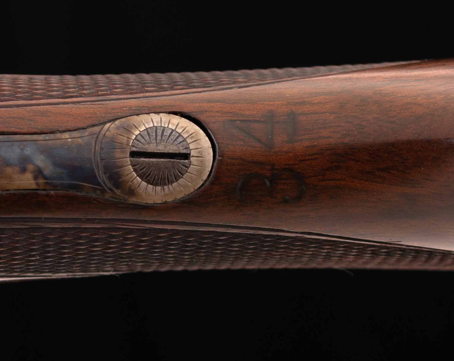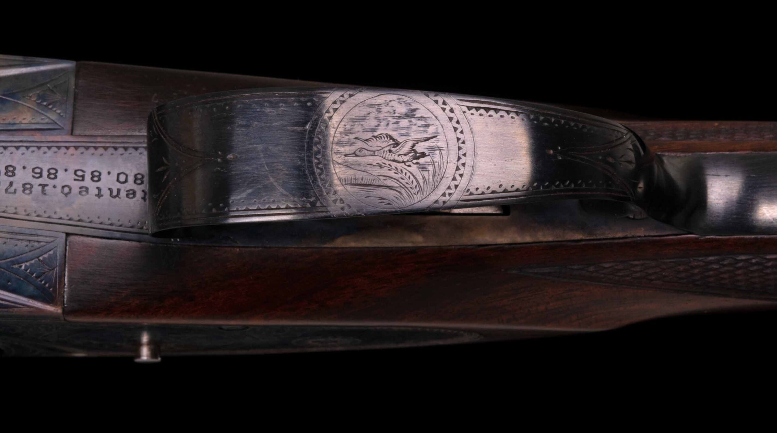 Action: tight, Centered Extractors Receiver Condition: 99% Screws: perfect Engraving: clear sharp, likely Joseph Loy engraved; Pointer Left-hand; Setter Right-hand Trigger Type: double-crisp Trigger Guard Color: 99% charcoal blue |