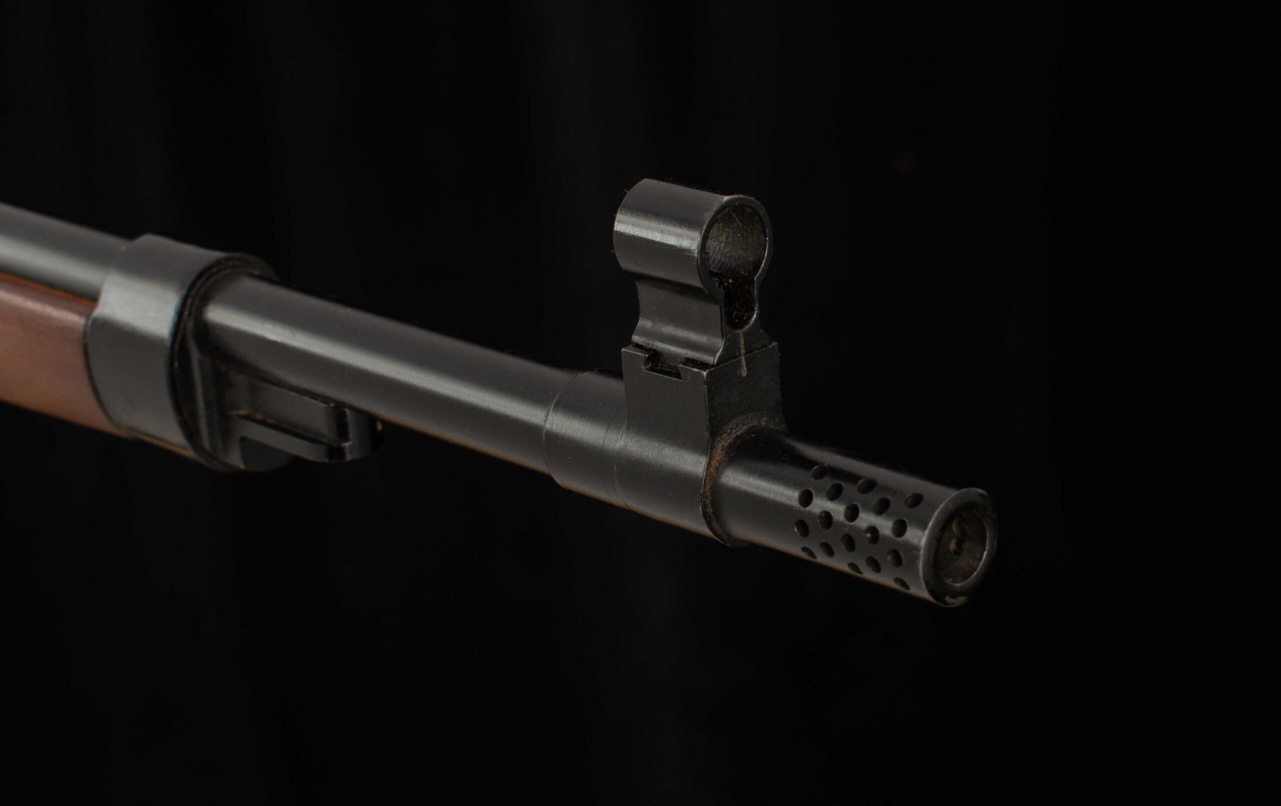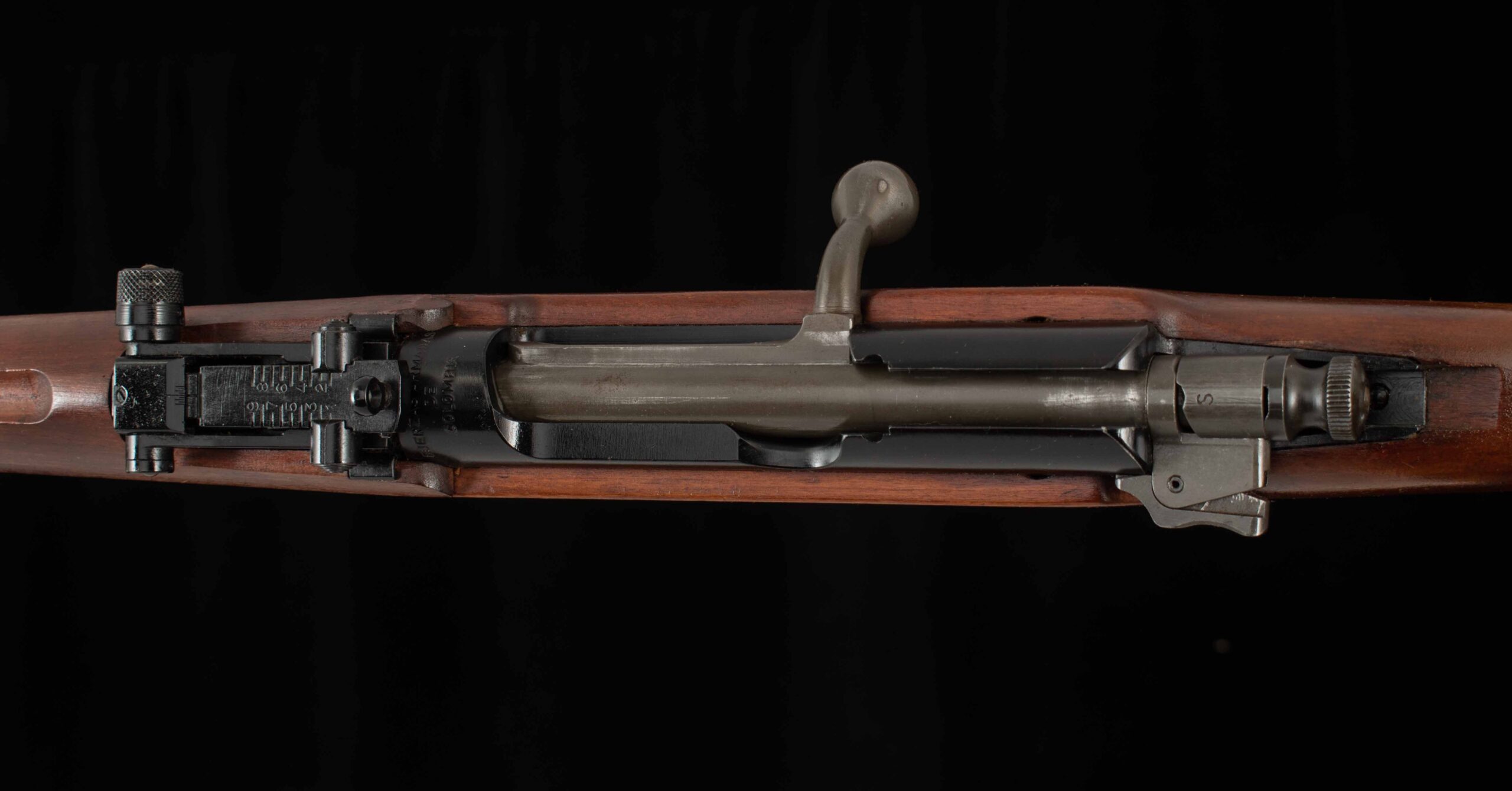 | Barrel Length: 23 1/2″ Bores: 10/10 as new % Blue: 99.5% Capacity: 5 Sights: front hooded post, rear adjustable tangent with peep |