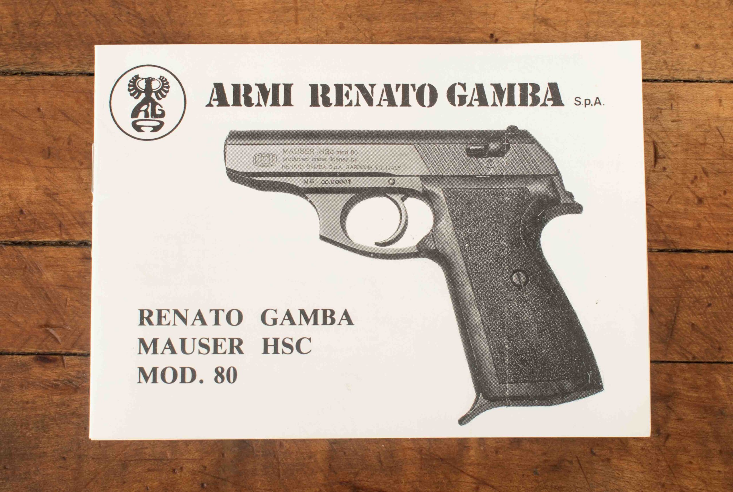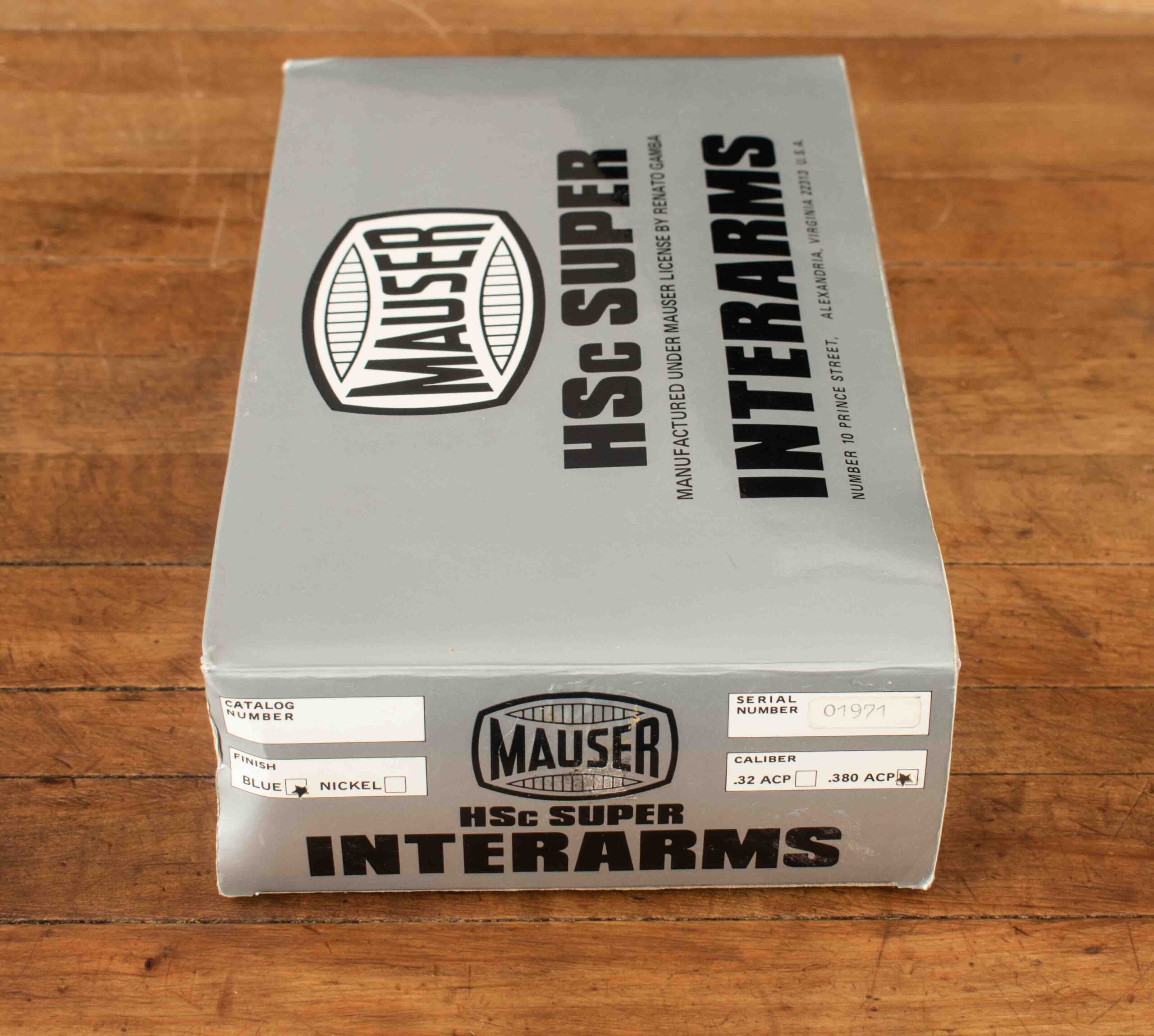 Vintage Firearms is pleased to offer this original in box Mauser HSc Super. The Mauser HSc was originally designed to serve the German police pistol in 1940 but took on a new life in the 1970s with the help of Interarms importing them to US. The model HSc Super, produced by Renato Gamba under license from Mauser and was offered in .32 ACP, .380 ACP, and 9×18mm. This example serial number 01971 is chambered to fire .380 ACP (9mm Kurz) and still has its original box, documents, and accessories. It features a double stacked single feed magazine, recurved trigger guard, and push button magazine release on the left side of the grip. Perfect for the Mauser die hards, or just someone who wants a unique .380 handgun, either way, have a look at the detailed specifications and pictures below. Thanks for looking!