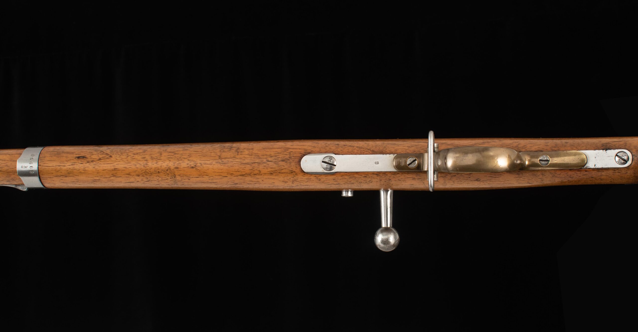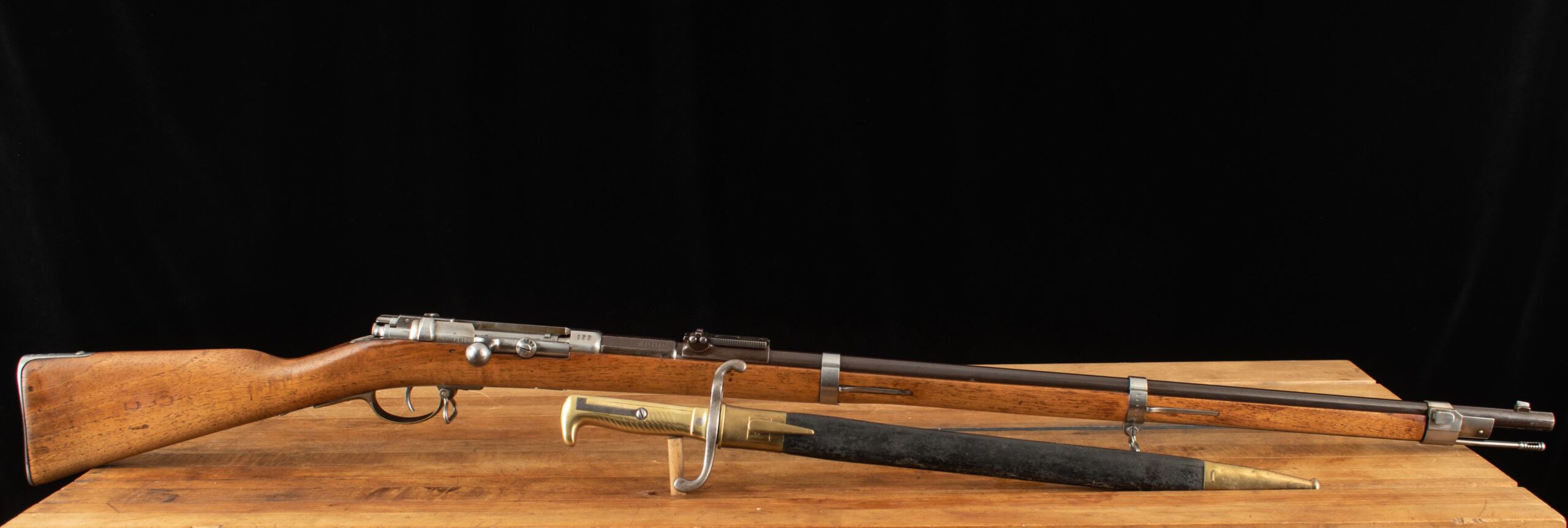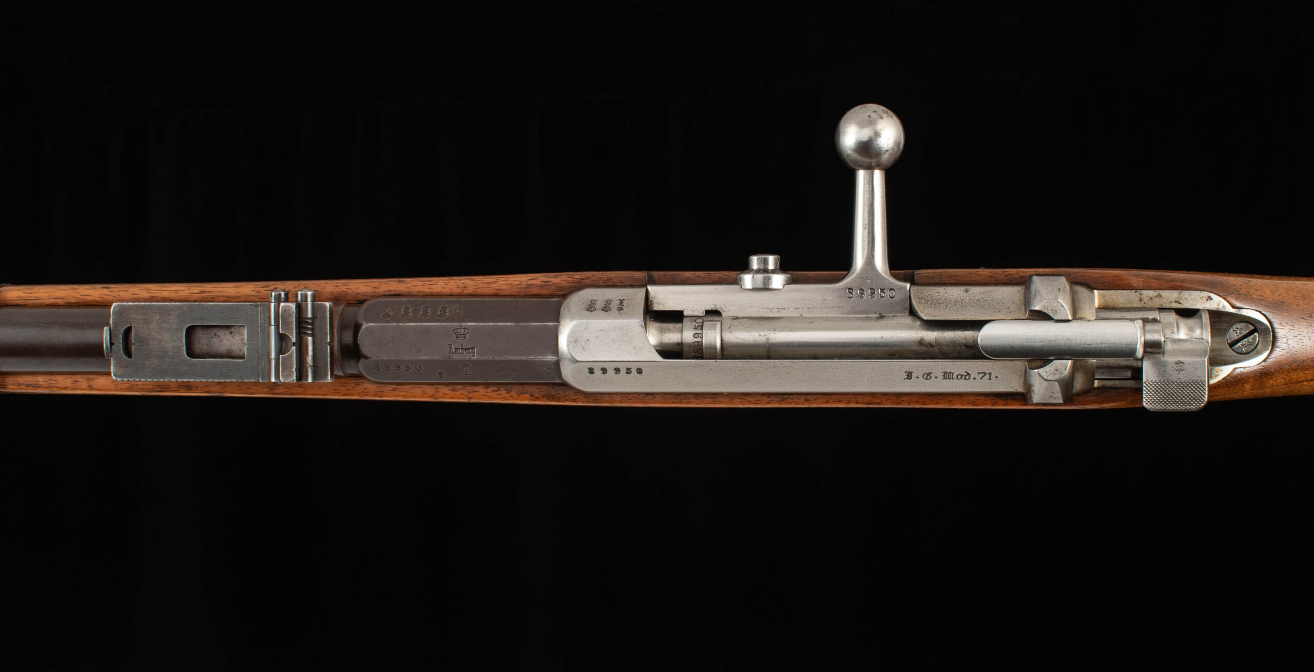 Vintage Firearms is pleased to offer a wonderful Infanterie-Gewehr model 71. The I.G. Mod. 71 served as the successor to the Dreyse needle gun, whose shortcomings became apparent in the Franco-Prussian war despite German Victory. It served as the Imperial German service rifle from 1871 to 1888, but ultimately in some capacity served until the end of the First World War and were most notably employed by the Legendary Askari troops of German East Africa (modern day Tanzania, Burundi, and Rwanda) serving under Paul von Lettow-Vorbeck. The M1871 fires an 11mm black‑powder cartridge and is a single-shot bolt‑action that uses a single locking lug formed by the bolt’s guide rib, which locks ahead of the receiver bridge. Furthermore, the Gewehr 71 was the first rifle to employ the wing safety that so many other Mauser rifles have utilized since. This example serial number 89950, produced by Amberg in 1881 and bears the crowned “L” of Ludwig II of Bavaria. Amberg rifles tend to be well regarded for their higher quality when compared to other German arsenals like Danzig or Spandau. Furthermore, this rifle served in the 9th Bayerisches Infanterie-Regiment 3rd Company as weapon number 148 evidenced by “B.9.R.3.148” marked on the buttplate. This rifle is in excellent condition and features a 8.5/10 mirror bore, and has matching serial numbers on all visible parts including screw heads and barrel bands, marked either “99 50” or “89950.” This Amberg rifle comes with an M1871 bayonet, which is designated to a different regiment, marked 104. R. 2. 33. What a rare find! You don’t often see a rifle quite like this very often, especially with so much history and perfect choice for any die-hard militaria collector. Have a look at the detailed specifications and pictures below. Enjoy!