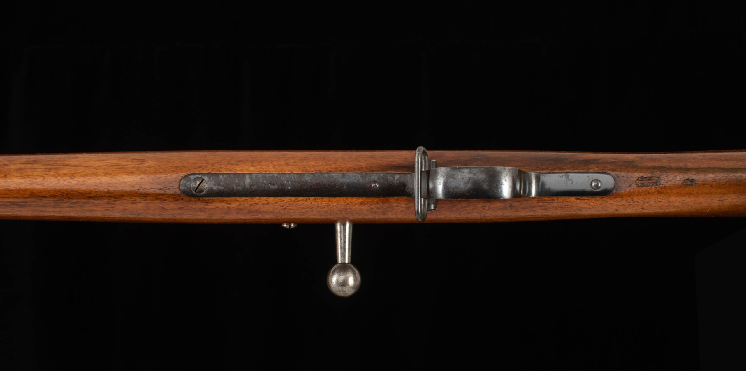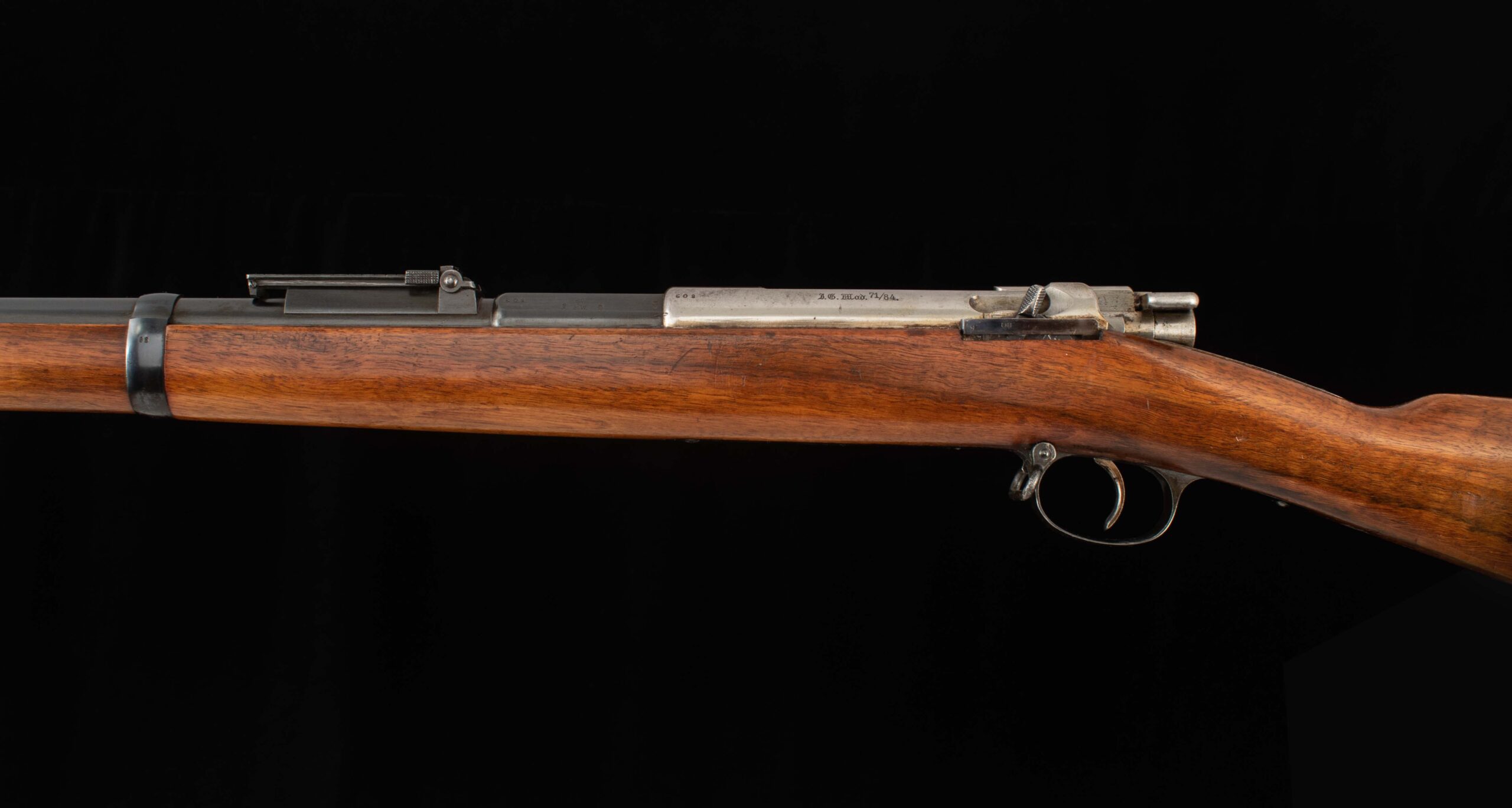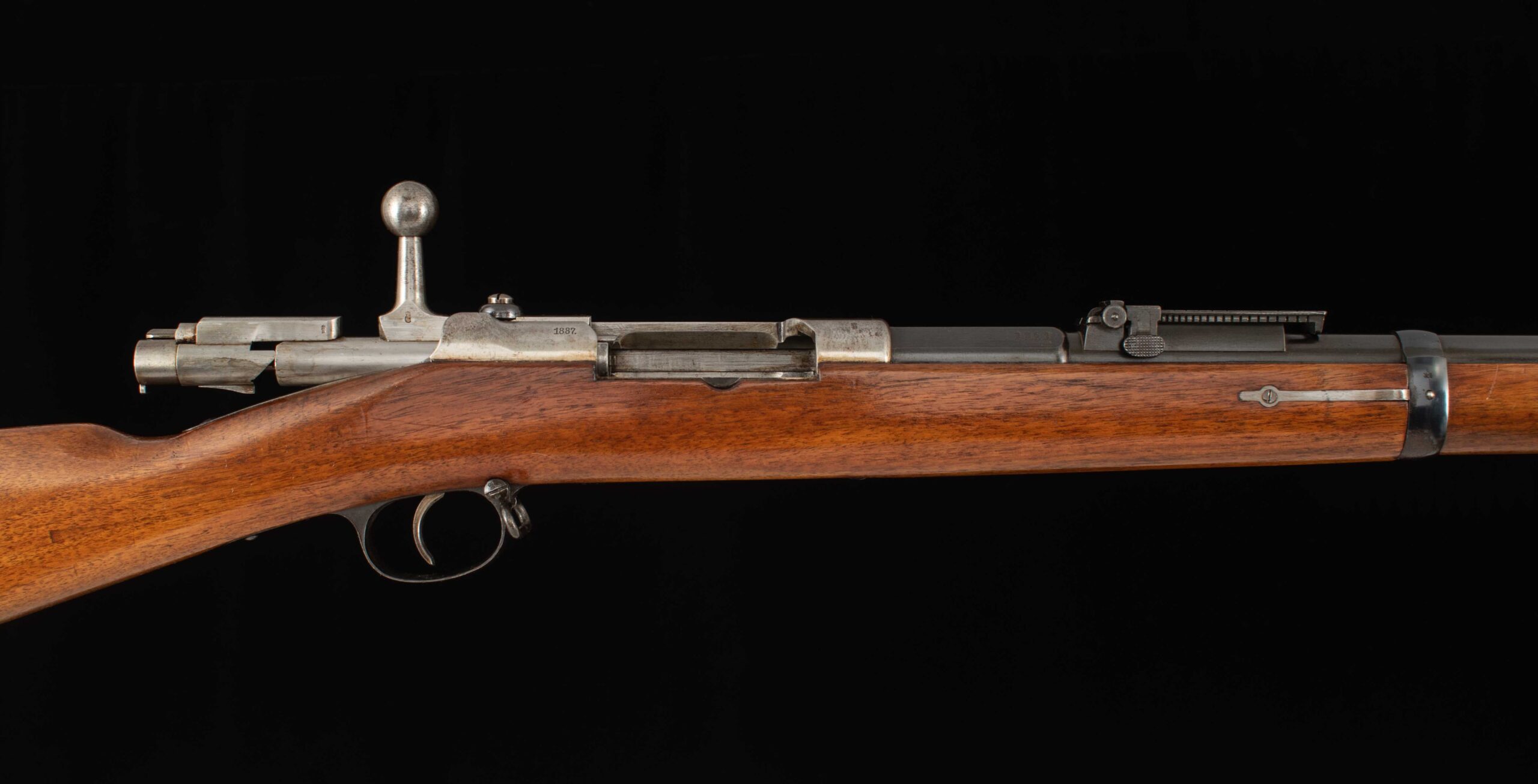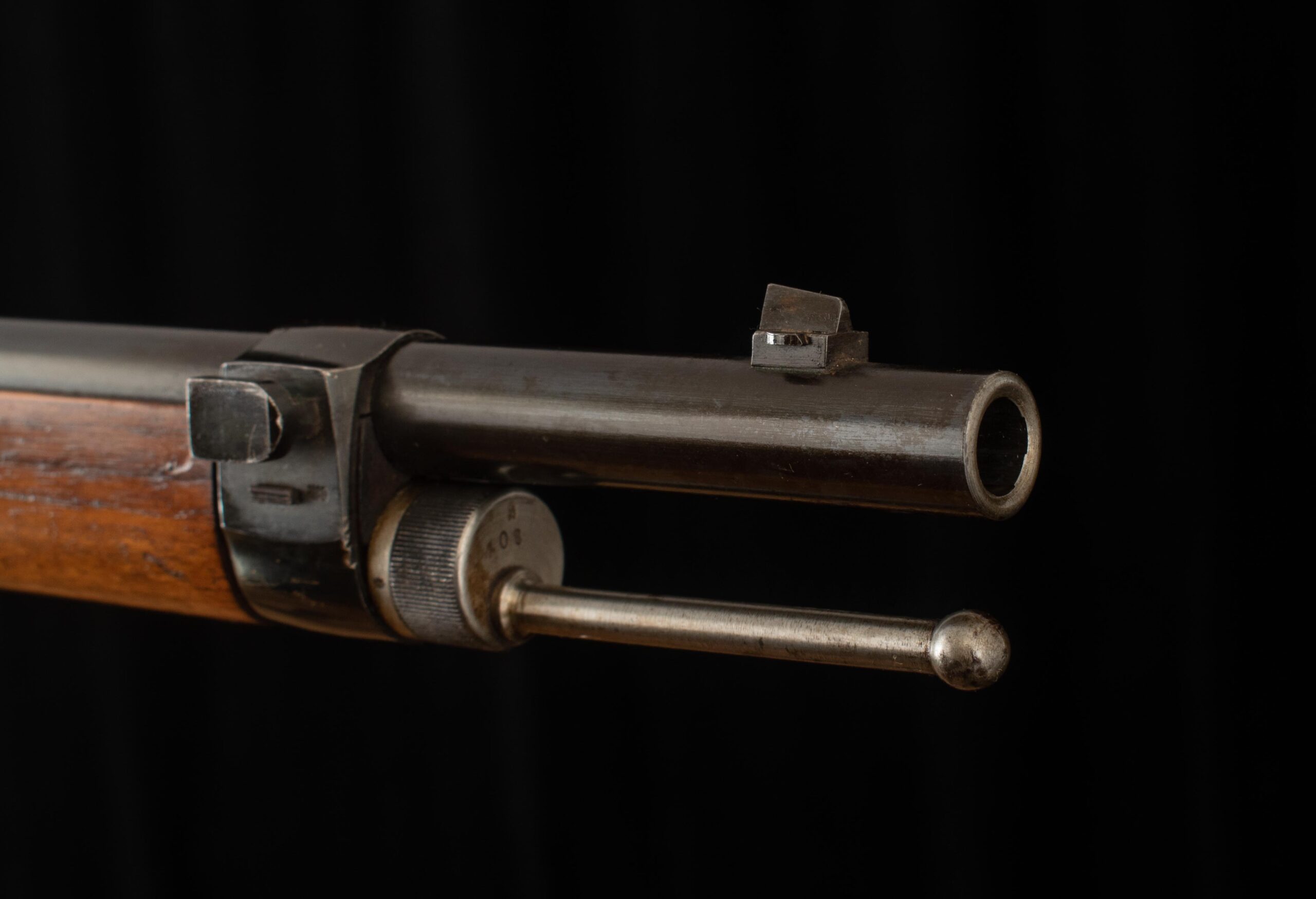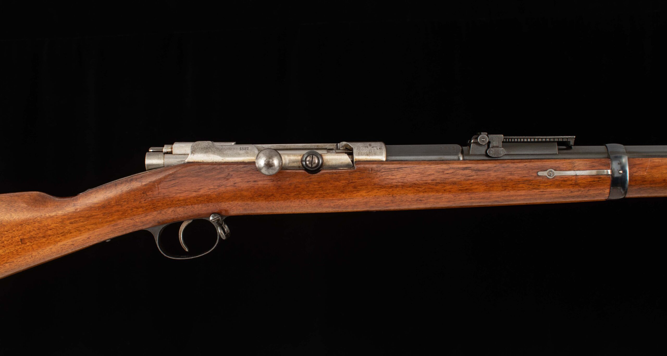 | General Specs: Spandau, 1887, 11x60mmR, 9lbs. 13oz. LOP 13 1/8″ Serial Number: 608