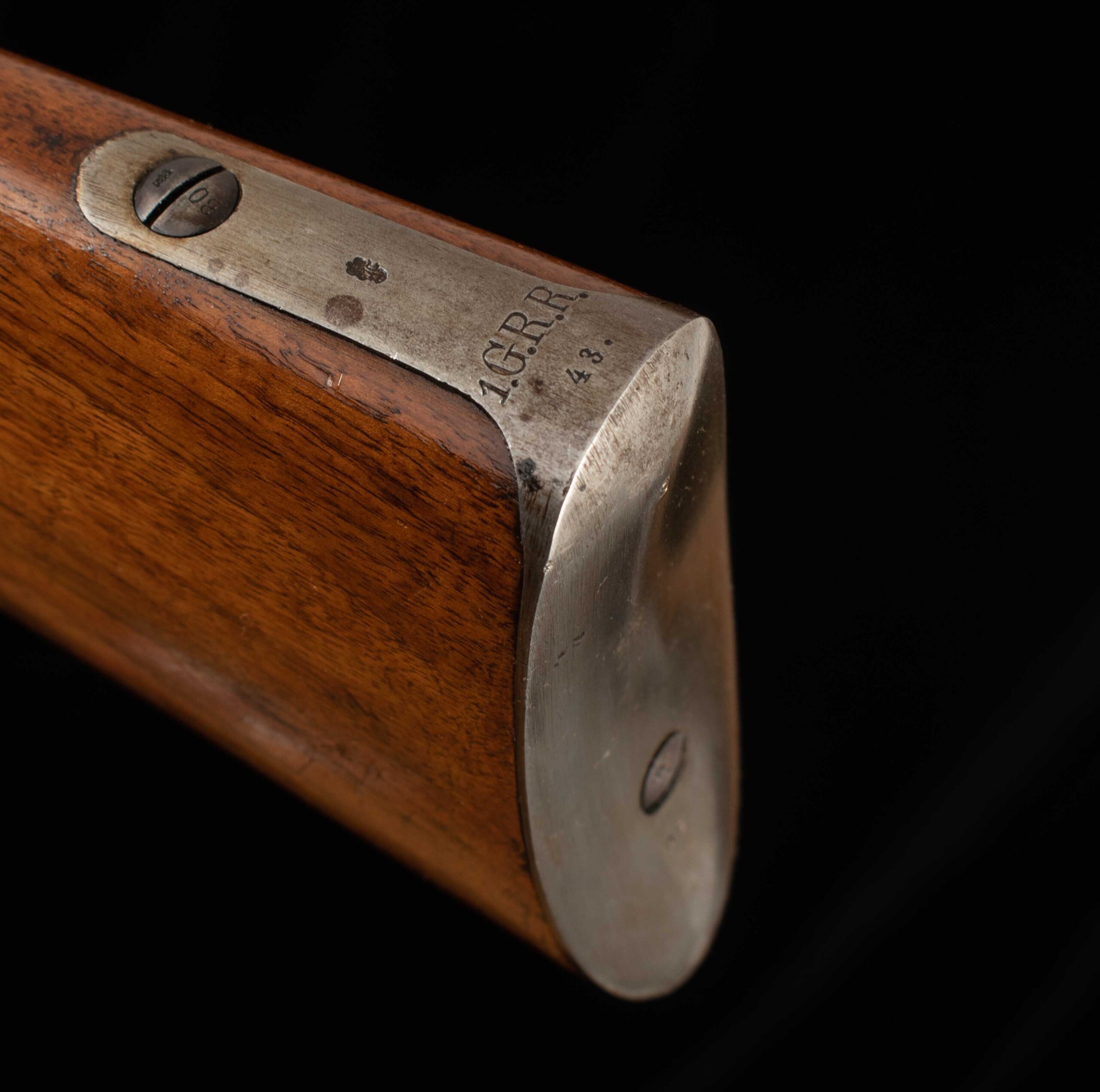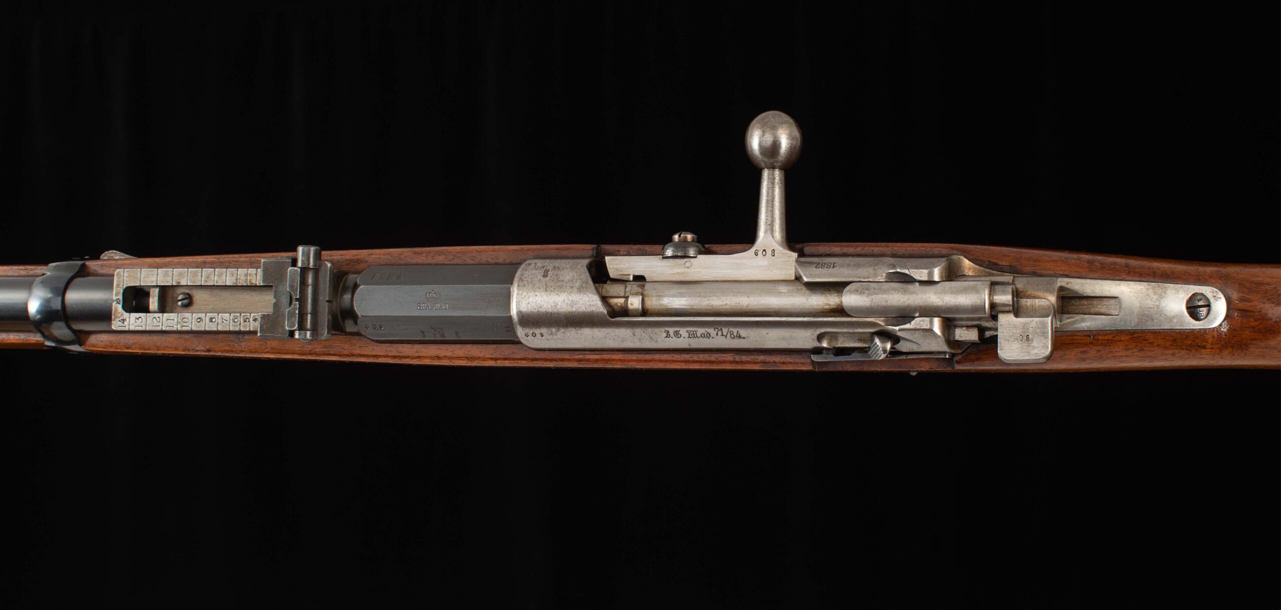 Vintage Firearms is pleased to offer a wonderful Infanterie-Gewehr model 71/84. The I.G. Mod. 71 was the successor to the Dreyse needle gun and served as the Imperial German service rifle from 1871 to 1888. In the 1884 the Germany Army chose to update the I.G. Model 1871 design after troop trials in 1883 and the use of Winchester Repeating rifles by the Ottoman Forces against Russia in the Russo-Turkish War. The 1871 rifle was upgraded with an 8 round tubular magazine designed by Alfred von Kropatschek, and adjustable flip-up ladder sights and received the designation Infanterie-Gewehr 71/84 and became the first repeating rifle of the German Army. Although the I.G. Mod. 71/84 would never see direct front‑line service, it still received use by the German Navy and auxiliary forces during the First World War. This example, serial number 7880, was produced by Berlin’s Spandau arsenal in 1887, and this rifle served in the 1st Garde-Reserve-Infanterie-Regiment as weapon number 43 evidenced by “1.G.R.R.43.” marked on the buttplate. The barrel sports a Mirror 9.5/10 bore and the barrel and receiver retains 97% and 95% factory finish respectively with the rest fading to a pleasant patina. The rifle has some expected field marks which have been accumulated over almost 140 years! On all visible parts that display a serial number serial numbers on all visible parts including screw heads and barrel bands, marked either “08” or “608”. What an exemplary and historically significant rifle from such an innovative period in firearms development. The I.G. Mod. 71/84 is often regarded as a pinnacle of small‑arms craftsmanship, with workmanship rarely matched in a general‑issue infantry rifle. An excellent choice for any die-hard militaria collector. Have a look at the detailed specifications and pictures below. Enjoy!